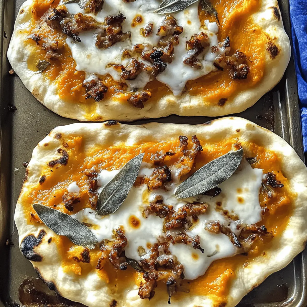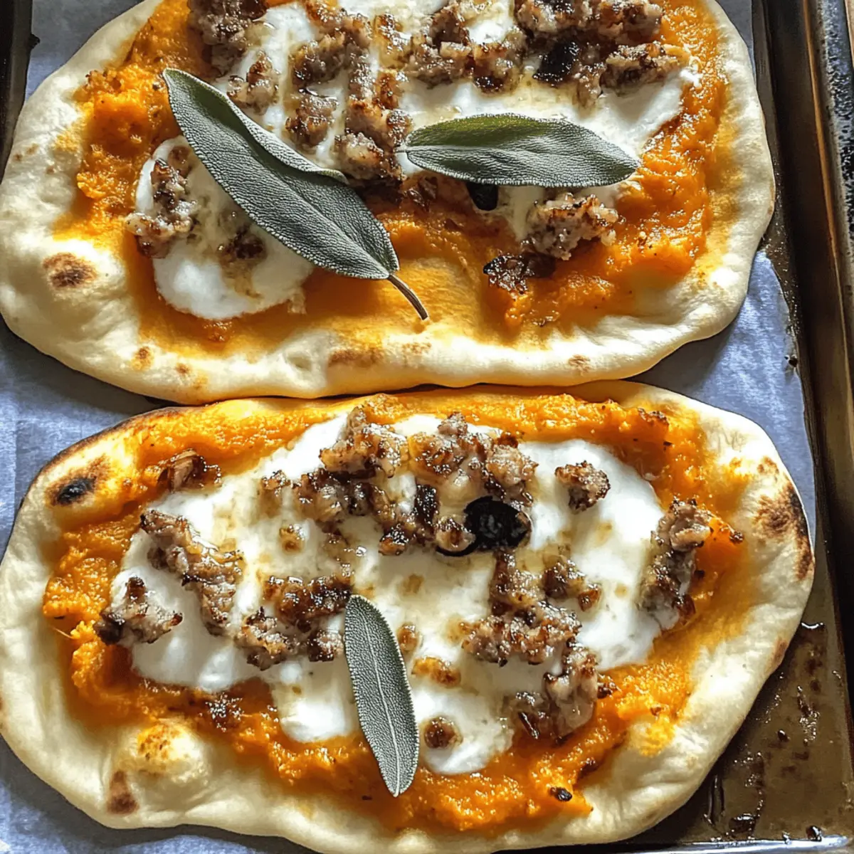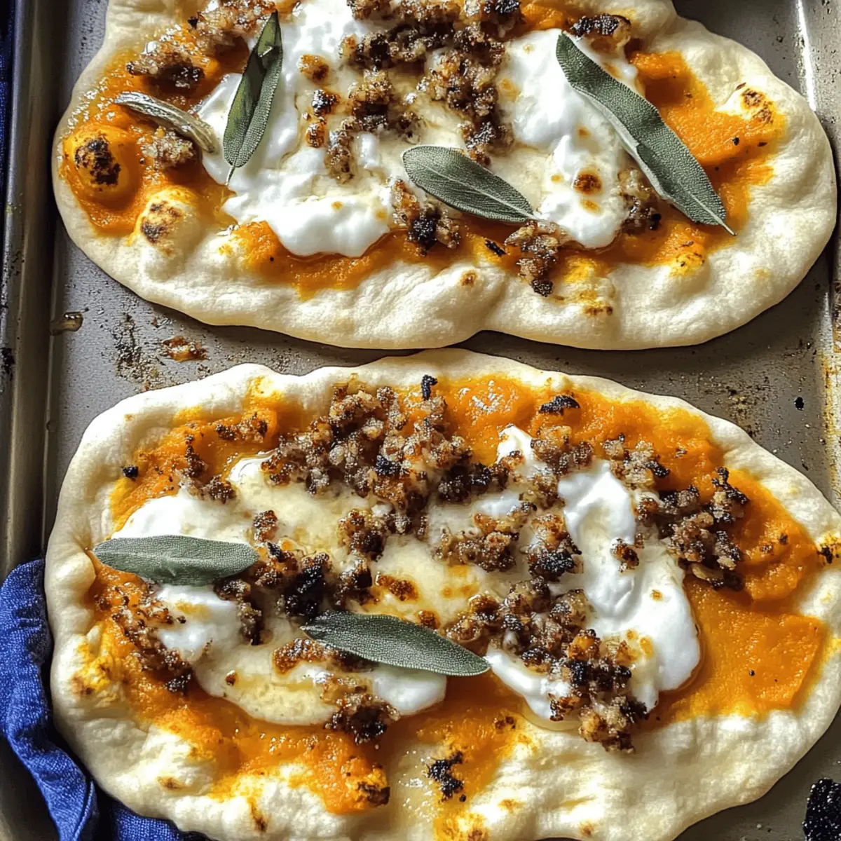 As I prepared for the cozy season, I stumbled upon an idea that turned my kitchen into a comforting haven: Autumn Naan Pizzas. These vibrant creations blend the sweet taste of pumpkin purée with the savory goodness of caramelized shallots and sausage, all atop fluffy naan bread. Not only are these pizzas a quick meal that can be pulled together in just 30 minutes, but they’re also a delightful way to celebrate fall flavors while allowing for endless customization. Whether you prefer a vegetarian option or a gluten-free base, this recipe brings both comfort and creativity to your table. So, are you ready to enjoy the ultimate fall pizza experience that’s perfect for busy weeknights? Let’s dive into the delicious details! Why are Autumn Naan Pizzas a Must-Try? Quick Transformation: In just 30 minutes, these pizzas turn simple ingredients into a memorable meal, perfect for busy weeknights. Seasonal Comfort: The blend of pumpkin and herbs captures the essence of fall, making it an ideal dish to cozy up with. Customizable Delight: You can easily switch toppings or make it vegetarian or gluten-free to fit your dietary needs. Flavorful Base: Fluffy naan serves as a unique canvas, adding a delightful twist to traditional pizza that everyone will love. Easy Prep: Most components can be prepared ahead of time, saving you hassle while still delivering a freshly baked treat! Autumn Naan Pizzas Ingredients Get ready to create the perfect cozy dish with these Autumn Naan Pizzas! For the Base • Naan breads – Fluffy and crispy, a perfect base; you can swap with traditional pizza dough or gluten-free alternatives. For the Sauce • Canned pumpkin puree – Provides a creamy autumnal flavor as a fabulous alternative to traditional tomato sauce; fresh puree is an even fresher option! For the Protein • Ground sausage – Adds heartiness; feel free to use pork, turkey, chicken, or plant-based sausage for a tasty vegetarian option. For the Vegetables • Caramelized shallots – Infuses sweet, aromatic depth into the dish; substitute with onions if needed. For the Seasoning • Dried oregano – Adds earthy flavor; Italian seasoning works great as an alternative. For the Cheese • Fontina cheese – Melts beautifully while complementing other flavors with its nutty note; mozzarella or provolone are excellent substitutes. • Whole-milk ricotta cheese – Provides creamy richness; can swap with cream cheese or mascarpone for a variation. For the Garnish • Fresh sage leaves – Offers an herbaceous aroma that’s perfect for fall; try thyme or rosemary for a delightful change. • Extra-virgin olive oil – Adds richness and is used to sauté shallots; neutral oil can be used as an alternative. • Hot honey – Gives a spicy-sweet finishing touch that elevates your Autumn Naan Pizzas; regular honey or chili oil are tasty alternatives. Step‑by‑Step Instructions for Autumn Naan Pizzas Step 1: Preheat the Oven Begin by preheating your oven to 425°F (220°C) to ensure a crispy crust for your Autumn Naan Pizzas. This temperature is key for achieving that golden, bubbly cheese on top, so allow the oven plenty of time to heat up while you prepare the toppings. Step 2: Sauté the Shallots In a skillet, drizzle a tablespoon of extra-virgin olive oil over medium heat, then add thinly sliced shallots. Sauté them for 4-5 minutes until they’re softened and beautifully caramelized, stirring occasionally to prevent burning. You’ll know they’re ready when they take on a lovely golden hue and a sweet aromatic smell fills the air. Step 3: Cook the Sausage Next, add your choice of ground sausage to the skillet with the caramelized shallots. Cook for 6-7 minutes, breaking it apart with a spatula as it browns evenly. Look for it to develop a nice crust and cooked-through appearance, indicating it’s ready to be layered onto your naan. Step 4: Prepare the Naan Base On a baking sheet, lay out your naan breads as the base for the Autumn Naan Pizzas. Spread a generous layer of canned pumpkin purée over each naan, creating a creamy foundation. Sprinkle dried oregano evenly across the surface, enhancing the autumn flavors in every bite. Step 5: Add Cheese and Toppings Now it’s time to layer the pizzas! Evenly distribute the Fontina cheese over the naan, followed by the browned sausage and the sautéed shallots, creating a colorful and delicious topping mixture. Then, add dollops of whole-milk ricotta cheese for an extra creamy bite that balances the savory flavors. Step 6: Garnish with Sage Take fresh sage leaves and drizzle them lightly with olive oil, then scatter them on top of the pizzas. This step adds a fresh, herbaceous note to your Autumn Naan Pizzas, making it feel even more seasonal. The sage will release its wonderful aroma while baking. Step 7: Bake to Perfection Carefully place the baking sheet in the preheated oven and bake for 15 minutes. Keep an eye on the pizzas; they are ready when the cheese is bubbly and the edges of the naan turn a delightful golden brown, showcasing the heartiness of your autumn creation. Step 8: Drizzle and Serve Once baked, remove the Autumn Naan Pizzas from the oven and let them cool slightly. Drizzle hot honey over each pizza for a sweet and spicy contrast before slicing and serving. The combination of flavors will warm your heart and delight your taste buds! Autumn Naan Pizzas Variations & Substitutions Feel free to let your creativity shine by customizing these delightful Autumn Naan Pizzas! Pumpkin Swap: Use butternut squash or sweet potato puree for varied flavors that still celebrate the season. Each ingredient brings a unique sweetness that adds depth to your dish. Veggie Boost: Add roasted vegetables like bell peppers, spinach, or zucchini for extra nutrition and a pop of color. These veggies not only enhance the flavor but also make your pizzas visually appealing! Cheese Variation: Swap Fontina with goat cheese or smoked cheddar for unique flavor profiles