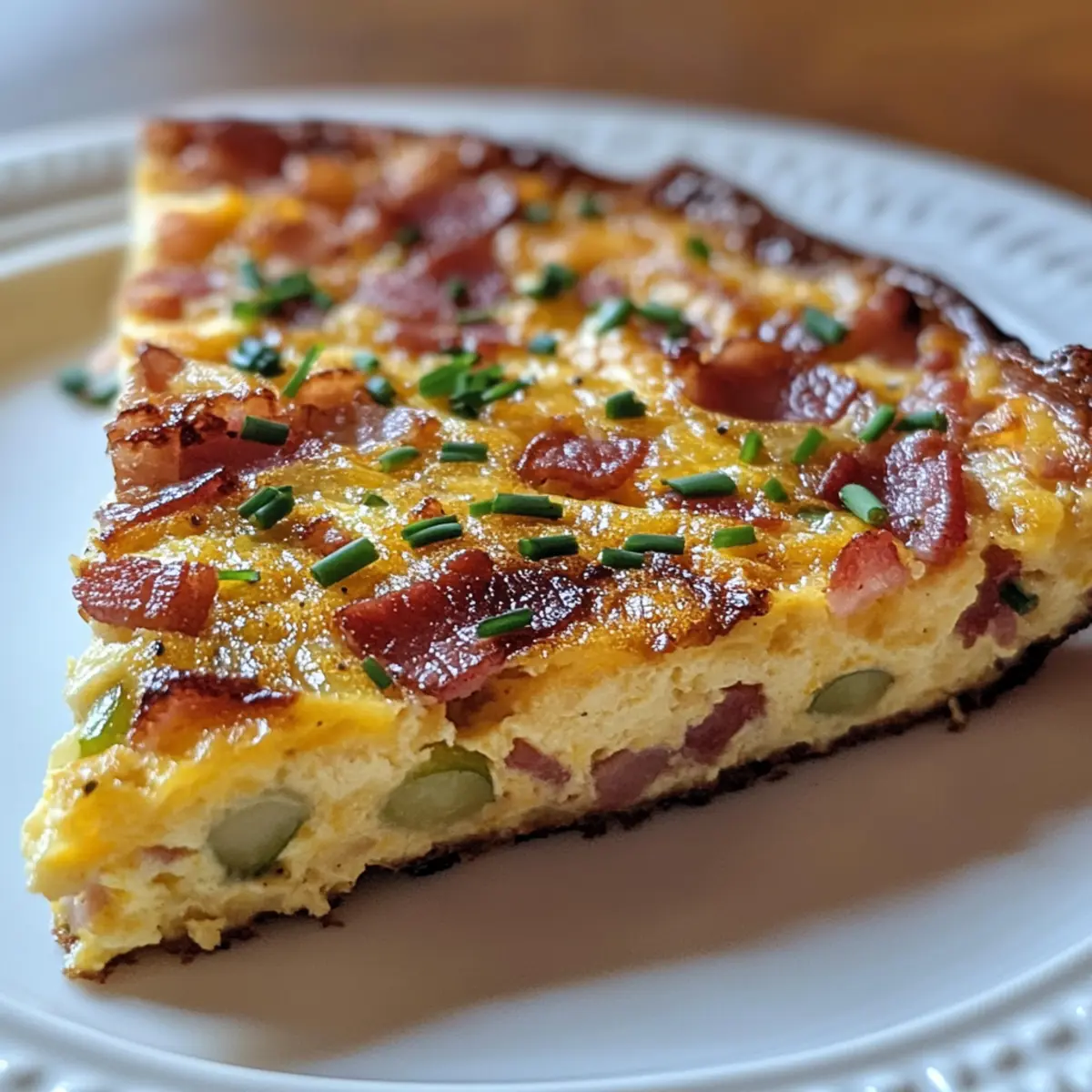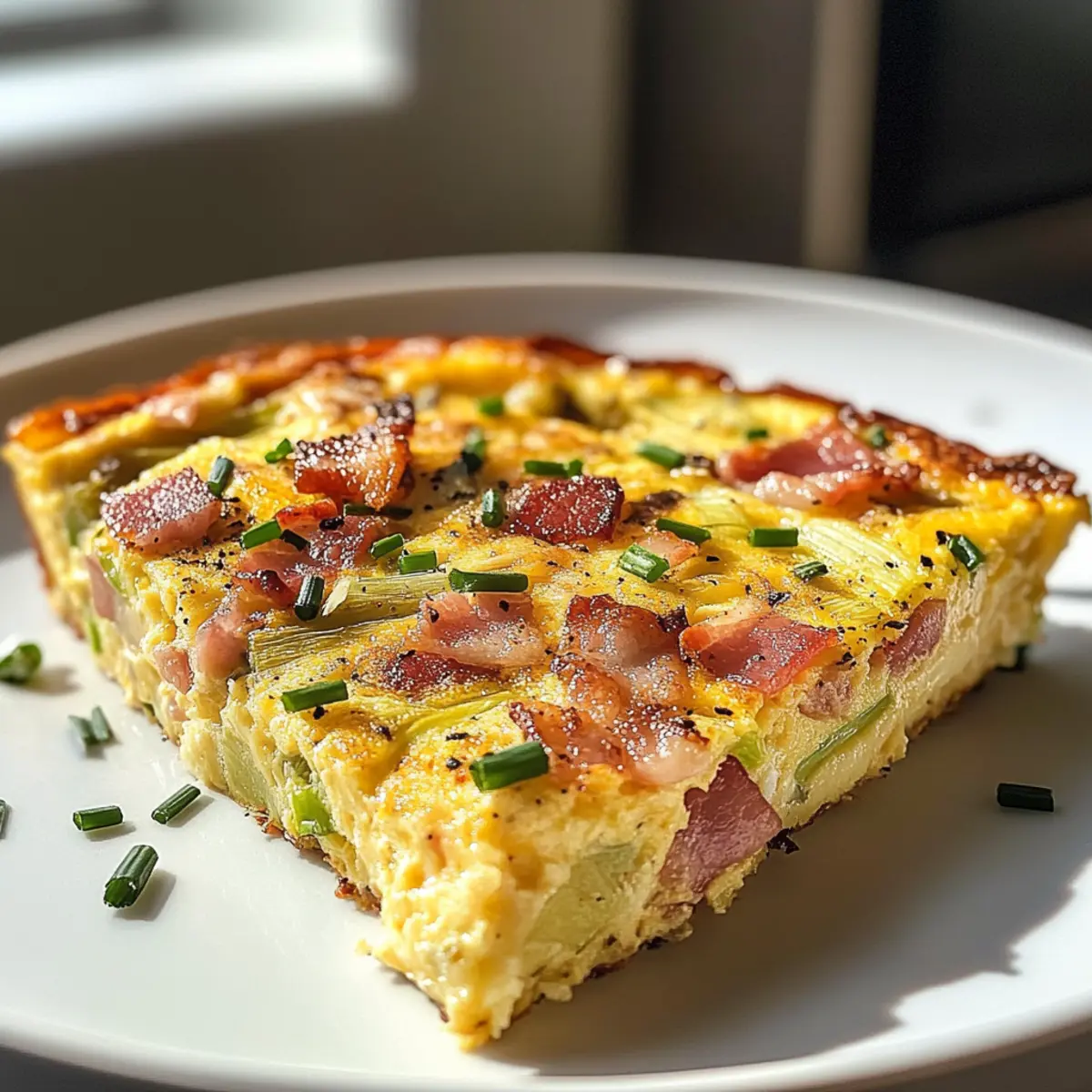 The aromas wafting from the kitchen felt like an embrace, wrapping around me as I prepared to cook my Easy Bacon Leek Frittata. This delightful dish delivers the savory goodness of crispy bacon combined with the gentle sweetness of leeks, all nestled in a creamy, custard-like egg base. Perfect for those busy mornings or leisurely brunches, this frittata is a game-changer—not only is it a breeze to whip up in just 30 minutes, but its crustless design makes it a light yet satisfying option. Plus, you can easily customize it with seasonal veggies or different cheeses, ensuring every bite is unique. Are you ready to elevate your breakfast routine with this scrumptious frittata? Why is This Frittata a Must-Try? Simplicity at its finest—this Bacon Leek Frittata comes together in just 30 minutes, making it perfect for busy mornings or relaxed brunches. Flavor-packed with crispy bacon and sweet leeks, each bite offers a delightful balance that will satisfy your cravings. Versatile and customizable, feel free to add seasonal vegetables or try different cheeses to keep things exciting. Nutritious without sacrificing taste, this frittata bursts with protein and can easily fit into your meal prep routine. Crowd-pleaser at any table, it’s ideal for family gatherings or hosting friends—everyone will be asking for seconds! Bacon Leek Frittata Ingredients Unlock the secret to a delicious brunch with these key ingredients. For the Frittata Bacon – Adds savory depth and richness; can be replaced with turkey bacon for a lighter option. Leek – Provides a mild, sweet onion flavor and tenderness; only the white and light green parts are used, so rinse well to remove grit. Eggs – The main structure and protein source for the dish, creating a fluffy texture; use fresh, large eggs for best results. Half and Half – Contributes creaminess to the custard base; heavy cream or whole milk can be substituted, but avoid low-fat options for optimal texture. Kosher Salt and Freshly Cracked Pepper – Essential seasonings to enhance all the flavors. Boursin or Herb Goat Cheese – Adds creaminess and a burst of flavor; feel free to use shredded cheddar or parmesan as alternatives. Chives – Provide a fresh, mild onion-like finish; mince finely for even distribution throughout the frittata. Each ingredient combines seamlessly to create this amazing Bacon Leek Frittata, making it one of the most delightful breakfast options you’ll ever try! Step‑by‑Step Instructions for Bacon Leek Frittata Step 1: Preheat the Oven Begin by preheating your oven to 375°F (190°C). This ensures that your Bacon Leek Frittata will bake evenly and come out fluffy. While the oven warms up, you can prepare the other ingredients, so everything is ready when it’s time to bake. Step 2: Whisk the Egg Mixture In a medium mixing bowl, whisk together fresh, large eggs, half and half, along with kosher salt and freshly cracked pepper. Keep whisking until the mixture is smooth and well combined, taking about 2-3 minutes. This creamy custard will create the light texture that makes the frittata delightful. Step 3: Cook the Bacon Heat a nonstick skillet over medium-low heat and add diced bacon. Cook the bacon until it becomes crispy, which should take around 5-7 minutes. Once done, transfer the bacon to a plate, leaving approximately 1 tablespoon of bacon fat in the skillet to add flavor to the leeks. Step 4: Sauté the Leeks Increase the heat to medium and add the well-rinsed and chopped leeks to the skillet with the reserved bacon fat. Season them with a pinch of salt and pepper, then sauté for about 4-5 minutes until they are tender and aromatic. This step will enhance the leeks’ natural sweetness, making the frittata even more delicious. Step 5: Combine Ingredients in the Skillet Pour the whisked egg mixture into the skillet over the sautéed leeks. Gently stir the mixture to distribute the leeks evenly. This step allows the leeks to infuse their flavor throughout the Bacon Leek Frittata, creating a cohesive dish that’s packed with taste. Step 6: Add Bacon and Cheese Sprinkle the crispy bacon evenly on top of the egg mixture, followed by dollops of Boursin or herb goat cheese. Optionally, you can use shredded cheddar or parmesan for a different flavor profile. This finishing touch provides creaminess and richness, elevating your frittata to the next level. Step 7: Bake the Frittata Carefully place the skillet in the preheated oven and bake for 16-18 minutes. Keep an eye on the frittata; it’s ready when the edges are set and the center is slightly jiggly. This indicates a creamy texture that will firm up as it cools, resulting in a delicious Bacon Leek Frittata. Step 8: Cool and Serve Once the frittata is out of the oven, let it cool in the skillet for about 10 minutes. This will make slicing easier. After cooling, transfer the frittata to a serving plate, sprinkle with minced chives for a burst of freshness, and cut into wedges. Serve immediately for the best flavor and texture. How to Store and Freeze Bacon Leek Frittata Fridge: Cool completely before storing in an airtight container; it can be stored in the refrigerator for up to 5 days, ensuring you can enjoy your delicious frittata throughout the week. Freezer: For longer storage, slice the frittata and wrap individual pieces tightly in plastic wrap, then place in a freezer-safe bag. It can be frozen for up to 3 months. Reheating: To reheat, thaw overnight in the fridge, then warm in a preheated oven at 350°F (175°C) for about 10-15 minutes or until heated through. Enjoy the same delightful taste as when freshly baked! Serving Leftovers: Leftover Bacon Leek Frittata can also be enjoyed cold, making it a versatile option for lunch or a quick snack on the go. Make Ahead Options These Bacon Leek Frittatas are ideal for meal prep enthusiasts! You can cook your bacon and sauté the leeks up to 3 days in advance, then store them in an airtight container in the refrigerator.