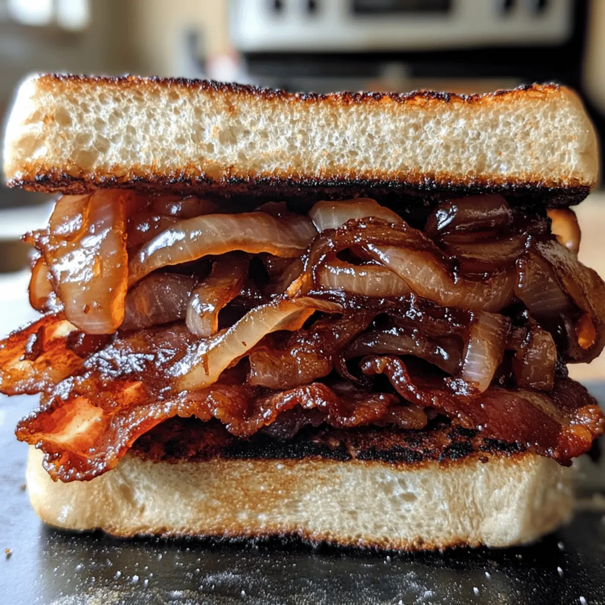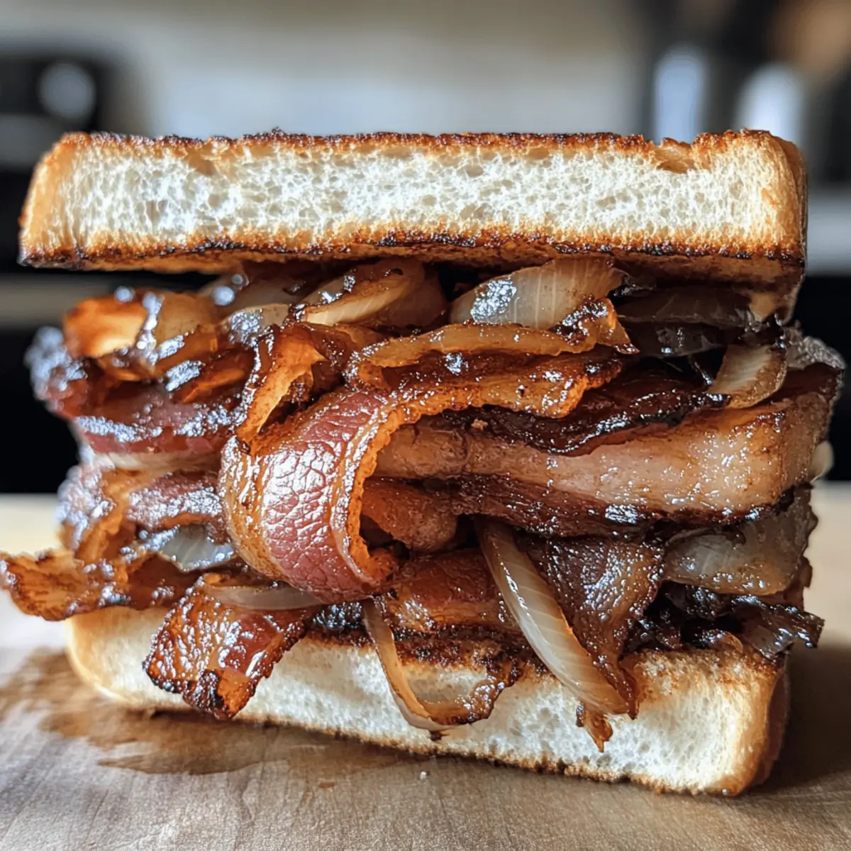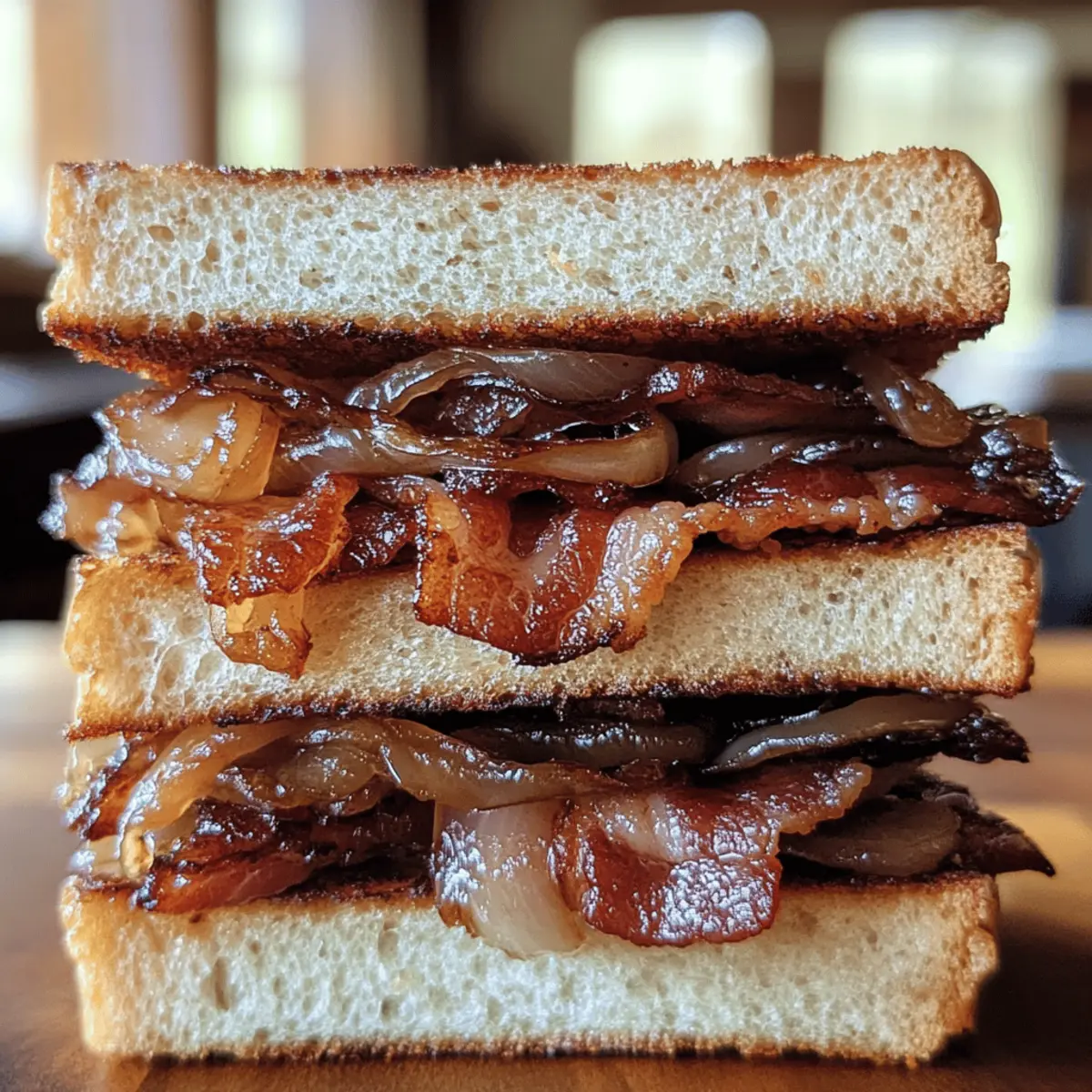 As the sizzle of bacon fills the kitchen, I’m instantly transported to lazy weekends filled with good food and great company. This Savory Bacon Sandwich with Sweet Caramelized Onions is my go-to remedy for those days when I crave comfort and flavor. The smoky richness of the bacon perfectly complements the sweet, melt-in-your-mouth caramelized onions, creating a delicious harmony that’s hard to resist. Not only is this sandwich incredibly satisfying, but it’s also a quick-to-make option that’s perfect for both breakfast and lunch. So, if you’re ready to elevate your meal game and indulge in some home-cooked goodness, let’s dive into this irresistible recipe. What toppings would you choose to make it even more spectacular? Why is the Bacon Sandwich Irresistible? Comforting flavors: This Bacon Sandwich with Caramelized Onions delivers a delightful blend of smoky, savory, and sweet in every bite. Quick preparation: Ready in just under 30 minutes, it fits perfectly into busy mornings or lazy afternoons. Endless versatility: Feel free to customize with toppings like avocado or your favorite cheese, making it unique every time. Crowd-pleasing: This dish is an instant hit, whether you’re feeding the family or entertaining friends—everyone loves it! Perfect pairing: Serve with a side of chips or salad for a complete meal that satisfies the heart and soul. For meal ideas that complement your Bacon Sandwich, check out this delicious Mediterranean Quesadillas Spinach or a warm bowl of Chicken Soup Orzo to round out your culinary experience. Bacon Sandwich with Caramelized Onions Ingredients Explore the essential flavors that make this dish truly special! For the Sandwich Bacon – Opt for thick-cut bacon for a meaty bite that enhances the savory profile. Onions – Yellow onions work best for sweetness when caramelized, creating a rich flavor. Bread – Choose crusty bread like sourdough or ciabatta; the sturdy texture holds the ingredients well. For Cooking Olive Oil – A touch of olive oil adds flavor; feel free to substitute with butter for a richer taste. Salt & Pepper – Season to your liking; these basic staples bring all the flavors together. With these ingredients, you’re ready to whip up the perfect Bacon Sandwich with Caramelized Onions! Step‑by‑Step Instructions for Bacon Sandwich with Caramelized Onions Step 1: Heat the Oil Begin by heating 1 tablespoon of olive oil in a large skillet over medium heat. Allow the oil to shimmer slightly, which indicates it’s hot enough to start cooking. This sets the stage for perfectly caramelized onions, the sweet component of your Bacon Sandwich with Caramelized Onions. Step 2: Sauté the Onions Add 2 sliced yellow onions to the skillet, stirring well to coat with the oil. Cook them on medium heat for around 15-20 minutes, stirring occasionally. You’re looking for the onions to become golden brown and soft, developing a rich sweetness that will elevate your sandwich. Step 3: Cook the Bacon While the onions are caramelizing, heat a separate skillet over medium heat and add 6-8 slices of thick-cut bacon. Cook the bacon for approximately 6-8 minutes, flipping halfway through, until it reaches a crispy texture. Once done, transfer the bacon to a plate lined with paper towels to drain excess grease. Step 4: Toast the Bread In the same skillet used for the bacon, toast 4 slices of your chosen crusty bread, like sourdough or ciabatta. Cook for about 2-3 minutes per side over medium heat until they turn a beautiful golden brown. This toasted bread will provide a sturdy base for your luscious bacon and caramelized onions. Step 5: Assemble the Sandwich Once your bread is perfectly toasted, it’s time to build your Bacon Sandwich with Caramelized Onions. Start with a slice of toasted bread as the base, layer on the crispy bacon, and top it with a generous spoonful of caramelized onions. Feel free to add optional toppings like cheese or fresh herbs for extra flavor. Step 6: Serve Immediately Serve your delicious Bacon Sandwich with Caramelized Onions right away while everything is warm and inviting. Cut the sandwich in half for easy handling and enjoy the delightful combination of flavors. Pair it with sides like potato chips or a light salad to create a complete meal that satisfies! Bacon Sandwich with Caramelized Onions Variations Feel free to make this delicious Bacon Sandwich your own with these exciting twists and substitutions! Turkey Bacon: Swap out traditional bacon for turkey bacon for a lighter, lower-fat option that still delivers on flavor. Avocado Addition: Slice some creamy avocado for a rich texture and a boost of healthy fats, enhancing the sandwich’s satisfaction. Cheese Options: Experiment with different cheeses like aged cheddar or spicy pepper jack to add a fun flavor twist that complements the dish beautifully. Spicy Kick: Add sliced jalapeños or a drizzle of spicy mayo for a fiery kick, waking up your taste buds in the best way! Balsamic Bliss: For added depth, mix in a splash of balsamic vinegar while caramelizing the onions—this sweet and tangy note is simply divine. Vegan Twist: Use plant-based bacon and dairy-free cheese to create a vegan version that’s both hearty and satisfying, without compromising on taste. Fried Egg Topping: Top your sandwich with a perfectly fried egg to elevate it to brunch status—it adds creaminess and an extra layer of flavor. Herb Infusion: Fresh herbs, like basil or arugula, can be added for freshness; they bring an enticing aroma and bright color to each bite. Looking for more ways to enjoy comforting flavors? Try pairing this sandwich with a warm bowl of Chicken Soup Orzo or bite into some delightful Mediterranean Quesadillas Spinach for a complete meal experience! How to Store and Freeze Bacon Sandwich with Caramelized Onions Fridge: Store any leftover assembled sandwiches in an airtight container for up to 2 days. Reheat gently in a skillet for best texture. Freezer: I