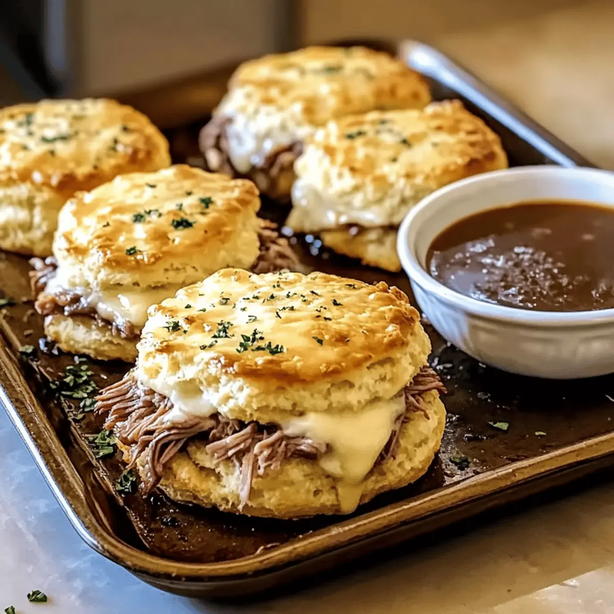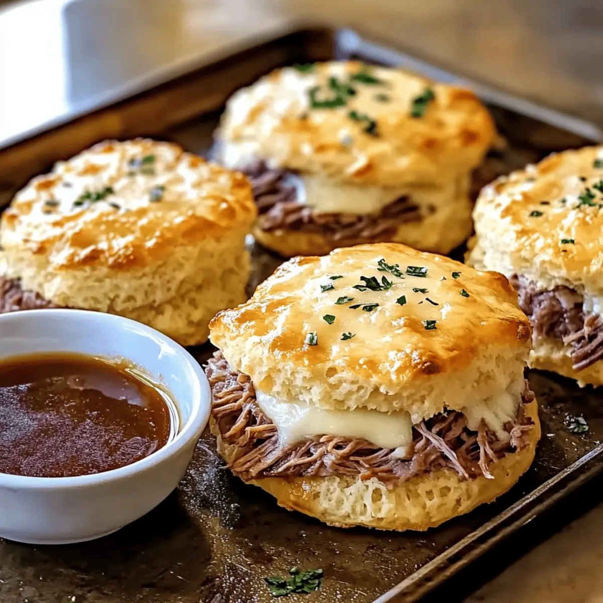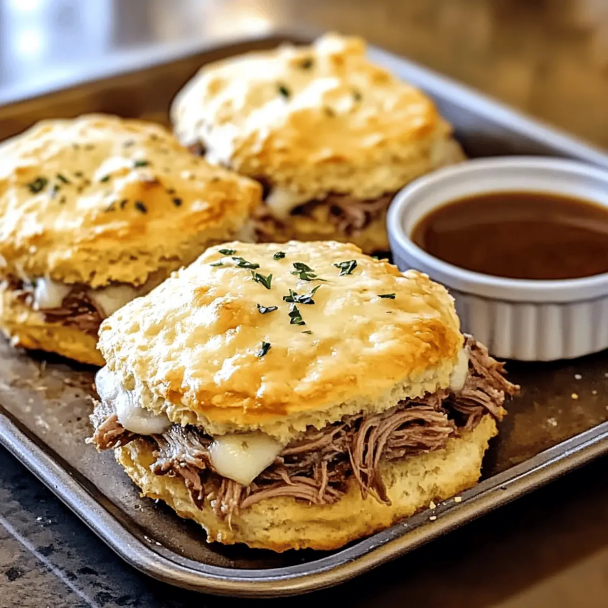 As I pulled the golden biscuits from the oven, a wave of savory aroma filled the kitchen, instantly transporting me to a cozy bistro. These Baked French Dip Biscuits are my go-to comfort food, combining tender roast beef and gooey melted cheese all enveloped in flaky biscuit dough. What I love most about this easy recipe is that it turns a classic French dip sandwich into a family-friendly meal that’s perfect for busy weeknights or casual gatherings. Not only are they quick to prepare, but they also promise a satisfying bite that everyone will adore. Ready to dip into this delightful culinary adventure? Let’s get started! Why Are These Biscuits So Irresistible? Comfort Food Redefined: Each bite of these Baked French Dip Biscuits envelops you in nostalgia, making it perfect for families or anyone craving a hearty meal. Easy to Make: In just 25 minutes, you can whip up these delicious bites, transforming a classic French dip sandwich into an effortless dish. Flavor Explosion: The rich combination of tender roast beef and gooey cheese creates a savory filling that’s irresistible when dipped in a warm au jus. Crowd-Pleasing Appeal: Whether it’s a weeknight dinner or a casual gathering, these biscuits are sure to impress everyone at the table. For a delightful pairing, consider serving them alongside a light salad or even with a side of Funfetti Dip Dessert for a sweet ending! Baked French Dip Biscuits Ingredients For the Filling Roast Beef – Use good-quality roast beef for the best flavor; turkey or chicken can be a tasty twist on this classic. Cheese – Swiss or provolone cheese adds creaminess; cheddar is a delightful choice for a sharper taste. For the Dough Biscuit Dough – Store-bought dough saves time, while homemade offers more personalized flavor; whatever you choose, keep it cold until ready to bake! For Dipping Au Jus – A flavorful dipping sauce that enhances the experience; it can be homemade with beef broth and spices or conveniently store-bought. Enjoy these Baked French Dip Biscuits that promise a heartwarming meal for your family! Step‑by‑Step Instructions for Baked French Dip Biscuits Step 1: Prep the Oven Begin by preheating your oven to 375°F (190°C). This will ensure that your Baked French Dip Biscuits cook evenly and develop that perfect golden brown exterior. While the oven heats, gather your baking sheet lined with parchment paper, ready to receive these delightful biscuits once they are filled. Step 2: Prepare Biscuit Dough Take your biscuit dough and gently flatten each biscuit to an even thickness of about ¼ inch. This will make them easier to fill while allowing for proper baking time. Aim for round shapes that can hold the savory filling. Place the flattened biscuits on a clean surface, keeping them close for easy assembly. Step 3: Add Filling Layer your delicious roast beef and cheese in the center of each flattened biscuit. Be generous but avoid overfilling, as you need to pinch the edges to seal them well. Make sure the filling is evenly distributed, leaving enough dough around the edges to prevent any leakage during baking. Step 4: Seal the Biscuits Carefully pinch the edges of the biscuits together, ensuring they are well sealed. This step is crucial for keeping the juicy filling inside as the Baked French Dip Biscuits bake. Use a fork to crimp the edges if desired, creating a decorative pattern while ensuring a secure closure. Step 5: Bake the Biscuits Arrange the sealed biscuits on your prepared baking sheet, spacing them an inch apart. Place them in the preheated oven and bake for 25 minutes or until they are puffed and beautifully golden. Keep an eye on them as they bake, letting the aroma fill your kitchen with anticipation. Step 6: Serve with Au Jus Once baked, carefully remove the biscuits from the oven and let them cool slightly. Serve warm with a small bowl of au jus for dipping. The rich, savory broth perfectly complements the Baked French Dip Biscuits, enhancing the delicious flavors of the roast beef and cheese filling. Make Ahead Options These Baked French Dip Biscuits are perfect for meal prep enthusiasts who want to save time during busy weeknights! You can prepare the biscuit dough and fill them with roast beef and cheese up to 24 hours in advance; simply refrigerate them until you’re ready to bake. To maintain quality, make sure to wrap the filled biscuits tightly in plastic wrap to keep them fresh. When you’re ready to enjoy, just pop them in the oven directly from the fridge, adding a couple of extra minutes to the baking time. This way, you’ll have warm, flaky Baked French Dip Biscuits that taste just as delicious as if they were freshly made! What to Serve with Baked French Dip Biscuits Kickstart a satisfying meal that wraps you in warmth and comfort with delightful sides and pairings! Crispy Sweet Potato Fries: Their natural sweetness and slight crunch complement the savory richness of the biscuits perfectly. Dip them in a garlic aioli for an extra flavor kick! Refreshing Garden Salad: A mix of mixed greens, cherry tomatoes, and cucumbers adds a light, fresh contrast, balancing the heartiness of the Baked French Dip Biscuits. Roasted Veggies: Seasoned roasted carrots and bell peppers provide a colorful side that enhances your plate while bringing a warm, earthy flavor to the table. Classic Coleslaw: The tangy crunch of coleslaw refreshes your palate between bites, making it an ideal side for these flavor-packed biscuits. Creamy Potato Gratin: Decadent layers of creamy potatoes bring richness that harmonizes beautifully with the robust flavors of the biscuits, making for a truly comforting meal. Homemade Creamy Tomato Soup: The iconic pairing of tomato soup and biscuits is a classic choice; the soup’s acidity cuts through the richness for a satisfying dip! Sparkling Lemonade: A bright, citrusy drink adds a refreshing note to the hearty meal, enhancing the overall dining experience. Chocolate Chip Cookies: For a
