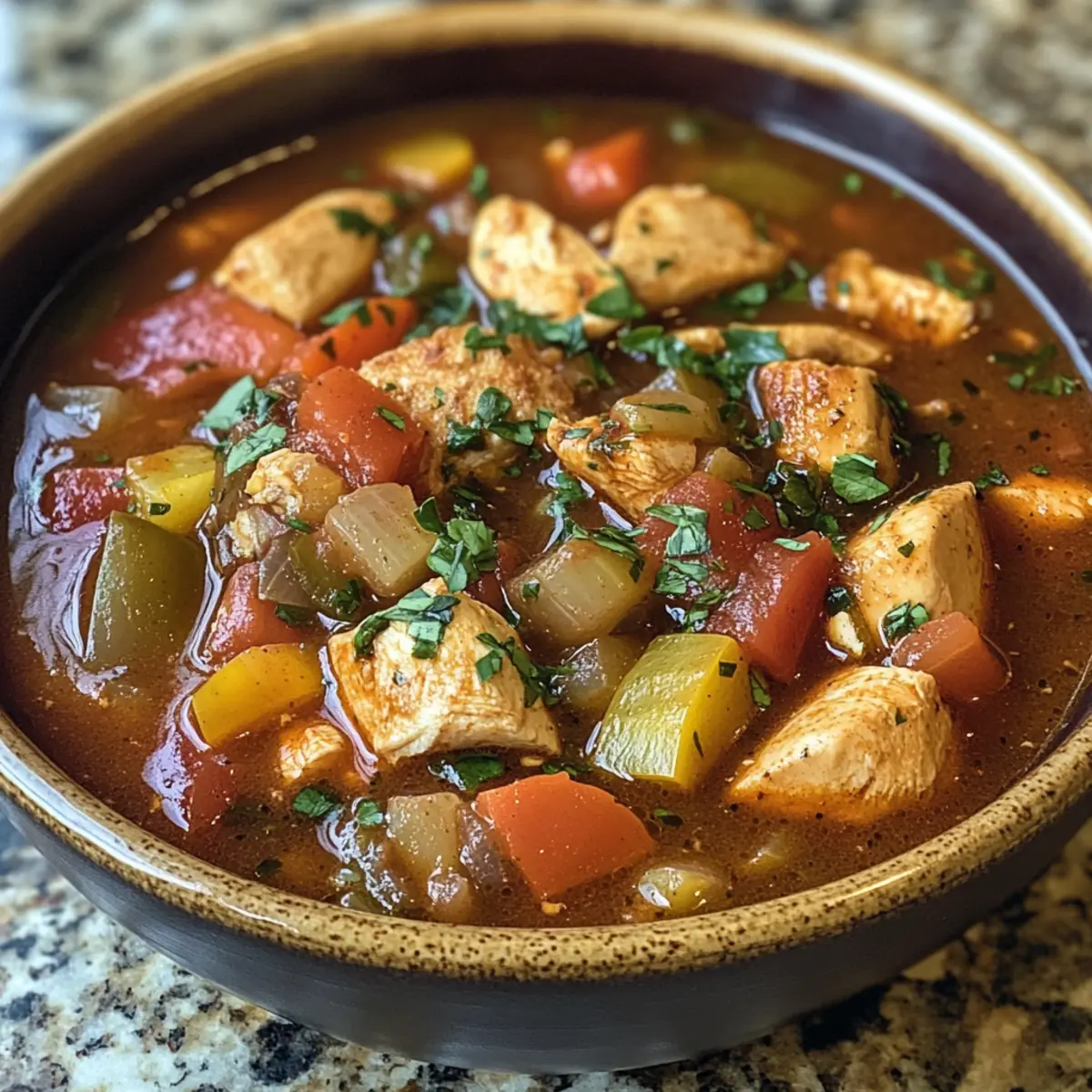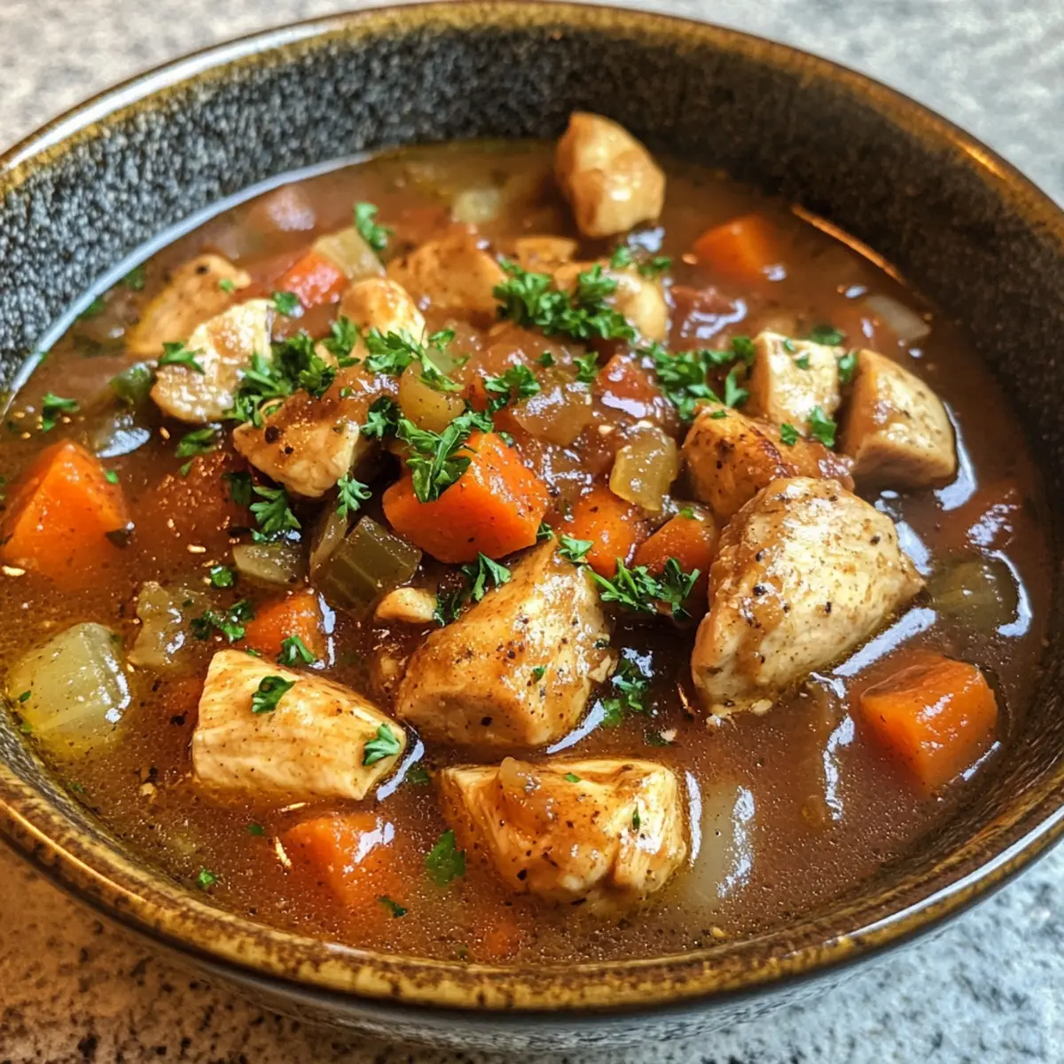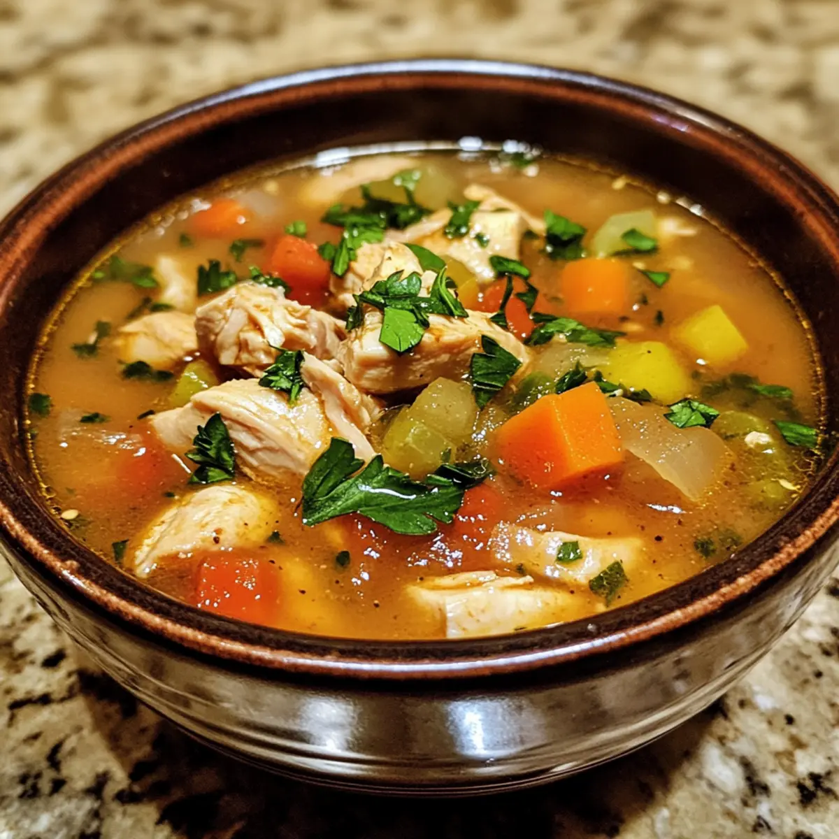 There’s nothing quite like the comforting aroma of BBQ wafting through your kitchen on a chilly evening. My Smoky BBQ Chicken Soup brings all that backyard goodness into a cozy bowl, combining tender chicken, sweet corn, and hearty beans for a delightful meal. This quick-cooking gem is perfect for those busy weeknights, taking just 30 minutes to whip up and ensuring satisfaction in every spoonful. Whether you’re winding down after a long day or looking to impress your loved ones, this dish is a surefire crowd-pleaser. And the best part? You can easily customize it with your favorite BBQ sauce or whatever beans you have on hand! Curious about how to create this smoky delight? Let’s dive in! Why is BBQ Chicken Soup a Must-Try? Comforting Aroma: The smell of smoky goodness fills your kitchen as this flavorful soup simmers, inviting everyone to gather around the table. Quick Cooking: Ready in just 30 minutes, it’s perfect for busy weeknights when you crave something hearty yet uncomplicated. Customizable Flavor: Choose your favorite BBQ sauce and switch up the beans for a unique twist each time you make it! Hearty Ingredients: Tender chicken, sweet corn, and colorful veggies create a nutritious, satisfying meal that warms you from the inside out. Crowd-Pleaser: Ideal for family dinners or gatherings, this BBQ Chicken Soup is sure to impress even the pickiest eaters. Try it alongside a slice of Cheesy Chicken Broccoli for a full, comforting experience! BBQ Chicken Soup Ingredients For the Soup Base • Chicken – 1.5 lb boneless, skinless chicken breasts provide the heartiness and protein needed for a fulfilling meal. • Olive Oil – 2 tablespoons divided, vital for sautéing and enhancing flavor. • Onion – 1 medium, diced for a sweet aroma base; yellow or white onions work well. • Carrot – 1 medium, diced, adding a subtle sweetness and texture to the soup. • Red Bell Pepper – 1 medium, diced for color and natural sweetness; feel free to substitute with any sweet bell pepper. • Garlic Cloves – 2 large, roughly chopped to enhance the aroma and flavor profile of the dish. For the Seasoning • Garlic Powder – 1 teaspoon to deepen the soup’s flavor; essential for creating a savory foundation. • Smoked Paprika – 1 teaspoon, a key player for imparting that delightful smoky flavor typical of BBQ. • Dried Oregano – 1 teaspoon adds herbal notes; can be swapped with Italian seasoning if desired. • Salt – ½ teaspoon helps to enhance all flavors; adjust according to taste. • Ground Black Pepper – ¼ teaspoon adds a touch of spiciness; use freshly ground for the best flavor impact. For the Hearty Add-ins • BBQ Sauce – 1 cup, the main flavoring agent that delivers that beloved BBQ essence; choose your favorite style. • Pinto Beans – 1 can (14 oz / 400g), drained and rinsed, contribute protein and substance; kidney or black beans work as well. • Sweetcorn – 1 can (7 oz / 200g), drained and rinsed, enhances sweetness and brings texture; frozen corn makes a great alternative. • Chicken Stock – 4 cups, the broth base for the soup, preferably low-sodium for better salt control. For Garnish • Fresh Parsley – ½ cup, roughly chopped, adds a bright finish to the soup; cilantro can be used for a different taste if you prefer. This BBQ Chicken Soup recipe is not just a warm hug in a bowl; it’s also a versatile dish you can adjust to fit your tastes! Enjoy making it your own! Step‑by‑Step Instructions for BBQ Chicken Soup Step 1: Season the Chicken In a mixing bowl, combine the diced chicken with garlic powder, smoked paprika, dried oregano, salt, and black pepper. Toss the chicken until it’s evenly coated with the seasonings, ensuring every piece is well-covered. This step enhances the flavors of your BBQ chicken soup and adds depth to the dish. Step 2: Brown the Chicken Heat 1 tablespoon of olive oil in a large pot over medium heat. Once the oil is shimmering, add the seasoned chicken in a single layer, cooking for about 5–7 minutes. Stir occasionally until the chicken is browned on all sides but not fully cooked; remove it from the pot and set aside to keep it warm. Step 3: Sauté the Vegetables In the same pot, add the remaining tablespoon of olive oil and toss in the diced onion, carrot, and bell pepper. Sauté for approximately 5 minutes, stirring frequently, until the vegetables are softened and aromatic. This creates a flavorful base for your BBQ chicken soup, adding sweetness and color. Step 4: Add Garlic Add the chopped garlic to the sautéed vegetables and cook for another minute, stirring constantly. This step infuses the dish with fragrant garlic aroma, enhancing the richness of your BBQ chicken soup. Make sure the garlic just reaches a golden color without burning for the best flavor. Step 5: Combine Ingredients Return the browned chicken to the pot and stir in the BBQ sauce, rinsed pinto beans, sweetcorn, and chicken stock. Mix well to combine all ingredients, ensuring everything is submerged in the broth. This melding of flavors is crucial for crafting a hearty BBQ chicken soup that boasts a smoky flavor. Step 6: Simmer the Soup Increase the heat to bring the pot to a rolling boil, then reduce it to a gentle simmer. Cover the pot and let the BBQ chicken soup simmer for 10 minutes, allowing the flavors to meld and the chicken to cook through completely. Stir occasionally, and enjoy the comforting aroma wafting through your kitchen. Step 7: Final Touches After simmering, stir in the chopped parsley and taste the soup. Adjust the seasoning as needed, adding more salt or spice to match your preference. The fresh parsley adds a pop of color and brightness to your BBQ chicken soup, enhancing its overall appeal before serving. Step 8: Serve the Soup Ladle the hot BBQ chicken soup into bowls and garnish with additional toppings if desired, such as sliced red onion or a dollop of sour cream. Pair it with crusty bread or cornbread fo
