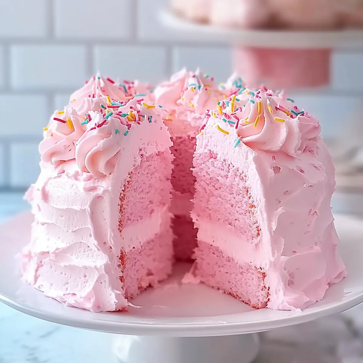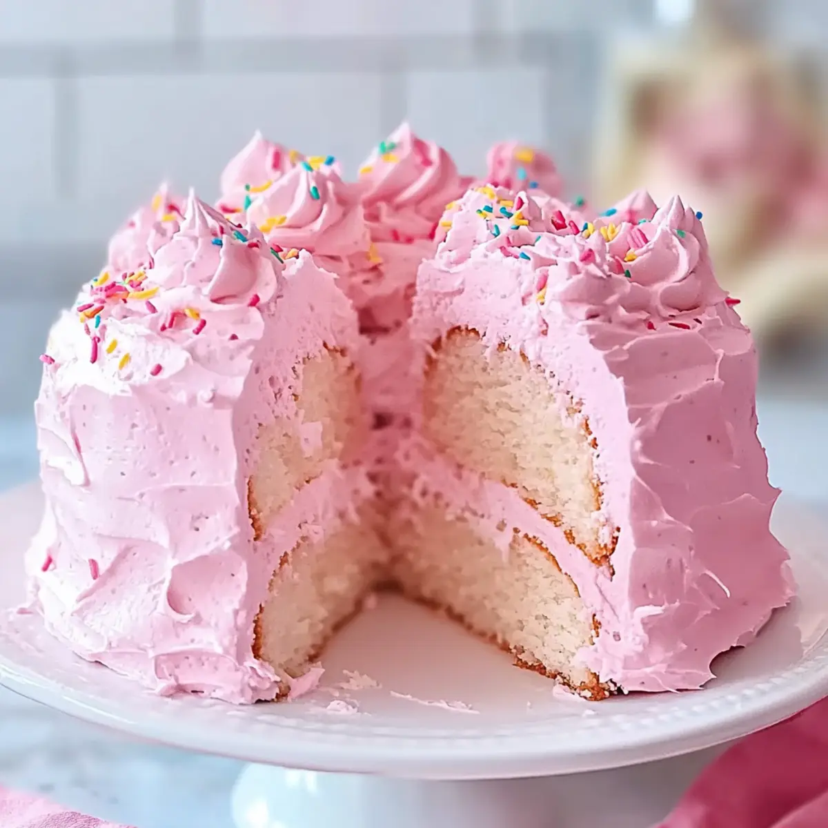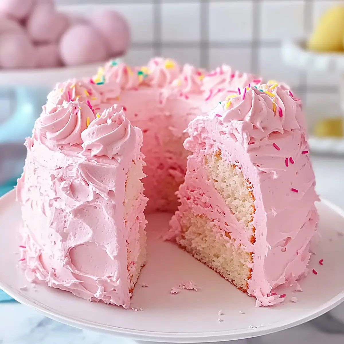 As I whisked those fluffy egg whites, a sweet pinch of nostalgia hit me—my grandmother always said that the key to a light and airy dessert was love, and this Beautiful Pink Angel Food Cake is proof. With its enchanting pink hue and soft texture infused with fresh strawberry flavor, this cake is more than just a treat; it’s a vibrant centerpiece for any celebration. Whether you’re hosting a spring gathering or a birthday bash, this cake is delightfully simple to prepare and will leave your guests asking for seconds. Each slice is like a bite of joy, reminding us just how special homemade desserts can be. Ready to bring a touch of whimsy to your next occasion? Let’s dive into this heavenly recipe! Why is this cake so special? Celebration-Ready: This Beautiful Pink Angel Food Cake is a stunning showstopper, perfect for any gathering, whether it’s a birthday or a spring picnic. Easy to Make: Don’t worry if you’re not a baking pro! With just a few steps, this cake will impress without causing stress. Cheerful Aesthetic: The delightful pink hue and fluffy texture will bring smiles to everyone at the table. Add some fresh strawberries on top, and you’ve got a charming dessert. Light and Sweet: Each bite melts in your mouth with a perfect balance of sweetness, thanks to the marshmallow frosting. Versatile Toppings: You can let your creativity shine! Top it with fruits, whipped cream, or even some optional sprinkles for a festive touch. For more fun dessert ideas, check out my Chocolate Eclair Cake or Mini Pineapple Cheesecakes! Beautiful Pink Angel Food Cake Ingredients • For the Cake Cake Flour – Provides structure and a light texture; for a lighter result, try sifting all-purpose flour. Powdered Sugar – Sweetens without a gritty texture; no direct substitution recommended. Salt – Balances overall flavor; just a pinch is sufficient. Egg Whites (13-14 large) – Essential for leavening; ensure they’re at room temperature for optimal whipping; carton egg whites can be used, but may not whip up as well. Cream of Tartar – Stabilizes egg whites; no substitution suggested. Superfine Sugar – Sweetens and helps achieve a tender crumb; pulse granulated sugar if superfine isn’t available. Vanilla Bean Paste/Pure Vanilla Extract – Adds flavor depth; can be substituted with almond extract for a different twist. Almond Extract (optional) – Provides nutty undertones; can be replaced with more vanilla if desired. Pink Food Coloring (optional) – Enhances aesthetic appeal; adjust for your perfect shade. • For the Frosting Granulated Sugar – Sweetens and achieves a glossy, sturdy texture in the frosting; cannot be replaced. Light Corn Syrup – Adds sweetness and smooth consistency; omit with caution if needed. Step‑by‑Step Instructions for Beautiful Pink Angel Food Cake Step 1: Prep Oven & Ingredients Preheat your oven to 350°F (180°C) to ensure a proper baking environment for your Beautiful Pink Angel Food Cake. While the oven warms, sift together the cake flour, powdered sugar, and salt four times using a fine sieve to incorporate air, which helps achieve a light and airy texture. Set this mixture aside for later. Step 2: Whip Egg Whites Clean your mixing bowl and beaters thoroughly with lemon juice to eliminate any grease, ensuring the egg whites whip up perfectly. In the prepared bowl, beat the egg whites on medium speed until frothy, about 1-2 minutes, then add the cream of tartar. Gradually sprinkle in the superfine sugar while continuing to beat until soft to medium peaks form, then gently fold in the vanilla, almond extract, and pink food coloring. Step 3: Combine Mixtures Gently sift the dry ingredient mixture over the whipped egg whites in four separate additions, ensuring you maintain the airy texture. Carefully fold the dry ingredients into the egg whites using a rubber spatula, being cautious not to deflate the mixture. Each addition should be just combined before adding the next, resulting in a beautifully airy batter. Step 4: Bake Cake Transfer the fluffy batter into an ungreased angel food cake pan, smoothing the top with a spatula. Bake in the preheated oven for approximately 35 minutes until the cake springs back when lightly touched, and a skewer inserted into the center comes out clean. Do not open the oven door during baking to prevent the cake from collapsing. Step 5: Cool Cake Immediately invert the angel food cake pan after removing it from the oven; this will help maintain its height and texture. Allow the cake to cool upside down for at least 1 hour. This cooling method ensures that it fully sets and retains its airy structure, providing the perfect base for your frosting. Step 6: Prepare Frosting While the cake cools, prepare the marshmallow frosting. In a heatproof bowl placed over simmering water, whip egg whites with sugar, light corn syrup, cream of tartar, and a pinch of salt. Stir constantly until the mixture reaches 130°F (54°C). Then, transfer to a mixer and beat on high speed until thick and glossy, about 7-10 minutes, before folding in the vanilla and optional food coloring. Step 7: Frost Cake Once the Beautiful Pink Angel Food Cake is completely cooled, take it out of the pan and frost it generously with the marshmallow frosting using a spatula. Feel free to add a playful touch by sprinkling your favorite toppings, such as colorful sprinkles or fresh fruits, to make this delightful cake truly shine at your celebration. What to Serve with Light and Fluffy Pink Angel Food Cake? Whether it’s a birthday celebration or a whimsical spring gathering, a delightful Pink Angel Food Cake deserves equally lovely companions to create a festive table. Fresh Berries: A medley of strawberries, raspberries, and blueberries adds vibrant color and tartness, beautifully balancing the cake’s sweetness. The juicy bursts of flavor elevate each bite. Whipped Cream: Light and fluffy whipped cream complements the airy texture of the cake, provid