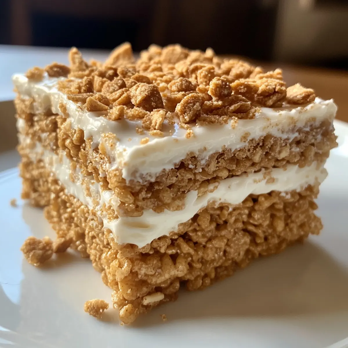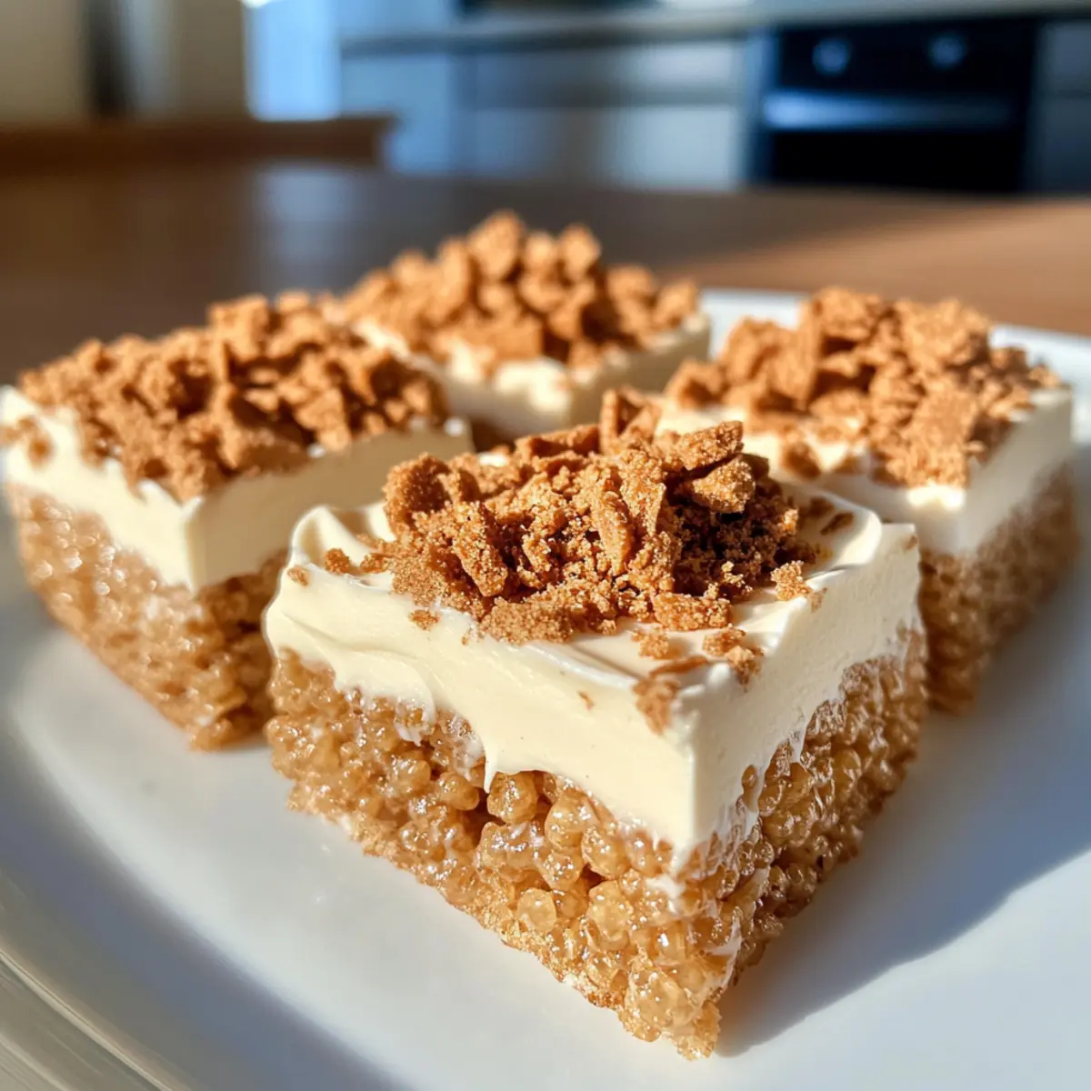 I stumbled into my kitchen today, craving something nostalgic yet a little daring. Enter the Biscoff Rice Krispie Treats—those delightful sweet morsels that effortlessly blend crunchy and chewy textures, all while transporting me back to childhood bake sales. This no-bake easy dessert boasts the irresistible flavor of Biscoff spread, making it a must-have for gatherings or a simple family treat. With minimal prep and no cooking required, these treats come together to satisfy your sweet tooth in no time. Whether you’re packing them in lunchboxes or serving them at a picnic, they are sure to impress. Ready to whip up a batch of nostalgia? Let’s dive into the recipe! Why are Biscoff Rice Krispie Treats a must-try? Irresistible Flavor: The creamy, caramel notes of Biscoff spread elevate these treats beyond your everyday sweets. No-Bake Ease: With a simple method, you can whip these up in under 30 minutes—perfect for the busy home chef. Crowd-Pleasing Goodness: Ideal for parties, bake sales, or family gatherings, these treats are bound to steal the show! Customizable Delight: Want a twist? Try adding a pinch of sea salt, or mix in some mini marshmallows for extra chew. Perfect Texture: Enjoy the delightful contrast of crunchy Rice Krispies paired with gooey Biscoff spread and smooth white chocolate topping. These treats are your new go-to for sweet cravings! If you’re looking for more delicious recipes, check out Chicken Broccoli Rice or Onion Butter Rice. Biscoff Rice Krispie Treats Ingredients • Whip up these delectable Biscoff Rice Krispie Treats with simple ingredients you probably already have at home! For the Base Salted Butter – Adds creaminess and flavor. Unsalted butter can be used, but add a pinch of salt for balance. Marshmallows – Provide sweetness and a chewy texture. Using mini marshmallows makes melting quicker and easier. Lotus Biscoff Spread – Introduces that signature caramelized cookie flavor. You can substitute with any cookie butter if preferred. Rice Krispies – The base component that provides crunch and structure. Feel free to use other puffed rice cereals if desired. For the Topping White Chocolate – Adds a creamy layer on top for an extra sweet touch. Alternatively, milk or dark chocolate can be used based on your taste. Lotus Biscoff Biscuits – For topping and an additional crunch. Any caramelized biscuit works well for that delightful crunch. Ready to create a sweet masterpiece with these Biscoff Rice Krispie Treats? Let’s get started! Step‑by‑Step Instructions for Biscoff Rice Krispie Treats Step 1: Prepare Your Pan Begin by lining a deep 20cm (8-inch) square baking tin with baking paper, allowing some overhang for easy removal later. This step is crucial for ensuring your Biscoff Rice Krispie Treats lift out perfectly once set. Make sure the paper is smooth against the base and sides of the tin to prevent sticking. Step 2: Melt the Mixture In a large microwave-safe bowl, combine salted butter, Biscoff spread, and marshmallows. Microwave the mixture in 30-second intervals, stirring between each session, until everything is fully melted and smooth. This should take about 1.5 to 2 minutes total. Look for a glossy, creamy texture without any lumps—a delightful start to your treats! Step 3: Combine with Rice Krispies Once melted, add the Rice Krispies to the Biscoff mixture and gently fold them in with a spatula. Stir until all the rice cereal is well coated with the sticky, sweet mixture. This should take about 2-3 minutes. Ensure that every cluster gets the delicious Biscoff flavor while the mix remains fluffy. Step 4: Press into the Tin Transfer the mixture to the lined tin and, using your hands (you may want to butter them lightly to prevent sticking), press it down firmly and evenly. Make sure the mixture is compact and level; this will help your Biscoff Rice Krispie Treats hold their shape once cut. This step should take about 3-5 minutes. Step 5: Melt the White Chocolate In another microwave-safe bowl, melt your white chocolate using 30-second intervals, stirring until smooth. This process should take around 1-1.5 minutes. The chocolate should be glossy and pourable. This luscious layer will take your treats to the next level, so don’t rush! Step 6: Drizzle and Spread Pour the melted white chocolate over the pressed rice krispie mixture in the tin. Use a spatula to gently spread the chocolate to the edges, ensuring even coverage. This beautiful layer adds sweetness and a creamy texture to the Biscoff Rice Krispie Treats, making them extra decadent. Step 7: Add Biscoff Cookies Top the melted chocolate with whole and broken pieces of Biscoff biscuits, pressing them gently into the chocolate. This adds a delightful crunch and enhances the Biscoff flavor throughout. Once everything is arranged, your treats are almost ready! Step 8: Chill to Set Place the entire tin in the refrigerator for about 30 minutes to allow the treats to set. You’ll know they’re ready when the chocolate has hardened and the treats feel firm to the touch. This cooling time creates perfectly chewy and firm Biscoff Rice Krispie Treats that will slice beautifully. Step 9: Slice and Serve Once set, remove the treats from the tin by lifting them out using the baking paper overhang. Cut them into squares with a sharp knife. Wipe the knife after each cut for clean edges. Now, your Biscoff Rice Krispie Treats are ready to be served, sharing sweetness and nostalgia with everyone! Biscoff Rice Krispie Treats Variations Feel free to customize your delightful Biscoff rice krispie treats with these tasty twists! Salted Caramel: Sprinkle sea salt on top of the white chocolate to enhance those caramel flavors. The sweet and salty contrast is divine! Peanut Butter: Mix in a few tablespoons of creamy peanut butter along with the Biscoff spread. It adds a nutty depth that pairs beautifully with the sweetness. Textured Delight: Fold in mini marshmallows or chocolate chips fo