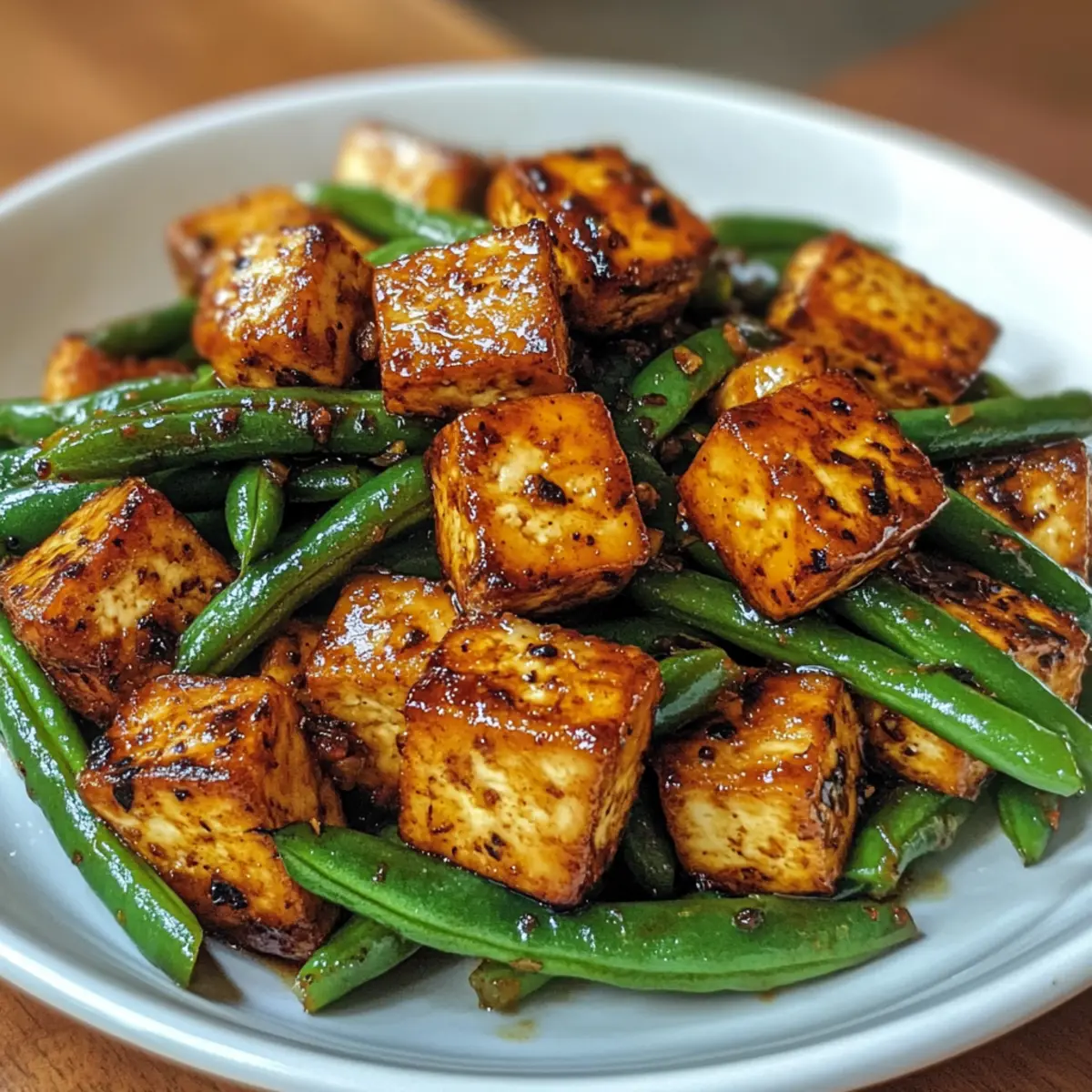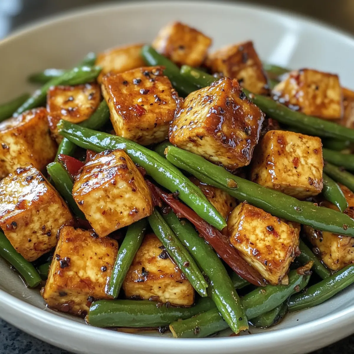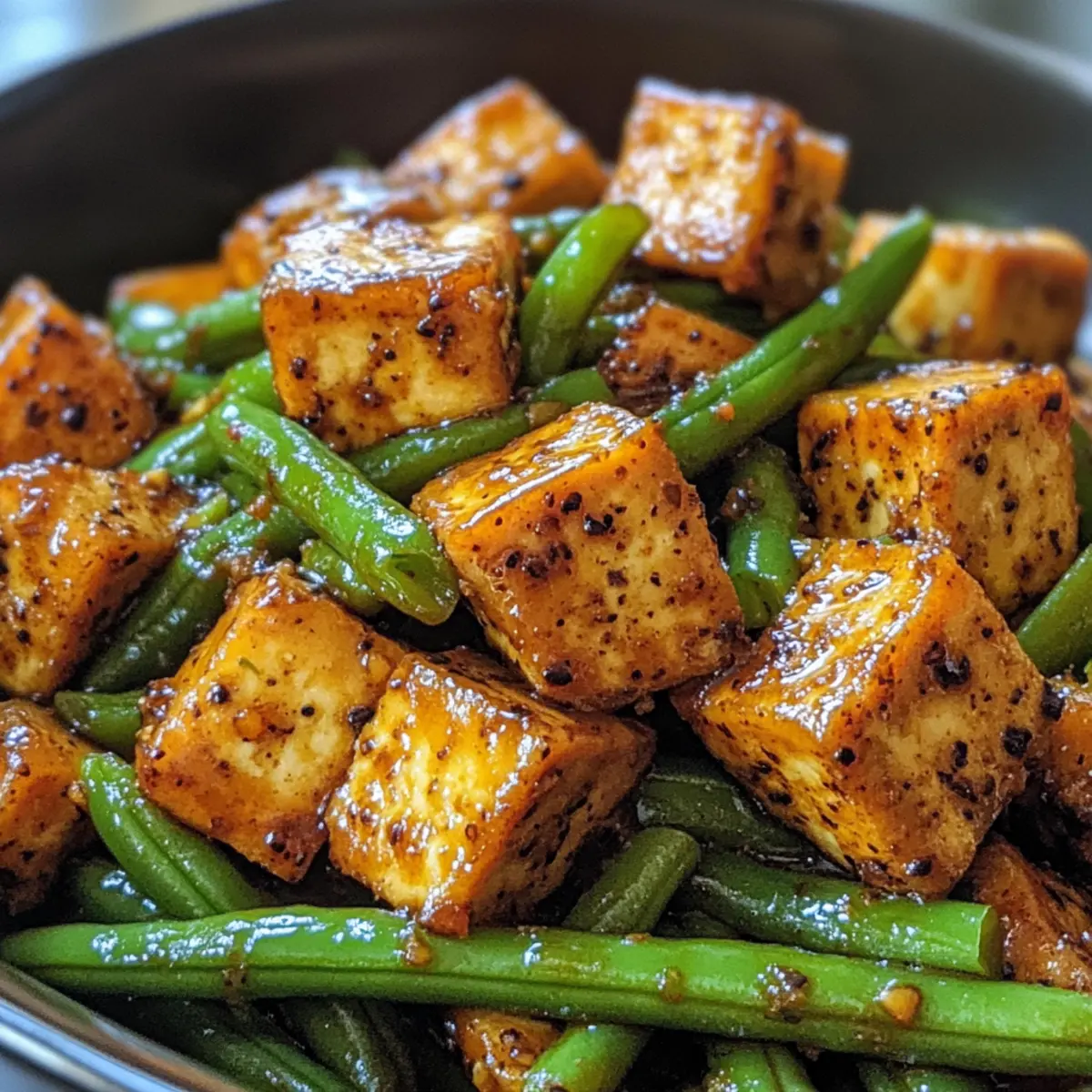“Wait, how can something so simple taste this good?” That was me, utterly surprised after my first bite of Black Pepper Tofu & Green Beans. This vibrant vegan stir-fry is an absolute game-changer for weeknight dinners, bringing crispy tofu and fresh green beans together in a delightful union of savory goodness. The best part? You can whip it up in just 40 minutes! With only five ingredients, it’s perfect for those busy days when you want a meal that feels both healthy and indulgent. Plus, it’s gluten-free and flexible, allowing you to swap in your favorite veggies for a personalized touch. Are you ready to experience this tasty triumph in your own kitchen? Let’s dive in! What Makes This Stir-Fry Stand Out? Simplicity at its finest: With just five ingredients, this dish proves that you don’t need a lengthy list to create something delicious. Crispy Tofu perfection: The key to this recipe is the extra-firm tofu, which transforms into a golden, crunchy delight when stir-fried. Versatile options: Feel free to swap in your favorite veggies like bell peppers or broccoli for a custom twist, just like in my Ground Turkey Peppers recipe. Quick Cooking time: Ready in about 40 minutes, this meal is perfect for busy weeknights! Crowd-Pleasing flavor: The combination of savory black pepper and fresh green beans creates a dish that’s sure to impress family and friends. Don’t forget to check out my easy Hot Honey Blackened Shrimp Caesar Salad for another fast favorite! Healthy and Hearty: Each serving is around 232 calories, making it a mindful yet satisfying choice for dinner! Black Pepper Tofu & Green Beans Ingredients • For a Flavorful Stir-Fry Firm Tofu – Must be extra firm for crispiness, ensuring a delightful texture. Cornstarch – Coats tofu for extra crispiness during frying; don’t substitute with alternatives like tapioca starch. Sesame Oil – Ideal for cooking; it contributes great flavor and can withstand high heat. If needed, replace with canola or avocado oil. • For the Sauce Tamari or Soy Sauce – The base of the black pepper sauce; tamari is preferred for gluten-free diets. Adjust for saltiness with low-sodium options. Organic Sugar – Balances the savory notes of the dish; you can use coconut sugar for a refined sugar-free option. Ground Ginger – Enhances depth of flavor; fresh ginger can also be used for a more intense taste. Black Pepper – Key seasoning; fresh ground black pepper adds spiciness, and you can adjust according to your taste. • For the Vegetables Chopped Green Beans – Adds freshness and crunch, but feel free to substitute with other veggies like bell peppers or broccoli as desired. Shallots – Provides sweetness and depth of flavor; finely chopped for better integration. • Optional Garnish Fresh Thai Basil – An optional garnish that adds a burst of freshness and delightful aroma. This enchanting combination of ingredients will leave you craving more of this Black Pepper Tofu & Green Beans stir-fry. Happy cooking! Step‑by‑Step Instructions for Black Pepper Tofu & Green Beans Step 1: Prepare Tofu Begin by pressing the extra-firm tofu to remove excess moisture, which will help achieve that desirable crispiness. Cut the tofu into 1-inch cubes and gently coat each piece with cornstarch, ensuring an even layer. This step is crucial for a perfectly crunchy texture in your Black Pepper Tofu & Green Beans. Step 2: Cook Tofu Heat a generous drizzle of sesame oil in a wok over high heat. Once the oil shimmers, carefully add the coated tofu cubes to the pan. Stir-fry for about 10-15 minutes, gently turning the tofu until all sides are golden brown and crispy. This golden color means the tofu is ready to be removed and set aside while you prepare the next delicious steps. Step 3: Make Sauce In a mixing bowl, whisk together the tamari or soy sauce, water or vegetable broth, organic sugar, ground ginger, and freshly cracked black pepper. The mixture should blend smoothly, resulting in a glossy black pepper sauce that promises to elevate your Black Pepper Tofu & Green Beans dish. Set this aside to allow the flavors to meld while you stir-fry the vegetables. Step 4: Stir-Fry Vegetables In the same wok, add a bit more sesame oil if needed, then toss in the finely chopped shallots and chopped green beans. Stir-fry these for approximately 5 minutes over medium-high heat until the shallots turn translucent and fragrant. This melds the flavors beautifully, creating a vibrant base for your tofu. Step 5: Combine Everything Return the crispy tofu to the wok with the sautéed vegetables. Pour in the prepared black pepper sauce and mix everything together thoroughly. Continue to cook for an additional 3-5 minutes, allowing the sauce to coat the tofu and green beans evenly. You’ll know it’s ready when everything is heated through and saucy. Step 6: Serve Plate your comforting Black Pepper Tofu & Green Beans over a bed of fluffy rice, if desired. Finally, garnish with fresh Thai basil for a fragrant finish. The combination of crispy tofu, crunchy green beans, and the rich sauce will create an unforgettable dining experience! Make Ahead Options These Black Pepper Tofu & Green Beans are fantastic for meal prep, saving you precious time during busy weeknights! You can prepare the tofu by pressing and cutting it into cubes, then coating it with cornstarch up to 24 hours in advance. Additionally, chop your green beans and shallots ahead of time, placing them in an airtight container in the refrigerator. When you’re ready to enjoy your dish, follow the cooking instructions as detailed. This way, you’ll have a quick, delicious meal on the table in no time, with all the flavors just as fresh and vibrant as if cooked on the spot! Black Pepper Tofu & Green Beans Variations Feel free to get creative and customize this dish to suit your taste buds and pantry. Vegetable Swap: Replace green beans with bell peppers, snap peas, or bok choy for a fresh burst of col