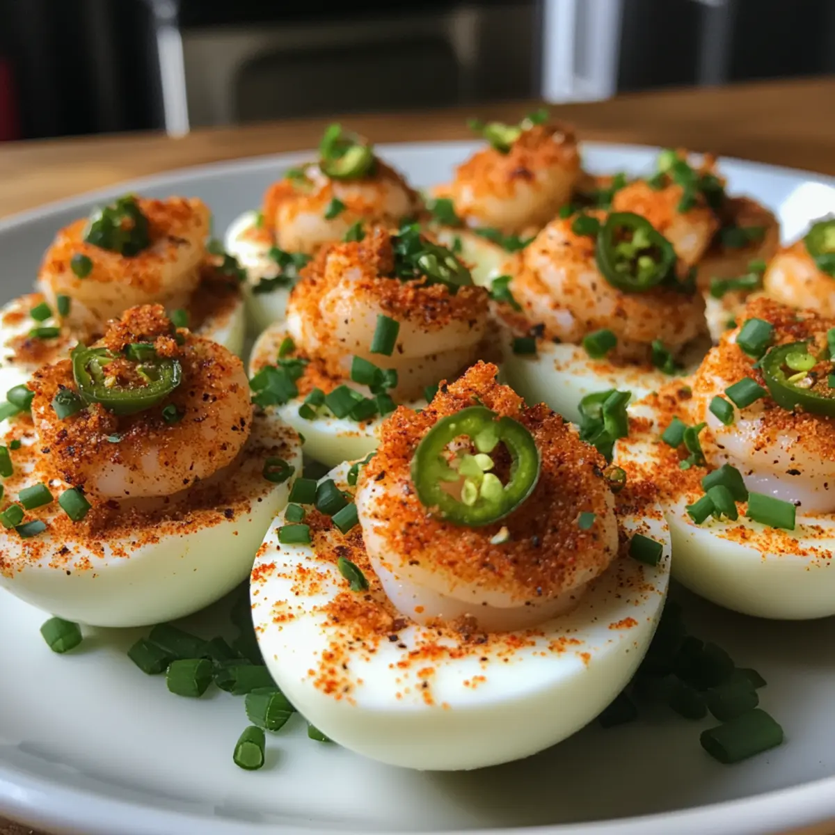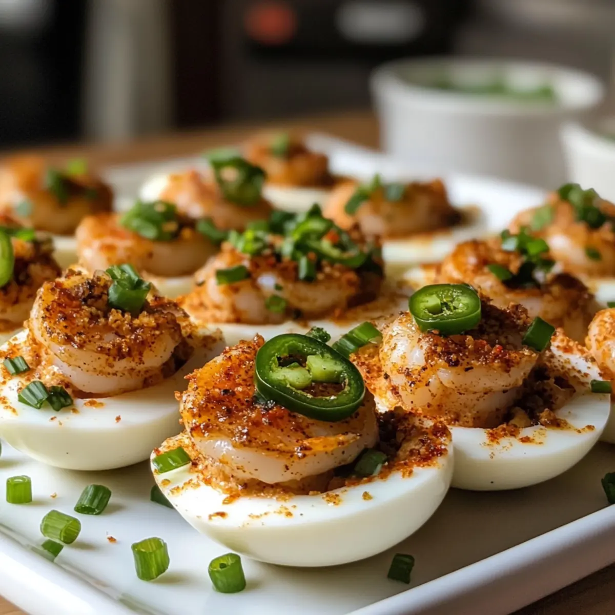 As my friends and I cheered at the last gathering, someone suddenly exclaimed, “These deviled eggs are on fire!” Little did they know, in addition to the delightful kick they’re famous for, these Cajun Shrimp Deviled Eggs redefine the classic appetizer experience. With creamy yolk filling infused with vibrant Cajun spices and topped with succulent, blackened shrimp, this dish promises to be a crowd-pleaser at your next gathering. Not only is it gluten-free, making it accessible for everyone, but it’s also quick to whip up, which means you’ll spend less time in the kitchen and more time enjoying the company of your loved ones. So, are you ready to take your appetizer game to the next level? Why Are These Deviled Eggs Special? Bold Flavors: Each bite bursts with a delightful fusion of spice and zest, elevating the classic deviled egg to new heights. Easy Preparation: This recipe is simple and quick, perfect for weeknight dinners or last-minute gatherings. Visual Appeal: The vibrant colors from the jalapeños and shrimp create an eye-catching dish that guests won’t resist. Versatile Ingredients: Feel free to swap proteins or add toppings like bacon for a personal touch. Check out Air Fryer Shrimp for more shrimp inspirations! Crowd-Pleasing: From casual get-togethers to fancy parties, these Cajun Shrimp Deviled Eggs are sure to impress everyone with their exciting flavor profile! Cajun Shrimp Deviled Eggs Ingredients For the Filling Eggs – Use large eggs for a creamy and stable base. Mayonnaise – Adds richness; Greek yogurt is a great light alternative. Dijon Mustard – Provides tang; yellow mustard works if you’re in a pinch. Hot Sauce – Adds heat; adjust to your spice level preference. Cajun Seasoning – Infuses your filling with authentic flavor; homemade mixes really shine here. Granulated Sugar (optional) – Balances flavors; omit if you’re cutting back on sweetness. For the Topping Large Shrimp – Fresh or thawed frozen shrimp works beautifully as a protein-packed topping. Olive Oil – Perfect for sautéing shrimp; any neutral oil can be used instead. Jalapeño – Adds a spicy pop and bright color; substitute with milder peppers if desired. Fresh Chives – Enhances presentation and flavor; green onions are a suitable replacement. For Serving Lemon Wedges – A splash of zest can elevate flavors; highly recommended for brightness! Step‑by‑Step Instructions for Cajun Shrimp Deviled Eggs Step 1: Hard-Boil Eggs Start by placing large eggs in a saucepan and cover them with cold water. Bring the water to a rolling boil over medium-high heat, then remove the pan from heat. Cover the pan and let it sit for 12 minutes. Once done, drain the hot water and transfer the eggs to an ice bath for about 5 minutes to cool completely before peeling. Step 2: Prepare Filling Once the eggs are cool, carefully peel them and slice them in half lengthwise. Scoop the creamy yolks into a mixing bowl and set the egg whites aside. Mash the yolks with a fork until smooth, then mix in mayonnaise, Dijon mustard, hot sauce, sugar, and Cajun seasoning until well combined. Chill this zesty filling in the refrigerator while you prepare the shrimp. Step 3: Cook Shrimp Season the large shrimp with a generous sprinkle of Cajun seasoning for that soul-satisfying flavor. Heat a tablespoon of olive oil in a skillet over medium-high heat. Sauté the shrimp for about 2-3 minutes, or until they turn pink and opaque. Remove them from the skillet and let them cool on a plate while you assemble the deviled eggs. Step 4: Assemble Eggs Retrieve the chilled yolk mixture and fill the hollowed egg whites using a piping bag or spoon. Fill each egg generously with the creamy Cajun shrimp filling, making sure to heap it a bit for a delightful presentation. Top each filled egg with a perfectly cooked shrimp, a slice of fresh jalapeño, and a sprinkle of chopped chives for an extra burst of color and flavor. Step 5: Serve and Enjoy These Cajun Shrimp Deviled Eggs can be served immediately or chilled in the refrigerator for up to 2 hours if you prefer. Arrange them on a serving platter and garnish with lemon wedges for an added zesty kick. Gather your friends and family, and watch them fall in love with this flavorful twist on a classic appetizer! Expert Tips for Cajun Shrimp Deviled Eggs Perfect Peeling: Use eggs that are at least a week old; older eggs peel more easily, preventing frustration during prep. Flavor Balance: Adjust the Cajun seasoning according to your taste preferences; don’t be afraid to customize the heat level to suit your guests. Prevent Overcooking: Sauté shrimp just until they turn pink and opaque for the best texture; avoid leaving them on the heat too long to prevent rubberiness. Make Ahead: Prepare the filling up to two days in advance and keep it separate from the egg whites for easy assembly right before serving. Presentation Matters: Use a piping bag for a beautiful, professional look when filling the eggs; don’t hesitate to heap the filling for added appeal! Storage Tips for Cajun Shrimp Deviled Eggs Fridge: Store assembled Cajun Shrimp Deviled Eggs in an airtight container for up to 3 days to maintain freshness. This keeps the flavors intact while avoiding any sogginess. Separate Filling: If you prefer longer storage, keep the filling and egg whites separate. The filling can stay in the fridge for up to 2 days, allowing you to assemble them just before serving. Freezer: We recommend not freezing the assembled deviled eggs, as the texture of the eggs may become compromised. Instead, freeze the filling in an airtight container for up to 1 month for easy future use. Reheating: Reheating is not necessary for deviled eggs; they’re best enjoyed cold or at room temperature. If you’ve made the filling in advance, simply thaw it in the fridge overnight before use. Make Ahead Options These Cajun Shrimp Deviled Eggs are fantastic for meal prep, allowing you to enjoy delicious appeti