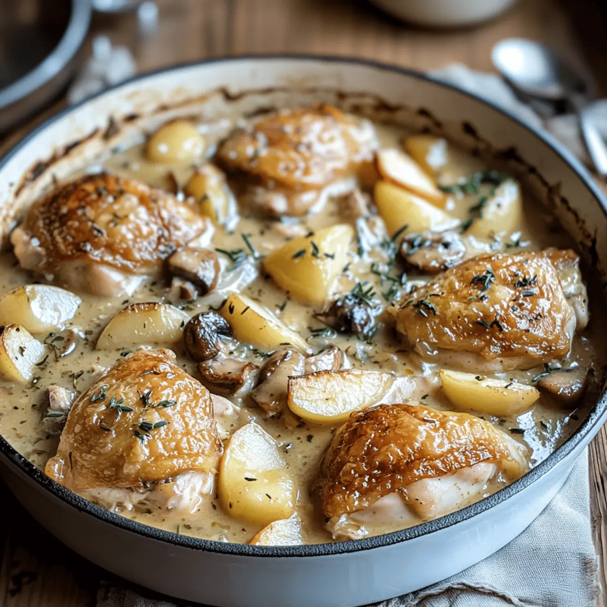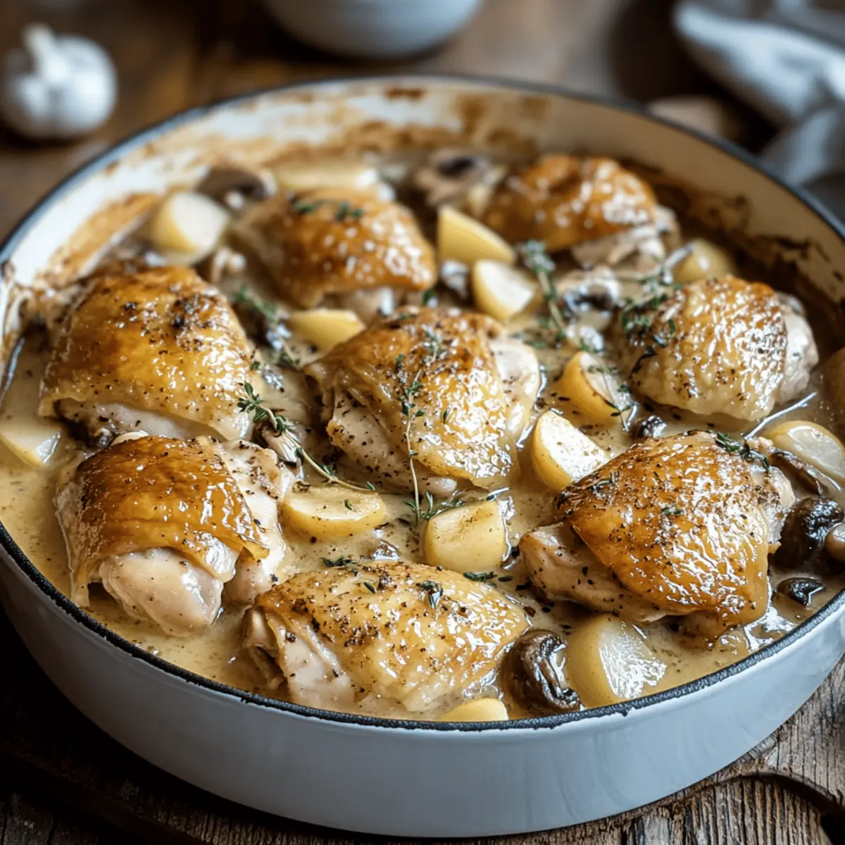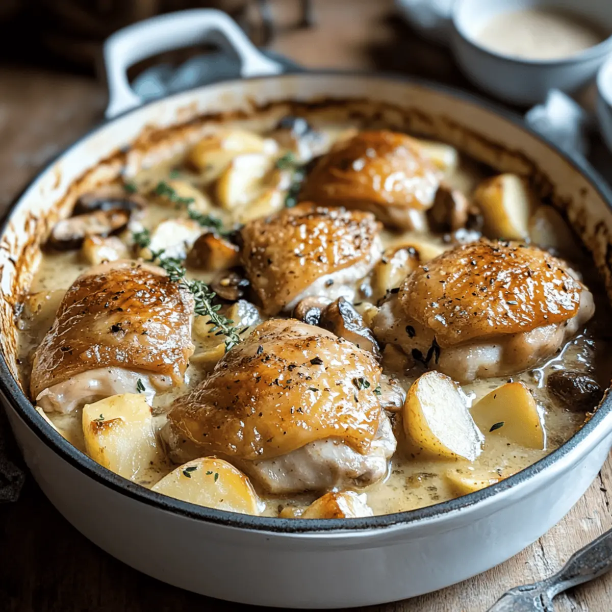 Comforting, Rustic Appeal: This dish brings warmth and coziness straight to your table. The succulent chicken thighs, sweet apples, and earthy mushrooms create a delightful blend that feels like a hug in a bowl.