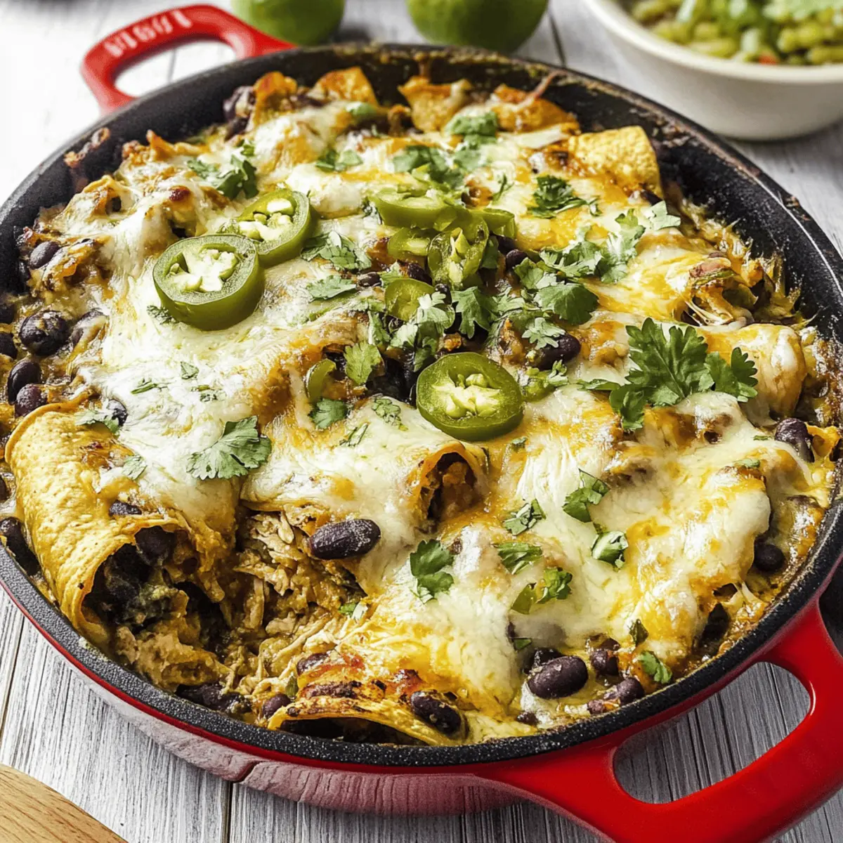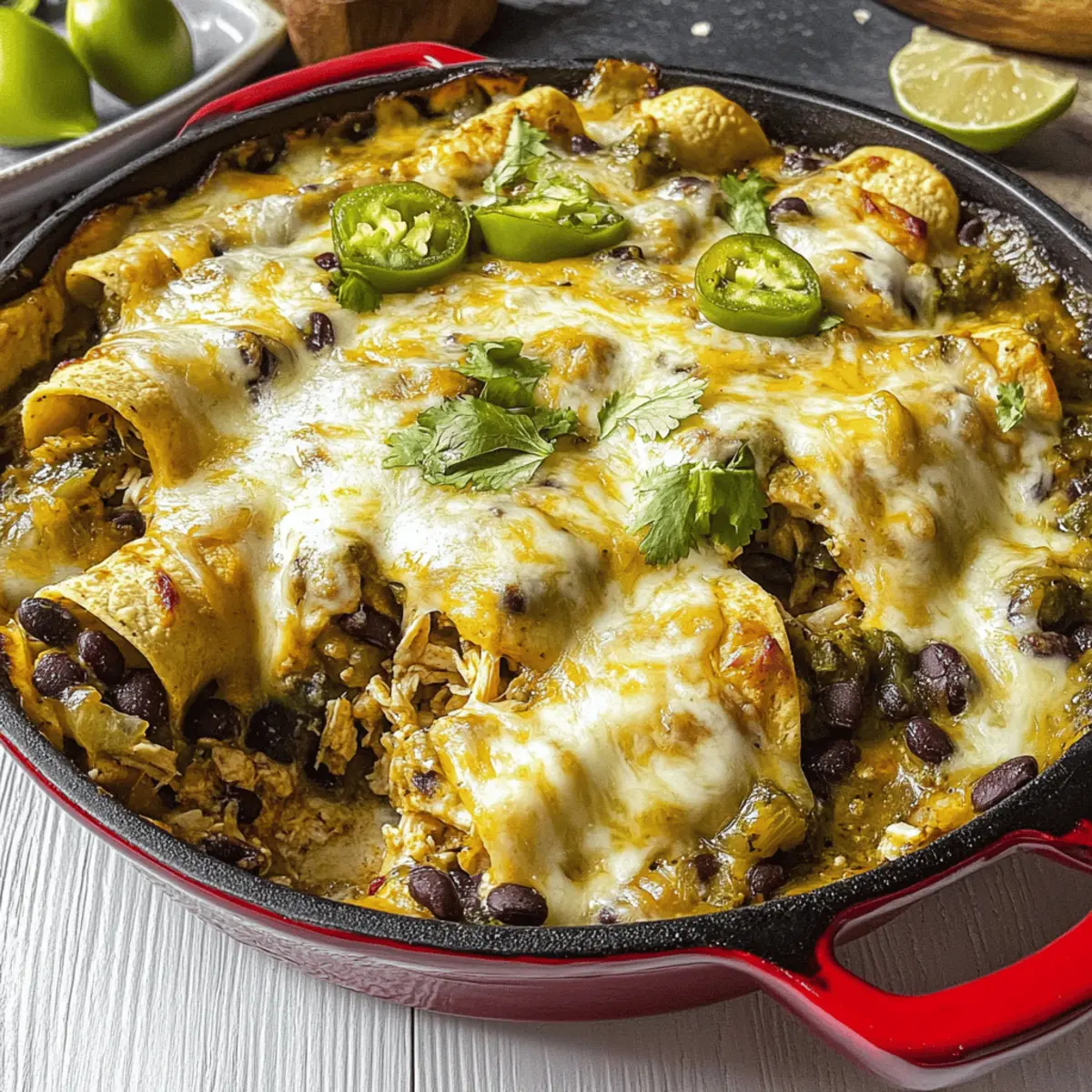 Enjoy a delicious Chicken Enchilada Casserole that combines seasoned chicken, black beans, and tomatillo salsa for a comforting family meal.
