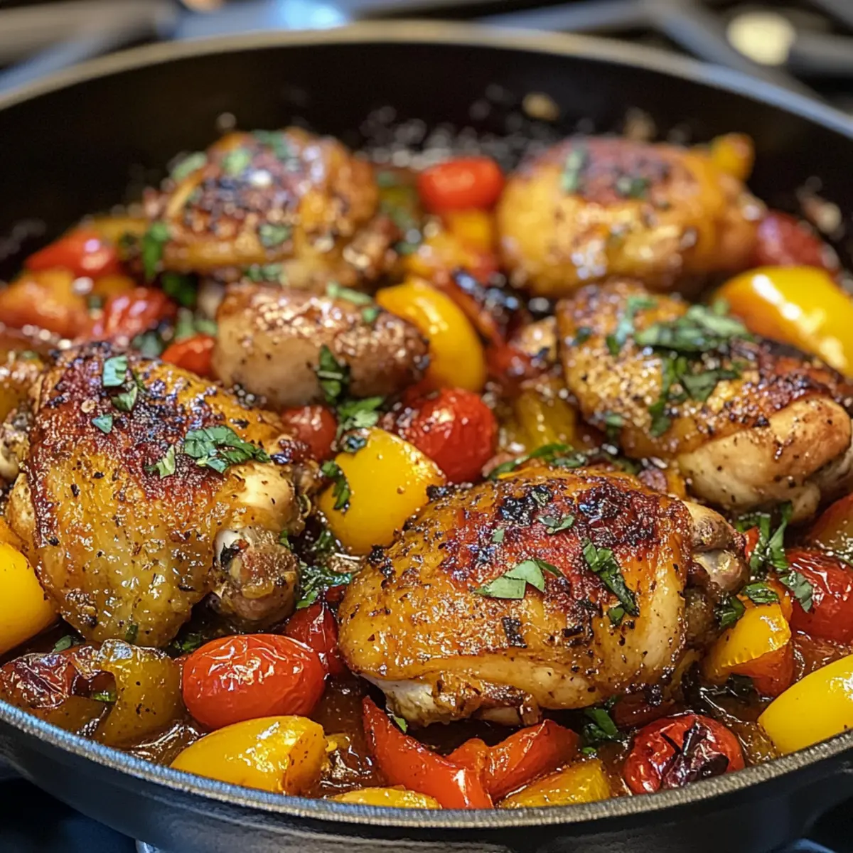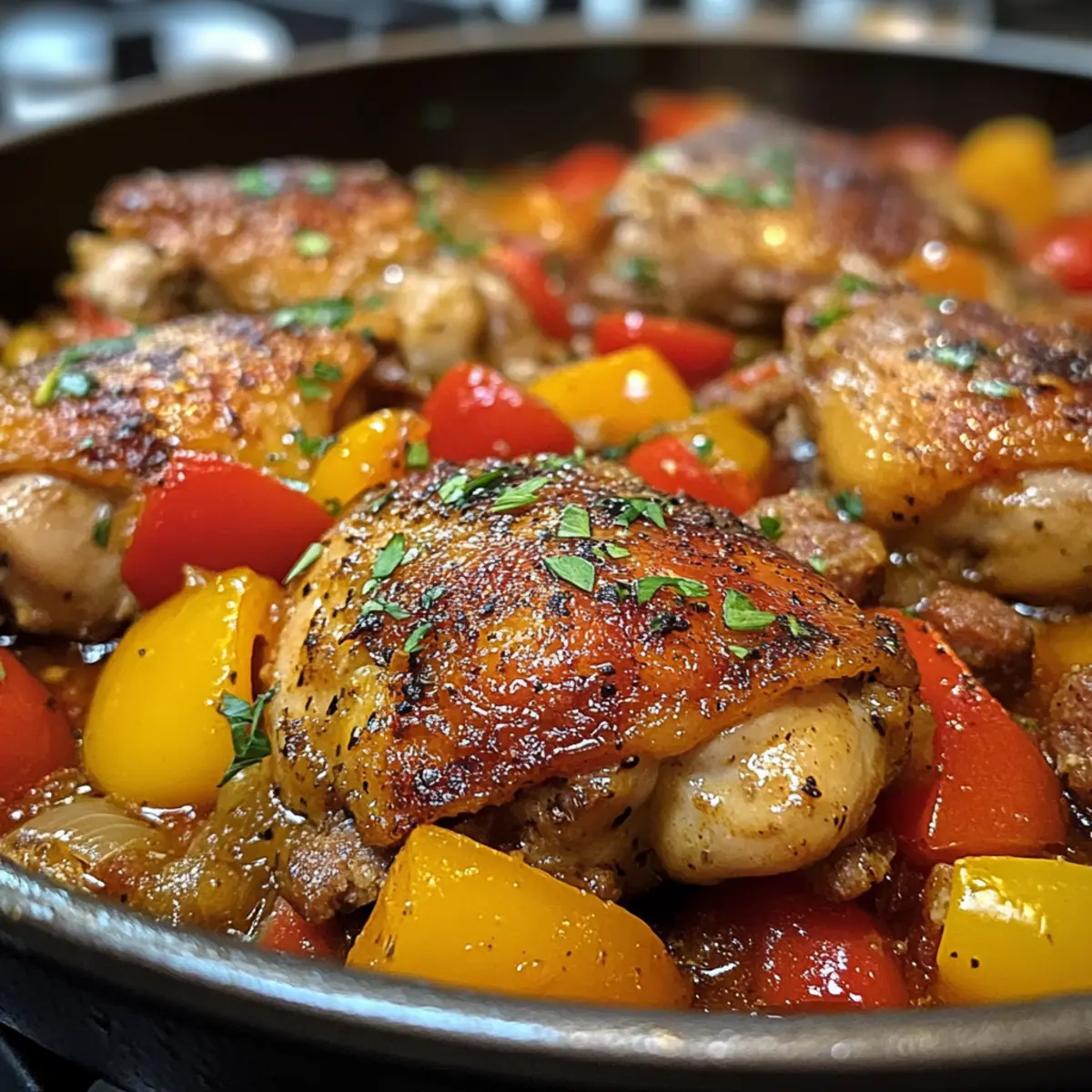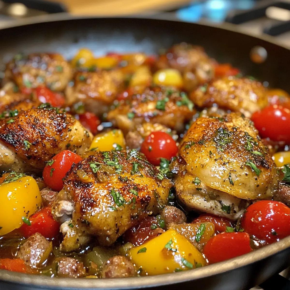 As I stood over the stove, the kitchen filled with the tempting aroma of sizzling garlic and savory sausage, I realized I was in for a treat. Chicken Scarpariello, a hearty Italian-American dish, has become my go-to one-pan meal for any occasion. It’s so straightforward and yet rich in flavor—perfect for home chefs who crave comfort food without the fuss. The crispy-skinned chicken thighs paired with zesty pickled peppers create a harmonious blend that warms the soul. Plus, it’s a wonderful way to impress guests, or simply to indulge yourself on a cozy night in. Are you ready to elevate your dinner game with this delightful recipe? Let’s dive right in! Why is Chicken Scarpariello a Must-Try? Simplicity at its finest: This one-pan meal is a breeze to prepare, making it perfect for busy weeknights or leisurely weekends. Flavor explosion: The combination of zesty pickled peppers and hearty Italian sausage elevates the dish, offering delightful layers of taste that you and your family will adore. Crowd-pleaser: Perfect for entertaining, this dish is sure to impress your guests with its rich aroma and beautiful presentation. Versatile options: Whether you prefer spicy or sweet peppers, you can easily customize the recipe to tickle your taste buds. For a lighter twist, consider swapping in chicken sausage as featured in our delicious Crockpot Chicken Tinga or opt for more variations. Comfort food at its best: With tender, juicy chicken nestled in a comforting sauce, this recipe invokes memories of family gatherings and cozy dinners, perfect for creating lasting connections. Chicken Scarpariello Ingredients • Essential components for a hearty dish. For the Chicken Olive Oil – Provides fat for sautéing and flavor; use extra virgin for a richer taste. Bone-in Skin-on Chicken Thighs – Offers rich flavor and crispy skin; boneless can be used but alters texture. For the Sausage Italian Sausage (hot or mild) – Adds depth of flavor and protein; swap for chicken sausage for a lighter version. For the Base Unsalted Butter – Enhances the richness of the sauce; can replace with olive oil for a dairy-free option. Yellow Onion – Acts as the aromatic foundation for the dish; shallots are a milder alternative. For the Vegetables Bell Pepper (orange or red) – Provides sweetness and color; green bell peppers work as a substitute if needed. Cherry Tomatoes – Adds a burst of sweetness; regular diced tomatoes can be used if you’re in a pinch. For the Sauce Tomato Paste – Intensifies the flavor and thickness of the sauce; no substitution needed. Garlic Cloves – Essential for rich, delicious depth of flavor; always opt for fresh over powdered. Dry White Wine – Enhances acidity and complexity; replace with chicken broth for a non-alcoholic option. Chicken Stock – Forms the braising liquid base; low-sodium is best to control saltiness. Sliced Pickled Cherry Peppers – Provide tang and spice; sweet pickled peppers can offer a milder kick. Cherry Pepper Juice – Integral for that characteristic taste; necessary for authentic Chicken Scarpariello. Fresh Oregano – Offers aromatic flavor to the dish; dried oregano can substitute but use less. For Garnish Lemon – Brings a bright finish; juice enhances flavor just before serving. Fresh Flat Leaf Parsley – For garnish and freshness; other herbs can be substituted if desired. Kosher Salt & Freshly Ground Black Pepper – Essential for seasoning throughout the cooking process. Step‑by‑Step Instructions for Chicken Scarpariello Step 1: Prep Chicken Begin by drying the bone-in chicken thighs thoroughly with paper towels, which helps achieve that coveted crispy skin. Season liberally with kosher salt and freshly ground black pepper on all sides. For optimal flavor, refrigerate the seasoned chicken uncovered for 4 to 8 hours, allowing the seasoning to penetrate and enhance its taste. Step 2: Preheat Oven While the chicken chills, preheat your oven to 350°F (175°C). This temperature ensures an even cooking process for the Chicken Scarpariello, allowing the flavors to meld beautifully as it braises. Prepare your braiser or heavy skillet on the stove for the next steps, ensuring it’s large enough to accommodate all ingredients. Step 3: Cut Sausage Slice the Italian sausage into oblong chunks, roughly 1 inch wide, to ensure they brown nicely during cooking. Set the sausage aside, ready to add depth and flavor to the chicken dish. This preparation will enhance the overall heartiness of your Chicken Scarpariello. Step 4: Sear Chicken In your preheated braiser or skillet, heat a generous amount of olive oil over medium-high heat. Once the oil is shimmering, add the chicken thighs skin-side down and sear for 7 to 8 minutes until the skin is a beautiful golden brown and crispy. Flip the chicken, cooking the other side for an additional 2 minutes before removing it from the skillet and setting it aside. Step 5: Brown Sausage Using the same skillet, add the sausage chunks, making sure not to overcrowd the pan. Brown the sausage on all sides for about 5 minutes, which develops rich, savory flavors. Once nicely browned, transfer the sausage to a bowl and set aside; this will become part of your luxurious Chicken Scarpariello sauce. Step 6: Sauté Veggies In the skillet, melt unsalted butter over medium heat, then add chopped yellow onion and your prepared bell peppers. Stir to coat the vegetables, cover, and let them cook for 5 minutes. This will soften the veggies. Remove the cover and continue cooking until the cherry tomatoes burst, releasing their juices into the mix, creating a vibrant base for your sauce. Step 7: Build Sauce Next, stir in minced garlic, followed by tomato paste and fresh oregano. After a minute, deglaze the pan with dry white wine and cherry pepper juice, scraping up any flavorful bits stuck to the bottom. Allow the mixture to simmer until slightly reduced, thickening into a rich, aromatic sauce that perfectly complements