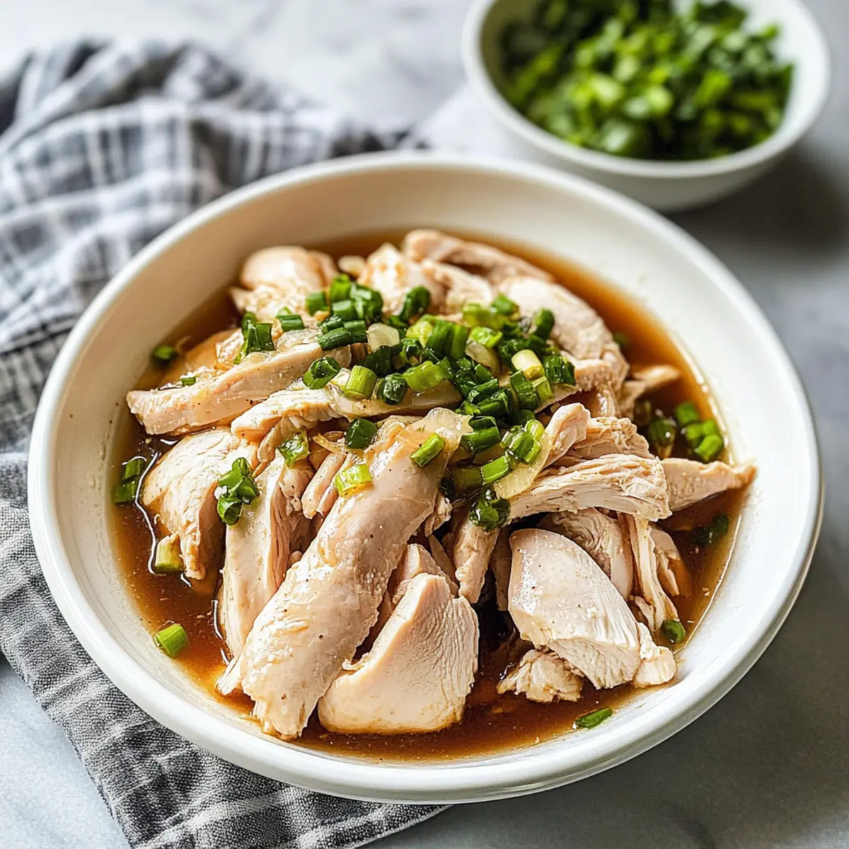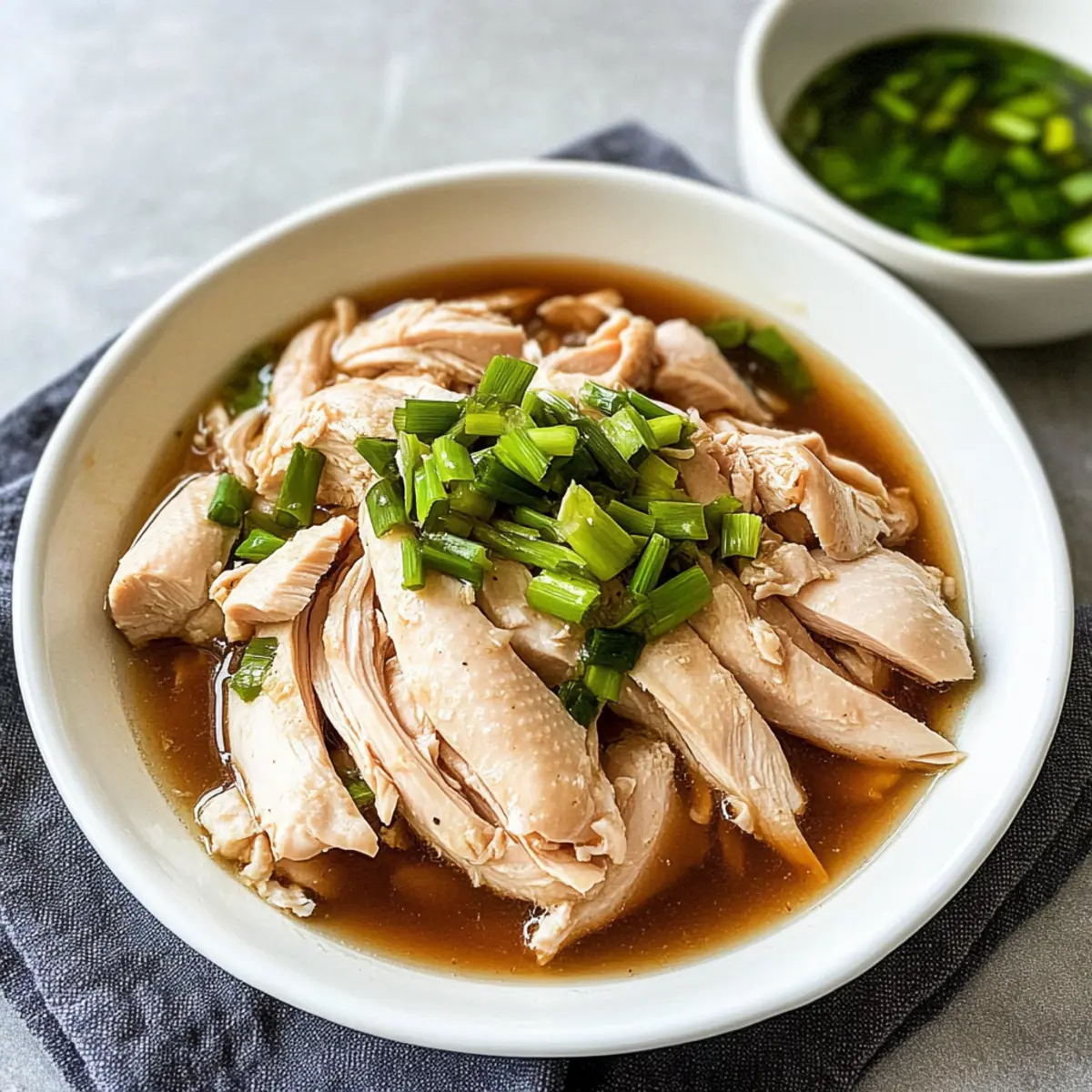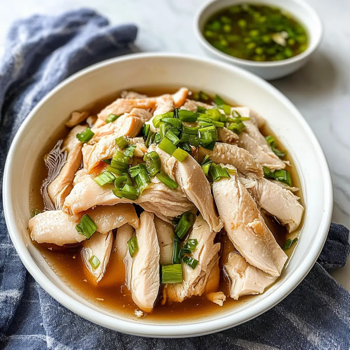 The moment I took my first bite of Chinese Ginger Scallion Chicken, I was transported to my childhood kitchen, where the comforting aromas of ginger and scallions were a staple. This simple yet delightful dish not only showcases tender, poached chicken, but it also celebrates low-sodium, healthy eating that doesn’t sacrifice flavor. In just a few easy steps, you can whisk your family away to the heart of Asian cuisine. Not only does this recipe pack a nutritious punch, but it’s also perfect for meal prep, ensuring you have something wholesome ready to enjoy on even the busiest nights. Ready to add a vibrant twist to your dinner routine? Let’s dive into this mouthwatering recipe! Why is this recipe a must-try? Simplicity: The straightforward process requires minimal ingredients and easy step-by-step instructions, making it perfect for both novice and experienced cooks. Flavor Explosion: The combination of fresh ginger and scallions envelops the chicken in a warm, aromatic embrace that transcends ordinary meals. Nutritionally Balanced: With its low-sodium profile, this dish fits seamlessly into a healthy diet without losing any taste, making it a guilt-free indulgence. Meal Prep Friendly: Got a busy week? This recipe is ideal for prepping ahead, so you can enjoy homemade goodness at your convenience. Cultural Authenticity: It captures the essence of traditional Asian cuisine, allowing you to serve a dish that’s both comforting and impressive to guests. Pair it with some steamed jasmine rice and sautéed veggies for a complete meal that will satisfy everyone at the table! Chinese Ginger Scallion Chicken Ingredients • Dive into the deliciousness of this dish with fresh ingredients! For the Chicken Chicken Drumsticks – The main protein source; thighs or breasts work well for a different texture. For the Flavor Base Ginger Slices – Infuses warmth and spice; fresh ginger brings out the best flavor. Scallions – Adds a mild onion taste; reserve the green tops for a beautiful garnish. For the Sauce Olive/Sesame Oil – Provides richness; sesame oil deepens the Asian flavor profile. Low Sodium Soy Sauce – Essential for umami; use tamari for a gluten-free alternative. Coconut Sugar/Regular Sugar – Just a hint of sweetness; maple syrup is a great substitute. Reserved Water – Incorporates chicken flavor into the sauce for a savory kick. This Chinese Ginger Scallion Chicken delivers fantastic taste while being easy on the palate and waistline! Step‑by‑Step Instructions for Chinese Ginger Scallion Chicken Step 1: Prepare the Cooking Liquid Fill a large pot with 6 cups of water and add the chicken drumsticks, ginger slices, and the white parts of the scallions. Bring the pot to a boil over medium-high heat, then reduce the heat and let it simmer gently for about 10 minutes. The chicken should be firmly cooked yet tender, infusing the water with flavorful aromas. Step 2: Cooling Process After boiling, turn off the heat and cover the pot, allowing the chicken to sit for 1 minute in the aromatic liquid. Carefully transfer the chicken drumsticks to an ice water bath, where they should cool completely for 20 minutes. This crucial step helps the chicken maintain its juicy texture while preparing for the next phase. Step 3: Make the Sauce While the chicken is cooling, grab a mixing bowl and combine the olive oil, low sodium soy sauce, coconut sugar, reserved cooking water, chopped ginger, and finely chopped scallions. Stir well until fully blended. This vibrant sauce will elevate your Chinese Ginger Scallion Chicken with a delightful balance of savory and sweet notes. Step 4: Serve Once the chicken has cooled and the sauce is ready, shred the tender chicken using two forks and arrange it beautifully on a serving plate. Generously pour the fragrant ginger-scallion sauce over the shredded chicken, ensuring every piece is coated. Enjoy this nourishing dish alone or paired with steamed jasmine rice and sautéed vegetables for a wholesome meal. How to Store and Freeze Chinese Ginger Scallion Chicken Fridge: Store leftovers in an airtight container for up to 3 days to keep the chicken moist. Freezer: To freeze, place shredded chicken in a freezer-safe container, adding sauce as needed. It stays fresh for up to 3 months. Reheating: Thaw frozen chicken overnight in the refrigerator. Reheat gently in a skillet over low heat or microwave, ensuring it’s heated through. Meal Prep Tip: Making a larger batch allows for easy meal prep, ensuring you have delicious Chinese Ginger Scallion Chicken ready for busy weeknights! Chinese Ginger Scallion Chicken Variations Feel free to play with this recipe and let your creativity shine! The flavors are so versatile, they’ll surprise you. Spicy Kick: Add sliced chili peppers to the poaching liquid for a delightful heat. It’s a great option if you love a bit of excitement in each bite. Herb Twist: Substitute fresh cilantro for scallions for a fresh, vibrant flavor profile. Cilantro adds a whole new depth, pairing beautifully with the chicken. Nutty Crunch: For a richer sauce, sprinkle sesame seeds or chopped peanuts over the finished dish. The added texture balances perfectly with tender chicken and a silky sauce. Savory Depth: Enhance the umami by adding a splash of mushroom soy sauce in place of regular soy sauce. This will deepen the flavor, making every bite a comforting experience. Fresh Zest: Grate some lime zest into the sauce for an unexpected brightness. The zingy citrus notes will elevate the dish, making it refreshingly delicious. Mock Chicken: Use firm tofu blocks for a plant-based version, soaking them in the cooking liquid for the same flavor infusion. Not only delicious, but also a fantastic option for meatless meals. Herbal Infusion: Incorporate fresh basil leaves into the poaching liquid for a fragrant herbal note. This small addition can transform the dish into an aromatic delight. Coconut Creaminess: Stir in a splash of coconut milk int