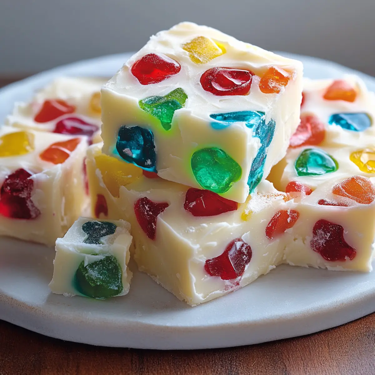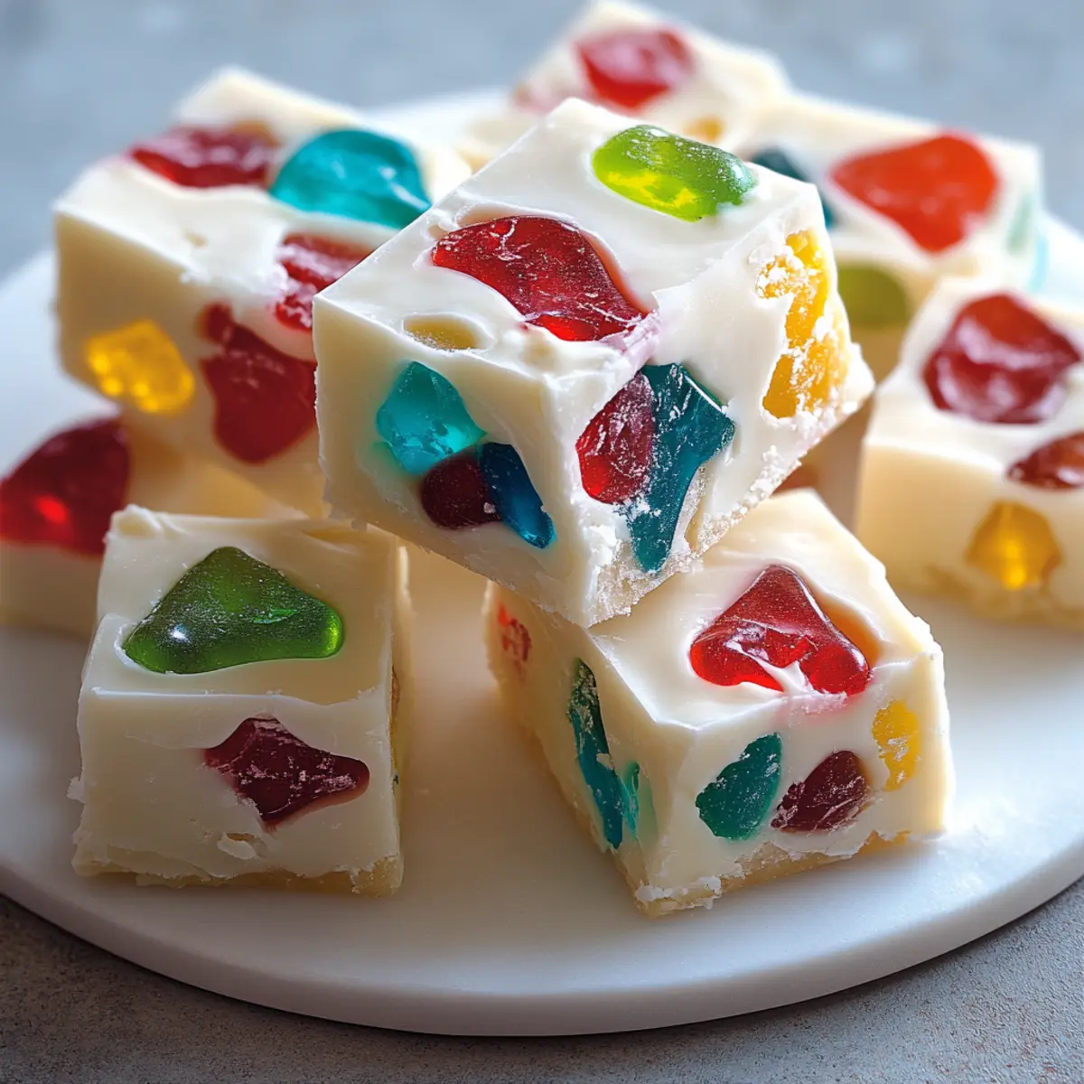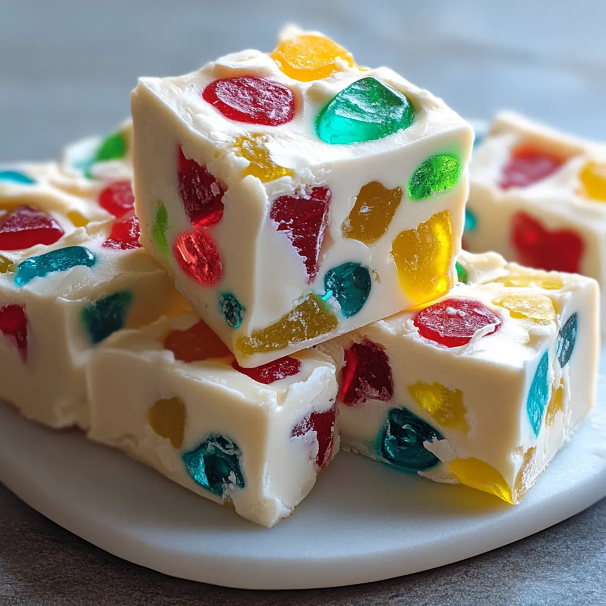 The moment I spotted a vibrant box of gumdrops in the holiday aisle, memories of family gatherings and festive treats flooded back. This Easy No-Bake Christmas Gumdrop Fudge captures that joyful spirit effortlessly, bringing together a dazzling white chocolate base and colorful candies that are as much a feast for the eyes as they are for the palate. Best of all, it takes just minutes to whip up, making it an ideal treat for busy holiday schedules. Whether you’re prepping for a cozy gathering, searching for homemade gifts, or simply craving something sweet, this dessert promises delightful surprises in every bite. Ready to dive into a world of festive flavors? Let’s get started! Why is This Fudge a Must-Try? Irresistible Flavor: The rich white chocolate combined with chewy gumdrops creates an explosion of flavor that is sure to delight your taste buds. Quick and Easy: No baking required! This recipe is designed for those busy holiday moments, allowing you to whip up a treat in no time. Customizable Options: Want to get creative? You can switch up the gumdrop flavors or even use different types of chocolate for a personalized twist! Perfect for Gifting: Packaged in pretty boxes or cellophane bags, this fudge makes an impressive homemade gift for friends and family. You can even check out my other delightful holiday dessert ideas for more inspiration! Crowd Pleaser: With its colorful appearance and smooth texture, this fudge will be the star of any holiday gathering. It’s a great way to reconnect with festive traditions while creating new memories. Christmas Gumdrop Fudge Ingredients For the Fudge Base • White Chocolate Chips – The creamy base of this fudge; opt for compound chocolate for a simple variation! • Sweetened Condensed Milk – Creates the ultimate fudge texture; evaporated milk is a no-go here. • Vanilla Extract – Adds a lovely depth of flavor that enhances the sweetness. • Salt – Just a pinch balances the sweetness perfectly! For the Gumdrop Mix • Gumdrops or Jelly Candies – Choose your favorite colorful varieties; avoid those that bleed color for a beautiful finish! By gathering these essential ingredients for this Christmas Gumdrop Fudge, you’re well on your way to creating a holiday treat that brings joy to every gathering! Step‑by‑Step Instructions for Christmas Gumdrop Fudge Step 1: Prepare the Pan Begin by lining an 8×8-inch square baking pan with parchment paper, ensuring it hangs over the edges for easy removal later. This will prevent the fudge from sticking and will make it easier to lift out once set. Set the pan aside while you start working on the fudge mixture. Step 2: Melt the Chocolate Base In a medium saucepan, combine white chocolate chips, sweetened condensed milk, and a pinch of salt over low heat. Stir continuously for about 5-7 minutes until the mixture is completely melted and smooth, avoiding any lumps. Keep an eye on the chocolate to prevent burning as it slowly transforms into a creamy fudge base. Step 3: Add Vanilla Extract Once the chocolate mixture is melted and smooth, remove it from the heat and let it cool slightly for about 3 minutes. Stir in the vanilla extract gently, allowing it to blend thoroughly into the rich white chocolate base. This step enhances the flavor of your Christmas Gumdrop Fudge and prepares it for the next ingredient. Step 4: Incorporate the Gumdrops Carefully fold in the chopped gumdrops into the slightly cooled mixture. Do this gently to avoid bleeding colors, ensuring that the bright, festive hues of the gumdrops remain intact. The vibrant candies add a delightful chewy texture and festive flair to your fudge. Step 5: Transfer to the Pan Pour the colorful fudge mixture into the prepared baking pan, using a spatula to spread it evenly. Smooth the top with the spatula to ensure an even layer throughout. This step is essential for achieving a beautiful presentation once it’s set. Step 6: Chill to Set Place the fudge in the refrigerator and chill for at least 2 hours or until it is fully set. The fudge should be firm to the touch and easy to slice once it has chilled. This crucial step allows all of the flavors to meld together while achieving that signature fudge texture. Step 7: Cut and Serve Once the fudge is set, use the parchment paper overhang to lift it out of the pan. Place it on a cutting board and cut it into squares or rectangles as desired. Your Christmas Gumdrop Fudge is now ready to be served, perfect for sharing with family and friends or packing as delightful homemade gifts. Expert Tips for Christmas Gumdrop Fudge • Keep It Dry: Make sure all utensils and chocolate are completely dry before melting; moisture can cause the chocolate to seize. • Cool Before Adding: Allow the fudge mixture to cool for a few minutes before folding in the gumdrops to prevent bleeding and maintain a beautiful appearance. • Check Consistency: If the fudge isn’t setting well, it may need more chilling time; ensure the chocolate-to-condensed milk ratio is correct for a perfect texture. • Play with Flavors: Feel free to swap out gumdrop flavors or use different types of chocolate to customize your Christmas Gumdrop Fudge to your liking! • Watch for Color Bleeding: Use gumdrops that don’t bleed color when mixed in; this helps maintain the festive look of your fudge. Christmas Gumdrop Fudge Variations Feel free to personalize this festive treat with these fun and tasty twists on the traditional recipe! Dark Chocolate: Swap white chocolate for dark chocolate chips to add a rich depth that pairs beautifully with the sweetness of the gumdrops. Nuts Galore: Add chopped walnuts or pecans for a delightful crunch and a nutty flavor that complements the creamy fudge. Flavor Infusions: Experiment with flavored extracts like peppermint or almond for an entirely new twist. Each flavor changes the character of the fudge beautifully! Seasonal Spices: Sprinkle in cinnamon or nutmeg for a warm, spiced twist