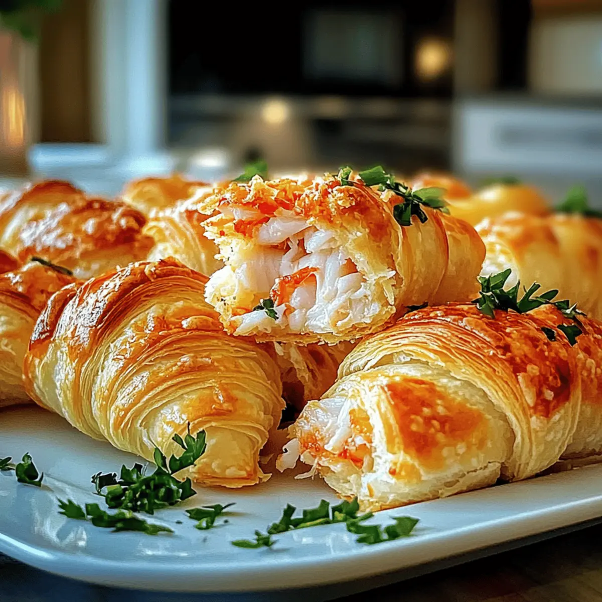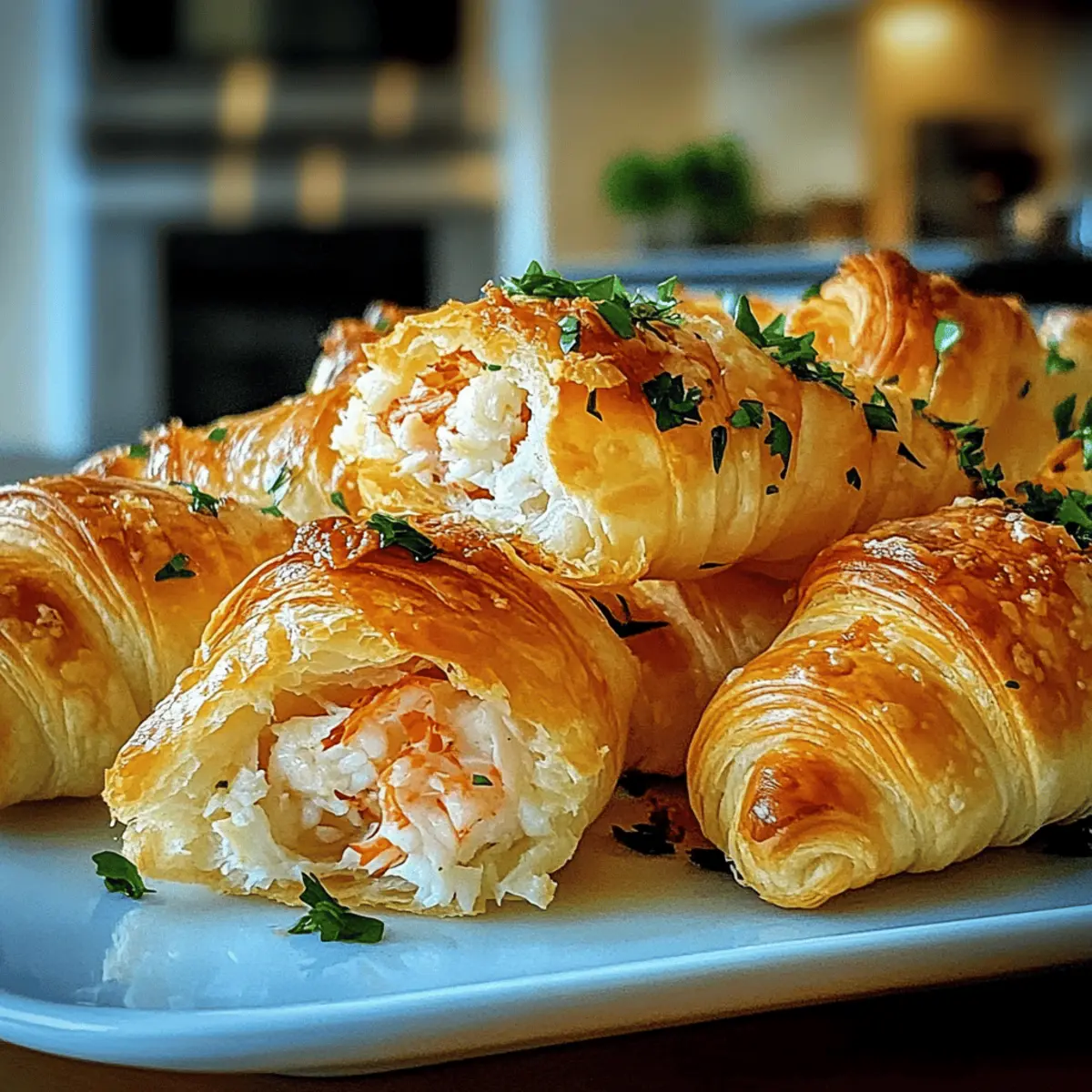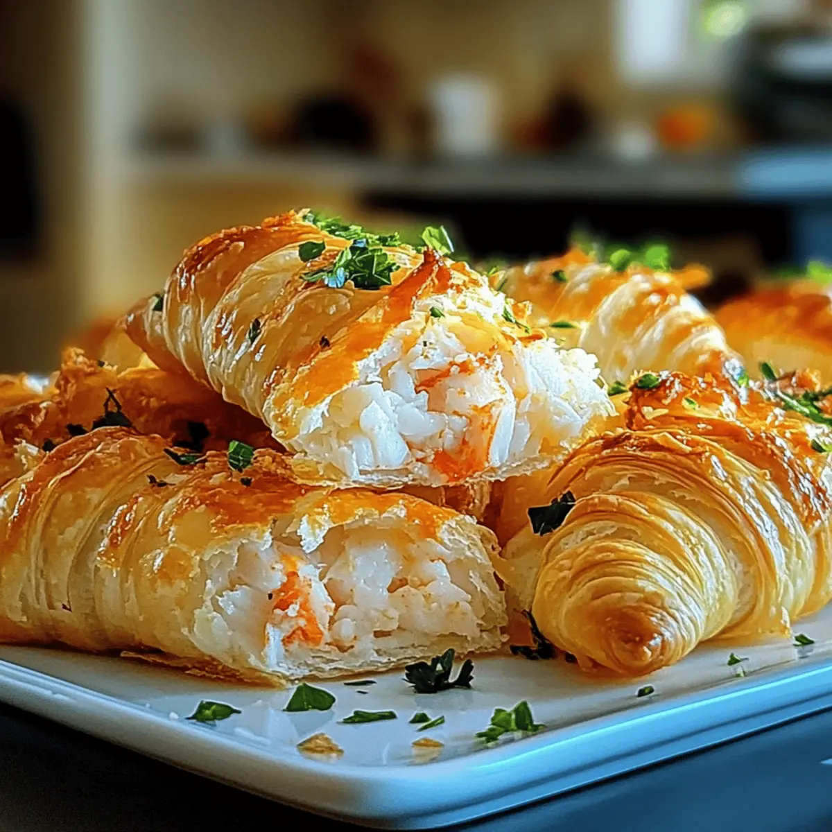 The aroma wafting from the oven filled my kitchen with anticipation, a true testament to what’s about to unfold. With just a few simple ingredients, I created these delightful Crab Crescent Bites, a perfect appetizer that’s as easy to prepare as it is to devour. Imagine a warm, flaky crescent roll enveloping a creamy crab mixture that elevates any gathering to gourmet status. Not only are these bites quick to whip up, but they also make for a crowd-pleasing snack that will leave your guests raving long after the last bite. Whether you’re hosting a party or enjoying a cozy evening at home, you’re just moments away from an irresistible treat that promises to impress. Are you ready to dive into a culinary adventure that combines convenience with unforgettable flavor? Why Crave Crab Crescent Bites? Flaky Delight: The warm, golden exterior of these bites pairs beautifully with a rich, creamy filling that melts in your mouth. Effortless Preparation: With just a handful of ingredients, you can create a stunning appetizer that impresses without the fuss. Party Favorite: Serve them at gatherings, and watch how quickly they disappear—everyone loves a bite-sized treat that packs a punch! Customizable: Feel free to experiment with different seafood or herbs, making these bites your own. Try pairing them with a zesty sauce or enjoy them as stand-alone gems. Versatile Option: Whether it’s a holiday party or a casual evening, these Crab Crescent Bites are perfect for any occasion, ensuring every event is memorable. Crab Crescent Bites Ingredients • Simple ingredients for an irresistible snack! For the Dough Crescent Roll Dough – The flaky outer layer that gives these bites their wonderful texture; it’s readily available in stores. For the Filling Crab Meat – The star of this dish, providing rich flavor and texture; fresh lump crab is ideal, but canned crab works too. Cream Cheese – Offers creaminess that perfectly binds the filling; Greek yogurt can be used as a lighter substitute. Green Onions – Adds a mild crunch and onion flavor; feel free to swap in chopped chives or shallots for a twist. Old Bay Seasoning – Essential for enhancing the crab flavor with its unique spice blend, making your Crab Crescent Bites truly authentic. Step‑by‑Step Instructions for Crab Crescent Bites Step 1: Preheat the Oven Begin by preheating your oven to 375°F (190°C). This ensures that your Crab Crescent Bites bake evenly and achieve that desirable golden color. While the oven warms up, take a moment to gather all your ingredients, allowing you to work efficiently as you prepare this delectable appetizer. Step 2: Prepare the Filling In a mixing bowl, combine softened cream cheese, crab meat, chopped green onions, and Old Bay seasoning. Use a spatula or fork to mix them thoroughly until you achieve a creamy and well-blended filling. Set this mixture aside, making sure it’s ready for the crescent dough that will soon envelop it. Step 3: Form the Dough Unroll the crescent roll dough onto a clean, flat surface. Carefully separate it into triangles, following the package instructions. This dough will serve as a lovely flaky exterior for your Crab Crescent Bites, so handle it gently to maintain its texture while setting it up for filling. Step 4: Fill and Shape Take a generous spoonful of your crab filling and place it at the wider end of each crescent triangle. Gently fold the corners towards the center, creating small pockets that contain the filling while ensuring the dough edges overlap slightly. This creates an appealing shape that will hold up during baking. Step 5: Bake Position the filled crescent pockets on a parchment-lined baking sheet, leaving space between each bite for even baking. Slide the sheet into your preheated oven and bake for 15-20 minutes. Watch for the crescents to transform into a beautiful golden brown, signaling that they are perfectly cooked and ready to be devoured. Step 6: Serve Once baked, remove the Crab Crescent Bites from the oven and let them cool for a minute or two. Carefully transfer them to a platter and serve warm. This is when their delightful aroma and flaky texture will shine, making them an irresistible treat for you and your guests to enjoy right away. Crab Crescent Bites Variations & Substitutions Get creative with your Crab Crescent Bites and explore these delightful twists to customize their flavors and textures! Dairy-Free: Replace cream cheese with vegan cream cheese or cashew cream for a plant-based alternative that’s just as creamy. The result is a delightfully rich filling that everyone can enjoy. Seafood Medley: Swap out crab for shrimp, lobster, or a mix of your favorite seafood for a unique take. Each variation brings a different dimension to the bites, making them even more special for your guests. Herb-Infused: Add fresh herbs like dill, parsley, or basil to the filling for an extra burst of flavor. This infusion can elevate your Crab Crescent Bites into a gourmet appetizer experience. Spicy Kick: Mix in a dash of cayenne pepper or finely chopped jalapeños to the filling for a spicy twist. This addition will surprise and delight those who love a bit of heat in their snacks. Cheesy Variation: Mix in shredded cheddar or mozzarella cheese with the filling for a gooey, cheesy bite of heaven. It complements the crab wonderfully and adds an extra layer of savory goodness. Gluten-Free: Use gluten-free crescent roll dough to make these bites accessible to everyone. They’ll still be flaky and delicious, ensuring everyone can partake in the festivities. Zesty Sauce Pairing: Serve with a homemade remoulade or zesty cocktail sauce to enhance the overall flavor experience. Dipping sauces can transform every bite into a new adventure. Mini Biscuit Bites: For a fun twist, replace crescent dough with biscuit dough for a different texture and flavor. These mini biscuit crab bites are equally scrumptious and perfect for sharing! Feel free to dive in