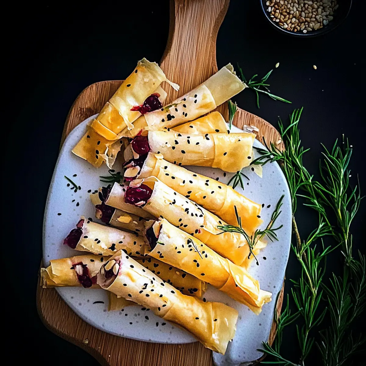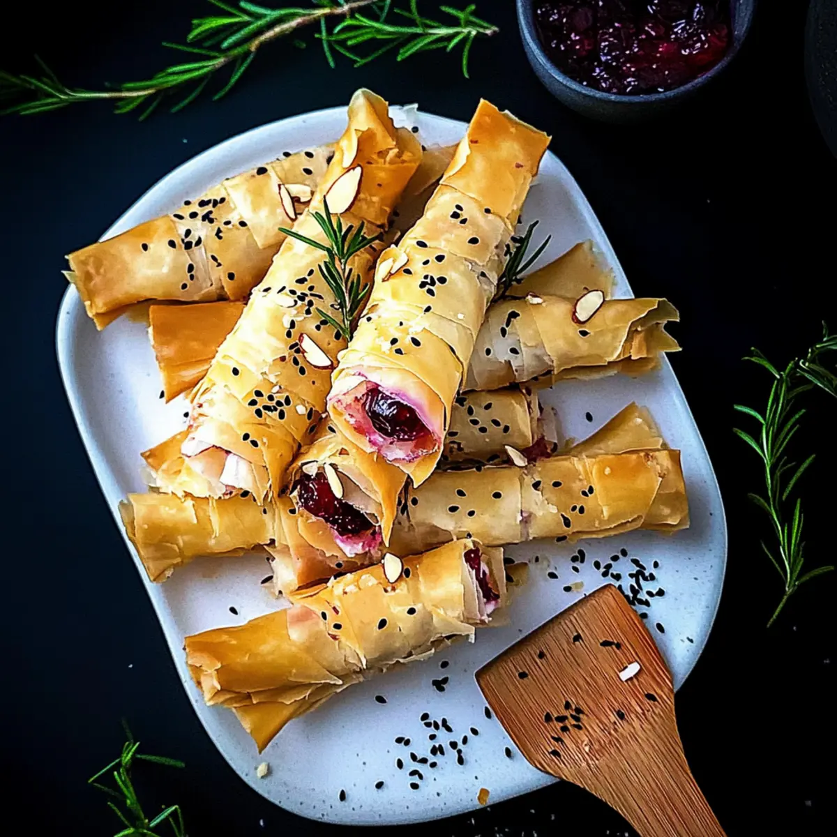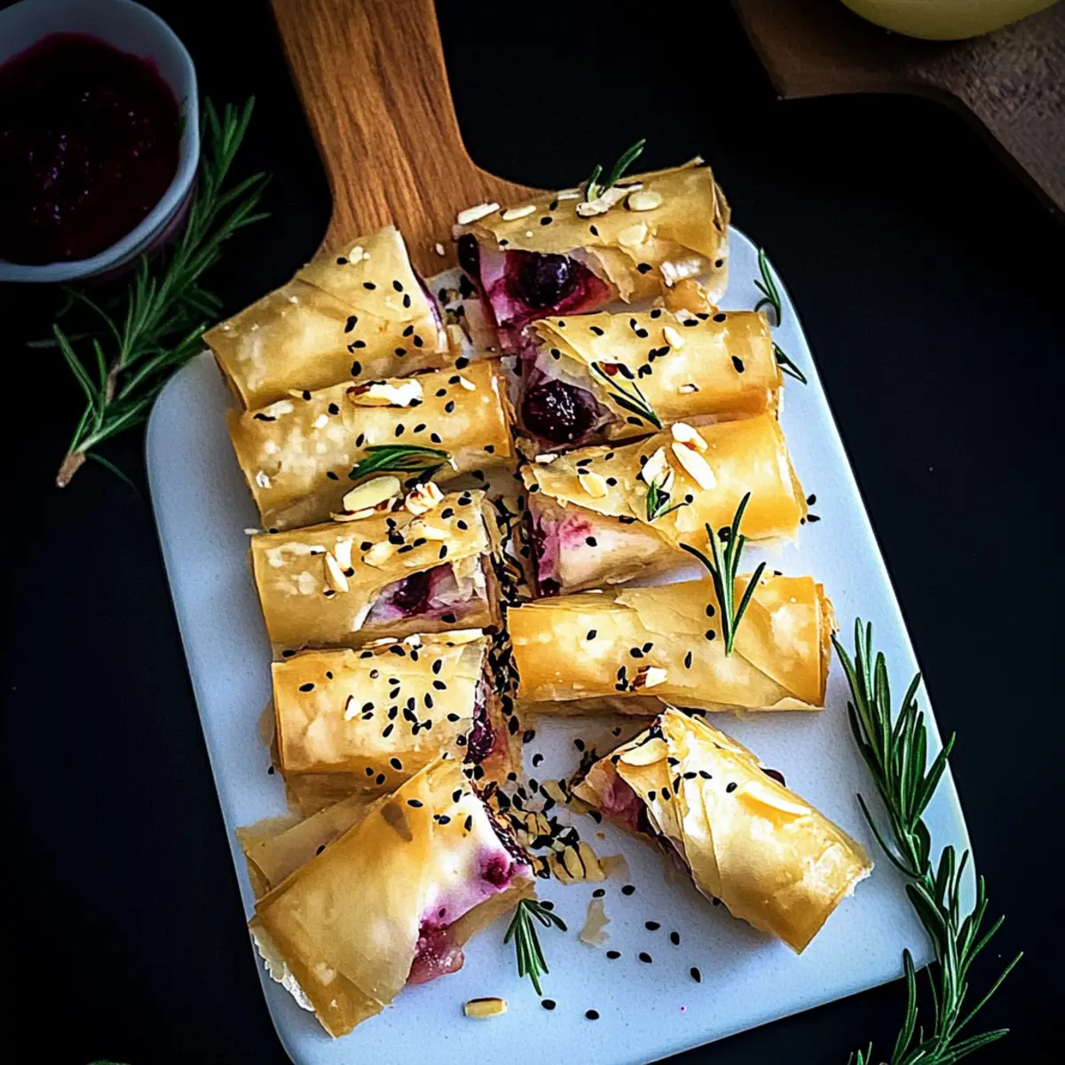 As I pulled my baking sheet from the oven, the aroma wafting through my kitchen instantly transported me to cozy holiday gatherings, filled with laughter and warmth. This is the essence of my Cranberry and Brie Filo Crackers, a delightful holiday appetizer that promises to impress your guests while keeping your prep time manageable. These elegant, flaky bites combine the tangy sweetness of cranberries with the creamy richness of brie, and with just a few simple ingredients, you’ll create a crowd-pleaser that stands out at any festive table. Plus, they’re not only easy to put together but also perfect for making ahead of time. So, are you ready to bring a touch of elegance to your next gathering? Why are these Filo Crackers a Must-Try? Easy Preparation: With just a handful of ingredients and straightforward steps, you can whip up these delicious bites in no time. Festive Appeal: The vibrant colors and textures make these crackers not just tasty, but visually stunning—perfect for impressing guests! Versatile Snack: Pair them with your favorite dips or enjoy them solo; they fit seamlessly into any holiday spread. Crispy Perfection: The delicate filo pastry turns gloriously golden in the oven, ensuring a delightful crunch that will keep everyone coming back for more. If you’re eager for more festive recipes, check out my Havarti Avocado Sandwich for a fresh twist or try the Mexican Beef Rice for a hearty main dish! Cranberry and Brie Filo Crackers Ingredients For the Crackers • Filo Pastry – The star of our dish, it creates a delightful flaky texture; handle it gently to avoid tearing. • Butter – Brings a rich flavor and helps achieve that golden-brown crispiness; melted is best for easy brushing. • Brie – This creamy cheese adds a luxurious richness; be sure to slice it thinly for easy wrapping. • Cranberry Sauce – Offers a perfect balance of sweetness and tartness; both store-bought and homemade varieties work brilliantly. • Almond Flakes – Adds a lovely crunch and nutty flavor; feel free to swap for walnuts or pecans if preferred. For the Garnish • Black Sesame Seeds – These elevate your crackers visually and add a touch of unique flavor; sprinkle them before baking. • Fresh Rosemary Leaves or Chives – Optional, but they lend a lovely aroma and make for beautiful presentation when tied around the crackers. These Cranberry and Brie Filo Crackers are not just simple to prepare; they also bring a burst of festive flavors that will delight your guests this holiday season! Step‑by‑Step Instructions for Cranberry and Brie Filo Crackers Step 1: Preheat and Prepare Baking Trays Begin by preheating your oven to 180°C (350°F). While it warms up, line two baking trays with parchment paper to prevent sticking. This will ensure your Cranberry and Brie Filo Crackers bake evenly and release easily once they’re golden brown and ready to serve. Step 2: Cut and Cover Filo Pastry Carefully cut thawed filo sheets into 36 squares, each about 10×10 cm in size. Handle the delicate pastry gently to avoid tearing. Cover the remaining sheets with a damp towel, keeping them moist until you are ready to use them, as this prevents them from drying out and cracking during assembly. Step 3: Brush with Butter Take one square of the filo pastry and thoughtfully brush it with melted butter, ensuring even coverage for that rich flavor. The buttery layer gives the crackers their beautiful golden hue when baked. Place the square on a clean surface, ready for filling with the delicious ingredients. Step 4: Add Brie and Cranberry Sauce At one end of the buttered filo square, lay a generous slice of brie, followed by a teaspoon of vibrant cranberry sauce. The complementary flavors of creamy brie and tart cranberry will create a delightful bite. Don’t forget to sprinkle a few almond flakes on top for an added crunch. Step 5: Roll and Pinch Ends Gently roll the filo pastry from the side where you’ve placed the filling, creating a tight cylinder. Pinch the ends securely to prevent any filling from leaking out during baking. This step is crucial for maintaining the shape of your delectable Cranberry and Brie Filo Crackers. Step 6: Repeat and Arrange Continue assembling the remaining squares until all your filling is used, placing them neatly on the prepared baking trays. Ensure that the crackers are spaced apart, allowing room for them to expand slightly during baking. This will help each one crisp up beautifully and avoid sticking together. Step 7: Brush and Garnish With the crackers arranged, brush the tops with any remaining melted butter. Sprinkle black sesame seeds over them for a touch of visual appeal and flavor depth. This final flourish brings an artistic flair to your Cranberry and Brie Filo Crackers and enhances their festive look. Step 8: Bake to Perfection Place the trays in the preheated oven and bake for 15-20 minutes. Keep a close eye on them as they turn golden brown; this is the perfect sign that they’re ready to be taken out. The enticing aroma filling your kitchen will have everyone eagerly awaiting these delicious bites. Step 9: Optional Garnish for Presentation For a lovely finishing touch, consider garnishing your baked crackers with fresh rosemary leaves or tying them with chives. This elegant presentation not only elevates their look but also enhances the aromatic experience of your delightful Cranberry and Brie Filo Crackers. Step 10: Serve and Savor Once baked, allow the crackers to cool slightly before serving. The ideal time to enjoy these flaky, rich appetizers is fresh from the oven when they’re still warm. Watch as your guests delight in these flavorful treats at your holiday gathering! How to Store and Freeze Cranberry and Brie Filo Crackers Fridge: Store any leftover Cranberry and Brie Filo Crackers in an airtight container in the fridge for up to 3 days. Reheat in the oven for a few minutes to regain crispness. Freezer: Prepare the crackers and 