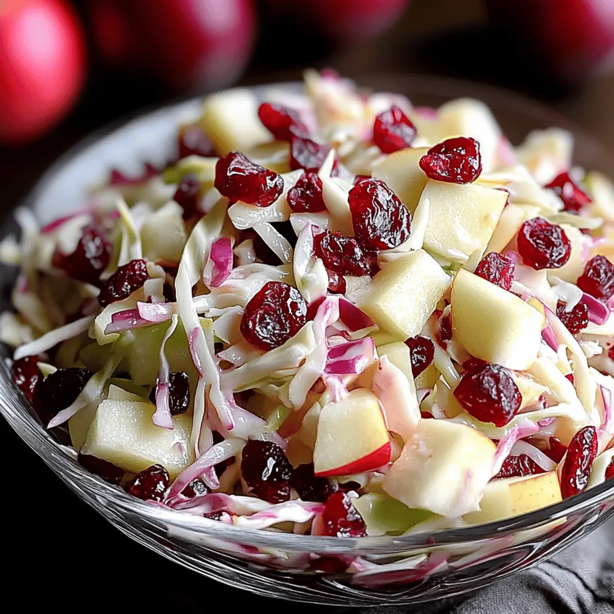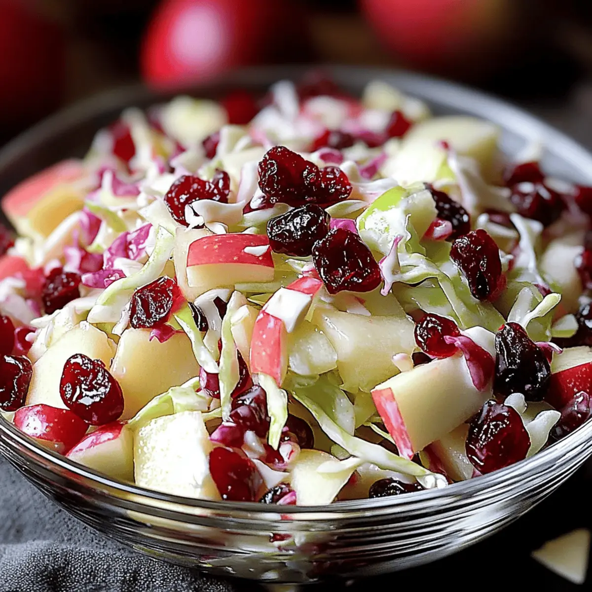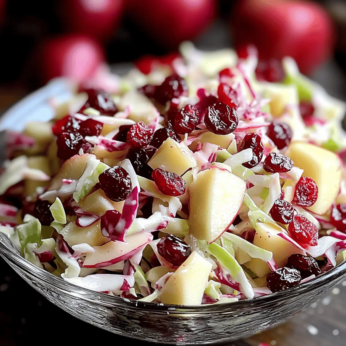 Walking through the vibrant aisles of my local farmer’s market, I couldn’t resist the allure of crisp apples and bright cranberries, both beckoning to be transformed into something delightful. This inspired me to craft my Cranberry Apple Coleslaw, a colorful and healthy side dish that’s wonderfully versatile. Not only is it quick to prepare, but it also adds a refreshing twist to your table, making it an instant favorite for summer gatherings and cozy winter meals alike. With a creamy dressing that strikes the perfect balance between tangy and sweet, this coleslaw redefines the traditional notion, turning a simple salad into a crowd-pleaser. Are you ready to elevate your side dish game? Let’s dive into the deliciousness together! Why Is Cranberry Apple Coleslaw Special? Vibrant flavors: The combination of tart cranberries and sweet apples brings a burst of freshness that ignites your palate. Customization options: With a variety of add-ins like nuts, herbs, and alternative dressings, this coleslaw can easily be tailored to suit any taste or dietary preference—whether you’re looking for a vegan option or a gluten-free side dish. Perfect for gatherings: Its colorful presentation and delightful crunch make it a major crowd-pleaser at parties; pair it with grilled chicken or as a topping for your favorite sandwiches. Make-ahead friendly: Prepare it a day in advance and let the flavors meld together for an effortless dish that’s ready when you are. Healthy indulgence: Packed with nutrients, this coleslaw offers a guilt-free way to enjoy a delicious side. Just like my delightful Tropical Pineapple Rum Punch, this dish is all about elevating simple ingredients into something extraordinary! Cranberry Apple Coleslaw Ingredients For the Coleslaw • Green Cabbage – Provides the base’s crunch and structure. Finely shred for best texture. • Apples (Honeycrisp or Fuji) – Adds sweetness and natural flavor. Substitute with Granny Smith for tartness. • Dried Cranberries – Contribute tart sweetness and chewy texture. Use fresh cranberries for a tart bite or omit for a less sweet variant. • Chopped Walnuts or Pecans (optional) – Adds crunchy texture and nutty flavor. Substitute with sunflower seeds for a nut-free option. • Chopped Fresh Parsley – Introduces freshness and color. Experiment with fresh dill or mint for a different herbaceous flavor. For the Dressing • Mayonnaise – Forms the creamy base of the dressing. Replace with Greek yogurt for a lighter version. • Apple Cider Vinegar – Provides tanginess that balances the sweetness. White wine vinegar can be a substitute. • Honey or Maple Syrup – Adds sweetness to the dressing. Adjust quantity based on desired sweetness. • Dijon Mustard – Offers a savory depth to the dressing. Use yellow mustard as a simpler alternative. • Celery Seeds – Contributes a unique flavor and crunch. Ground celery can substitute in a pinch. • Salt & Pepper – Enhances overall flavor. Adjust to taste. Crisp, colorful, and an absolute crowd-pleaser, this Cranberry Apple Coleslaw is the perfect addition to your next meal! Step‑by‑Step Instructions for Cranberry Apple Coleslaw Step 1: Prepare the Cabbage Begin by finely shredding the green cabbage to a thickness of about 1/8 inch to ensure a delightful crunch. Place the shredded cabbage in a large mixing bowl, allowing it to take center stage in your Cranberry Apple Coleslaw. Use a sharp knife or a mandoline for uniformity and ease. Step 2: Dice the Apples Core and dice the apples into small, bite-sized pieces, approximately 1/2 inch cubes. Opt for Honeycrisp or Fuji apples for optimal sweetness and flavor, then add them to the bowl with the cabbage. The vibrant apple pieces will add a burst of color and a sweet contrast to the tangy dressing. Step 3: Incorporate Dried Cranberries and Nuts Mix in the dried cranberries into the cabbage and apple mixture, ensuring they are evenly distributed. If you’re adding nuts such as chopped walnuts or pecans, coarsely chop them first before incorporating for an extra crunch. This step brings texture and enhances the overall experience of your Cranberry Apple Coleslaw. Step 4: Add Fresh Parsley Finely chop fresh parsley and sprinkle it into the mixture, adding a pop of color and fresh herbal notes. Stir gently to combine all the ingredients, making sure the parsley is evenly distributed throughout. This quick addition elevates the freshness of your coleslaw. Step 5: Whisk the Dressing In a separate bowl, whisk together the mayonnaise, apple cider vinegar, honey (or maple syrup), and Dijon mustard until smooth and creamy. Aim for a smooth consistency that will coat all the ingredients snugly. This dressing is where the magic happens, bringing all the flavors together beautifully. Step 6: Season the Dressing Add the celery seeds, along with a sprinkle of salt and pepper, to the dressing. Mix well to combine, ensuring every bite of the Cranberry Apple Coleslaw will have the perfect savory note. Give it a taste and adjust the seasoning if needed for that perfect balance. Step 7: Combine Dressing and Salad Pour the prepared dressing over the coleslaw mixture, then gently toss everything together until all ingredients are well coated. This step is crucial, as the dressing binds all the flavors and textures together, creating a harmonious and delicious side dish. Step 8: Chill the Coleslaw Cover the bowl with plastic wrap or a lid and refrigerate for at least 30 minutes, although 1 hour is preferred. Chilling allows the flavors to meld beautifully and enhances the overall taste of your Cranberry Apple Coleslaw, resulting in a refreshing dish that is perfect for serving. Step 9: Final Adjustments Before serving your coleslaw, taste the mixture and adjust any seasonings if needed. This final step ensures that every bite is bursting with flavor. Toss the coleslaw gently one last time to ensure all ingredients are evenly mixed. Step 10: Serve 