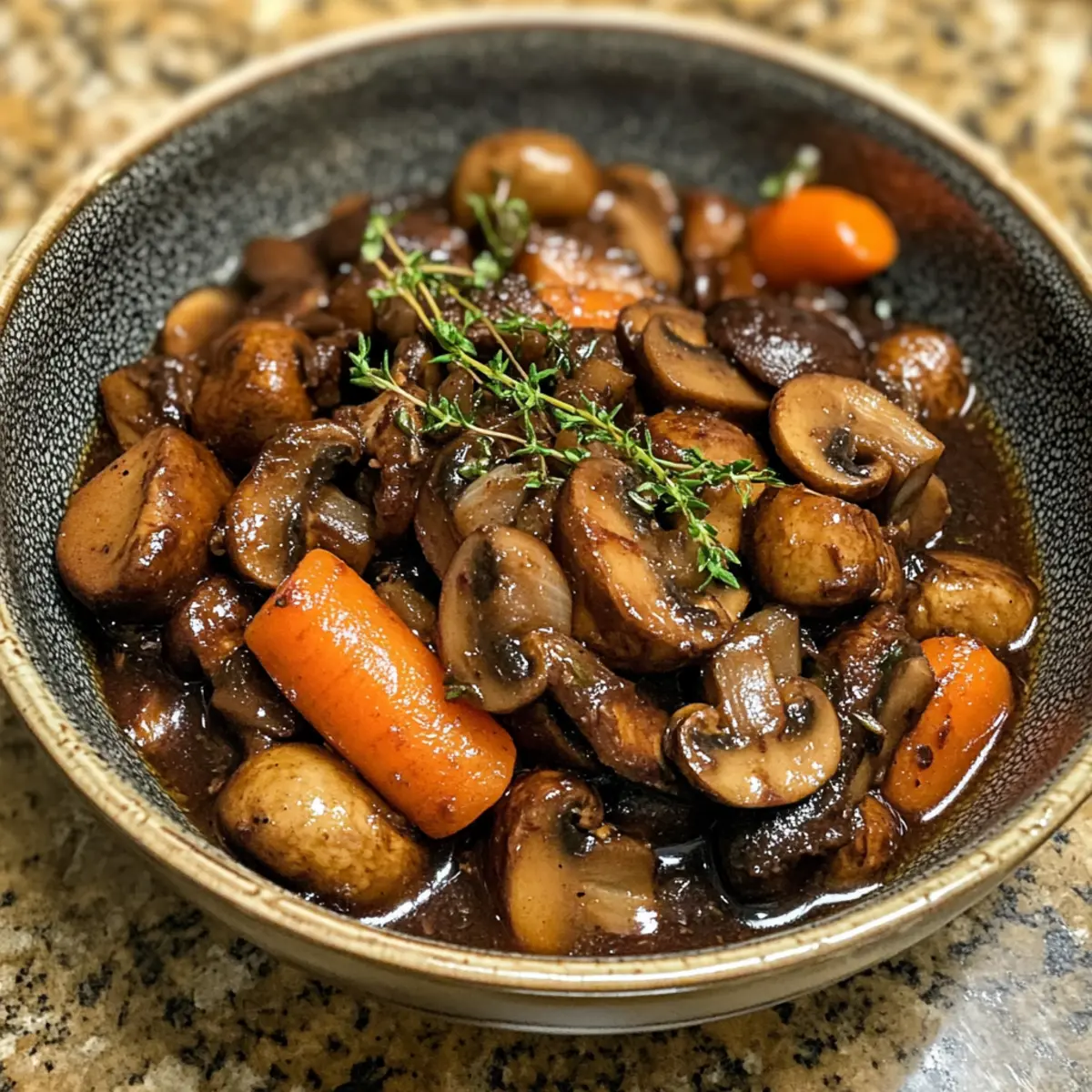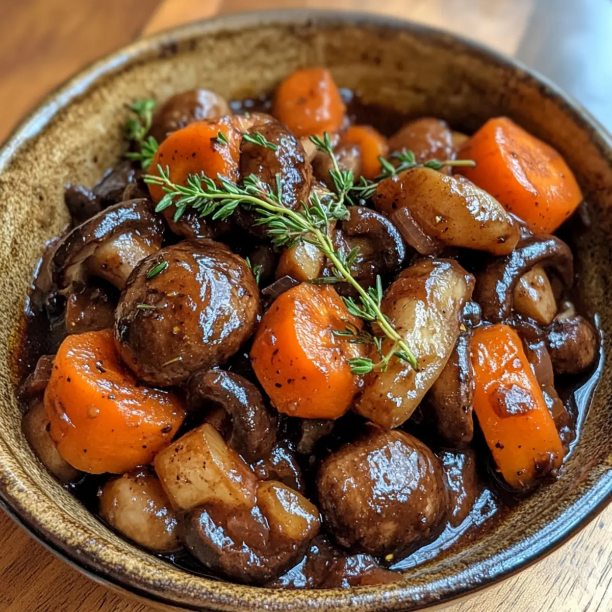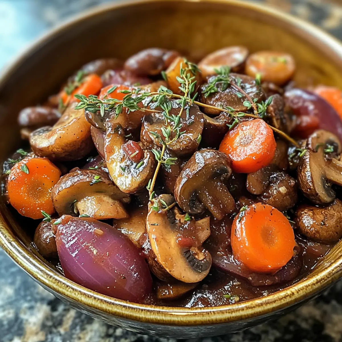 There’s something magical about the aroma of a savory stew wafting through the kitchen, isn’t there? This Easy Vegan Mushroom Bourguignon transforms humble mushrooms and vegetables into a hearty dish that’s both comforting and low in calories, delightfully clocking in at just 184 calories per serving. As I simmer mushrooms, baby carrots, and tender onions in a rich red wine sauce, I’m reminded of cozy dinners and the joy of impressing friends and family with a delightful plant-based meal. Not only is it a fantastic crowd-pleaser, but it’s also surprisingly simple to prepare, making it perfect for a weeknight feast or special gathering. Curious about how this timeless dish can make its way to your table? Let’s dive in! Why Is This Mushroom Bourguignon Special? Comforting, Hearty Taste: This Easy Mushroom Bourguignon delivers a rich flavor profile, perfect for anyone craving a warm, satisfying meal. Low-Calorie Delight: At just 184 calories per serving, it’s a guilt-free comfort food that won’t derail your healthy eating goals. Effortlessly Vegan: Made entirely from plant-based ingredients, this recipe ensures you savor every bite without compromising your dietary choices. Versatile Serving Options: Pair it with creamy mashed potatoes, crusty bread, or even toss in some peas for a colorful twist. Quick & Simple Prep: With minimal prep time and straightforward instructions, it’s ideal for both busy weeknights and elegant dinner parties. Get ready to impress your guests with this delightful dish, just like you would with Mushroom Spinach Stuffed or Sticky Beef Noodles! Easy Mushroom Bourguignon Ingredients For the Stew • Mushrooms (850g or ~ 1 3/4 lb) – A mix of chestnut and baby portobello mushrooms brings essential umami flavor to this Easy Mushroom Bourguignon. • Baby Onions – These sweet jewels deepen the stew’s flavor; feel free to swap in regular onions if needed. • Baby Carrots – Their natural sweetness adds texture; you can chop regular carrots into chunks as a substitute. • Garlic (4 cloves, minced) – This aromatic ingredient enhances the richness of the dish. • Red Wine (185 ml or ~ 3/4 cup) – This is crucial for the bourguignon sauce; Burgundy or any dry red wine works beautifully. • Tomato Puree/Paste (2 tbsp) – It adds depth and acidity; you may also use crushed tomatoes as an alternate. • Fresh Thyme (small bunch) – A fragrant touch that elevates the dish; dried thyme can easily replace it if fresh isn’t on hand. • Bay Leaves (2) – They impart a wonderful depth of flavor; reduce to one for a milder essence. • Vegetable Stock (250 ml or ~ 1 cup) – Enhances liquid content and overall taste; homemade or store-bought is perfectly fine. • Black Pepper – Simply season to taste for an extra flavor boost. For Sautéing • Oil – Essential for cooking the vegetables; olive or vegetable oil both work well. These wonderful ingredients mix together beautifully to create a dish that not only satisfies your cravings but stays true to a vegan lifestyle. Enjoy every warm spoonful of this luscious Easy Mushroom Bourguignon! Step‑by‑Step Instructions for Easy Mushroom Bourguignon Step 1: Preheat the Oven Begin by preheating your oven to 190°C (Gas Mark 5 / 375°F). This ensures that your Easy Mushroom Bourguignon will bake evenly and help the flavors meld beautifully. While the oven warms up, gather your ingredients and prepare the vegetables for the next steps. Step 2: Prepare the Vegetables Peel the baby onions and top and tail the baby carrots, keeping the onions whole for that delightful sweetness. If you’re using regular carrots, chop them into chunks. This preparation allows the flavors to fully develop and ensures the vegetables maintain their texture during cooking. Step 3: Sauté the Vegetables In a large, sturdy pan, heat a couple of tablespoons of oil over medium heat. Once shimmering, add the prepared mushrooms, baby carrots, and whole onions. Sauté for about 5–10 minutes, stirring occasionally, until the mushrooms soften and begin to release their juices, creating a fragrant base for your bourguignon. Step 4: Add Garlic Stir in the minced garlic and continue to sauté for an additional 2 minutes. This step infuses the dish with aromatic goodness, enhancing the overall flavor of your Easy Mushroom Bourguignon. You’ll know it’s time to move on when the garlic becomes fragrant and slightly golden. Step 5: Pour in the Red Wine Next, pour in 185 ml (about 3/4 cup) of red wine and bring the mixture to a gentle simmer. Allow it to cook for a few minutes, stirring well to deglaze the pan and pick up all those delicious browned bits, ensuring your bourguignon has a rich, deep flavor. Step 6: Incorporate the Remaining Ingredients Stir in the tomato puree, fresh thyme, bay leaves, and vegetable stock, then season generously with freshly ground black pepper. This combination creates a hearty sauce that beautifully coats your mushrooms and vegetables, setting the stage for the slow-baking process ahead. Step 7: Bake and Finish Cooking Transfer the mixture to an oven-safe casserole dish if your pan isn’t suitable for the oven. Cover it tightly and place it in the preheated oven. Bake for about 40 minutes or until the vegetables are cooked through to your liking, taking care to check for doneness halfway through. Step 8: Serve and Enjoy Once baked, your Easy Mushroom Bourguignon should be thick, hearty, and bursting with flavor. Remove it from the oven, let it cool slightly, and then serve it piping hot. Pair it with creamy mashed potatoes, crusty bread, or a refreshing salad for a complete and satisfying meal. Make Ahead Options Preparing the Easy Mushroom Bourguignon in advance is a fantastic way to save time during busy weeknights! You can chop and refrigerate the vegetables—baby onions, carrots, and mushrooms—up to 24 hours ahead of time, which not only streamline your cooking process but also enhances flavor a