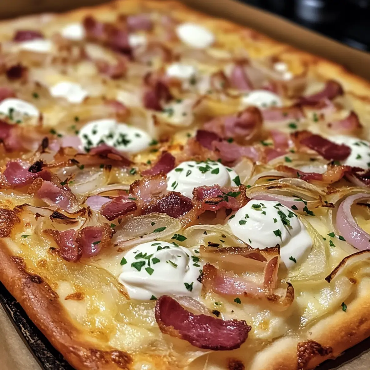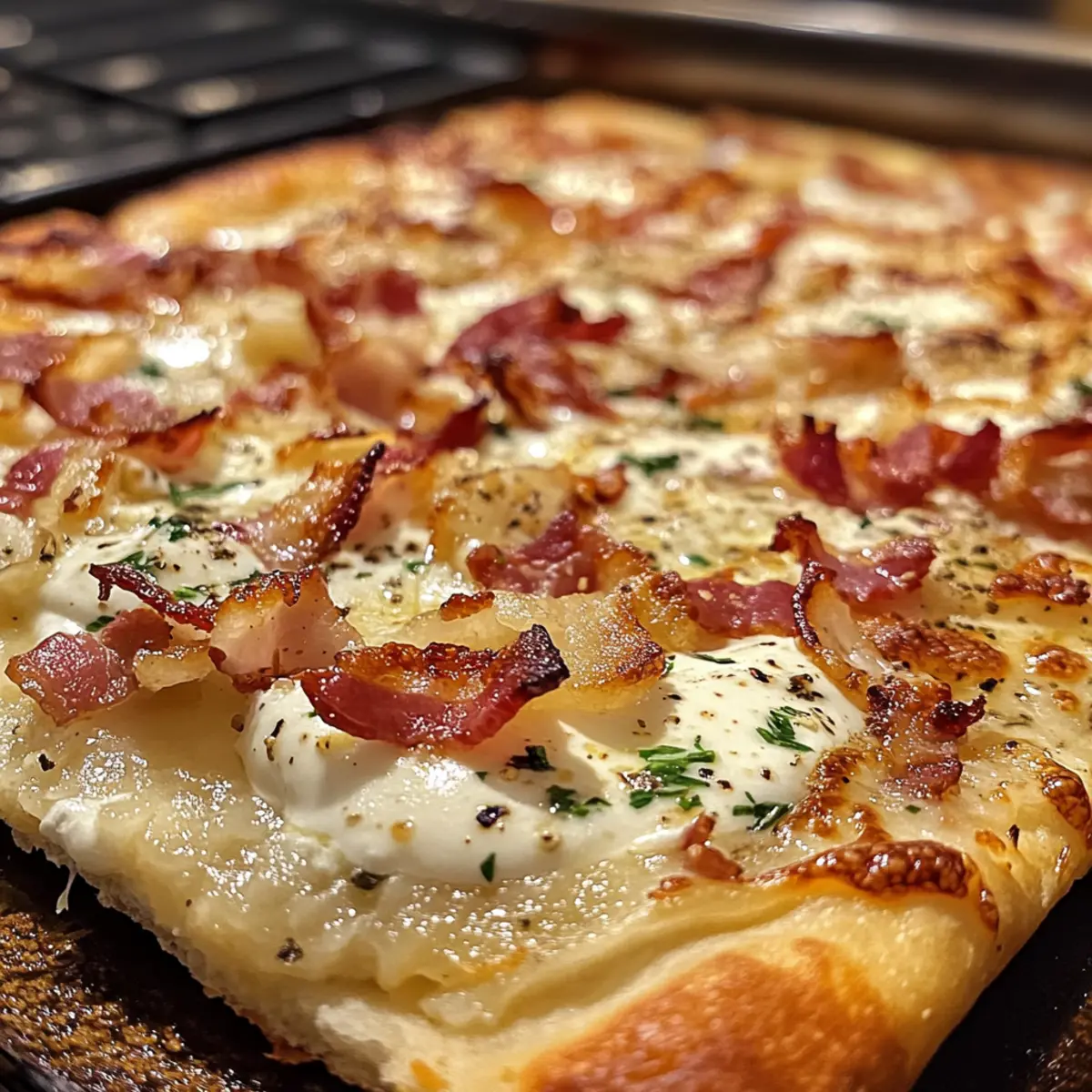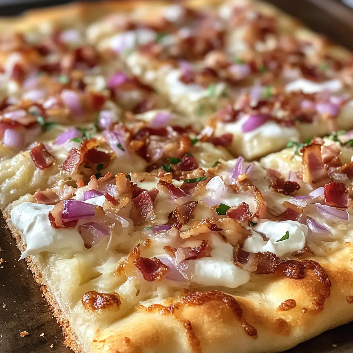 There’s something magical about the aroma of fresh dough baking in the oven, isn’t there? As soon as that first hint of warmth fills the kitchen, I’m transported to the Alsatian countryside, savoring my homemade Flammkuchen—the German pizza that’s as delightful to eat as it is to make. This easy Flammkuchen recipe features a crispy flatbread base topped with savory sour cream, smoky bacon, and sweet onions, making it a perfect quick meal or a crowd-pleasing appetizer. In just 30 minutes, you can impress family and friends with this decadent dish, all while enjoying its versatile nature that easily accommodates vegetarian or smoked salmon variations. So, are you ready to awaken your inner chef and discover how to bring a taste of Alsace to your table? Why is Flammkuchen a Must-Try? Simplicity: This dish comes together quickly, with just a few easy steps that even beginner cooks can master effortlessly. Irresistible Flavor: The combination of savory bacon and sweet onions atop a creamy base creates a taste explosion that will leave your taste buds dancing. Versatile Options: Whether you prefer the classic version, a vegetarian delight, or the indulgent smoked salmon twist, there’s a Flammkuchen for everyone at your table. Crisp Perfection: Achieve a crispy flatbread base that contrasts beautifully with the rich, creamy toppings—it’s a blend of textures you won’t forget! Crowd-Pleaser: Impress family and friends at gatherings; this easy recipe is sure to become a favorite, just like Garlic Butter Beef pasta or Butterfinger Balls. Quick Cooking: Ready in just 30 minutes, this Flammkuchen is the perfect solution to busy weeknights or impromptu get-togethers. Flammkuchen Ingredients Ingredient Groups: For the Dough Olive Oil – Adds moisture and richness to the dough; can be substituted with any cooking oil if needed. Water – Hydrates the flour, helping form the dough’s structure; both cold and room temperature work well. Salt – Enhances flavor and strengthens gluten; kosher or sea salt are excellent choices. Flour – Provides the base structure; feel free to use whole wheat for a nuttier taste. For the Toppings Onions – Introduces sweetness and texture; shallots make a great milder alternative. Bacon – Brings a savory, salty kick; substitute with diced smoked tofu for a delightful vegetarian option. Creme Fraiche – Adds creaminess to the topping; can be swapped for sour cream or a Greek yogurt-sour cream mix. Sour Cream – Brings necessary tanginess; mix with Greek yogurt if preferred. Chives (optional) – Offers a fresh herbaceous note; green onions are a great substitute or omit altogether. For Variations Spinach, Cherry Tomatoes, Feta (Vegetarian Variation) – Replace bacon with these vegetables for a vibrant, lighter dish. Smoked Salmon (Smoked Salmon Variation) – Substitute for bacon for a delicious twist that complements the creamy base. With these Flammkuchen ingredients, you’re all set to create a delightful German pizza for easy dinners! Step‑by‑Step Instructions for Flammkuchen Recipe Step 1: Preheat the Oven Begin by preheating your oven to its highest setting, ideally around 250°C (428°F). This high temperature is essential for achieving that signature crispy texture typical of a delicious Flammkuchen. Keep an eye on the oven as it heats, so you’re ready to go as soon as it reaches the desired temp. Step 2: Prepare the Dough In a large mixing bowl, combine the water, olive oil, flour, and salt until a rough dough forms. Knead the dough on a lightly floured surface for about 5 minutes until it’s smooth and elastic. Once done, roll the dough out into a thin layer, approximately 3 mm thick, to create a perfect base for your Flammkuchen. Step 3: Prepare the Onions While your dough rests, slice the onions thinly to maximize their sweetness. In a small bowl, steam the slices by covering them with water and microwaving for about 1 minute. This technique helps soften the onions and enhances their sweetness without burning, making them an ideal topping for your Flammkuchen. Step 4: Make the Cream Topping In another bowl, mix together the creme fraiche and sour cream to create a rich, creamy topping. Season this mixture with salt and pepper to taste, ensuring that the flavors balance beautifully. This creamy blend will serve as the flavorful base layer on your Flammkuchen, elevating every bite. Step 5: Assemble the Flammkuchen Take the rolled dough and transfer it onto a baking sheet lined with parchment paper. Carefully spread the cream mixture over the surface, leaving a small edge around the perimeter. Evenly distribute the steamed onions and bacon (or your preferred vegetarian alternative) on top, ensuring every bite is packed with flavor. Step 6: Bake the Flammkuchen Place the assembled Flammkuchen in your preheated oven and bake for 10-15 minutes. Watch closely for the edges to turn golden brown and the dough to become crispy. The high heat ensures that you achieve that delightful contrast between the creamy topping and the crispy base. Step 7: Serve and Garnish Once baked to perfection, remove the Flammkuchen from the oven and let it cool for a minute. If desired, sprinkle some chopped chives on top for an extra burst of flavor and color. Cut into slices and serve warm for a delightful experience that captures the essence of this traditional Alsatian dish. Flammkuchen Recipe Variations Feel free to let your creativity shine by customizing this delicious Flammkuchen recipe to suit your taste preferences! Veggie Delight: Swap the bacon for a mix of vibrant spinach, cherry tomatoes, and crumbled feta for a fresh twist. This combination adds color and a burst of flavors that everyone will love! Smoked Salmon Switch: Replace bacon with thinly sliced smoked salmon for a sophisticated version that complements the creamy topping beautifully. It’s a lovely way to elevate the classic while keeping the essence of Flammkuchen! Herb-Infused: Add 