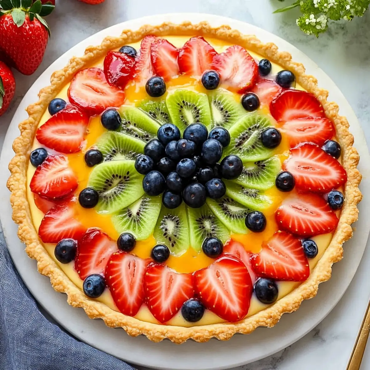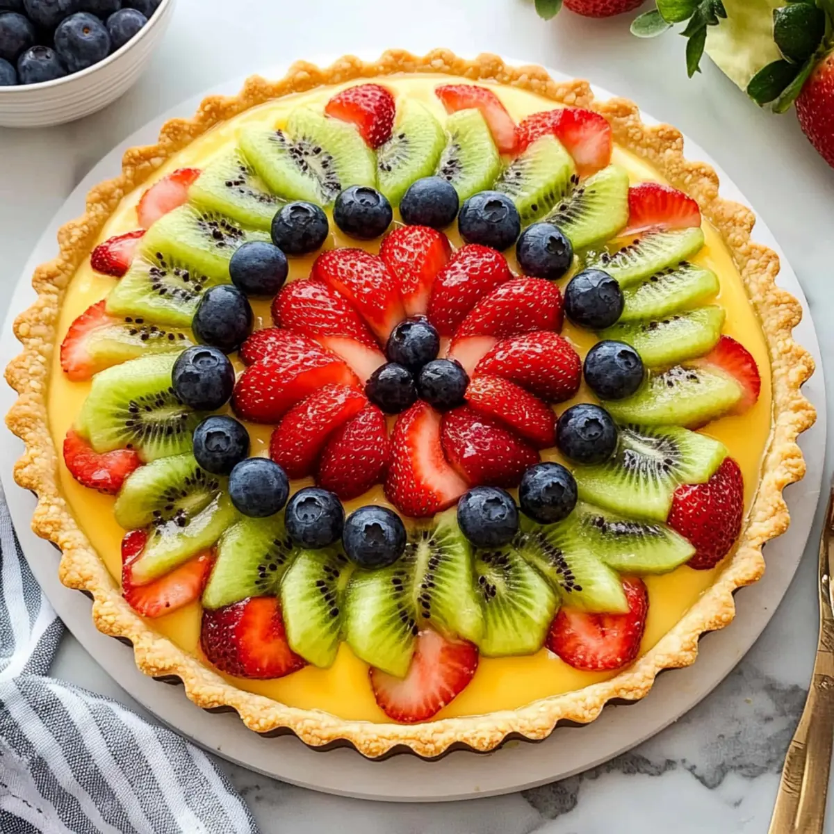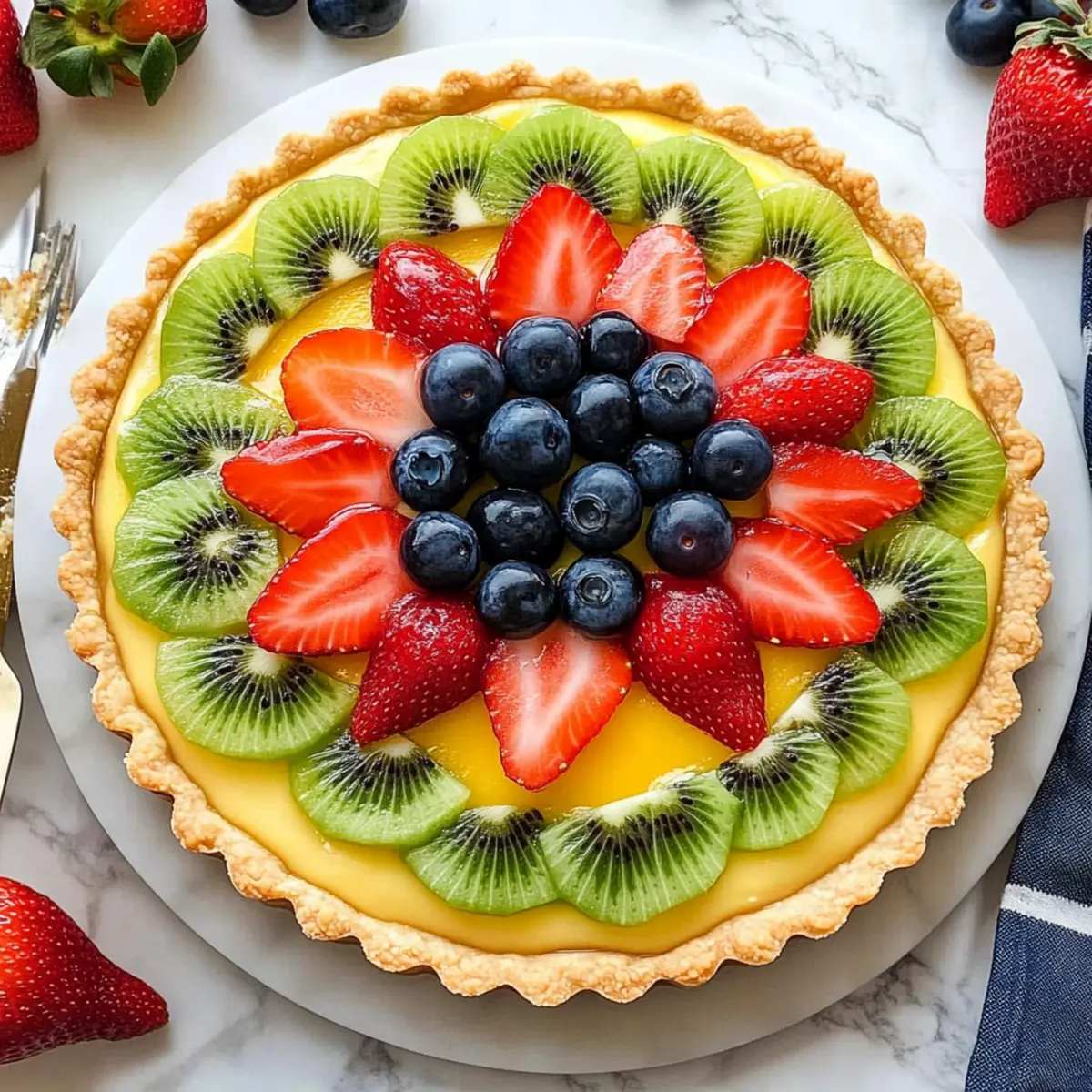 As the aroma of buttery pastry wafted through my kitchen, I felt a rush of excitement—this Classic French Fresh Fruit Tart recipe was about to transform my humble ingredients into a stunning dessert masterpiece. With a crisp crust cradling a lush vanilla custard and topped with vibrant seasonal fruits, this tart is the ultimate showstopper for gatherings and special occasions. Not only is it visually enchanting, but it also offers the blissful satisfaction of homemade indulgence without the fuss. Best of all? You can whip it up with surprisingly minimal effort. Are you ready to impress your friends and family with this delightful, colorful creation? Why Is This Tart So Irresistible? Simplicity: This Fresh Fruit Tart Recipe is refreshingly easy to make, perfect for both novice and experienced bakers alike. Indulgent Flavor: The combination of a buttery crust and silky vanilla custard delivers a luxurious taste that feels like a treat yet is simple to achieve. Seasonal Delight: Feel free to swap out the fruits based on what’s in season, ensuring freshness and flavor every time you whip it up. Crowd-Pleasing Dessert: With its stunning appearance, it’s sure to be the star of any gathering—impress your friends and family with this elegant dessert! If you’re in the mood for more light and refreshing recipes, consider trying my Fruit Salad Refreshing or Avocado Salad Refreshing. Fresh Fruit Tart Ingredients • Here’s everything you need to create your delicious Fresh Fruit Tart Recipe. For the Pastry Cream: Whole Milk – Provides creaminess; substitute with half-and-half for a richer custard. Heavy Cream – Adds richness; can be substituted with whole milk. Sugar – Sweetens the pastry cream; use brown sugar for a deeper flavor. Cornstarch – Thickens the custard; no direct substitutes, but arrowroot can be experimented with. Cold Butter – Adds silkiness; substitute with vegan butter for a dairy-free version. Egg Yolks – Provide richness and color; flax eggs can be used for a vegan alternative. Vanilla Extract – Enhances flavor; use vanilla bean for a more intense aroma. Cognac (optional) – Adds depth; can be omitted or substituted with vanilla essence. For the Tart Crust: Heavy Cream – Moisture and fat; milk or yogurt can work as substitutes. Egg – Binds the crust; a flax or chia egg is suitable for a vegan option. All-Purpose Flour – Provides structure; gluten-free flour can be substituted. Confectioners’ Sugar – Sweetens and makes the crust tender; granulated sugar can be used but may affect texture. Salt – Enhances flavor; necessary for balance. Unsalted Butter – Richness and flavor in the crust; use margarine for a dairy-free option. For the Fruit Topping: Assorted Fresh Seasonal Fruits – Kiwi, strawberries, raspberries, blueberries, peaches, mango—any combination works to add flavor and color. For the Glaze (optional): Apricot Preserves – Adds shine and sweetness; substitute with apple jelly or omit if desired. Step‑by‑Step Instructions for Fresh Fruit Tart Recipe Step 1: Prepare the Pastry Cream In a medium saucepan, combine whole milk, heavy cream, and half of the sugar, heating until it begins to simmer over medium heat. While that warms, whisk together the remaining sugar, salt, cornstarch, and egg yolks in a bowl until lightened in color. Gradually temper the warm milk mixture into the egg yolks, then return everything to the saucepan, whisking constantly for 2-3 minutes until the mixture thickens. Stir in cold butter and vanilla extract, then transfer the pastry cream to a bowl and chill for at least 2 hours. Step 2: Make the Tart Crust In a mixing bowl, combine all-purpose flour, confectioners’ sugar, and salt. Cut in unsalted butter using a pastry cutter or your fingers until the mixture resembles coarse crumbs. Add heavy cream and an egg, stirring until the dough comes together. Chill the dough in the refrigerator for at least 1 hour. Once chilled, roll out the dough on a floured surface and carefully fit it into a greased 9-inch tart pan, ensuring the edges are even and pressing gently. Step 3: Blind Bake the Crust Preheat your oven to 400°F (204°C). Line the tart shell with parchment paper and fill it with pie weights or dried beans to prevent shrinking. Bake for 10 minutes, then remove the weights and parchment, reduce the oven temperature to 350°F (177°C), and continue baking for an additional 10-15 minutes until the crust is golden brown. Let the tart shell cool completely on a wire rack before filling it. Step 4: Assemble the Fresh Fruit Tart Once the tart crust is completely cooled, spread the chilled pastry cream evenly into the base, smoothing it out with a spatula. Prepare your assortment of fresh seasonal fruits by washing and slicing them as needed. Decoratively arrange the fruits on top of the pastry cream, creating a vibrant and colorful display that reflects the freshness of the ingredients. Step 5: Optional Glazing If you decide to use apricot preserves for a beautiful glaze, gently heat them in a small saucepan over low heat until melted. Once melted, use a pastry brush to glaze the fruit, adding a lovely shiny finish while enhancing the flavor. If you prefer a more natural presentation, feel free to skip this step and serve the tart as is, showcasing the fresh fruit. Step 6: Serve and Enjoy Your delightful Fresh Fruit Tart is now ready to impress! For the best texture, serve immediately or refrigerate for up to 2 hours before serving. Just remember that the crust is best enjoyed fresh, so assembling shortly before serving will yield the most satisfying results. Expert Tips for Fresh Fruit Tart Cool the Crust First: Always let the tart crust cool completely before adding the pastry cream to prevent a soggy bottom, ensuring your Fresh Fruit Tart stays crisp and delightful. Blind Bake Wisely: When blind baking the crust, use pie weights or dried beans to keep it from shrinking. This step is crucial for achievin