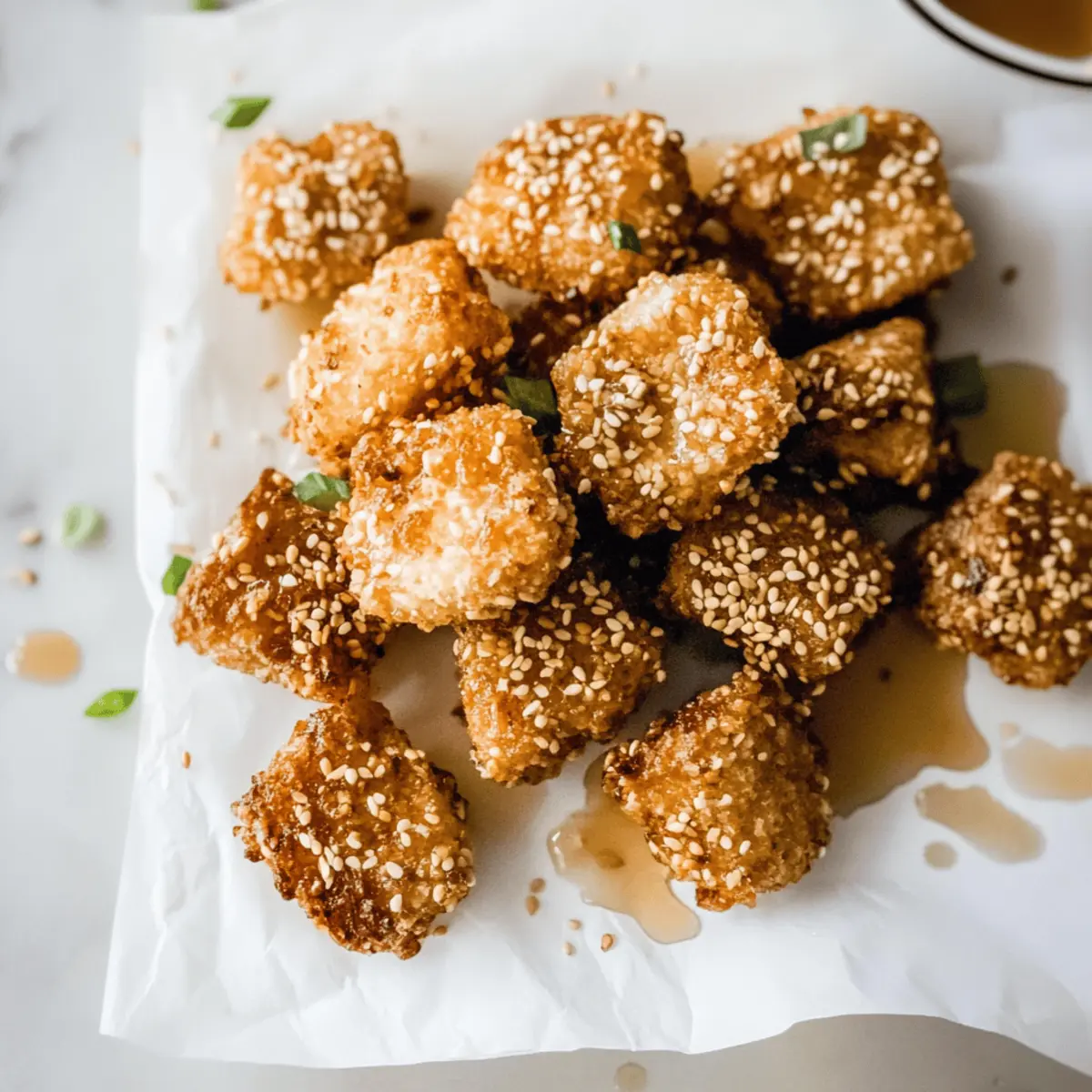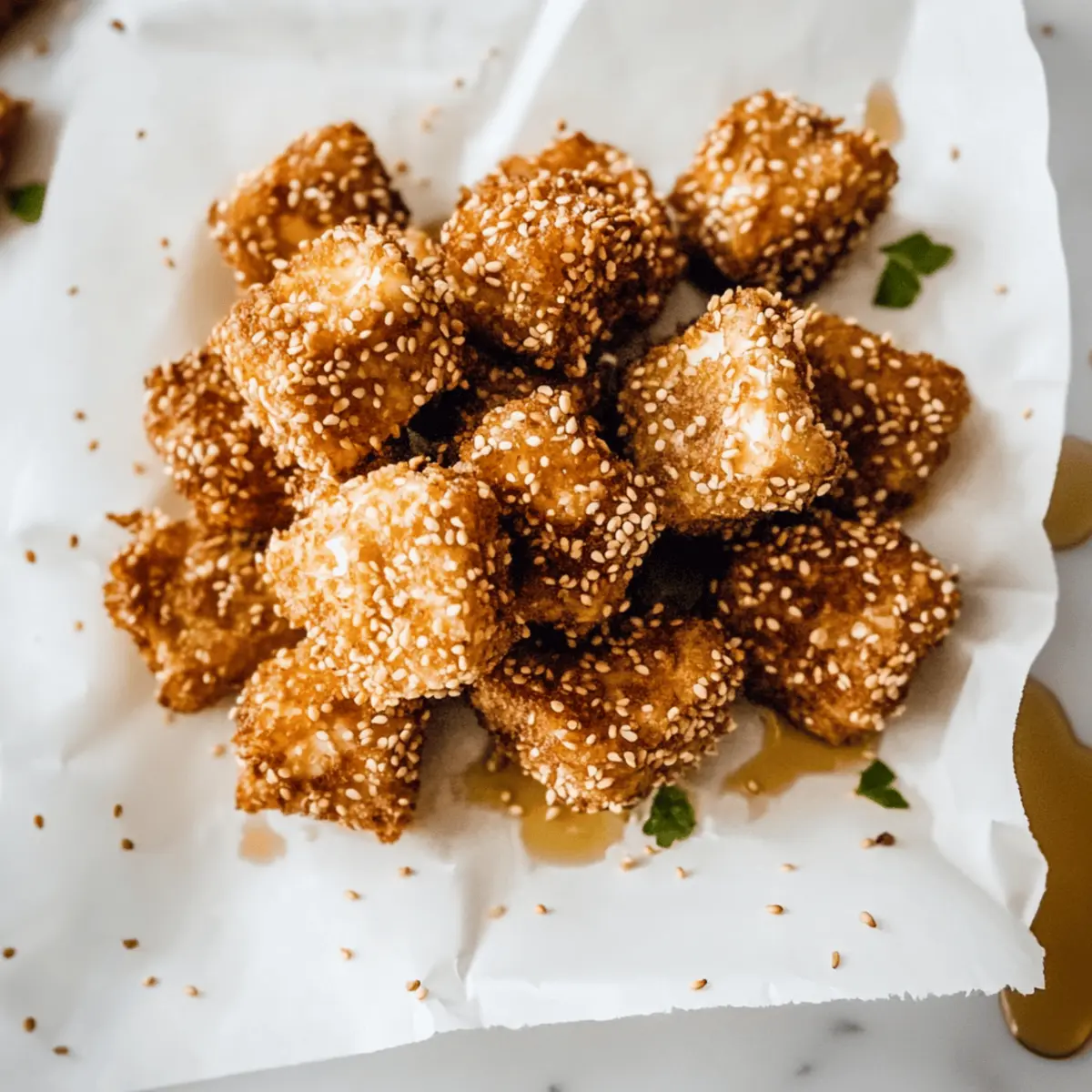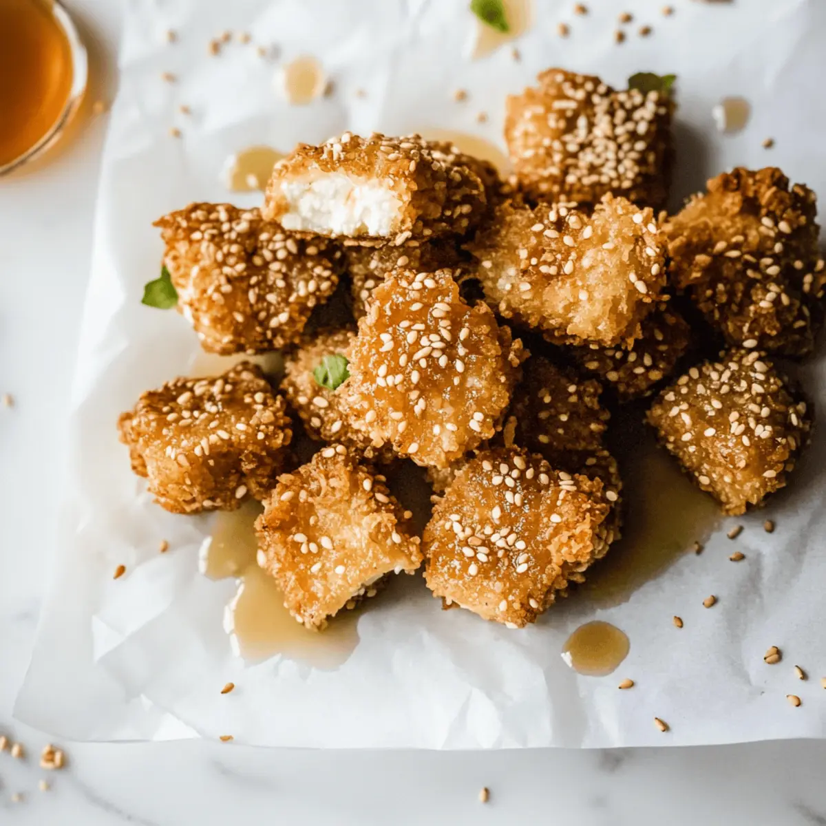 As I stood in my kitchen, the aromatic scent of sizzling oil filled the air, instantly transporting me to a charming taverna in Greece. Today, I’m excited to share my recipe for Crispy Fried Feta with Honey and Sesame, a delightful appetizer that’s perfect for impressing guests or simply indulging yourself. What makes this dish so irresistible is the beautiful contrast of flavors: the creamy, salty feta pairs perfectly with the nutty, crunchy sesame seeds and the luscious drizzle of honey. It’s not just a quick and elegant starter that can be on your table in under 30 minutes, but it’s also gluten-free when you use glutinous rice flour. Curious about how to create this mouthwatering bite of heaven? Let’s dive into the recipe and bring a taste of Greece into your home! Why is Fried Feta So Irresistible? Creamy Center, crispy exterior – each bite offers a delightful contrast that elevates your appetizer game. Quick to Prepare: With just a few ingredients and under 30 minutes, you can impress friends or family with gourmet flair. Versatile Pairing: Serve with Chicken Gyros Feta or alongside Greek Lemon Rice for a stunning spread. Gluten-Free Option ensures everyone can enjoy this dish, making it a fantastic inclusion for gatherings. Perfect for Any Occasion: Whether it’s a casual get-together or a fancy dinner party, these fried feta bites are sure to steal the show! Fried Feta With Honey And Sesame Ingredients For the Feta Bites Goat Feta Cheese – Use high-quality goat feta for a rich tang and creaminess that truly shines. Egg – This acts as the adhesive that helps the sesame coating stick beautifully. All-Purpose Flour (or Glutinous Rice Flour) – Dredging with all-purpose is standard; opt for glutinous rice flour to make it gluten-free. Sesame Seeds – They add a wonderful crunchy texture and nutty flavor without the need for pre-toasting. Oil (Olive or Neutral) – Ideal for frying, opt for olive oil to enhance the Greek authenticity, but don’t let it overheat. Honey – Choose a mild, liquid honey to drizzle on top for that perfect sweet complement to the salty feta. Enjoy the savory-sweet magic of Fried Feta With Honey And Sesame as you indulge in its delightful flavors! Step‑by‑Step Instructions for Fried Feta With Honey And Sesame Step 1: Prep Dredging Stations Begin by setting up three shallow bowls: one for beaten egg, another for all-purpose flour (or glutinous rice flour for a gluten-free option), and the last for sesame seeds. Make sure the flour is evenly spread and the egg is well whisked. This organized setup will streamline the coating process for your Fried Feta with Honey and Sesame, ensuring everything is ready to go. Step 2: Heat Oil In a medium skillet, pour enough olive oil (or neutral oil) to cover the bottom evenly, about 1/4 inch deep. Heat the oil over medium-high heat until it shimmers, which should take around 3–5 minutes. A hot oil temperature is crucial for achieving that perfect crispy exterior on the feta bites, so keep an eye on it to prevent overheating. Step 3: Coat Feta Cubes Take your high-quality goat feta cheese and cut it into bite-sized cubes, roughly 1-inch thick. One by one, dip each cube into the beaten egg, letting any excess drip off. Next, roll it in the flour, coat it with egg again, and then finally press it into the sesame seeds, ensuring an even coating. This multi-layered process is key to achieving a delightful crunch in the Fried Feta with Honey and Sesame. Step 4: Pan-Fry Feta Carefully place the coated feta cubes into the hot oil, making sure not to overcrowd the pan. Fry in batches for about 2-3 minutes, gently flipping them halfway through, until all sides turn a beautiful golden brown and crispy. Watch closely to prevent burning, as the perfect Fried Feta with Honey and Sesame should be golden, not dark. Step 5: Drain & Serve Once the feta cubes are perfectly crisp, use a slotted spatula to transfer them to a paper towel-lined plate to absorb excess oil. Allow them to drain for a minute or so before drizzling with a generous amount of honey. The contrast of the warm, crunchy feta with the sweet honey will elevate your Fried Feta with Honey and Sesame, making each bite an unforgettable experience. Make Ahead Options These Crispy Fried Feta with Honey and Sesame bites are perfect for meal prep lovers! You can manage some of the prep steps up to 24 hours in advance, saving you valuable time on busy nights. Start by breading the feta cubes: coat them in egg, flour (or glutinous rice flour for a gluten-free option), and sesame seeds. Store the prepared feta in a single layer in an airtight container in the fridge. On the day you plan to serve, simply heat oil in a skillet and fry the feta until golden brown, drizzling with honey just before serving. This way, you’ll enjoy delicious crispy bites without any fuss! What to Serve with Fried Feta With Honey And Sesame Elevate your dining experience by creating a deliciously balanced meal around these crispy bites that are bursting with flavor. Greek Lemon Rice: A zesty side that adds a refreshing touch, its bright citrus notes perfectly complement the creamy feta. Chicken Gyros: Juicy, spiced chicken wrapped in warm pita harmonizes beautifully with the salty feta and sweet honey drizzle. Tzatziki Sauce: This cool, tangy yogurt dip enhances the richness of fried feta while offering a refreshing crunch of cucumber. Mediterranean Quinoa Salad: Packed with fresh veggies and a light dressing, this hearty salad complements the dish’s richness and adds texture. Roasted Vegetables: The caramelization of seasonal veggies brings a sweet, earthy depth, enriching your plate and providing a colorful contrast. Pita Chips: Crisp and salty, they are perfect for scooping up the feta and honey as a fun and interactive appetizer. Sparkling Wine: A bubbly drink elevates the dish, enhancing the overall experience with delightful effervescence against the creamy feta. Baklava: For 