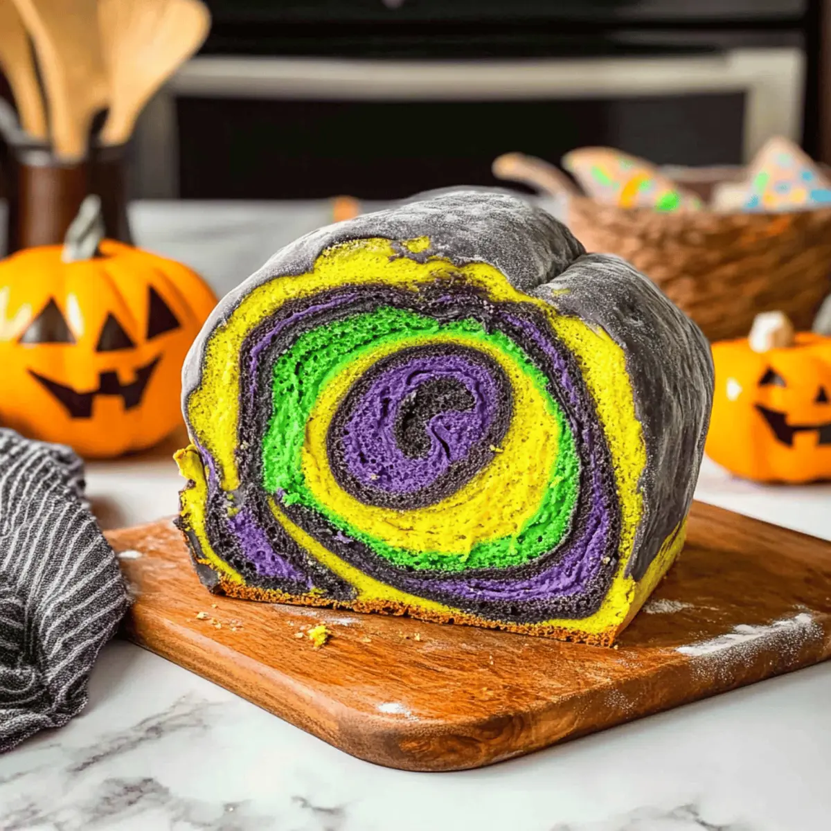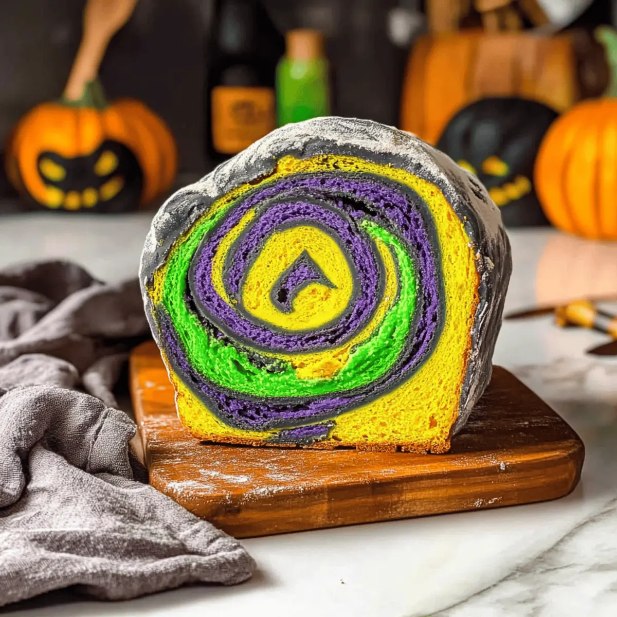 As the leaves start to change, I can’t help but feel that familiar rush of excitement—Halloween is just around the corner! This year, I’ve decided to whip up something truly special: Colorful Swirled Halloween Bread. Imagine a soft, fluffy loaf, each slice a delightful surprise of vibrant colors, all while being kid-friendly and easy to make with just eight ingredients. Not only does this recipe usher in festive cheer to any gathering, but it’s versatile enough to brighten up school lunches or family snack time. Plus, the hint of sweetness from molasses makes it irresistible! Are you ready to add a touch of magic to your baking this season? Let’s dive in! Why Is This Halloween Bread a Must-Bake? Fun and Festive: Halloween bread is the perfect way to add a splash of color to your holiday traditions, making it not only a treat but a fun project for the whole family. Kid-Friendly: With just eight simple ingredients, this easy dessert captivates kids and even less-experienced bakers, ensuring everyone feels included in the kitchen. Versatile Wonder: Serve it fresh as a delightful breakfast, or toast slices for a colorful addition to lunchboxes, and watch it disappear at parties—guaranteed crowd-pleaser! Vibrant Presentation: The striking swirls of colors make this bread a visual treat, certain to impress guests and bring smiles to little faces. Sweet Flavor: The touch of molasses provides a deliciously unique sweetness that sets this Halloween treat apart, reminiscent of your favorite seasonal goodies or even a slice of Skinny Banana Bread. Creative Customization: Feel free to experiment with your favorite colors and flavors; you can even try spices like cinnamon for an autumn twist! Halloween Bread Ingredients • Get ready to bake a festive treat! For the Dough Lukewarm Milk (1½ cups) – Hydrates the yeast for blooming; whole milk adds extra richness. Granulated Sugar (3 tablespoons) – Sweetens the bread while helping activate the yeast. Instant Yeast (2½ teaspoons) – The key leavening agent; a single envelope works perfectly for this Halloween bread. All-Purpose Flour (4 cups) – Forms the dough structure for a delightful, fluffy texture. Kosher Salt (1½ teaspoons) – Enhances flavor while regulating yeast activity for optimal rising. Unsalted Butter (3 tablespoons, melted) – Infuses richness and moisture into the final product. Unsulphured Molasses (2 tablespoons) – Adds a touch of sweetness and a deeper, richer flavor. Food Coloring (yellow, green, purple, and black) – Make your bread pop with vibrant colors; gel food coloring is best for a festive appeal. Step‑by‑Step Instructions for Halloween Bread Step 1: Bloom the Yeast In a medium bowl, combine 1½ cups of lukewarm milk (around 110°F), 3 tablespoons of granulated sugar, and 2½ teaspoons of instant yeast. Let this mixture sit for about 5 minutes, or until it becomes frothy and bubbly. This step is crucial for activating the yeast, which is the key to making your Halloween bread rise beautifully. Step 2: Mix the Dough In a large mixing bowl, whisk together 4 cups of all-purpose flour and 1½ teaspoons of kosher salt. Pour in the bloomed yeast mixture along with 3 tablespoons of melted unsalted butter and 2 tablespoons of unsulphured molasses. Mix everything until it forms a rough dough, then knead for 5 to 10 minutes until the dough is smooth and elastic. The dough should feel soft and pliable at this stage. Step 3: Color the Dough Divide your dough into four equal portions, placing each piece in a separate bowl. Add a few drops of gel food coloring—yellow, green, purple, and black—to each portion. Knead the colors into the dough until fully incorporated, ensuring each piece becomes vibrant and visually appealing. This step not only adds festive color to your Halloween bread but also allows for some creative fun in the kitchen! Step 4: Proof the Dough Line a baking sheet with parchment paper and place the colored dough balls on it, keeping them spaced apart. Cover them with a clean kitchen towel and let them rise in a warm spot for about 30 to 45 minutes or until they have doubled in size. The dough should feel light and airy when you gently poke it, indicating it’s ready for the next step. Step 5: Roll and Layer Once the dough has risen, roll each colored ball into a square shape on a lightly floured surface. Stack the squares, flipping them to alternate the colors for a fun swirled effect. Then, roll the stacked dough tightly into a rectangular log shape, ensuring the layers maintain their order. This is where the cheery visual appeal of your Halloween bread begins to take shape! Step 6: Final Proof Transfer your dough log into a greased loaf pan, seam side down. Cover with a kitchen towel and allow it to rise for another 30 to 45 minutes, until it becomes puffy and has expanded significantly. The dough should nearly fill the pan, giving it that perfect bakery-style look which will turn heads at any gathering. Step 7: Bake Preheat your oven to 350°F (175°C). Once the oven is hot, bake the Halloween bread for approximately 35 minutes, or until the top turns golden brown and a toothpick inserted in the center comes out clean. The delightful aroma will fill your kitchen, making it hard to resist. Step 8: Cool and Slice After baking, remove the bread from the oven and allow it to cool in the pan for about 10 minutes. Then, carefully transfer it to a wire rack to cool completely. Once cooled, slice into it to reveal the colorful interior and enjoy this delightful Halloween bread as a festive treat! Tips for the Best Halloween Bread Use Gel Colors: Gel food coloring provides vibrant hues that resist fading; avoid using water-based colors for lackluster results. Check Yeast Activity: Ensure your yeast blooms properly—without a frothy layer, your Halloween bread may not rise as expected. Knead Thoroughly: Kneading the dough until smooth and elastic is crucial for achieving the desired fluffy tex