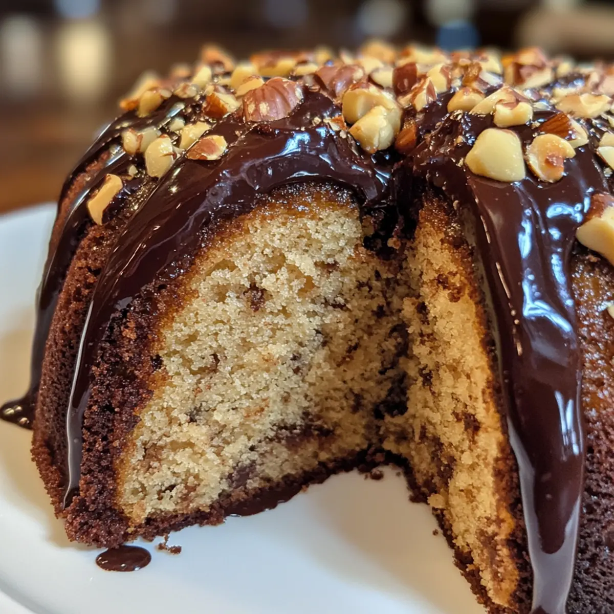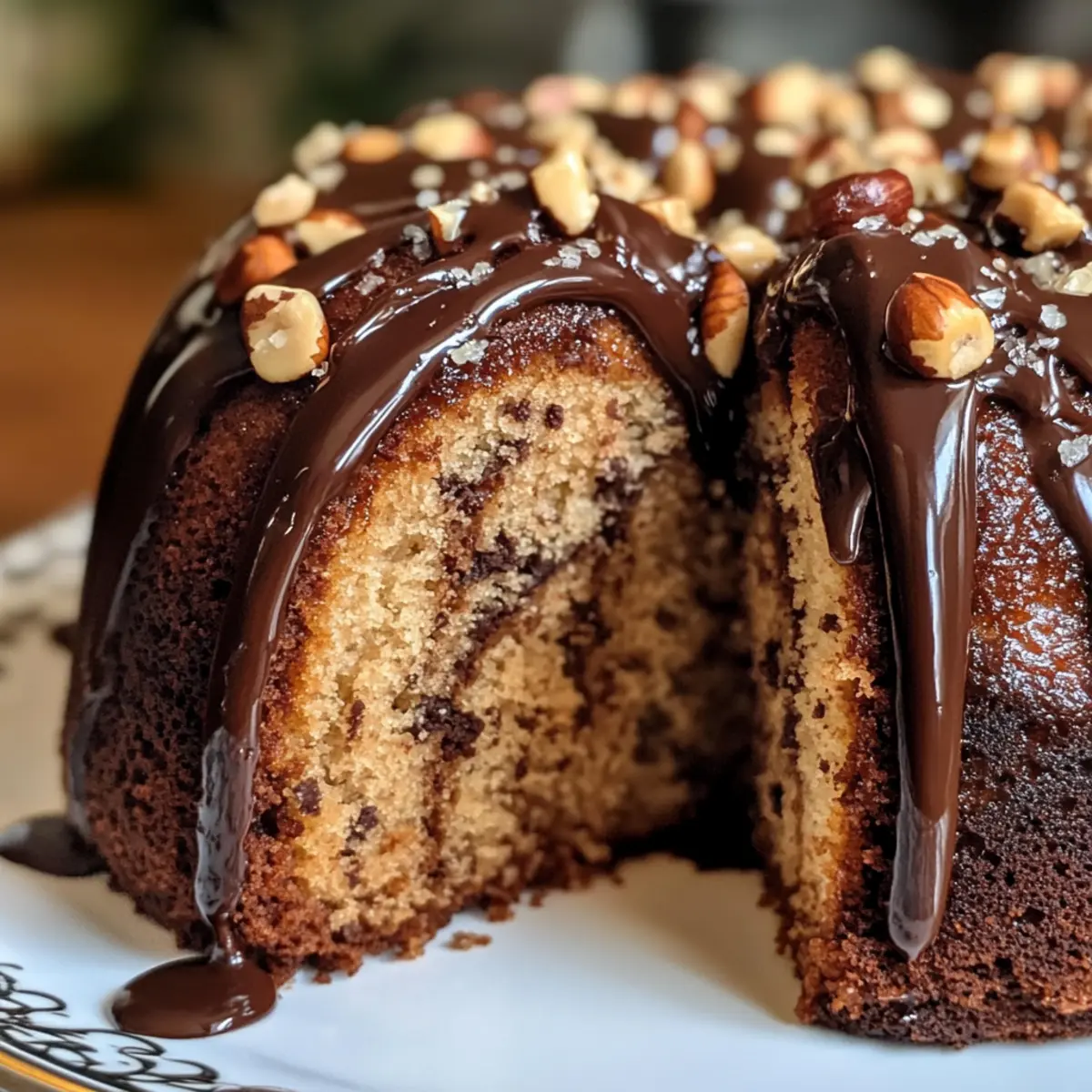 There’s something magical about the aroma of freshly baked goods wafting through the home, and this Hazelnut Bundt Cake with Espresso & Chocolate Glaze is no exception. As I mixed the ingredients, I couldn’t help but feel the warmth of nostalgia—reminding me of cozy gatherings and sweet celebrations. This indulgent dessert combines the rich, nutty flavor of toasted hazelnuts with the intriguing depth of espresso, making it an unforgettable treat. Not only is it a crowd-pleaser, but the moisture and tenderness of the cake will also leave every guest asking for seconds. It’s perfect for impressing friends at a dinner party or simply treating yourself after a long day. Are you ready to elevate your baking game and create a show-stopping centerpiece that’ll leave everyone in awe? Why is Hazelnut Bundt Cake a Must-Try? Divine Flavor: This cake uniquely combines nutty hazelnuts with bold espresso, creating a mouthwatering taste experience. Gorgeous Presentation: With its glossy chocolate glaze draping elegantly over a perfectly baked bundt, it’s a feast for the eyes. Simple Preparation: You don’t need to be a seasoned chef; just follow straightforward steps to achieve bakery-worthy results. Versatile Delight: Perfect for any occasion, from intimate family dinners to festive celebrations, leaving a lasting impression. Easily Accommodating: With simple substitutions available, like using Greek yogurt or gluten-free flour, everyone can enjoy this indulgence. Pair this delectable cake with a dollop of whipped cream or a scoop of vanilla ice cream for the ultimate experience! If you’re a fan of unique desserts, you might also enjoy a delightful Orange Ricotta Cake or the rich Oreo Cheesecake Savor. Hazelnut Bundt Cake Ingredients For the Cake All-Purpose Flour – Provides a structural base for the cake. Ground Hazelnuts (Hazelnut Meal) – Adds unique flavor and texture. Baking Powder – Acts as a leavening agent for a light cake texture. Baking Soda – Works with sour cream to enhance leavening. Salt – Balances sweetness and enhances flavors. Unsalted Butter – Supplies moisture and richness. Granulated Sugar – Imparts sweetness and texture. Large Eggs – Binds ingredients and adds moisture. Vanilla Extract – Enhances the overall flavor. Sour Cream – Contributes moisture and tanginess. Cooled Espresso – Infuses the cake with a rich coffee flavor, highlighting the Hazelnut Bundt Cake. For the Chocolate Glaze Finely Chopped Chocolate – Forms the base for a glossy chocolate glaze. Heavy Cream – Creates a rich texture for the glaze. Butter (for Glaze) – Adds smoothness to the chocolate glaze. For the Garnish Toasted Hazelnuts – Enhances flavor and adds visual appeal. These simple yet delightful ingredients come together to create a spectacular Hazelnut Bundt Cake that will be the star of your dessert table! Step‑by‑Step Instructions for Hazelnut Bundt Cake Step 1: Preheat the Oven Begin by preheating your oven to 350°F (175°C). While the oven warms up, take a moment to generously grease and flour a 10-inch bundt pan. This will ensure a beautiful release once the Hazelnut Bundt Cake is baked and cooled. Set the pan aside, anticipating the delightful aroma that will soon fill your kitchen. Step 2: Combine Dry Ingredients In a large mixing bowl, whisk together the all-purpose flour, ground hazelnuts, baking powder, baking soda, and salt. Mix thoroughly until well combined, ensuring no clumps remain. This step is critical for achieving the light texture of your Hazelnut Bundt Cake. Set the bowl aside, as it will join the wet ingredients shortly. Step 3: Cream the Butter and Sugar In a separate bowl, beat the softened unsalted butter and granulated sugar together using an electric mixer on medium speed until the mixture is light and fluffy, about 3-5 minutes. The color will turn a pale yellow, indicating that the sugar has incorporated well with the butter. This creates the rich base that your cake needs for moisture and flavor. Step 4: Incorporate Eggs and Vanilla Add the large eggs to the creamed butter mixture, one at a time, beating well after each addition. Follow by mixing in the vanilla extract until fully blended. The batter will become smooth and creamy, infusing the Hazelnut Bundt Cake with warmth and sweetness. Step 5: Mix Dry Ingredients with Wet Ingredients Gradually add the dry mixture to the butter mixture, alternating with the sour cream and cooled espresso. Start and end with the dry ingredients. Mix just until combined; overmixing can lead to a dense cake. The batter should be thick and aromatic, with the blended flavors of hazelnuts and espresso starting to shine. Step 6: Pour and Bake Transfer the batter to the prepared bundt pan, spreading it evenly and smoothing the top with a spatula. Place the pan in the preheated oven and bake for 45-55 minutes, or until a toothpick inserted into the center comes out clean or with a few moist crumbs. The cake should rise beautifully and have a golden-brown top when done. Step 7: Cool the Cake Once baked, remove the bundt pan from the oven and let it cool in the pan for 15 minutes. This cooling time is essential to help the cake release easily from the pan. After 15 minutes, carefully invert the pan onto a wire rack; the Hazelnut Bundt Cake should slide out smoothly. Step 8: Prepare the Chocolate Glaze While the cake cools completely, prepare the chocolate glaze. In a small saucepan, heat the heavy cream and butter over medium heat until it simmers. Pour the hot mixture over the finely chopped chocolate in a bowl, letting it sit for 2-3 minutes. Stir until smooth and glossy, creating a rich topping for your cake. Step 9: Glaze and Garnish Once the cake has completely cooled, drizzle the chocolate glaze over the top, allowing it to cascade down the sides. For a decorative touch, sprinkle toasted hazelnuts over the glaze for added flavor and visual appeal. Your stunning Hazelnut Bundt Cake with Espresso & C