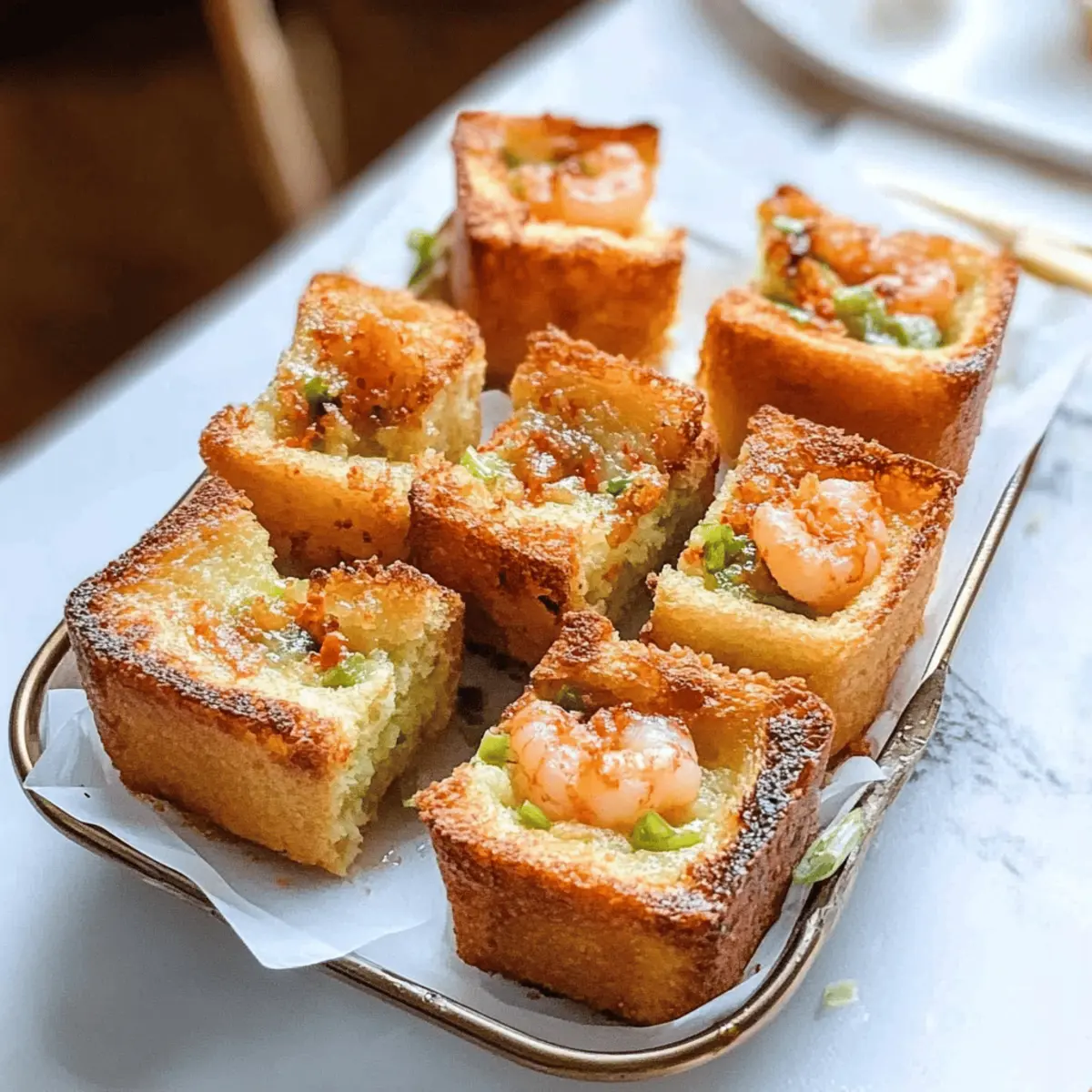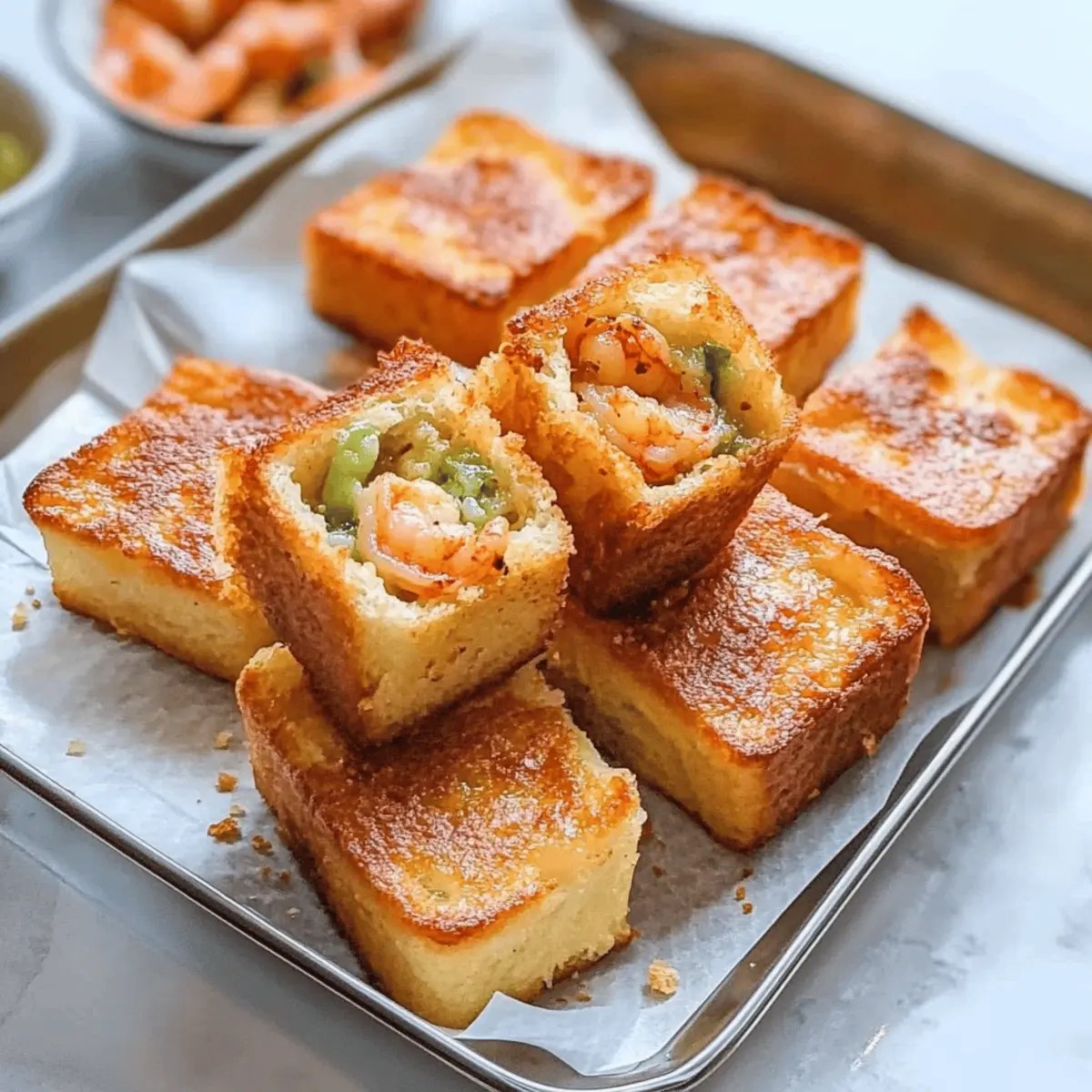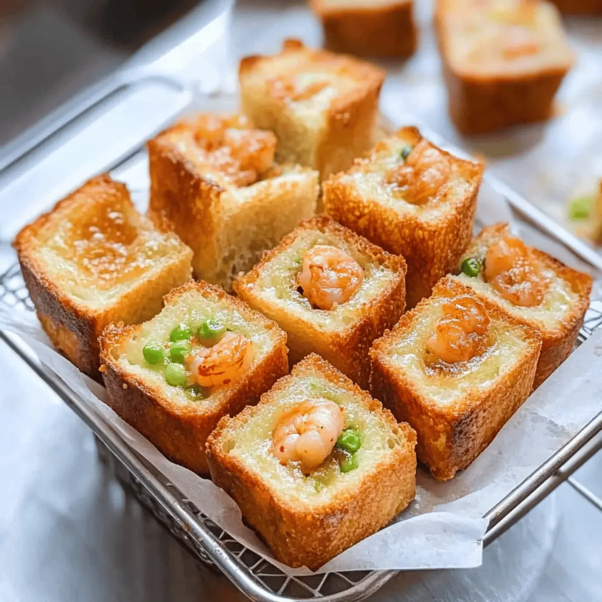 The moment I took that first bite of Air-Fried Menbosha, the delightful crispiness mingled with the tender shrimp filling transported me to street vendors bustling through Korea’s vibrant markets. This recipe for Korean Chinese Shrimp Toast captures all the essence without the guilt of deep frying, making it a healthier go-to for appetizers or snacks. With just a handful of ingredients and an air fryer, you can whip up a savory treat that pleases not just your palate but the crowd too! Imagine serving these golden, crunchy bites at your next gathering; they’ll disappear before you know it. Are you ready to add a touch of Korean flair to your kitchen? Why Try This Korean Shrimp Toast? Crispy and Healthy: This air-fried Menbosha gives you that golden crunch without the guilt of deep frying. Savory Shrimp Delight: Each bite bursts with tender shrimp filling, making it an irresistible snack. Quick and Easy: With minimal prep and straightforward steps, you can have these delicious toasts ready in no time. Versatile Serving Options: Pair them with sweet chili sauce or your favorite dip for a crowd-pleasing appetizer. Perfect for Gatherings: Impress your friends at parties or family get-togethers; they’ll be begging for the recipe! Explore more delightful shrimp recipes like Crispy Air Fryer Shrimp or add a twist with Grilled Shrimp Bowl. Korean Chinese Shrimp Toast Ingredients For the Filling • Minced Shrimp – Main filling; ensures a savory flavor and is packed with protein, so opt for the freshest shrimp available. • Chopped Green Onion – Adds a fresh crunch; you can substitute with chives if needed. • Egg White – Binds the filling together; try flaxseed meal mixed with water for a vegan alternative. • Cornstarch – Essential for binding and achieving that crispy texture; swap in potato starch if you’re in a pinch. • Cooking Rice Wine – Enhances overall flavor; dry sherry can work, or omit for a non-alcoholic option. • Salt & Pepper – Basic seasoning; adjust according to your taste preferences. For the Toast • White Bread (crusts trimmed) – Soft texture that soaks up flavors; consider gluten-free bread if desired. • Canola Oil Spray – For that satisfying crunch; use any neutral oil spray you have on hand. Enjoy crafting these delightful Air-Fried Menbosha, your new favorite version of Korean Chinese Shrimp Toast! Step‑by‑Step Instructions for Korean Chinese Shrimp Toast Step 1: Prepare Filling In a large mixing bowl, combine minced shrimp, chopped green onion, egg white, cornstarch, cooking rice wine, salt, and pepper. Use a fork or your hands to mix until everything is well incorporated, ensuring a smooth and cohesive filling. This savory mixture will be the heart of your Korean Chinese Shrimp Toast, so take the time to blend the ingredients thoroughly. Step 2: Bread Preparation Trim the crusts off each slice of soft white bread, creating a neat square. Then, cut each slice into four equal squares. This will give you the perfect base for your shrimp filling, allowing the bread to absorb all the delicious flavors while achieving that crispy crunch in the air fryer. Step 3: Assemble Toasts On a square of bread, place approximately 1 tablespoon of your shrimp filling in the center, and top it with another square. Gently press the edges to seal the filling inside. Repeat this process until you’ve used up all your shrimp mixture, yielding around 12 delightful Korean Chinese Shrimp Toasts, ready to be air-fried to perfection. Step 4: Air Frying Preheat your air fryer to 350°F (175°C) for about 3-5 minutes. Once heated, lightly spray both sides of each toast with canola oil spray. Arrange the toasts evenly in the air fryer basket, making sure they’re not overcrowded. Cook them for 5-6 minutes, checking periodically until they’re golden brown and crispy on the outside. Step 5: Serve Carefully remove the golden Korean Chinese Shrimp Toasts from the air fryer and allow them to cool for a minute. This will help the filling set slightly. Serve them warm alongside sweet chili sauce or your dipping sauce of choice for an irresistible appetizer that will impress your guests. Make Ahead Options These Air-Fried Menbosha (Korean Shrimp Toast) are ideal for meal prep, allowing you to enjoy this delicious snack with ease during busy weeknights! You can prepare the shrimp filling and assemble the toasts up to 24 hours in advance. Simply store them in an airtight container in the refrigerator to keep them fresh. When you’re ready to serve, just air fry them straight from the fridge for 5-6 minutes at 350°F until golden and crispy. This way, you’ll have a delightful appetizer ready in no time, perfect for impressing your family or guests without the last-minute rush! What to Serve with Air-Fried Menbosha? Elevate your Air-Fried Menbosha experience with delightful pairings that will tantalize your taste buds and bring out the best in each bite. Sweet Chili Sauce: A classic accompaniment, its sweet and spicy notes enhance the savory shrimp filling beautifully. Crispy Veggie Spring Rolls: Add a crunchy texture; their fresh, vibrant flavors make for a delightful contrast. Garlic Edamame: This lightly salted snack introduces a nutty touch, balancing out the toasty shrimp flavors perfectly. Cucumber Salad: Light and refreshing, a tangy cucumber salad with sesame oil can clarify the palate and brighten the meal. Kimchi: For a true Korean experience, serve this spicy fermented cabbage along with a unique, punchy taste that uplifts the Menbosha. Soba Noodle Salad: Tossed with vegetables and a light soy dressing, the noodle salad brings hearty yet healthy elements to the table. Crispy Fried Rice: This savory fried rice with peas and carrots rounds out your meal, providing a satisfying contrast to the toasts. Asian Pear Mojito: Refreshing and just slightly sweet, this drink complements the flavors while keeping things light and fun. Green Tea Ice Cream: End your meal on