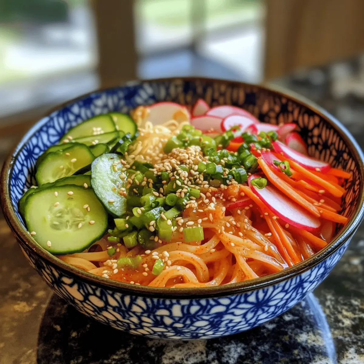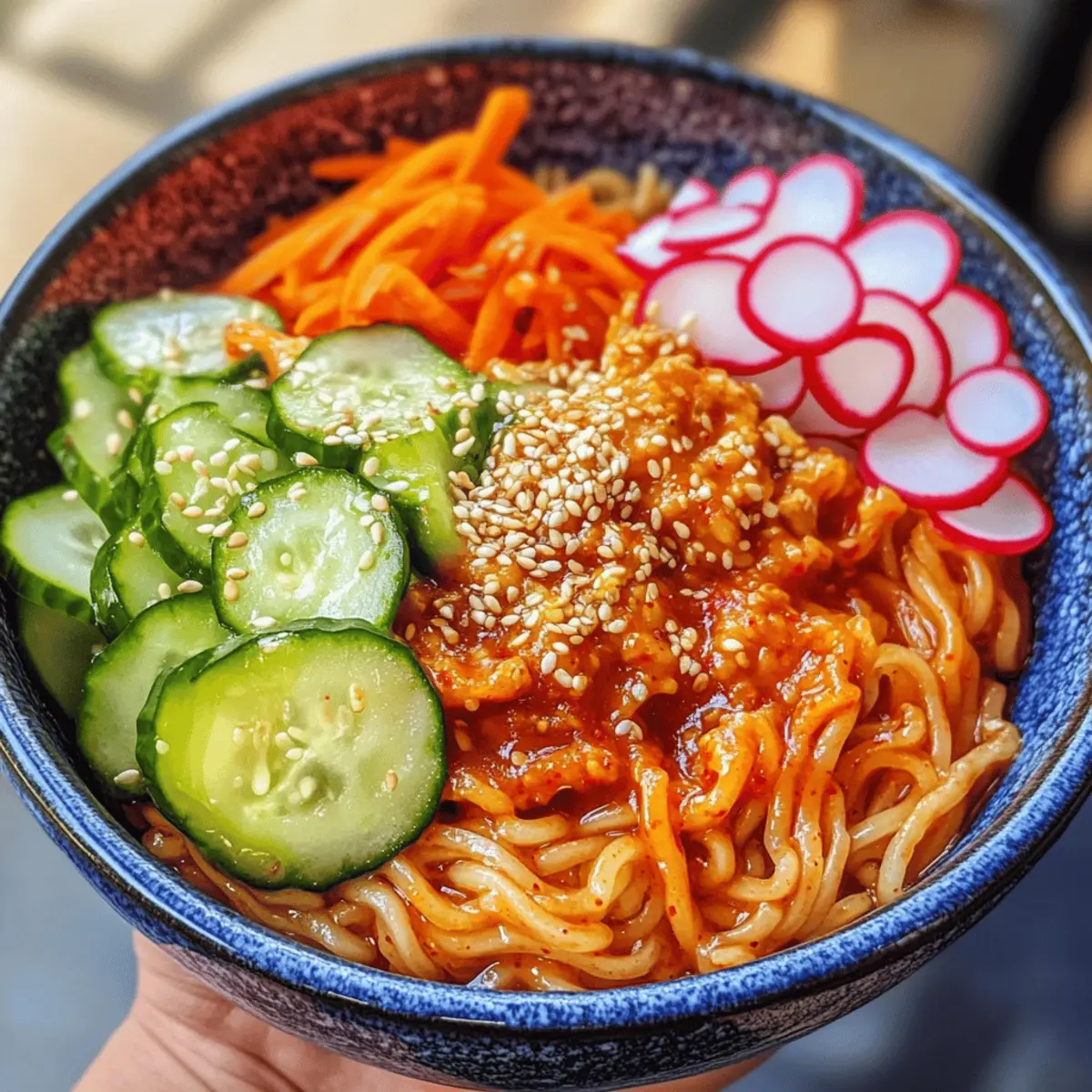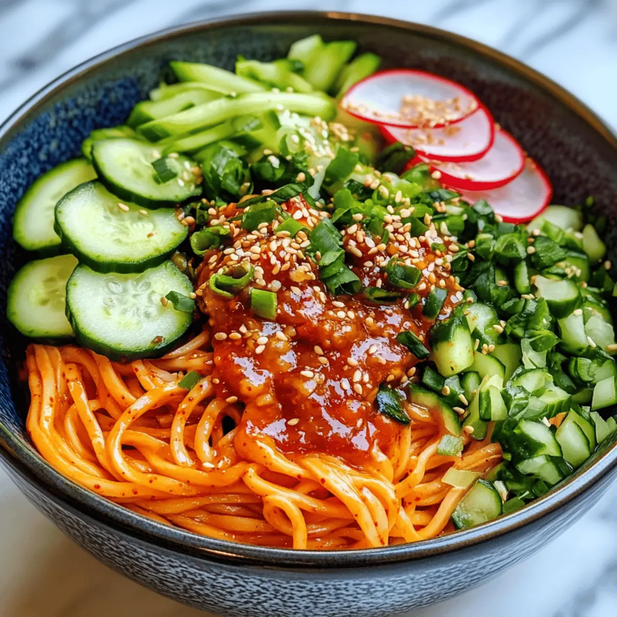 The sizzling summer sun draws us outside, where an invigorating bite awaits. Enter Korean Cold Noodles with Spicy Sweet Gochujang Sauce—my go-to dish when the heat rises and I crave something refreshingly cool. These vibrant noodles come together in a snap and can effortlessly cater to your culinary whims, making them a delightful, healthy summer meal. The chewy noodles and a drizzle of spicy-sweet gochujang sauce offer a contrasting crunch with each bite, enhanced by a colorful array of fresh vegetables. Feel free to mix and match toppings based on what’s in your fridge! Whether you’re a seasoned home-chef or just looking to elevate your dinner game, these noodles promise to be a crowd-pleaser. Ready to take your taste buds on a deliciously cool adventure? Why are Korean Cold Noodles irresistible? Unmatched Refreshment: There’s nothing quite like a bowl of cold noodles to cool you down on a hot summer day. Spicy-Sweet Delight: The gochujang sauce adds an irresistible kick, perfectly balancing the dish’s refreshing qualities. Customizable Goodness: Tailor your toppings with fresh veggies or leftovers, ensuring every bite is uniquely yours. Quick and Easy: Ready in just minutes, this recipe cuts down on kitchen time while delivering maximum flavor. Crowd-Pleasing Wonder: Perfect for gatherings, these noodles are sure to impress everyone at the table. Pair them with Sticky Beef Noodles for a complete meal that pleases all palates! Korean Cold Noodles Ingredients For the Noodles • Round Noodles – This flour-based pasta ensures the best texture for a cold dish; buckwheat soba noodles are a great gluten-free alternative. For the Gochujang Sauce • Gochujang – The star of our dish, this Korean chili paste gives the essential spicy-sweet flavor; homemade or store-bought works perfectly. For the Toppings • Pickling Cucumbers – These crunchy delights elevate your dish’s texture; they are ideal for retaining crispness compared to regular cucumbers. • Fresh Raw Vegetables (carrots, radishes, leafy greens, Asian pear) – Choose any combination you love; they not only add nutrition but also vibrant colors that make this Korean cold noodle dish pop! Get ready to refresh your summer meals with these Korean Cold Noodles that are not just healthy but also bursting with flavor and personality! Step‑by‑Step Instructions for Korean Cold Noodles Step 1: Cook Noodles Bring a large pot of water to a rolling boil over high heat. Add round noodles and cook according to the package instructions, usually around 4-6 minutes, until they reach an al dente texture. Stir occasionally to prevent sticking. Once cooked, drain the noodles in a colander, allowing the steam to escape, and set aside for the next steps. Step 2: Chill Noodles After draining, rinse the cooked noodles under cold running water for about 2–3 minutes. This stops the cooking process and cools them down perfectly, making them refreshing for your Korean Cold Noodles. You want the noodles to feel cool to the touch and slightly firm; set them aside to completely drain while you prepare the sauce. Step 3: Prepare Gochujang Sauce In a small bowl, combine gochujang, sugar, vinegar, and any other desired ingredients like sesame oil or garlic. Whisk until smooth, allowing the flavors to meld beautifully—this should take about 2 minutes. Taste and adjust the seasoning according to your preference for spiciness and sweetness, ensuring your sauce complements the noodles perfectly. Step 4: Assemble Bowl In a large serving bowl, place a generous portion of your chilled noodles as a base. Layer on your choice of fresh raw vegetables, such as pickling cucumbers, carrots, and leafy greens, creating an inviting, colorful presentation. Drizzle the homemade gochujang sauce over the top, ensuring an even coating for maximum flavor throughout the dish. Step 5: Serve Cold Your Korean Cold Noodles are now ready to enjoy! Serve them immediately for the best flavor and texture, or refrigerate for up to 30 minutes for a cooler treat. This dish is designed to be enjoyed cold; avoid reheating it to maintain its delicious freshness. Each bite promises a delightful mix of chewy noodles, crunchy veggies, and spicy-sweet sauce! Expert Tips for Korean Cold Noodles Choose the Right Noodles: Select round noodles for the best chewy texture; buckwheat soba is a suitable gluten-free choice. Perfectly Chill the Noodles: Make sure to rinse the noodles thoroughly under cold water until completely cool; this step is crucial for a refreshing dish. Adjust Sauce to Taste: The gochujang sauce is versatile; taste it before adding to your noodles and modify the sweetness or spice level as needed. Customize Your Toppings: Get creative with your fresh vegetables! Personalizing your Korean cold noodles adds variety and ensures every bowl is unique. Serve Immediately: Enjoy your dish fresh and cold for optimal flavor. If preparing in advance, assemble the noodles and sauce separately until ready to serve. Make Ahead Options These Korean Cold Noodles are perfect for meal prep enthusiasts! You can cook and chill the noodles up to 24 hours in advance, storing them in an airtight container to keep them fresh and prevent them from sticking together. Additionally, the gochujang sauce can be prepared ahead of time and refrigerated for up to 3 days—just give it a good stir before using. For the freshest flavor, it’s best to chop and prepare your fresh vegetables right before serving. When you’re ready to eat, simply combine the cold noodles with the gochujang sauce and topped vegetables for a delightful meal that’s just as delicious as if made fresh! Korean Cold Noodles Variations Feel free to let your creativity shine by customizing your Korean Cold Noodles with exciting variations! Soba Noodles: Substitute round noodles with buckwheat soba for a gluten-free option that adds earthiness. Spicy Kick: Add sliced jalapeños or a sprinkle of Korean red pepper flakes for ex