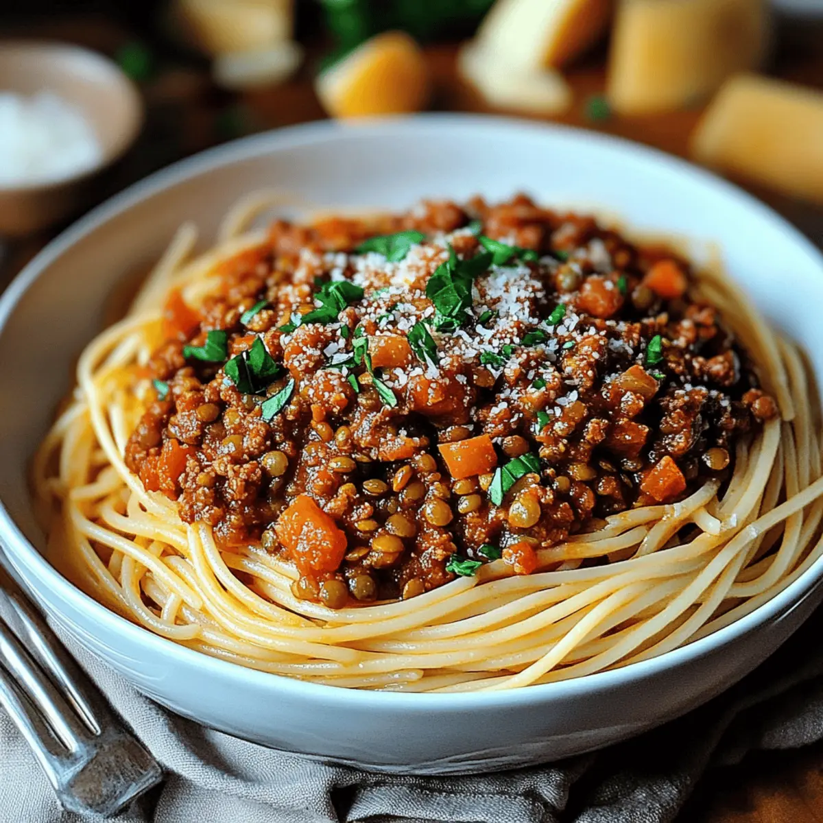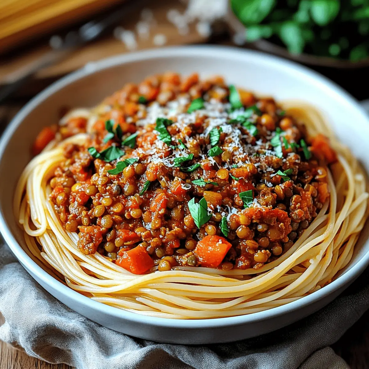 The aroma wafting from the kitchen was irresistible; it had everyone wondering what was simmering away. When I shared that it was my Hearty Vegan Lentil Bolognese, eyes lit up. This plant-based delight beautifully mimics the traditional meat sauce, making it a hit not just for vegans, but for anyone seeking a comforting meal. One of the best perks? It’s remarkably quick to prepare, perfect for busy weeknights or those impromptu gatherings with friends. Plus, it’s packed with nutrients, ensuring you’re treating your body right while satiating your soul with every bite. Are you ready to dive into a bowl that warms you from the inside out? Let’s get started! Why is Lentil Bolognese a Must-Try? Irresistible Comfort: This Lentil Bolognese offers all the warmth of a classic Italian dish without any meat. Quick and Easy: Perfect for those busy weeknights, it takes just 30 minutes to whip up a nutritious, satisfying meal. Nutrient-Dense Goodness: Packed with protein and fiber, it’s not only delicious but also a healthy choice for you and your family. Endless Versatility: Serve it over pasta, use it in lasagna, or enjoy it on its own—it’s adaptable for any occasion! Crowd-Pleasing Flavor: Even meat lovers can’t resist the rich, savory notes of this hearty sauce. Once you try it, consider exploring variations or delightful pairings like a side salad or garlic bread for a complete feast! Lentil Bolognese Ingredients For the Bolognese Sauce • Lentils – The backbone of the dish, providing protein and texture; choose green or brown lentils for best results. • Canned Tomatoes – Whole peeled tomatoes add natural sweetness and depth; opt for high-quality brands for maximum flavor. • Onion – Yellow onion offers a sweet base flavor that enhances the sauce; chop finely to ensure even cooking. • Carrots – Diced carrots add a pop of color and natural sweetness; don’t skip for the best overall flavor. • Celery – Chopped celery contributes crispness and aromatic flavor, balancing the dish beautifully. • Garlic – Minced garlic brings a punchy, savory note; always use fresh for optimal taste. • Vegetable Broth – Provides richness; using low-sodium helps control overall saltiness. • Basil – Fresh basil adds a garden-fresh flavor that’s essential to this dish; add just before serving for maximum aroma. • Oregano – Dried oregano infuses warmth and depth throughout the sauce. For Serving • Pasta – Choose spaghetti or your favorite type to serve with the sauce; versatility is key. Step‑by‑Step Instructions for Lentil Bolognese Step 1: Sauté Aromatics In a large pot, heat 2 tablespoons of olive oil over medium heat. Add finely chopped onions, diced carrots, and chopped celery, cooking for about 5 minutes until the vegetables soften and the onions turn translucent. Stir occasionally to prevent sticking, allowing those vibrant aromas to fill your kitchen as they begin to caramelize. Step 2: Add Garlic & Spices Next, stir in 3 cloves of minced garlic and 1 teaspoon of dried oregano, allowing them to cook together for 1 minute until fragrant. The garlic should start to sizzle lightly, releasing its savory scent that complements the sautéed vegetables beautifully. This step is pivotal in layering the comforting flavors of your Lentil Bolognese. Step 3: Incorporate Lentils & Tomatoes Now, add 1 cup of rinsed lentils, 1 can (28 ounces) of crushed tomatoes, and 2 cups of vegetable broth into the pot. Stir everything together, ensuring the lentils are well coated with the tomato mixture. The pot should begin to bubble gently as the ingredients combine, promising a hearty sauce ahead. Step 4: Simmer Bring the mixture to a gentle boil, then reduce the heat to low and cover the pot. Let it simmer for 25-30 minutes, stirring occasionally, until the lentils are tender and the sauce thickens. You’ll know it’s ready when the lentils have absorbed most of the liquid and the colors deepen, creating a rich, inviting sauce that your family will love. Step 5: Taste & Adjust As you approach the end of cooking, take a moment to taste your Lentil Bolognese. Adjust the seasoning with salt and pepper to your liking, adding more herbs if desired. This crucial step allows you to personalize the flavors and make the dish your own, ensuring every bite is satisfying. Step 6: Add Fresh Herbs & Serve Finally, just before serving, stir in a handful of freshly chopped basil for a burst of flavor and aroma. Serve your hearty Lentil Bolognese over your favorite pasta, or enjoy it on its own. The vibrant colors and rich textures promise a meal that is both comforting and nutritious, perfect for sharing with loved ones. Expert Tips for Lentil Bolognese Quality Ingredients Matter: Always choose high-quality canned tomatoes; they elevate the flavor and richness of your Lentil Bolognese, making a noticeable difference. Adjust Seasoning Carefully: Taste your sauce halfway through cooking; adjusting seasoning early allows the flavors to meld beautifully without overwhelming the dish. Don’t Rush the Simmer: For deeper flavors, let the sauce simmer longer than 30 minutes; this creates a more robust and thick sauce, enhancing every spoonful. Experiment with Spice: If you love heat, add crushed red pepper flakes or jalapeños at the beginning for an extra kick, but taste first to find your perfect balance. Store Wisely: If you have leftovers, cool the sauce before transferring it to an airtight container. It stays fresh in the fridge for up to five days or can be frozen for three months. Lentil Bolognese: Variations & Substitutions Feel free to get creative with this Lentil Bolognese—there are plenty of delightful twists to enhance its flavor and appeal! Mushroom Swap: Replace lentils with finely chopped mushrooms for a deeper umami flavor. This variation is particularly loved by those craving a meatier texture. Red Wine Addition: Add a splash of red wine during the cooking process for an arom