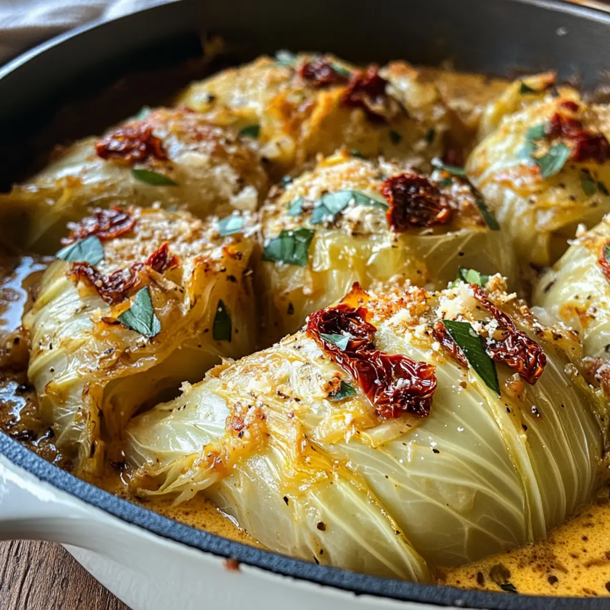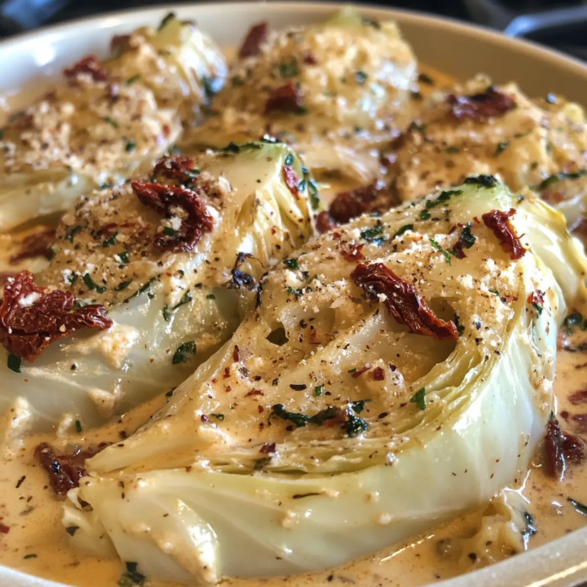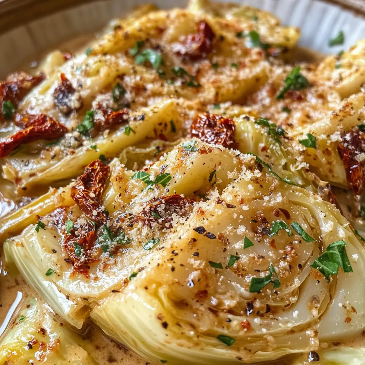 As the aroma of caramelizing cabbage wafts through my kitchen, I can almost hear the smiles of my loved ones anticipating what’s to come. Today, I’m thrilled to share my Marry Me Melting Cabbage with Creamy Tuscan Sauce. This recipe delights with its tender, golden wedges perfectly enveloped in a rich, creamy sauce that brings together the irresistible flavors of sun-dried tomatoes and savory herbs. It’s not just a dish; it’s a love letter to comfort food. With quick prep and the option to make it vegetarian or even gluten-free, it’s a crowd-pleaser suitable for any occasion. So, are you ready to fall in love with your dinner all over again? Let’s dive in! What makes this cabbage dish irresistible? Flavor Explosion: The combination of creamy sauce, sun-dried tomatoes, and fresh herbs packs a delightful punch that elevates cabbage to new heights. Easy Preparation: With a simple method that even novice cooks can master, this recipe combines minimal prep time with maximum flavor. Versatile Appeal: Enjoy it as a sumptuous side or a hearty main; it easily adapts to different dietary preferences, making it perfect for gatherings. Crowd-Pleasing Comfort: Each tender bite radiates warmth and satisfaction, ensuring that everyone at the table will be asking for seconds. Make-Ahead Magic: Prepare ahead of time for stress-free entertaining, letting flavors meld beautifully, so all you have to do is pop it in the oven! Discover more tantalizing ideas to complement this dish by checking out our guide on vegetarian meal planning! Marry Me Melting Cabbage Ingredients • Ready to create a heartwarming dish? For the Cabbage Green cabbage – A tender base; cut into wedges for even cooking. Olive oil – Ideal for searing; avocado oil can work as a substitute for higher heat. Butter – Adds richness; plant-based butter is a great alternative for dairy-free cooking. For the Sauce Red onion – Brings sweetness; yellow onion serves as a suitable substitute. Garlic – Fresh is best for flavor; garlic powder may be used but reduce the amount. Low-sodium chicken broth/vegetable broth – Provides moisture; homemade broth elevates the taste! Full-fat cream cheese – Ensures creaminess; heavy cream can double as a lighter alternative. Heavy cream – Adds a luscious consistency; consider coconut cream for a dairy-free option. Sun-dried tomatoes in oil – Offers rich tomato flavor; fresh tomatoes require longer cooking time. Dried oregano, thyme, rosemary – These herbs enhance flavors; fresh herbs can be swapped in for a bolder taste. Table salt & black pepper – Essential for seasoning; adjust to accommodate dietary needs. Red pepper flakes (optional) – For a touch of heat; omit if you prefer a milder dish. Grated Parmesan cheese – A finishing touch for flavor; nutritional yeast works well for vegan options. Chopped fresh parsley – Brightens the dish with freshness; chives or basil can be used instead. With these ingredients, you’re on your way to creating the delightful Marry Me Melting Cabbage! Enjoy the process as much as the outcome—this dish is sure to inspire love at first bite! Step‑by‑Step Instructions for Marry Me Melting Cabbage Step 1: Preheat the Oven Begin by preheating your oven to 375°F (190°C). This step ensures the cooking environment is ready for your Marry Me Melting Cabbage, allowing it to achieve that perfect tenderness and golden finish. Keeping your oven warm will help in evenly baking the cabbage once you combine it with the luscious creamy sauce later. Step 2: Prepare the Cabbage Next, take a head of green cabbage and cut it into 8 wedges, ensuring to preserve the core for structure. This preparation keeps the wedges intact during cooking, allowing them to soak up all those delightful flavors. Set the prepared wedges aside while you get ready to sear them to golden perfection. Step 3: Sear the Cabbage In an oven-safe skillet, pour a splash of olive oil and heat over medium-high. When the oil shimmers, place the cabbage wedges in the skillet, searing them for about 2-3 minutes per side until they turn a lovely golden brown. Once seared, season with a sprinkle of salt and pepper, then remove the cabbage and set it aside. Step 4: Cook the Aromatics Using the same skillet, lower the heat and add butter. Let it melt, and then add the chopped red onion. Sauté for about 4-5 minutes until the onion softens and becomes translucent. Add the minced garlic, continuing to cook for another 1-2 minutes until it becomes fragrant, infusing the dish with its mouthwatering aroma. Step 5: Deglaze the Pan Pour in low-sodium chicken broth or vegetable broth to deglaze the skillet, scraping up any flavorful browned bits from the bottom. This step not only enhances the flavor of your sauce but also incorporates the delicious remnants from the seared cabbage. Bring the liquid to a gentle simmer for about 2 minutes. Step 6: Make the Creamy Sauce Stir in the full-fat cream cheese until smooth, allowing it to melt into the broth. Then, add the heavy cream and the sun-dried tomatoes, along with the dried oregano, thyme, rosemary, salt, and pepper. Let this mixture simmer on low for about 5 minutes until it thickens slightly and becomes a rich, creamy sauce. Step 7: Combine and Cover Once the sauce is ready, stir in grated Parmesan cheese until melted and smooth. Now, return the seared cabbage wedges to the skillet, coating them generously with the creamy sauce. Ensure each wedge is enveloped in this delightful concoction, making your Marry Me Melting Cabbage burst with flavors. Step 8: Bake to Perfection Cover the skillet with aluminum foil and place it in the preheated oven. Bake for 45 minutes, allowing the cabbage to become tender and infused with all the wonderful flavors. After the time is up, remove the foil, baste the cabbage lightly with the sauce, and continue to bake for an additional 15-20 minutes or until the wedges are fork-tender. Step 9: Serve and Garnish Once baked