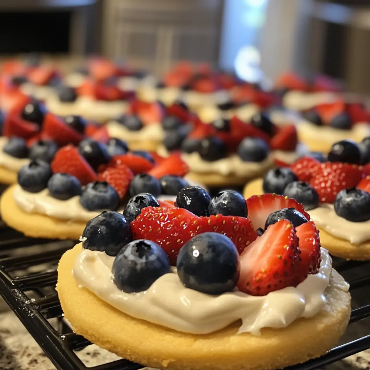 Now comes the fun part! Artfully arrange the blueberries and sliced strawberries on top of the creamy layer. You can create a pattern or simply scatter the fruit for a casual look. This step adds a burst of color and freshness, making your Mini Fruit Pizza not only delicious but visually stunning.