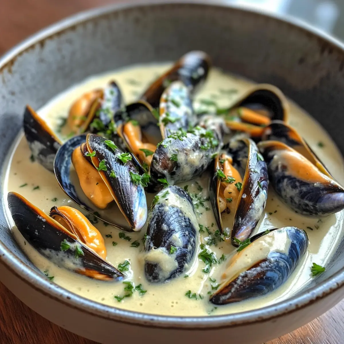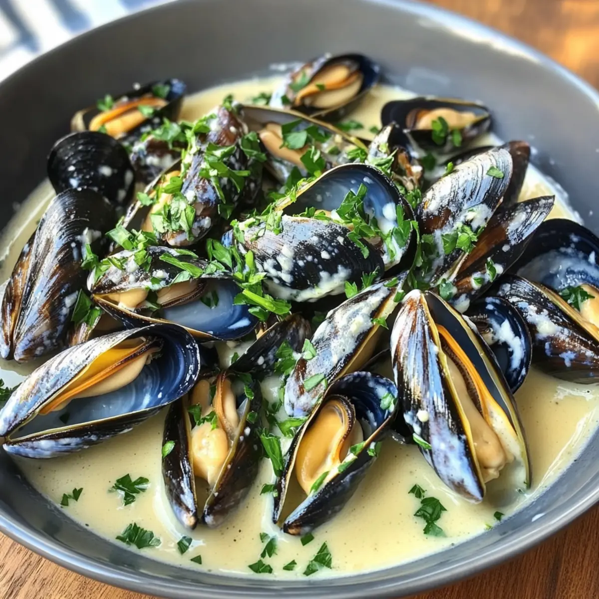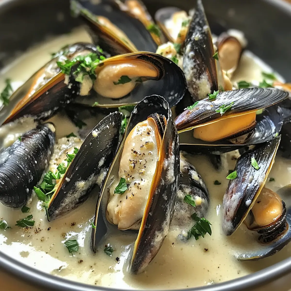 If you’ve ever dreamed of a meal that transports you straight to a seaside bistro with just one bite, then you’re in for a treat with my Mussels in White Wine Sauce. This dish comes together in just 20 minutes and makes for an effortless yet impressive dinner. Imagine plump, tender mussels soaking in a rich, creamy sauce infused with garlic and shallots, bringing comfort and a hint of luxury to your dining table. Not only is this recipe quick to whip up, making it perfect for a busy weeknight, but it’s also a gluten-free delight that will make any seafood lover swoon. Wouldn’t that be a perfect addition to your culinary repertoire? Why choose mussels in white wine sauce? Quick and Easy: In just 20 minutes, you can create a stunning dish that’s perfect for any occasion. No advanced skills required! Impressive Flavor: The combination of juicy mussels, rich white wine, and creamy garlic sauce delivers a mouthwatering experience that will wow your guests. Comforting Yet Elegant: This dish brings a taste of fine dining right to your home, offering the best of both worlds—comfort food with a gourmet twist. Versatile Ingredient Swap: Feel free to get creative! Try using clams or shrimp instead of mussels for a different seafood adventure, or experiment with herbs like thyme or dill for a new flavor profile. Perfect Pairings: For a delightful meal, serve your mussels with crusty bread to soak up that delicious sauce, or over pasta for a complete dinner. Don’t forget to check out our Grilled Shrimp Sauce for another delicious seafood option! Mussels in White Wine Sauce Ingredients For the Sauce Unsalted Butter – Adds richness and flavor; feel free to use olive oil for a lighter option. Shallots – Provide a milder onion flavor; substitute with onions if necessary. Garlic – Enhances the dish with aromatic depth; fresh garlic is preferred but garlic powder can suffice. Red Pepper Flakes – Adds a touch of heat; adjust the quantity to taste or omit for a milder sauce. Kosher Salt – Balances flavors; regular salt can also be used—adjust based on taste. White Wine – Forms the base of the sauce; choose a dry variety for the best flavor. Substitute with more chicken broth for a non-alcoholic option. Lemon Juice – Adds acidity and brightness; fresh is best, though bottled can work in a pinch. Chicken Broth – Provides additional flavor; vegetable broth can be a great substitute for a vegetarian touch. Heavy Cream – Creates a velvety sauce that coats the mussels; for a lighter version, consider half-and-half or whole milk, but note it may thin the sauce. For the Mussels Frozen Mussels (thawed) – The star of the dish, offering a sweet and briny flavor; fresh mussels work too, just ensure they’re cleaned properly. For the Garnish Fresh Parsley – Adds a fresh, herbal note; it’s optional, but chives or basil can be great replacements. Enjoy crafting your Mussels in White Wine Sauce, where each ingredient plays a key role in this delightful culinary experience! Step‑by‑Step Instructions for Mussels in White Wine Sauce Step 1: Sauté Aromatics Begin by placing a large skillet over medium-low heat. Add unsalted butter and let it melt, swirling gently to coat the pan. Once melted, add finely chopped shallots and minced garlic, sautéing for 3-5 minutes until fragrant and the shallots are translucent. This will create a delicious base for your Mussels in White Wine Sauce. Step 2: Season the Mixture Sprinkle in red pepper flakes, kosher salt, and freshly cracked pepper, stirring to combine. Continue cooking for another minute or so until the shallots soften further, releasing their natural sweetness. This step builds flavor, making the sauce irresistible as you prepare the next ingredients for the Mussels in White Wine Sauce. Step 3: Create the Sauce Base Pour in a generous amount of dry white wine, scraping any browned bits from the skillet’s bottom to incorporate that richness. Mix in fresh lemon juice and chicken broth, letting the mixture bubble gently as it simmers. Finally, stir in heavy cream and reduce the heat to low. Cook on low for about 3 minutes, allowing the sauce to thicken slightly and infuse flavors. Step 4: Add the Mussels Gently add the thawed mussels to the skillet, making sure they’re spread evenly in the sauce. Cover the skillet with a lid and let them cook for 3 minutes. Keep an eye on them; they are done when the shells open up, providing a glorious visual cue. Discard any mussels that remain closed, ensuring your Mussels in White Wine Sauce is perfectly safe to enjoy. Step 5: Serve and Garnish Carefully remove the skillet from heat, and using a slotted spoon, transfer the mussels to serving bowls. Drizzle the creamy white wine sauce generously over the mussels, capturing all that incredible flavor. Garnish with freshly chopped parsley for a touch of color and freshness, and serve hot, ideally with crusty bread for dipping into the remaining sauce. Storage Tips for Mussels in White Wine Sauce Fridge: Store leftover mussels in an airtight container in the refrigerator for up to 2 days. Freezer: For longer storage, freeze the mussels in sauce for up to 3 months. Ensure they’re in a sealed, freezer-safe container to prevent freezer burn. Reheating: When you’re ready to enjoy your mussels, gently reheat them on the stove over low heat, stirring occasionally until warmed through. Avoid high heat to keep the mussels tender. Serving Leftovers: Always discard any mussels that remain closed, even after reheating, to ensure safety with your mussels in white wine sauce. Expert Tips for Mussels in White Wine Sauce • Cleaning Mussels: Ensure mussels are properly cleaned by scrubbing their shells and removing any beards. This helps enhance flavor and prevents safety issues. • Thaw Frozen Mussels: If using frozen mussels, thaw them overnight in the fridge for best results. Avoid quick thawing methods, as they can affect texture. • Heat Control: Keep 