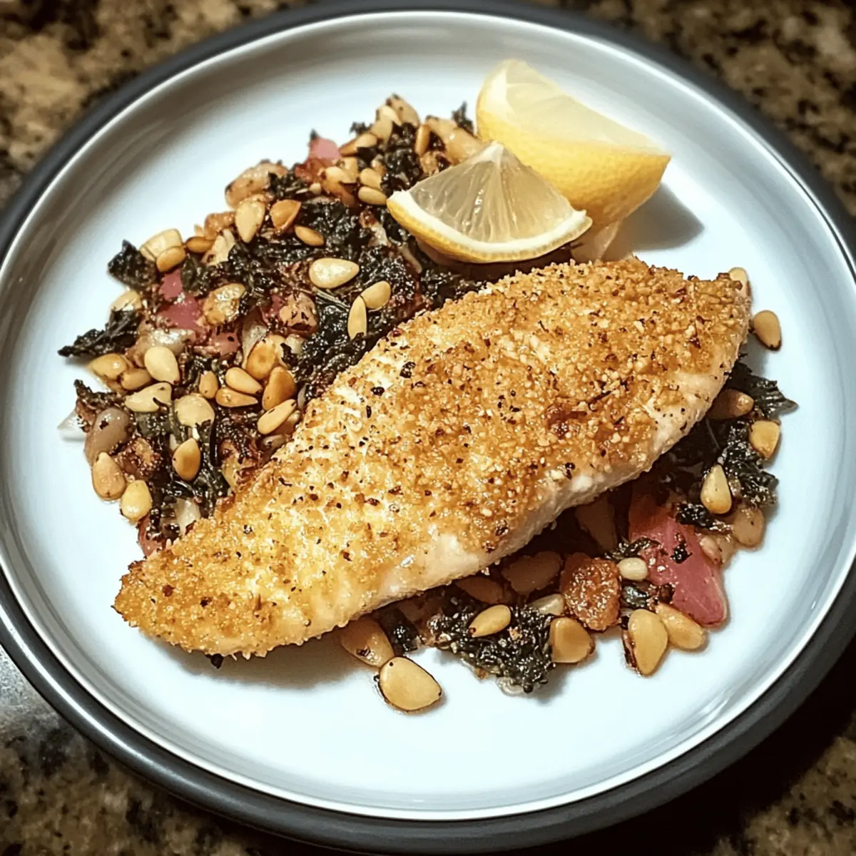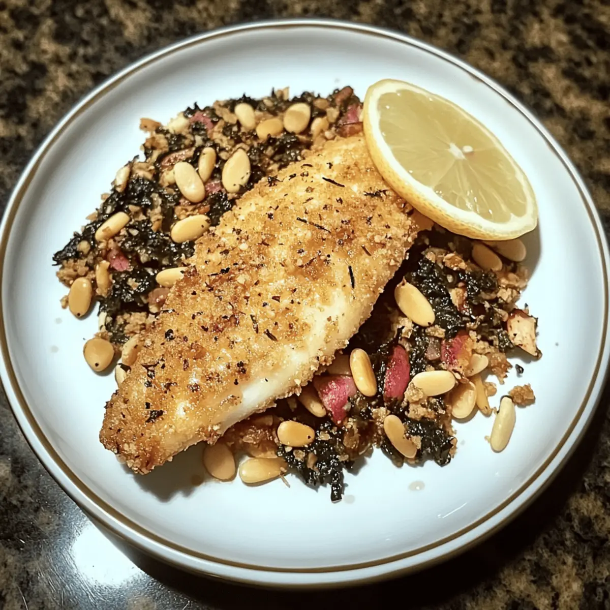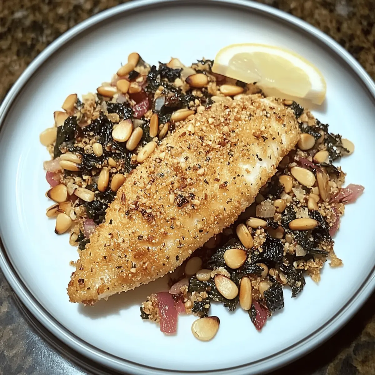 As I stood at the stove, the sweet aroma of toasted pine nuts wafted through the air, taking me back to sunny afternoons spent marveling at our family’s cherished recipes. Today, I invite you to embark on your own culinary expedition with my Pine Nut Encrusted Catfish—a dish that masterfully combines flaky fish with a delightfully crunchy, nutty crust. Not only is this recipe quick and easy, taking just 20 minutes to prepare, but it also transforms ordinary ingredients into something extraordinary. Plus, it’s versatile enough for any palate; feel free to switch out the pine nuts for walnuts or pecans to suit your taste. Curious to learn how to whip up this stunning dish that’s sure to impress at any gathering? Let’s dive in! Why Is This Catfish Recipe a Must-Try? Quick and Easy: In just 20 minutes, you can serve up a stunning dish that impresses both family and guests. Perfect for busy nights, this recipe allows you to enjoy gourmet flavors without the wait. Flavor Boost: The toasted pine nuts elevate your catfish to a whole new level of savory delight, while alternative nut options, like walnuts or pecans, add a unique twist to cater to your personal taste buds. Versatile Ingredients: Customize your meal effortlessly! Whether you crave a gluten-free option using almond flour or want to spice things up with cayenne, this recipe adapts beautifully to fit your needs. Crowd Pleaser: Serve this Pine Nut Encrusted Catfish at dinners or gatherings, and watch it disappear! Pair it with roasted vegetables or wild rice pilaf for a well-rounded feast. Effortless Preparation: Prepare the coating mix ahead of time, allowing you to whip up this dish any day of the week, even when time is tight! Want more seafood inspiration? Consider my Hawaiian Honey Pineapple Chicken or Baked Jamaican Pineapple Jerk Chicken for delightful variations! Pine Nut Encrusted Catfish Ingredients For the Crust • Pine Nuts – The star ingredient that gives a deliciously nutty flavor and crunch; feel free to substitute with walnuts or pecans for a delightful switch! • All-Purpose Flour – This helps bind the ingredients for a crispy coating; for gluten-free fans, almond flour works beautifully as well. • Cornmeal – Adds an extra layer of crunch and a unique flavor profile to the crust. • Cayenne Pepper – Infuses the dish with a gentle warmth; adjust based on your spice tolerance. • Ground Cumin – Provides an earthy flavor that deepens the taste of the crust. • Salt – Balances the flavors and enhances the natural savory notes of the dish. For Frying • Vegetable Oil – Necessary for frying to achieve that golden, crispy exterior; make sure to use enough oil for even cooking. Whether you’re trying the classic Pine Nut Encrusted Catfish or exploring variations, this collection of ingredients ensures a meal that’s quick, easy, and nothing short of spectacular! Step‑by‑Step Instructions for Pine Nut Encrusted Catfish Step 1: Toast Pine Nuts In a medium skillet over medium heat, add the pine nuts and toast them for about 2 minutes, stirring frequently, or until they turn a golden brown. Keep a close eye on them to avoid burning; the aroma will be nutty and inviting. Once toasted, remove them from heat and allow to cool completely. Step 2: Prepare Coating Next, grind the cooled pine nuts in a spice grinder until finely ground, resembling a coarse flour. In a mixing bowl, combine the ground pine nuts with all-purpose flour, cornmeal, cayenne pepper, ground cumin, and salt. Stir the mixture until well combined, ensuring an even distribution of all ingredients for the Pine Nut Encrusted Catfish. Step 3: Dredge Catfish Coat each catfish fillet in the pine nut mixture, ensuring to press gently on the fish to help the crust adhere nicely. Make sure to cover all sides, creating a thick layer on each fillet. This step is crucial as it gives your Pine Nut Encrusted Catfish that delightful crunch everybody loves. Step 4: Fry Catfish Heat about ½ inch of vegetable oil in a sauté pan over medium-high heat. Once the oil shimmers and reaches about 350°F (175°C), carefully add the catfish fillets. Fry each for 4-5 minutes on one side, until perfectly golden and crispy, then flip and cook for an additional 4-5 minutes on the other side. Step 5: Drain Once the catfish fillets are golden and crispy, transfer them onto a wire rack set over a baking sheet to drain excess oil. This keeps the crust crunchy and prevents sogginess, ensuring that every bite of your Pine Nut Encrusted Catfish is satisfying. Step 6: Serve Serve the Pine Nut Encrusted Catfish immediately, optionally garnished with fresh lemon wedges or a zesty cilantro-lime sauce for an extra burst of flavor. Pair it with your favorite sides like wild rice pilaf or a refreshing salad for a complete, delicious meal. Expert Tips for Pine Nut Encrusted Catfish Perfect Toasting: Ensure the pine nuts are perfectly toasted but not burned; keep them moving in the skillet for uniform browning and enhanced flavor. Coating Consistency: Press the coating firmly onto the catfish to ensure it sticks well during frying, creating that sought-after crunchy texture. Oil Temperature: Maintain oil temperature at around 350°F (175°C) for optimal frying. Use a thermometer to avoid undercooked or overly greasy catfish. Batch Frying: Avoid overcrowding the pan; fry the fillets in batches. This allows for even cooking and prevents sogginess in your Pine Nut Encrusted Catfish crust. Leftover Storage: Store any leftover catfish in an airtight container in the refrigerator for up to 2 days, but it’s best enjoyed fresh for maximum crunch! Pine Nut Encrusted Catfish Variations Feel free to get creative and personalize this delicious dish to suit your taste buds! Nut Swap: Replace pine nuts with walnuts or pecans for a different nutty flavor. Each option brings its unique texture and taste. Crunch Factor: For an extra crunch, mix in crushed cornflakes with your coating. Th