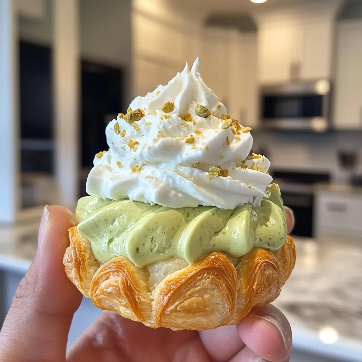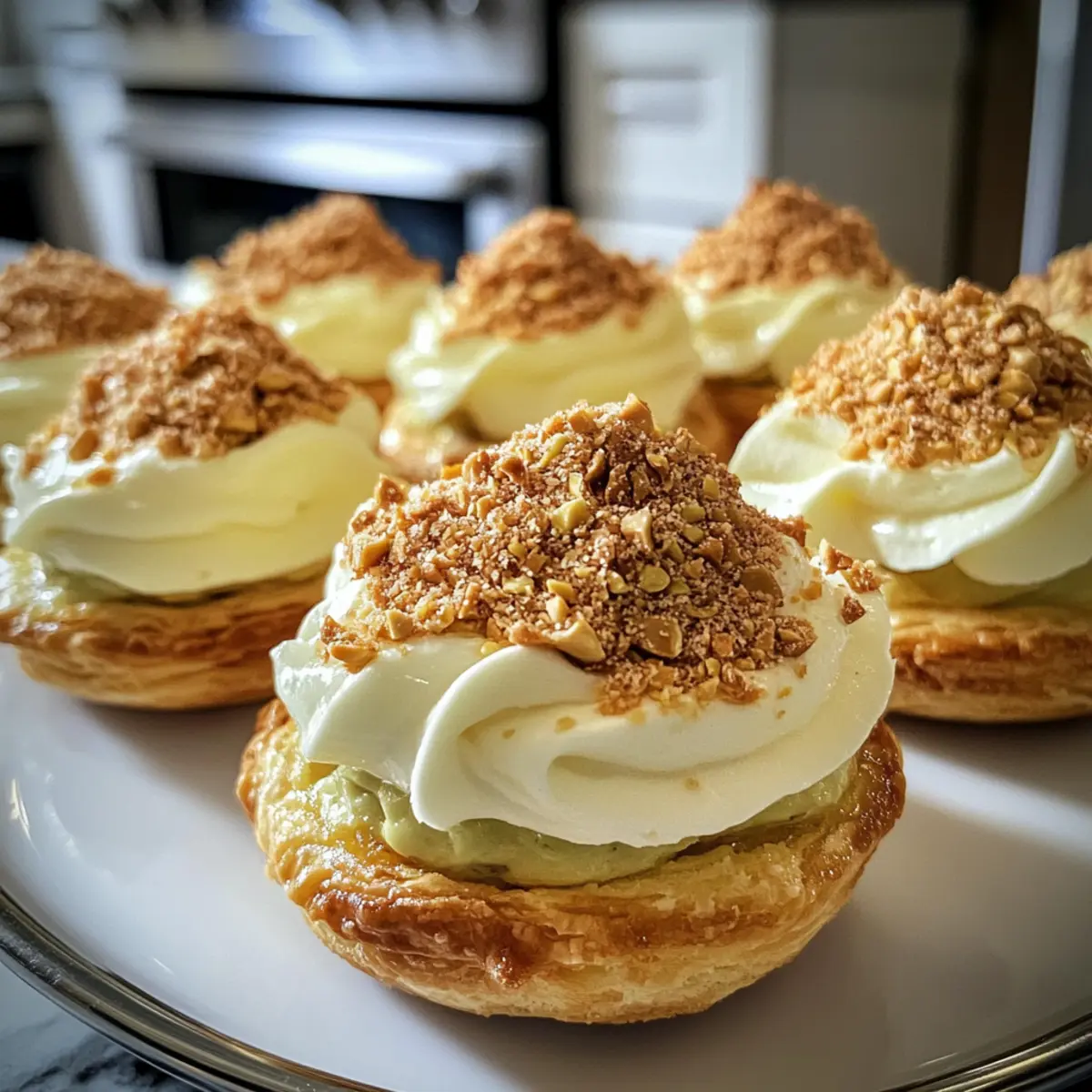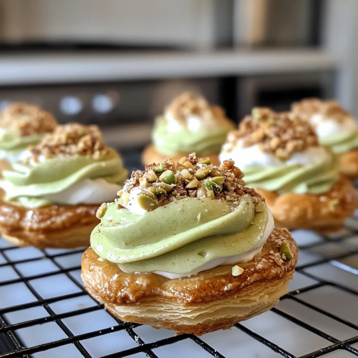 The moment I first tasted a Light Pistachio Cream Puff, it felt like indulging in a dreamy pastry cloud—light, airy, and utterly enchanting. This delightful dessert captures the rich, nutty essence of pistachios harmoniously blended with a silky pistachio praline and cloud-like whipped cream filling. Perfect for those special occasions or just because you deserve a treat, these cream puffs are not only a showstopper but also surprisingly quick to whip up! With their elegant appearance and satisfying crunch, they are sure to impress anyone lucky enough to take a bite. Are you ready to elevate your dessert game and bring a touch of bakery magic to your kitchen? Why Are Pistachio Cream Puffs Special? Airy Delight: These cream puffs are as light as a cloud, making them a perfect end to any meal. Rich Flavor: The pistachio praline filling elevates the classic cream puff to new heights, combining nutty profiles with luscious cream. Easy to Make: With just a few simple ingredients, you’ll create a show-stopping dessert that impresses without the fuss! Versatile Option: Feel free to customize the filling; try a zingy lemon curd or the decadent Garlic Butter Beef as a fun twist on tradition. Perfect for Gatherings: No one can resist these beauties at parties, and they’re a great way to bring homemade elegance to your dessert table. Gourmet Appeal: With masterful French roots, they’re chic enough for special events yet approachable for any home cook. Pistachio Cream Puff Ingredients For the Choux Pastry Whole Milk – Provides moisture and richness in the choux paste; crucial for a light texture. Unsalted Butter – Contributes to fat content for a tender pastry; can be substituted with salted butter (omit additional salt). Salt – Enhances flavor; optional if using salted butter. All-Purpose Flour – The base for the choux pastry that gives structure; using unbleached flour yields the best results. Eggs – Adds structure and moisture; ensure they are at room temperature for proper emulsification. Roasted Pistachios – Imparts flavor, color, and texture to the pastry shells; toast before grinding to enhance flavor. For the Toppings and Filling Powdered Sugar – Sweetens the shell and aids in browning when dusting; optional for a less sweet crust. Pistachio Praline – Provides a rich, nutty layer inside the cream puff; requires a separate recipe to prepare. Pistachio Whipped Cream – Light and creamy filling that pairs perfectly with the praline; can be replaced with vanilla whipped cream for variety. These luscious pistachio cream puffs are a perfect way to indulge your dessert dreams! Step‑by‑Step Instructions for Light and Airy Pistachio Cream Puffs Step 1: Preheat the Oven Begin by preheating your oven to 400°F (200°C) and lining two baking sheets with parchment paper. This preparation ensures your pastry shells will have the perfect crispy texture as they bake. Make sure to have everything ready nearby so that you can effortlessly move from one step to the next while making these delightful pistachio cream puffs. Step 2: Prepare the Choux Pastry In a medium saucepan, combine 1 cup of whole milk, 1/2 cup unsalted butter, and a pinch of salt. Heat over medium heat until the mixture reaches a rolling boil, allowing the butter to completely melt. This step is crucial for creating the tender choux pastry base that will cradle the rich pistachio filling you will make later. Step 3: Incorporate the Flour Remove the saucepan from heat and quickly add 1 cup of all-purpose flour, stirring vigorously with a wooden spoon. Continue mixing until the dough pulls away from the sides of the pan and forms a smooth ball, about 1-2 minutes. This process helps to create the perfect texture for your pastry shells that will puff beautifully in the oven. Step 4: Add the Eggs Allow the dough to cool slightly for about 5 minutes before incorporating the eggs. Add 4 large eggs one at a time, mixing thoroughly after each addition until the dough is thick and glossy. The dough should be smooth and hold its shape. This step is critical in achieving the airy quality of your pistachio cream puffs when they bake. Step 5: Mix in Ground Pistachios Once the dough is ready, fold in 1/2 cup of finely ground roasted pistachios until evenly distributed. This will infuse your choux pastry with that delightful nutty flavor, enhancing the overall taste of your light and airy pistachio cream puffs. Make sure to mix until well combined for the perfect consistency. Step 6: Pipe the Dough Using a piping bag fitted with a large round tip, pipe 2-inch circles onto the prepared baking sheets, leaving space between each puff. Aim for uniformity in size for even baking. If the tops are spiked, you can smooth them gently with a wet finger. This ensures that your pastries will have a lovely, rounded shape when baked. Step 7: Dust with Sugar Lightly dust the piped pastry shells with powdered sugar, which will help them achieve a beautiful golden color and add a hint of sweetness to the crispy exterior. Make sure to dust evenly for a lovely finish. This extra touch enhances both the appearance and taste of your pistachio cream puffs. Step 8: Bake the Cream Puffs Place the cream puffs in the preheated oven and bake for 10 minutes at 400°F (200°C). Then, reduce the temperature to 375°F (190°C) and continue baking for an additional 12 minutes. The pastries should puff up and turn golden brown. Avoid opening the oven door during baking, as this can cause them to collapse. Step 9: Cool the Pastry After baking, turn off the oven and leave the cream puffs inside for 20 minutes with the door slightly ajar. This cooling method will help prevent them from collapsing, ensuring each pastry retains its airy structure. Remember, patience is key as they finish their transformation into light and delicious desserts. Step 10: Fill with Pistachio Praline and Cream Once cooled, carefully slice the tops off the cream puffs and fill each with t