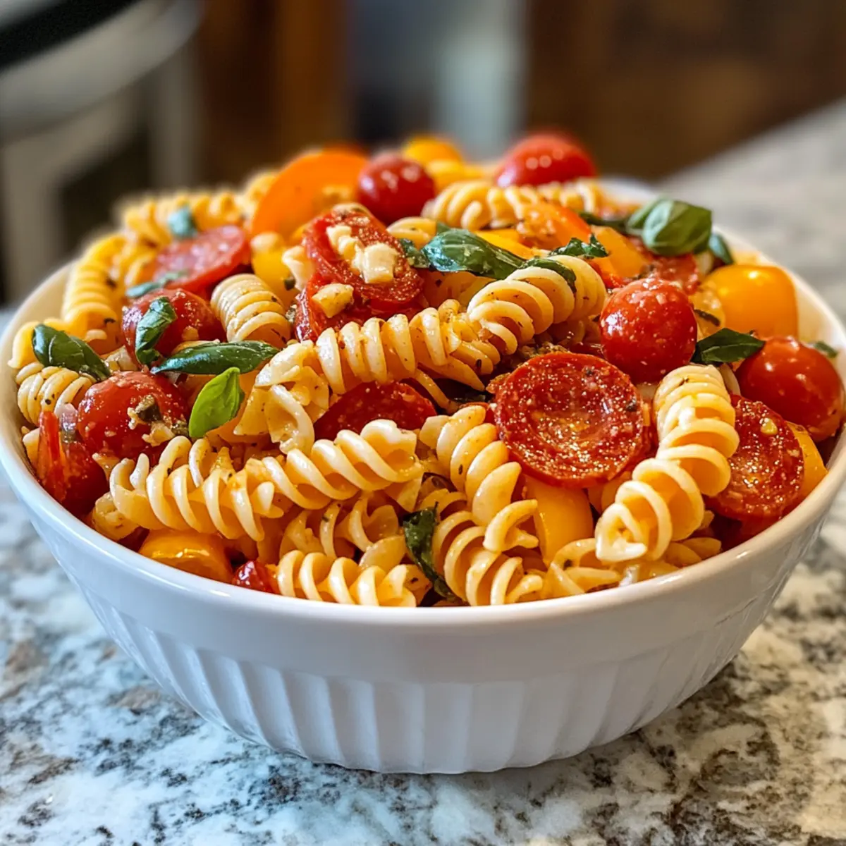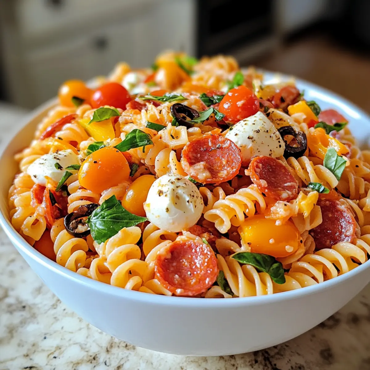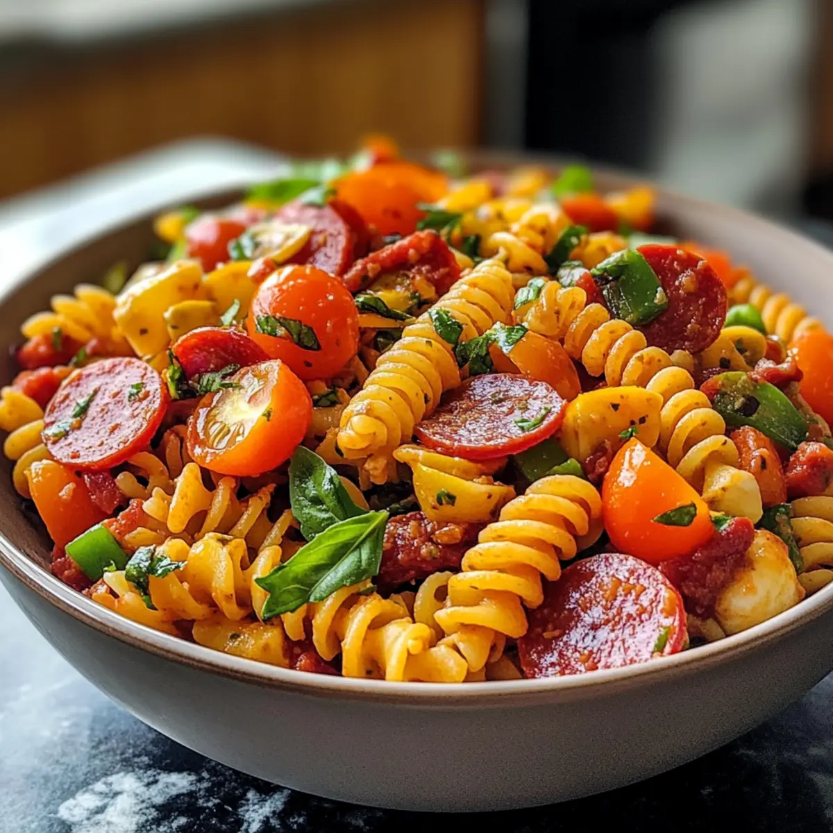 This Pizza Pasta Salad is a quick, delicious blend of rotini, pepperoni, and mozzarella, perfect for lunch or dinner.