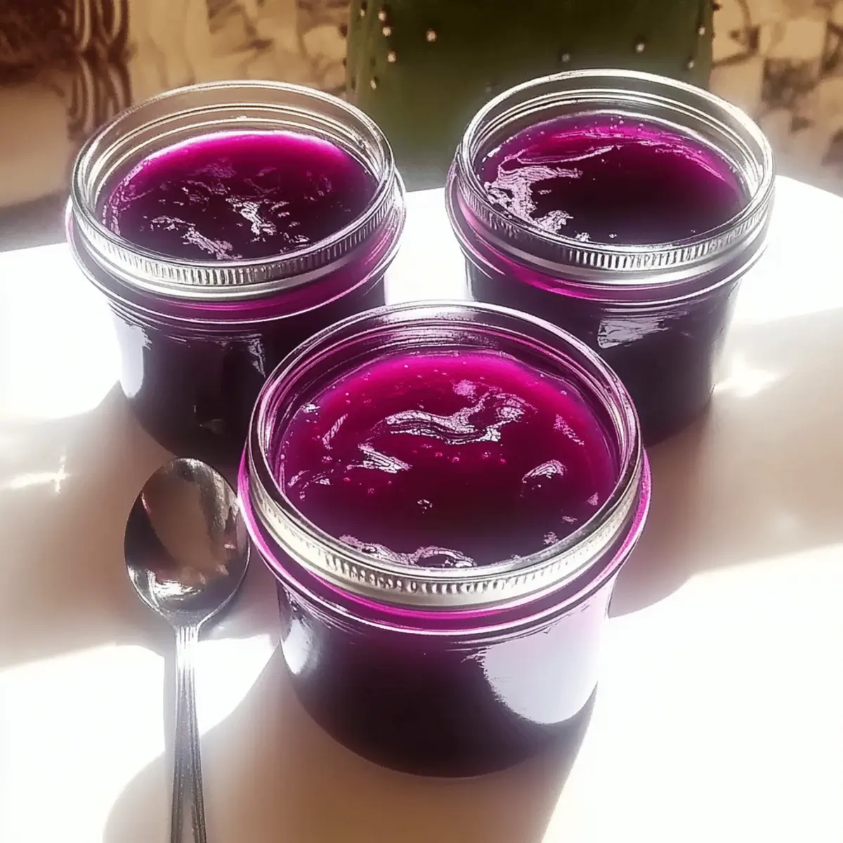 A vibrant magenta jar of homemade jelly gleamed like a jewel on my kitchen counter, begging to be tasted. That’s when I realized I could transform that prickly pear fruit, known for its quirky appearance, into something truly exceptional—Prickly Pear Cactus Jelly! Not only does it brighten up breakfast toast and charcuterie boards, but it’s also versatile enough to accommodate a low-sugar diet without sacrificing its tantalizing sweet-tangy taste. This delightful preserve captures the spirit of Southwestern cuisine, making it perfect for impressing guests or enjoying on quiet mornings. With simple ingredients and quick prep time, it’ll soon become a cherished staple in your kitchen. Are you ready to dive into the delicious world of prickly pear jelly? Why is Prickly Pear Cactus Jelly special? Vibrant Color: This jelly boasts a stunning magenta hue, making your breakfast or charcuterie spread a feast for the eyes. Sweet-Tangy Delight: A perfect balance of sweetness and tang, it adds a unique twist to traditional preserves. Customizable Sweetness: Easily adjust the recipe for lower sugar preferences, ensuring everyone can enjoy it without guilt. Southwestern Flair: Elevate your culinary repertoire with this distinctive jelly that captures the soul of Southwestern cuisine. Quick Prep Time: With simple and straightforward steps, you’ll be savoring this homemade delight in no time! For more ideas on using this jelly, check out our Serving Suggestions. Prickly Pear Cactus Jelly Ingredients For the Jelly Base Prickly Pear Puree – Essential for that signature sweet-tangy flavor; be sure to use only ripe and unblemished pears. Sugar – Standard ingredient for sweetness and preservation; feel free to reduce for a lower-sugar version without losing taste. Lemon Juice – Freshly squeezed to enhance flavors and balance the sweetness beautifully. Low-Sugar Pectin – Crucial for achieving the perfect jelly consistency; a must-have for lower sugar recipes. For Serving Suggestions Warm Biscuits – A delightful pairing that enhances the jelly’s vibrant flavor profile. Charcuterie Board Accents – Perfect for adding a colorful and flavorful touch to your cheese platters. Step‑by‑Step Instructions for Prickly Pear Cactus Jelly Step 1: Prepare Equipment Begin by sterilizing your jars to ensure the longevity of your Prickly Pear Cactus Jelly. Place clean glass jars into a water bath canner, submerging them fully. Heat the water to a steady 200°F and let the jars sit for at least 10 minutes. This vital step will prevent spoilage and ensure a safe seal once your jelly is ready. Step 2: Clean and Prepare Pears Don your gloves to safely handle the prickly pears, avoiding any pesky spines. Rinse the ripe pears thoroughly, then cut them in half to scoop out the vibrant pulp. Blend this pulp until smooth, yielding approximately 4 cups of prickly pear puree. Set the puree aside while preparing the other ingredients, enjoying its stunning magenta color. Step 3: Combine Ingredients In a deep stock pot, carefully mix together your prickly pear puree, sugar, freshly squeezed lemon juice, and low-sugar pectin. Stir the mixture until it is fully combined with a bright, glossy appearance. Ensure there are no lumps from the pectin, as this will impact the jelly’s texture. This step is crucial for developing the delicious flavor of your Prickly Pear Cactus Jelly. Step 4: Cook Bring the mixture to a rolling boil over high heat, stirring frequently to prevent sticking. Once boiling, maintain that vigorous boil for about 4-5 minutes while monitoring the temperature closely. You’ll know it’s ready when the mixture reaches 220°F, and the bubbles appear thick and steady. This step activates the pectin, ensuring your jelly sets perfectly. Step 5: Jar the Jelly Using a ladle, carefully fill the sterilized jars with the hot jelly mixture, leaving about ½ inch of headspace at the top. Wipe any residue from the jar rims to ensure a good seal. Secure the lids tightly, but be cautious not to overtighten. This step prepares your Prickly Pear Cactus Jelly for the next phase of preservation. Step 6: Process Jars Place the filled jars back into the water bath canner, ensuring they are fully submerged. Process the jars for 10 minutes to create a vacuum seal that locks in the freshness and flavor of your jelly. Once completed, carefully remove the jars using jar tongs, placing them on a clean towel to cool. Listen for the satisfying “pop” of the lids sealing as they cool. Step 7: Cool and Store Allow the jars to cool at room temperature for several hours, ensuring they are completely sealed. Check the seals by pressing the center of each lid; if it doesn’t pop back, it’s sealed. Store the properly sealed jars in a cool, dark place for up to one year. Your Prickly Pear Cactus Jelly will be ready to brighten up your breakfasts and delights for many months ahead! Prickly Pear Cactus Jelly Variations Feel free to explore these delicious twists and substitutions that will elevate your homemade jelly to new heights! Lower Sugar: Reduce sugar amounts or substitute with a natural sweetener like agave or honey for a lighter version. Citrus Twist: Instead of lemon juice, try using fresh orange or lime juice to add a refreshing zing to your jelly. Spicy Kick: Add a pinch of cayenne pepper or finely chopped jalapeños to the mixture before boiling for a savory surprise. Enhancing your jelly has never been easier! Spice it up with a hint of heat, and let the vibrant flavors dance on your tongue. Herbal Infusion: Mix in fresh herbs such as mint or basil during the cooking process for a unique herbal note that complements the sweetness beautifully. Berry Blend: Combine prickly pear with other berry purees like raspberry or blueberry for a multifaceted flavor experience that bursts with summer. Alcohol Boost: Add a splash of tequila or mezcal while cooking to infuse a daring twist that captures the essence of Southwester