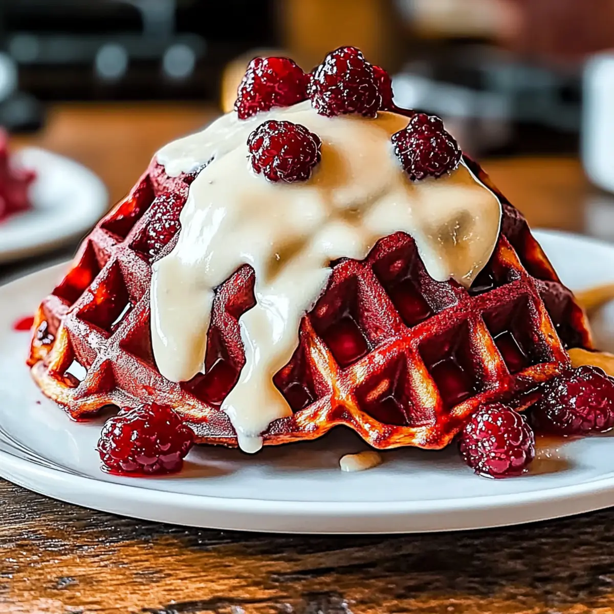 As I poured the vibrant red batter into my waffle iron, I could almost taste the excitement that was building in the kitchen. These Red Velvet Waffles with Cream Cheese Glaze are a feast for both the eyes and the palate, turning a regular breakfast into a celebration. With their lovely red hue and fluffy, cake-like texture, these waffles aren’t just visually stunning—they’re incredibly easy to whip up in under 20 minutes, no mixer required! Perfect for special occasions or just a weekend treat, this vegetarian-friendly recipe will impress anyone at the table. Do you want to transform your brunch routine into something unforgettable? Let’s dive into this deliciously fun adventure! Why are Red Velvet Waffles irresistible? Visual Appeal: The vibrant red color makes these waffles a show-stopping addition to any brunch table. Easy Prep: You can whip up this no-mixer recipe in under 20 minutes, saving time without sacrificing flavor! Fluffy Texture: Each bite delivers a light, cake-like texture that’s soft on the inside and crisp on the outside. Creamy Indulgence: Topped with a luxurious cream cheese glaze, every forkful is rich and satisfying. Versatile Options: Feel free to adapt this recipe—swap in matcha for a “green velvet” twist or use plant-based ingredients to suit your dietary needs. You can also check out these stunning ideas for festive treats like Red White Blue Cheesecake Salad or Red White Blue Crinkle Cookies. Red Velvet Waffle Ingredients • Get ready to make delicious red velvet waffles! For the Waffles All-Purpose Flour – Provides structure and stability; substitute with whole wheat flour for a healthier option. Granulated Sugar – Sweetens the batter; brown sugar can be used for a deeper flavor. Cocoa Powder – Adds a touch of chocolate richness; use unsweetened for the best results. Baking Powder – Acts as a leavening agent to ensure fluffiness in the waffles. Salt – Enhances overall flavor and balances sweetness for the perfect bite. Milk – Serves as the liquid base; any dairy or plant-based milk works well. Eggs – Contributes richness and binds the batter; use flax eggs for a vegan option. Vegetable Oil or Melted Coconut Oil – Adds moisture; melted butter can also enhance flavor. Liquid Red Food Coloring – Essential for achieving the iconic red hue; use generously to get that vibrant color. Vanilla Extract – Adds aromatic sweetness, enhancing the overall flavor of the wafers. For the Cream Cheese Glaze Cream Cheese – The base for the glaze, providing a rich and creamy texture. Milk (for glaze) – Helps achieve the desired consistency of the glaze; adjust as needed. Confectioner’s Sugar – Sweetens and thickens the cream cheese glaze, creating that delightful topping. These Red Velvet Waffle Ingredients will transform your breakfast into a colorful feast! Step‑by‑Step Instructions for Indulgent Red Velvet Waffles with Cream Cheese Glaze Step 1: Prepare Dry Ingredients In a large mixing bowl, combine 1 cup of all-purpose flour, 2 tablespoons of granulated sugar, 1 tablespoon of unsweetened cocoa powder, 2 teaspoons of baking powder, and a pinch of salt. Whisk these dry ingredients thoroughly until they’re well blended, allowing the cocoa powder to distribute evenly. This step sets the foundation for your Red Velvet Waffles’ delicious flavor and fluffy texture. Step 2: Mix Wet Ingredients In another bowl, whisk together 1 cup of milk, 1/4 cup of vegetable or melted coconut oil, 2 large eggs (or flax eggs for a vegan option), 2 tablespoons of liquid red food coloring, and 1 teaspoon of vanilla extract. Blend these wet ingredients smoothly until combined, creating a vibrant mixture that will bring your waffles to life. This color is key for the signature look of your Red Velvet Waffles. Step 3: Combine Mixtures Gently pour the wet ingredients into the bowl containing the dry ingredients. Stir carefully using a spatula or wooden spoon until just combined; it’s important to avoid overmixing to keep your waffles light and fluffy. The batter will have a thick consistency, and small lumps are perfectly fine. This harmonious blend will ensure the rich color and delightful texture of the waffles. Step 4: Preheat Waffle Iron While your batter rests for a moment, preheat your waffle iron according to the manufacturer’s instructions. If needed, lightly grease the iron with cooking spray or melted butter to prevent the waffles from sticking. A properly preheated waffle iron is essential for achieving that perfect crispy exterior while keeping the inside fluffy, making your Red Velvet Waffles irresistible. Step 5: Cook Waffles Once the waffle iron is hot, pour about ½ cup of the batter into the center and close the lid. Cook the waffles for about 2-3 minutes, or until the steam has subsided and the waffles are golden brown. Carefully remove them with a fork, allowing the waffles to cool slightly on a wire rack to maintain their crisp texture. This step ensures you’ll have beautifully cooked Red Velvet Waffles ready for glazing. Step 6: Make Glaze In a microwave-safe bowl, soften 4 ounces of cream cheese by microwaving it for 15-20 seconds. Mix in 2-3 tablespoons of milk and 1/2 cup of confectioner’s sugar until you achieve a smooth, creamy glaze. Adjust the consistency with more milk if needed to make it pourable. This luscious cream cheese glaze will perfectly top your warm Red Velvet Waffles. Step 7: Serve Stack your fluffy Red Velvet Waffles on a plate and generously drizzle the cream cheese glaze over the top. For an extra touch of freshness, consider garnishing with berries or a dollop of whipped cream. Serve them warm to relish the delightful combination of flavors and textures, making every bite a special treat for your breakfast or brunch. What to Serve with Red Velvet Waffles Transform your brunch gathering into an unforgettable experience with these delightful pairing suggestions! Fresh Berries: A burst of sweet and tart 