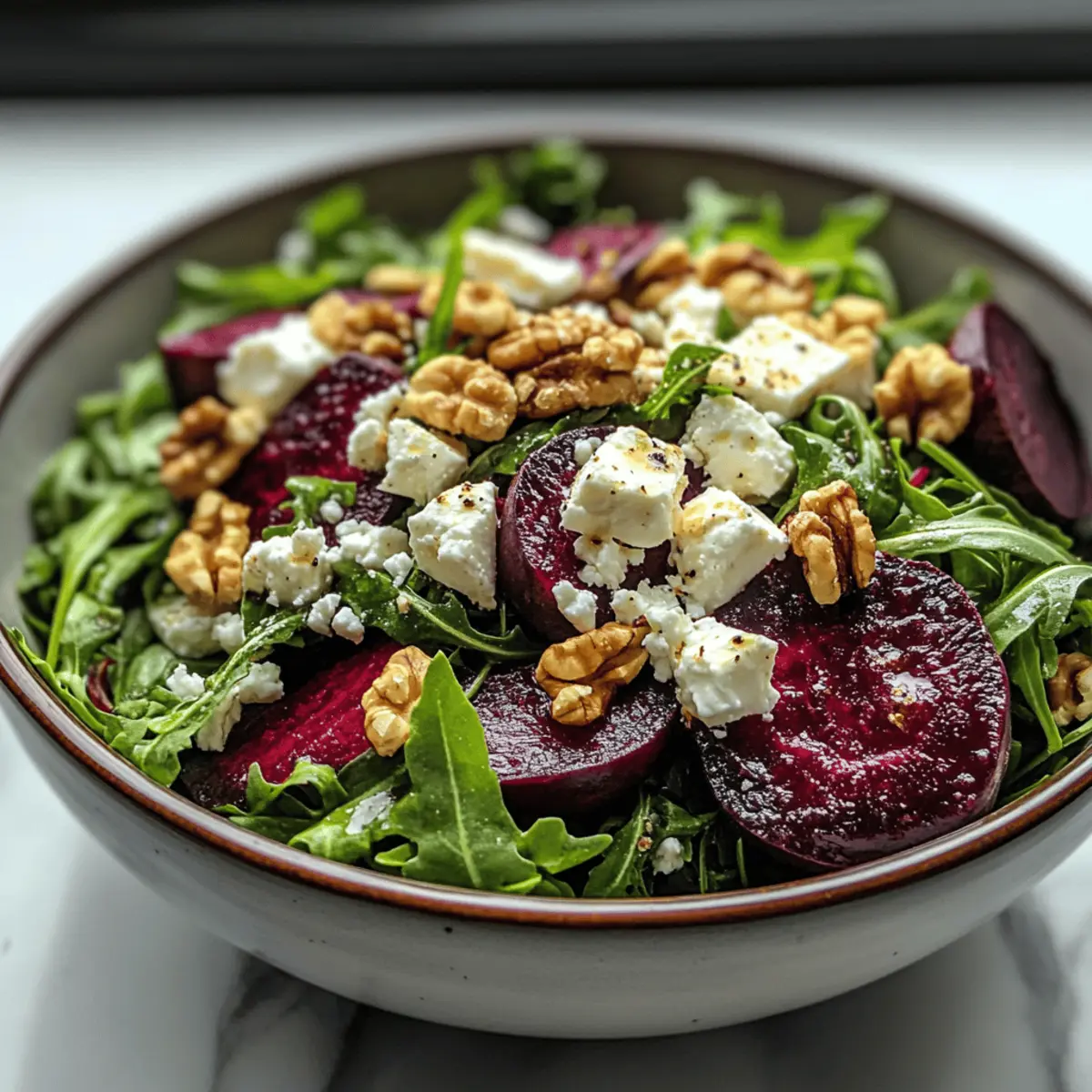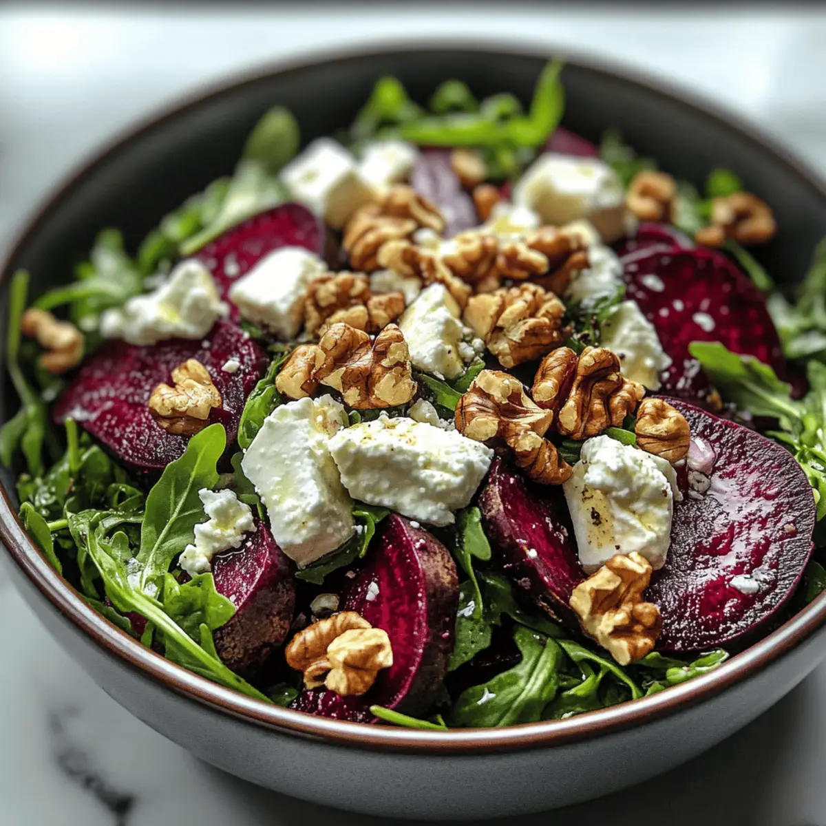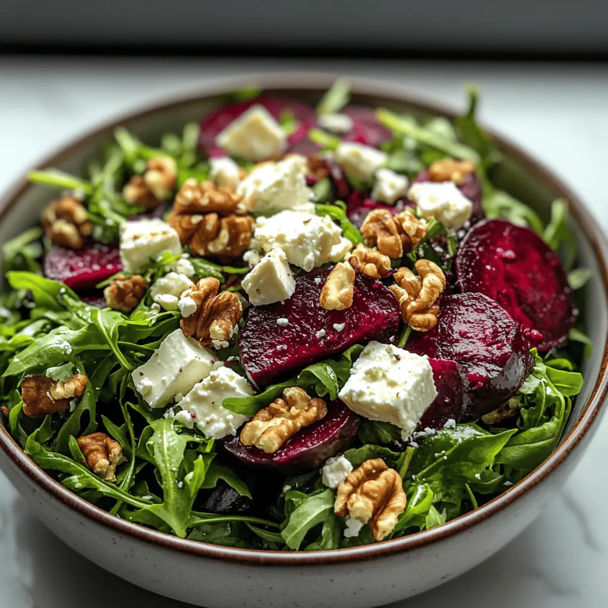 With a vibrant splash of color on your plate, the Roasted Beet & Arugula Salad with Feta and Walnuts is as much a feast for the eyes as it is for the palate. This nutrient-packed delight perfectly marries the earthy sweetness of roasted beets with the peppery bite of arugula, delivering a joyful crunch from the walnuts and a creamy finish from the feta cheese. Not only is this salad an effortlessly elegant dish, but it’s also an excellent option for meal prep, making healthy eating a daily joy rather than a chore. Whether you’re serving it as a light main course or a fresh side, this salad will not only satisfy your cravings but also align beautifully with your clean eating goals. Ready to elevate your weeknight dinners? Let’s dive into this refreshing recipe! Why is this salad a must-try? Vibrant Colors: The stunning red beets paired with green arugula create a beautiful presentation, perfect for impressing guests or brightening up a lunch. Nutrient-Dense: Packed with vitamins A, C, and fiber, this salad is a powerhouse of nutrients that supports your clean eating lifestyle. Crowd-Pleaser: The combination of flavors—earthy, peppery, creamy—makes it a hit at gatherings, much like a classic Mango Avocado Salad or Mojito Fruit Salad. Easy Prep: With simple ingredients and straightforward steps, it’s perfect for meal prep, saving you time during busy weeks. Versatile Delight: Feel free to customize it with seasonal fruits or nuts, turning this into a fresh creation that fits your taste. Enjoy as a main or side dish! Roasted Beet & Arugula Salad Ingredients • Fresh and vibrant ingredients for a delightful dish! For the Salad Beets – Sweetness and earthiness; can be pre-roasted and stored in an airtight container for up to 4 days. Arugula – Peppery greens that complement the beets; spinach can be used for a milder taste. Feta Cheese – Offers creamy texture and saltiness; goat cheese can replace feta if desired. Walnuts – Provides crunch and healthy fats; pecans or sunflower seeds make for tasty alternatives. For the Dressing Extra Virgin Olive Oil – Base for salad dressing, adding richness; avocado oil can be used for a neutral flavor. Balsamic Vinegar – Adds tanginess to the dressing; red wine vinegar can be substituted for a different acidity profile. Dijon Mustard – Balances flavors and adds depth; yellow mustard can be used, just adjust the quantity to taste. Honey – Adds sweetness to balance acidity; maple syrup serves as a great vegan substitute. Salt and Black Pepper – Enhances overall flavor of the dish; adjust to personal preference. Elevate your dining experience with this Roasted Beet & Arugula Salad, perfect for anyone craving clean and wholesome flavors! Step‑by‑Step Instructions for Roasted Beet & Arugula Salad Step 1: Preheat the Oven Begin by preheating your oven to 400°F (200°C), creating a warm environment for roasting. This temperature is perfect for caramelizing the natural sugars in the beets, enhancing their sweetness. While the oven heats up, gather your baking sheet and parchment paper for easy cleanup. Step 2: Prepare the Beets Next, scrub, peel, and cut your beets into bite-sized chunks for even roasting. Ensure the pieces are roughly the same size for consistent cooking. Place the beet chunks in a mixing bowl and toss them with a drizzle of extra virgin olive oil and a sprinkle of sea salt, coating them thoroughly. Step 3: Roast the Beets Spread the coated beet chunks in a single layer on the prepared baking sheet. Roast in the preheated oven for about 25-30 minutes, flipping them halfway through to ensure they caramelize evenly. They should be tender and slightly charred when done, easily pierced with a fork for the best texture in your Roasted Beet & Arugula Salad. Step 4: Toast the Walnuts While the beets are roasting, turn your attention to the walnuts. In a dry skillet over medium heat, add the walnuts, stirring continuously for about 3-5 minutes until they turn fragrant and lightly browned. This step elevates the nutty flavor and adds a delightful crunch, perfect for topping your salad. Step 5: Make the Dressing In a small mixing bowl, whisk together olive oil, balsamic vinegar, Dijon mustard, honey, salt, and black pepper to create a smooth dressing. Adjust the sweetness and acidity to your taste, ensuring it balances the earthy and peppery flavors of the Roasted Beet & Arugula Salad well. Set aside to let the flavors meld. Step 6: Assemble the Salad In a large salad bowl, combine the fresh arugula with half of the prepared dressing. Gently toss until the arugula leaves are evenly coated. This creates a flavorful base that complements the roasted ingredients, ensuring every bite of the Roasted Beet & Arugula Salad is deliciously seasoned. Step 7: Add Remaining Ingredients Top the dressed arugula with the roasted beet chunks, crumbled feta cheese, and toasted walnuts. If desired, you can also layer in thinly sliced red onions for extra zest. This colorful combination not only adds texture but also makes the salad visually appealing, showcasing the vibrant colors of the beets and greens. Step 8: Final Touches Before serving, drizzle the remaining dressing over the assembled salad for an added burst of flavor. If you prefer, serve the extra dressing on the side so everyone can adjust to their liking. This final touch enhances the overall taste of your Roasted Beet & Arugula Salad, making it a true crowd-pleaser. How to Store and Freeze Roasted Beet & Arugula Salad Fridge: Store the assembled salad in an airtight container for up to 2 days. Keep the dressing separate to prevent wilting of the arugula. Freezer: It’s not recommended to freeze the Roasted Beet & Arugula Salad as the texture of the ingredients will be compromised once thawed. Leftover Beets: Roasted beets can be kept in the fridge for up to 4 days, stored in an airtight container, making them great for future salads. Reheating: If you’ve stored leftover roast