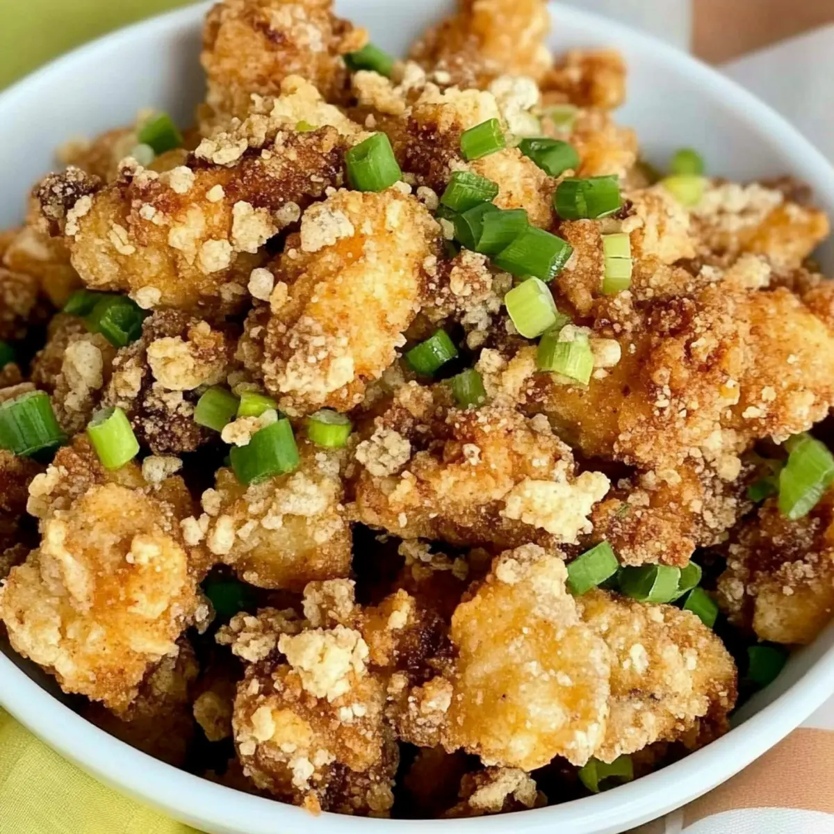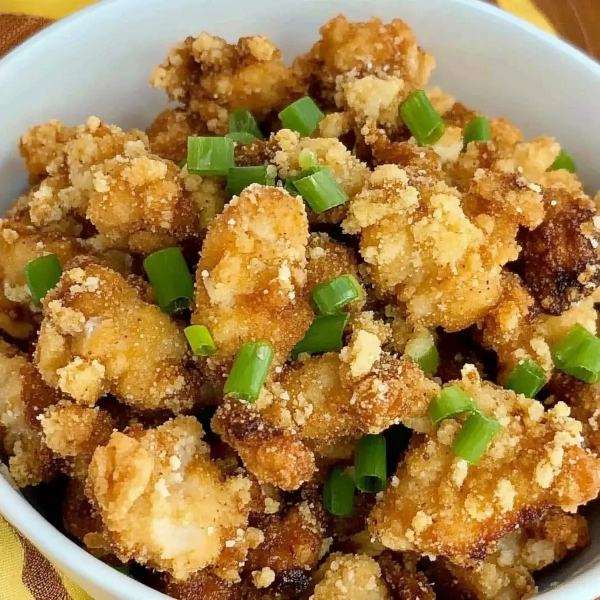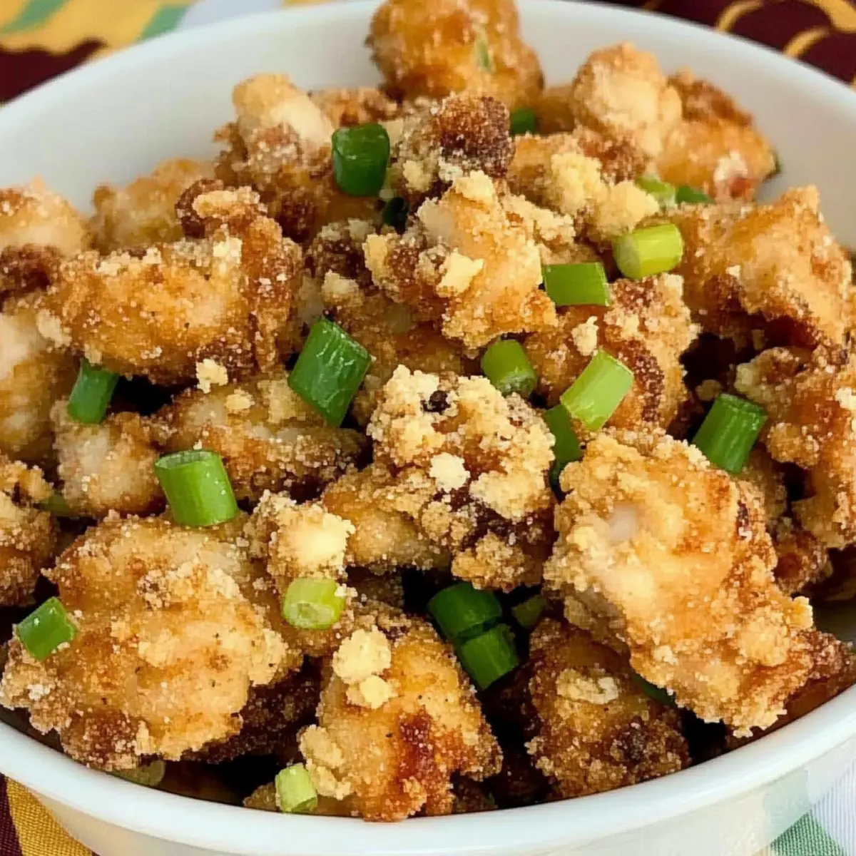 As the sizzling sounds fill my kitchen, I can practically taste the nostalgia of my favorite Chinese takeout. That’s right, I’m talking about Crispy Salt and Pepper Chicken, the homemade twist on a classic dish that never fails to impress. With its crunchy exterior and tender, juicy chicken, this quick and easy recipe not only satisfies your cravings but also takes less time than waiting for delivery. Perfect for those weeknights when you want comfort food without the hassle, this dish is an effortless crowd-pleaser. Whether you’re planning a cozy dinner for one or feeding a hungry family, you’ll love how simple and rewarding this homemade version can be. Are you ready to bring that amazing takeout flavor into your own kitchen? Let’s dive into making your new favorite recipe! Why is this Salt and Pepper Chicken a must-try? Irresistible Crunch: The cornstarch coating gives this dish a delightful crispy texture that will have everyone coming back for seconds. Homemade Goodness: Say goodbye to takeout! This simple recipe brings the restaurant experience straight to your kitchen. Flavor Explosion: Seasoned to perfection with garlic and a touch of brown sugar, each bite bursts with delicious flavor. Quick Preparation: With an easy marinade and fast frying, you can whip this up in no time, making it perfect for busy weeknights. Versatile Options: Make it your own by adding chili flakes or trying shrimp instead of chicken. This dish adapts to your cravings! Family Favorite: Everyone will love it! Serve alongside steamed rice or stir-fried veggies for a complete meal that pleases all ages. Check out Southwest Chicken Wraps for another delicious meal idea! Salt and Pepper Chicken Ingredients For the Marinade Garlic – adds aromatic richness; fresh minced garlic gives the best flavor. Brown Sugar – balances the savory flavors with a hint of sweetness; use light or dark based on your preference. Water – helps dissolve the marinade ingredients and tenderize the chicken. Rice Wine – contributes a unique depth of flavor; can be substituted with sherry if needed. Baking Soda – helps to tenderize the chicken, ensuring it’s juicy after frying. Soy Sauce – infuses the chicken with savory umami; low-sodium options are available if you’re watching salt intake. For the Chicken Chicken Breast – the main protein; cut into bite-sized pieces for even cooking and maximum crispiness. Egg – serves as a binding agent; helps the cornstarch adhere to the chicken for that perfect crunch. For the Coating Cornstarch – gives the chicken its crispy outer coating; for a twist, try potato starch for different texture. Vegetable Oil – necessary for frying; ensure it’s a high smoke point oil for optimal crispiness. For Garnish Green Onions – adds a pop of color and a mild onion flavor; sliced thinly for the best presentation. Salt & Pepper – essential seasonings that enhance the overall flavor of the Salt and Pepper Chicken; adjust to your taste. Step‑by‑Step Instructions for Crispy Salt and Pepper Chicken Step 1: Prepare the Marinade In a large mixing bowl, combine minced garlic, brown sugar, water, rice wine, baking soda, and soy sauce. Whisk until the sugar dissolves completely, creating a cohesive marinade. This flavor-rich mix will tenderize the chicken while infusing it with delightful savory notes. Step 2: Marinate the Chicken Add the bite-sized chicken breast pieces to the marinade, ensuring each piece is well-coated. Cover the bowl with plastic wrap and let it marinate at room temperature for 30 minutes, allowing the flavors to seep into the chicken for a succulent result. Step 3: Prepare Egg Coating While the chicken is marinating, crack an egg into a separate bowl and beat it lightly until well blended. This will act as a protective layer, helping the cornstarch adhere to the chicken, ensuring that every piece turns out crispy and delicious. Step 4: Coat the Chicken After marinating, drain off any excess liquid from the chicken. Dip each marinated piece into the beaten egg, making sure it’s fully coated. Then, roll the chicken pieces in cornstarch, ensuring an even dry coating that will create a perfect crispy exterior when fried. Step 5: Heat the Oil In a deep wok or frying pan, pour enough vegetable oil to fully submerge the chicken, about 2 inches deep. Heat the oil over medium-high heat until it reaches approximately 350°F (175°C). To test readiness, dip a small amount of cornstarch into the oil; it should sizzle immediately. Step 6: Fry Chicken Carefully add the chicken pieces in batches to avoid overcrowding, frying them for about 5-7 minutes or until they turn a gorgeous golden brown. Flip occasionally using a slotted spoon to ensure even cooking and crispiness. The chicken should be fully cooked through, with a crunchy exterior. Step 7: Drain Excess Oil Once cooked, use a slotted spoon to remove the crispy chicken from the oil and place it on a plate lined with paper towels. This will help absorb any excess oil, keeping your Salt and Pepper Chicken nice and crispy while retaining its juicy interior. Step 8: Finish and Serve Reheat the wok briefly and add the drained chicken back in, tossing with a generous sprinkle of salt, pepper, and sliced green onions for a burst of fresh flavor. Serve hot alongside steamed rice or sautéed vegetables, and enjoy your homemade Salt and Pepper Chicken! How to Store and Freeze Salt and Pepper Chicken Fridge: Store leftover Salt and Pepper Chicken in an airtight container in the refrigerator for up to 2 days to maintain freshness and flavor. Freezer: If you want to save it for later, freeze the chicken in a single layer on a baking sheet before transferring to an airtight container; it can last up to 2 months. Reheating: For the best texture, reheat the chicken in an air fryer at 350°F (175°C) for about 5-8 minutes to restore its crispiness without making it soggy. Defrosting: When ready to enjoy, let frozen chicken thaw in th