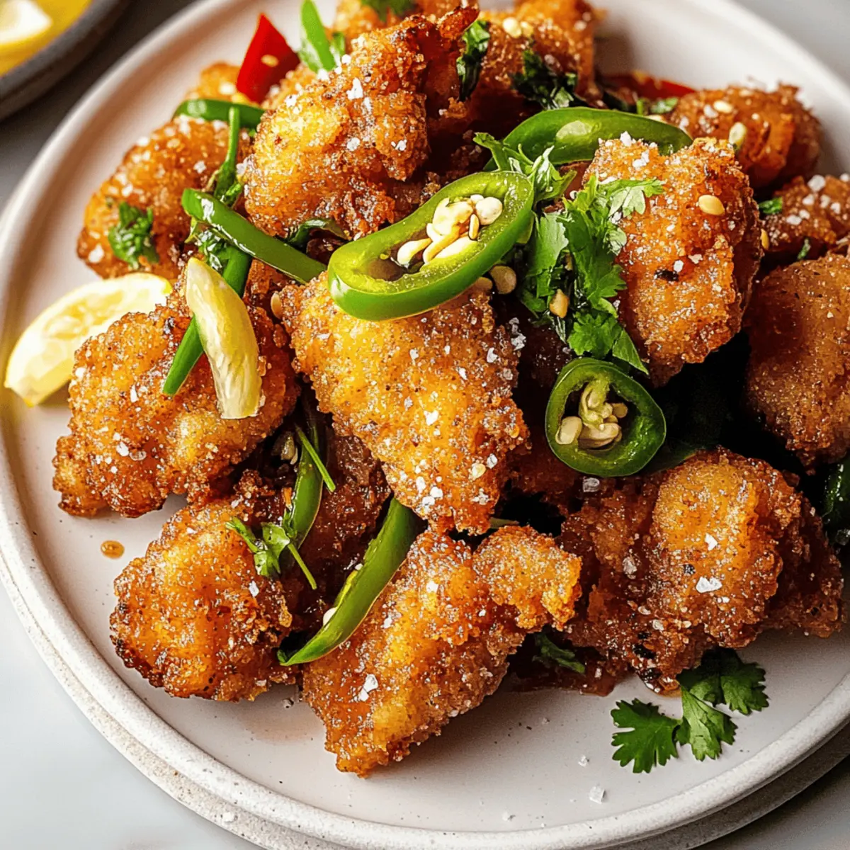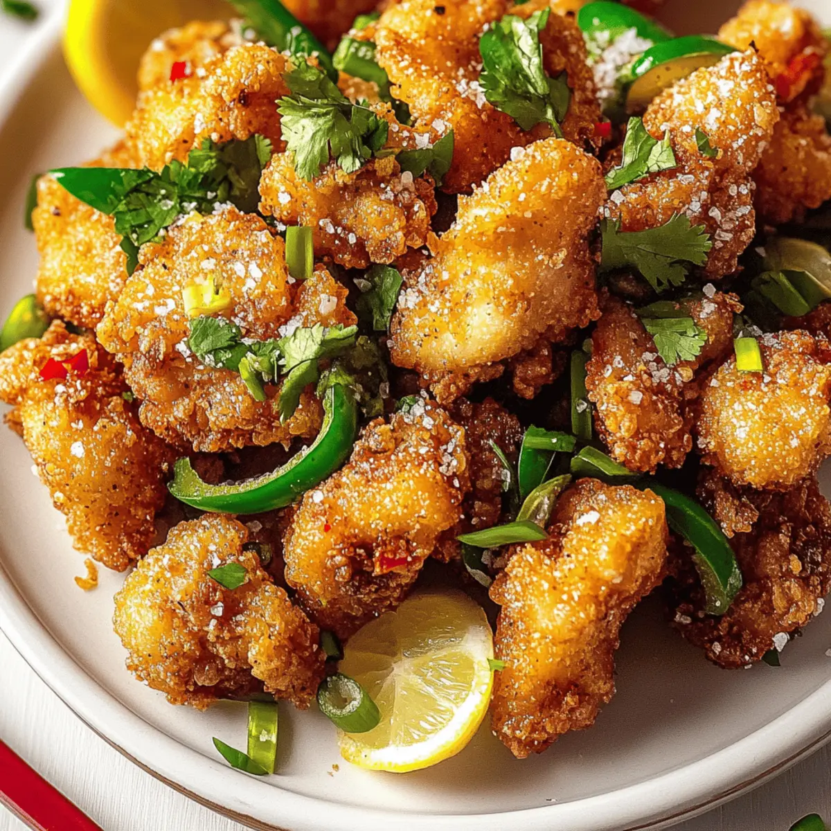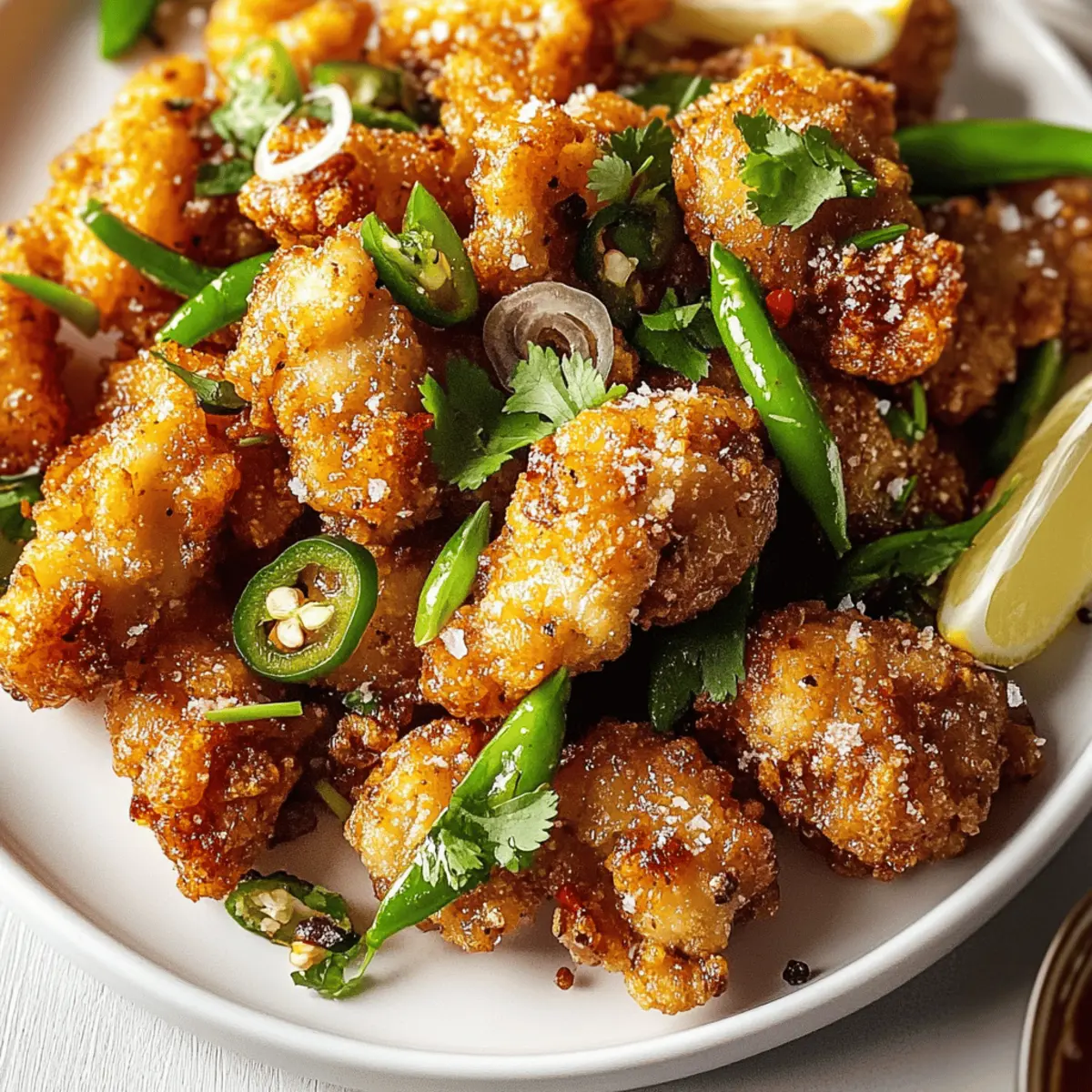 The aroma wafting through the kitchen was enough to turn heads and spark curiosity from every corner of the house. But once you hear the satisfying crunch of these Salt and Pepper Crispy Chicken Bites, you’ll know we’ve entered the realm of irresistible homemade goodness. With a light, crispy exterior wrapped around juicy chicken thighs, this dish is not just easy to whip up but also a surefire crowd-pleaser for any occasion. Imagine treating your friends to a delightful appetizer that’s not only packed with flavor but also requires minimal effort—perfect for busy weeknights or cheerful gatherings! Are you ready to discover the secret to the ultimate crispy chicken experience? Why Is This Chicken Recipe a Must-Try? Irresistible Crunch: Each bite offers a satisfying crunch that will keep everyone coming back for more. Flavor Explosion: Perfectly seasoned with aromatic spices, this dish is bursting with flavor! Beginner-Friendly: You don’t need to be a pro chef to whip up these delightful bites. Versatile Dish: Enjoy them as an appetizer or serve alongside steamed rice for a complete meal, just like Cheesy Chicken Broccoli or with sweet chili sauce for dipping! Quick Cooking: Ready in under 30 minutes, it’s the ultimate quick-fix for busy weeknights. Crowd-Pleaser: Impress your guests with a homemade treat that rivals takeout! Salt and Pepper Crispy Chicken Ingredients For the Chicken Bites Boneless Skinless Chicken Thighs – These are juicy and remain tender during frying, ensuring each bite is succulent. Cornstarch – This ingredient creates an ultra-crispy texture by drawing out moisture and lightening the coating. All-Purpose Flour – Adds crucial structure to the crust, guaranteeing a satisfying crunch for your crispy chicken. Salt – Enhances all flavor notes in the coating and chicken for a well-rounded taste. White Pepper – Offers subtle earthy heat without dark specks, maintaining the dish’s elegant appearance. Black Pepper – Adds a familiar peppery kick that balances the white pepper beautifully. Garlic Powder – Infuses savory depth into the batter without the moisture of fresh garlic. Onion Powder – Contributes a mellow sharpness that elevates the overall flavor profile. Chinese Five-Spice Powder – Introduces aromatic warmth with hints of star anise and cinnamon, enriching the taste. For the Stir-Fried Aromatics Vegetable or Canola Oil – Essential for frying; the high smoke point ensures even cooking and perfect color. Onion – Thinly sliced, it adds mild sweetness during stir-frying for a wonderful textural contrast. Garlic – Finely chopped, it enhances the aroma and flavor of the dish in the stir-fry. Green Chilies – Offers fresh heat; adjust the quantity based on your desired spice level for your crispy chicken experience. Green Onions – Scattered for a vibrant oniony zing and color, adding freshness to the final dish. Fresh Cilantro – Optional, but it adds a bright herbal finish for garnish that livens up your plate. For Serving Lemon Wedges – For squeezing over the chicken, providing a lively citrus pop that enhances flavors. Each ingredient plays a vital role in crafting these delicious Salt and Pepper Crispy Chicken Bites that are sure to wow your taste buds! Step‑by‑Step Instructions for Salt and Pepper Crispy Chicken Bites Step 1: Prepare the Coating In a large mixing bowl, whisk together ½ cup of cornstarch, ½ cup of all-purpose flour, 1 teaspoon of salt, and the spices: 1 teaspoon each of white pepper, black pepper, garlic powder, onion powder, and Chinese five-spice powder. This combination creates a flavorful coating that will yield the crispy texture you desire for the Salt and Pepper Crispy Chicken Bites. Step 2: Coat the Chicken Take your boneless skinless chicken thighs and cut them into bite-sized pieces. Toss the chicken pieces in the prepared dry mixture until they are fully coated. Make sure every bite is generously covered to ensure a delicious crunch once fried. Set the coated chicken aside while you heat the oil. Step 3: Heat the Oil In a deep frying pan or heavy skillet, add enough vegetable or canola oil to reach about 2 inches deep. Heat the oil over medium-high heat until it shimmers, which should take around 5–7 minutes. To test if the oil is ready, drop a small piece of the coating mixture into it; it should sizzle immediately. Step 4: Fry the Chicken Carefully add the coated chicken pieces to the hot oil in batches to avoid overcrowding. Fry each batch for about 4-5 minutes or until they are golden brown and crispy, flipping halfway for even cooking. Once fried, remove the chicken bites and place them on paper towels to drain excess oil and maintain that crispy texture. Step 5: Stir-Fry the Aromatics In another skillet, heat a tablespoon of oil over medium heat and add thinly sliced onion, finely chopped garlic, and diced green chilies. Sauté for about 2-3 minutes until the onion is translucent and fragrant. This aromatic base will elevate the flavors of your Salt and Pepper Crispy Chicken Bites. Step 6: Combine Chicken and Aromatics Once the aromatics are ready, add the fried chicken bites to the skillet. Toss the chicken in the onion, garlic, and chili mixture, ensuring they are evenly coated. Stir-fry for an additional minute to blend the flavors while adding a bit of variety to the dish. Step 7: Final Touches Mix in some chopped green onions into the skillet and stir for another minute, allowing the green onions to soften slightly. This step adds a vibrant color and fresh flavor that complements the Salt and Pepper Crispy Chicken Bites beautifully. Step 8: Serve and Garnish Transfer the flavorful chicken bites to a serving plate and garnish with fresh cilantro and lemon wedges. Squeezing some lemon over the hot chicken adds a burst of freshness, enhancing the overall taste. Now you’re ready to enjoy your delicious creation with family and friends! How to Store and Freeze Salt and Pepper Crispy