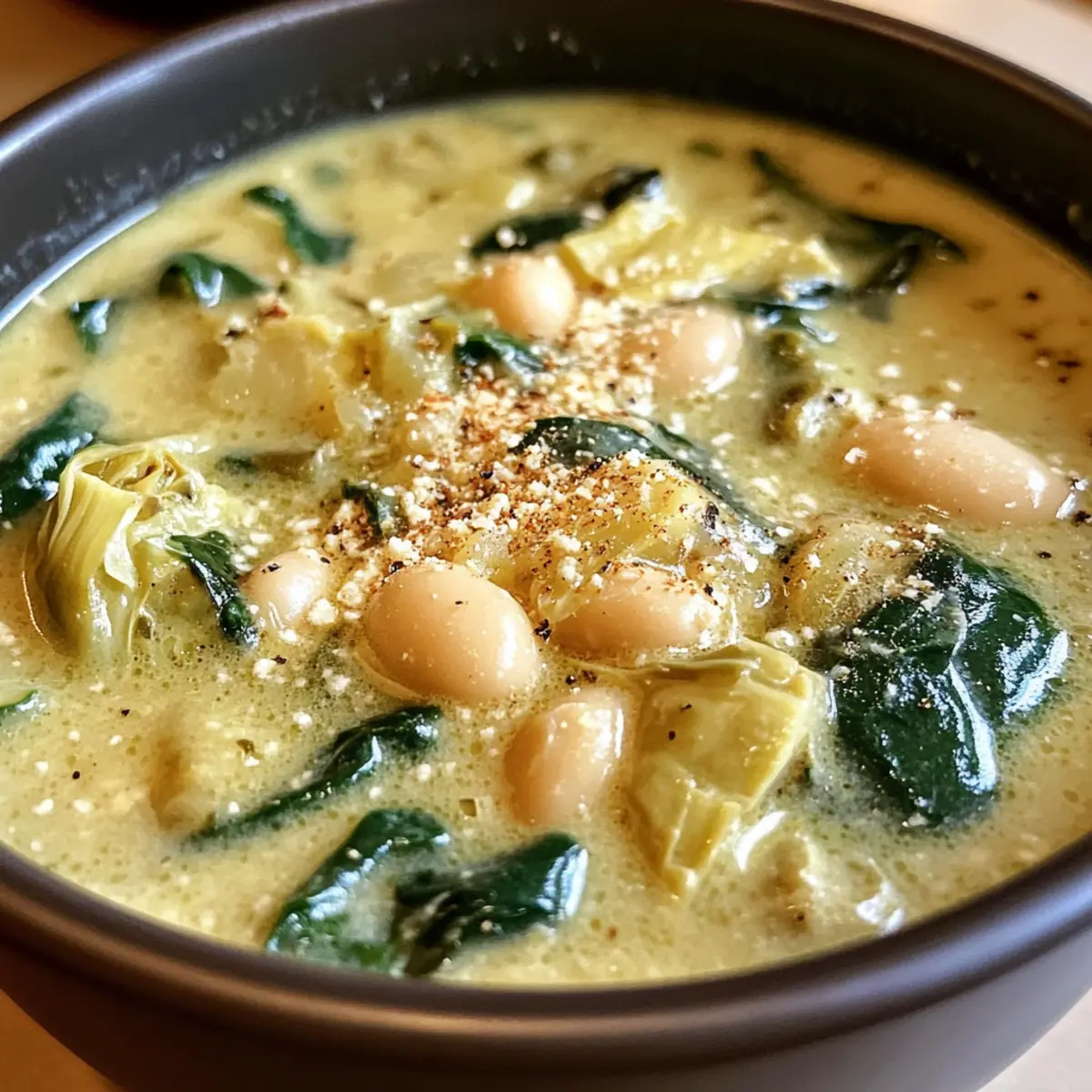 The first chill of autumn often brings a longing for cozy, homemade meals that warm both the heart and soul. That’s precisely how I felt when I decided to whip up a pot of Creamy Spinach Artichoke White Bean Soup. With its rich, savory flavors reminiscent of your favorite dip, this vegan delight is a perfect answer to fast food cravings, bringing joy to your dinner table while keeping things healthy. Each spoonful is a hearty blend of creamy cashew goodness, robust beans, and vibrant spinach, making it not only a comfort food champion but also high in fiber. Plus, it’s a quick recipe that fits beautifully into any busy schedule. So, are you ready to dive into a bowl of pure, wholesome comfort? Why is this soup a must-try? Creamy Comfort: The Spinach Artichoke White Bean Soup is a warm hug in a bowl, blending creamy cashew goodness with tender artichokes and hearty beans. Nutritious & Flavorful: Each spoonful is packed with nutrients, making it a delicious way to enjoy veggies, especially when you need a break from fast food. Quick & Easy: With straightforward steps, this recipe is perfect for busy weeknights, allowing you to enjoy a homemade meal without the fuss. Versatile Ingredients: Feel free to mix and match ingredients based on what you have on hand, such as swapping cannellini beans for chickpeas or adding fresh herbs. Crowd-Pleasing Dish: It’s a hit with both vegans and non-vegans alike, ensuring everyone at your table will be satisfied. Serve it alongside some toasted sourdough to really elevate the experience! You might also enjoy these easy recipes like Mushroom Spinach Stuffed Sweet Potatoes or for a festive touch, try out this delicious Red White Blue Cheesecake Salad. Spinach Artichoke White Bean Soup Ingredients For the Soup Base: Cannellini Beans – Provide protein and creaminess to the soup; substitute with chickpeas, butter beans, or cooked green lentils for variety. Marinated Artichokes – Adds a tangy, savory element; jarred or canned varieties simplify preparation. Leeks – Offer a mild, sweet onion flavor; can be replaced with shallots or yellow onion if needed. Spinach – Adds nutrients and color; feel free to use baby kale or frozen spinach for convenience. Vegetable Broth – A high-quality broth ensures the best flavor; Better Than Bouillon is recommended for richness. For the Creamy Blend: Raw Cashews – Create a luscious texture when blended; substitute with raw sunflower seeds or pepitas for a nut-free option. Roasted Garlic – Infuses the soup with a deep, aromatic flavor; roasting brings out its natural sweetness. Miso Paste – Enhances the depth of flavor; opt for white or yellow for a milder taste. Nutritional Yeast – Provides a cheesy umami flavor; can be replaced with miso paste or vegan parmesan if desired. For Seasoning: Red Pepper Flakes – Add a hint of heat; adjust according to your spice preference. Coriander – Offers a citrusy undertone that complements the flavors beautifully. This cozy Spinach Artichoke White Bean Soup isn’t just a meal; it’s a journey toward satisfied taste buds and filled bellies, making for a heartwarming dinner experience! Step‑by‑Step Instructions for Spinach Artichoke White Bean Soup Step 1: Roast Garlic Preheat your oven to 400°F (200°C). Cut the top off a whole garlic bulb, drizzle it with olive oil, wrap it tightly in foil, and roast it for 40-45 minutes. Once the garlic is soft and caramelized, let it cool before squeezing the cloves out into a bowl; this will add a rich depth of flavor to your spinach artichoke white bean soup. Step 2: Prep Ingredients While the garlic roasts, start prepping your ingredients. Slice the leeks into thin rounds and rinse thoroughly to remove any dirt. Dice a small onion and soak your raw cashews in a bowl of boiling water. Blanch the fresh spinach in hot water for 1-2 minutes, then cool it in ice water and squeeze out any excess moisture, ensuring a vibrant color and taste in your soup. Step 3: Sear Artichokes In a large Dutch oven or heavy pot, heat a tablespoon of olive oil over medium-high heat. Once the oil is shimmering, add the marinated artichokes and sear them for about 5-6 minutes until they are browned and slightly crispy. Remove the artichokes from the pot and set aside, allowing their delightful flavor to return to the soup later. Step 4: Sauté Aromatics In the same pot, lower the heat to medium and add the sliced leeks with a pinch of salt. Sauté for about 10 minutes until they are softened and translucent, then add the diced onion. Cook for an additional 5 minutes until the onion becomes fragrant and tender, creating a sweet base for your spinach artichoke white bean soup. Step 5: Season Stir in nutritional yeast, ground coriander, and red pepper flakes to the aromatic mixture, cooking for an additional 1-2 minutes until fragrant. This blend of spices will enhance the savory depth of the soup, allowing the flavors to bloom beautifully in every scoop. Step 6: Simmer Add the cannellini beans and vegetable broth to the pot, bringing the mixture to a rolling boil. Once boiling, reduce the heat to low and let it simmer for about 20 minutes, allowing the beans to soften and merge their flavors with the sautéed vegetables in your creamy spinach artichoke white bean soup. Step 7: Make Cashew Cream While the soup simmers, drain the soaked cashews and add them to a blender along with the roasted garlic, miso paste, and a splash of water. Blend until smooth and creamy, creating a luscious cashew cream that will enrich the soup. Finally, gently fold in the blanched spinach to introduce vibrant green goodness. Step 8: Combine Remove the pot from the heat and discard any bay leaves if used. Add the cashew cream and seared artichokes back into the soup, stirring gently to combine all the flavors harmoniously. Taste and adjust seasoning with salt and pepper as needed before serving this comforting spinach artichoke white bean soup. Spinach Artichoke White Be