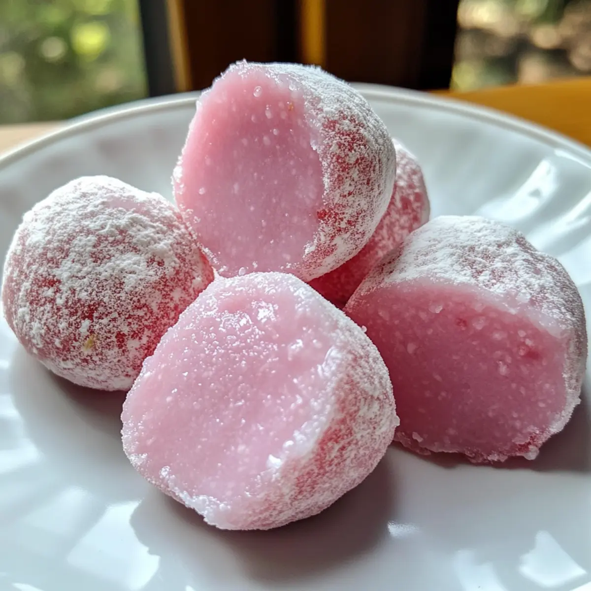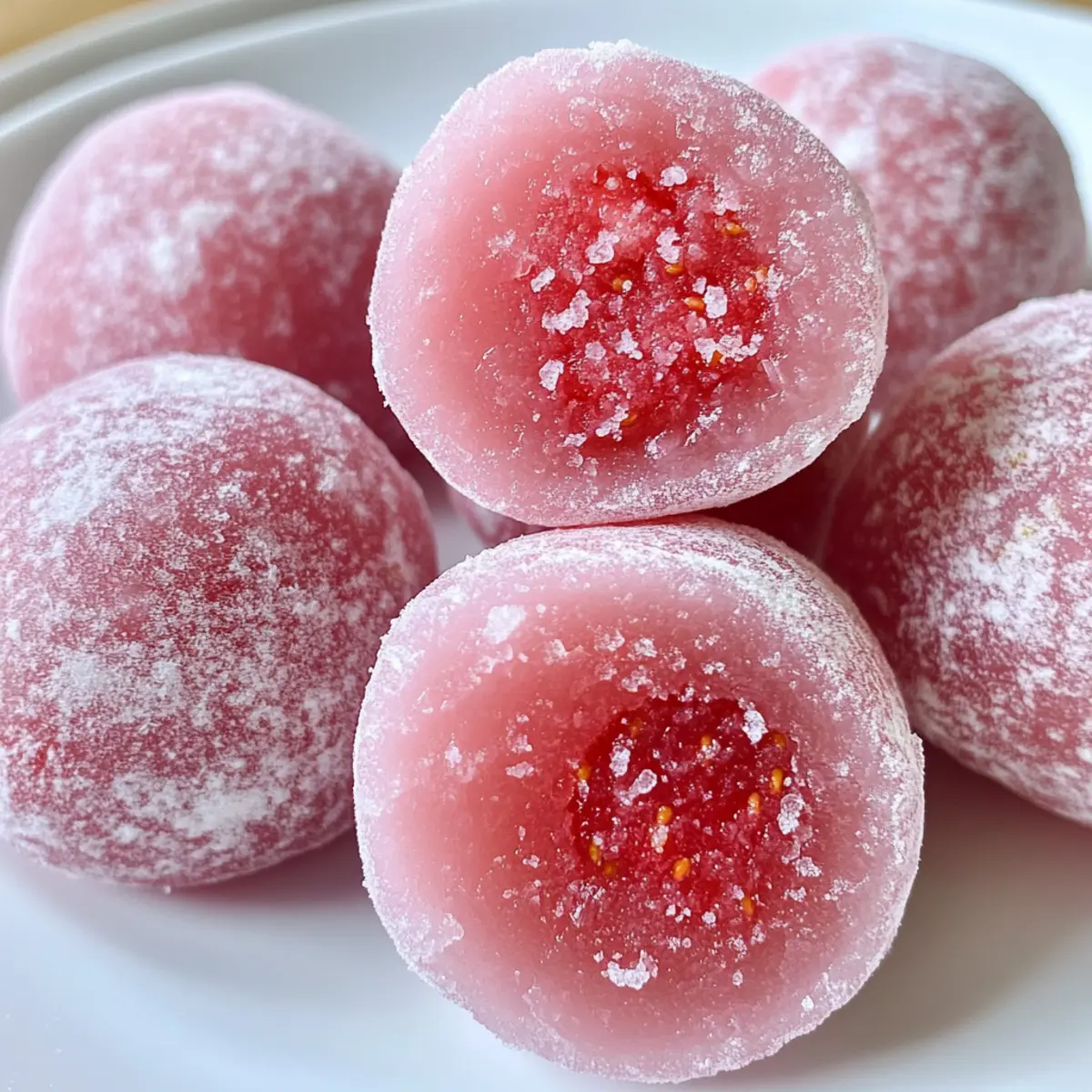 While savoring a delicate piece of strawberry mochi, I was transported back to my favorite Japanese tea house, where each bite felt like a hug from the inside out. This Easy Strawberry Mochi Recipe combines just three simple ingredients for a mouthwatering dessert that you can whip up in only 20 minutes. Not only is this treat gluten-free, making it a fantastic option for a wider audience, but its chewy texture and fresh fruity flavor will leave everyone asking for seconds. With minimal fuss and maximum delight, it’s perfect for impressing guests or indulging on a cozy evening at home. Ready to elevate your dessert game? Let’s dive into this charming recipe together! Why is Strawberry Mochi a Must-Try? Simplicity at its Finest: This 3-ingredient dessert is not only easy to prepare, but it also requires minimal kitchen skills, making it perfect for anyone. Gluten-Free Goodness: With glutinous rice flour, this mochi is entirely gluten-free, allowing everyone to enjoy a sweet treat without worries. Raspberry Variation: Feeling adventurous? You can easily swap strawberries for raspberries or blueberries to change up the flavor profile. Quick to Make: In just 20 minutes, you can whip up this delightful dessert that might soon become your go-to recipe. Whether you want to impress guests with your culinary skills or treat yourself on a quiet evening, these mochi won’t disappoint. Strawberry Mochi Ingredients For the Mochi • Glutinous Rice Flour – Essential for that signature chewy texture; remember, it’s gluten-free! • Fresh Strawberry Puree – Infuses natural sweetness and a beautiful pink hue; frozen strawberries can be substituted, just thaw and drain well. • Sugar – Helps balance the tartness of strawberries; feel free to adjust based on your sweetness preference. For Dusting • Extra Glutinous Rice Flour – Prevents sticking when handling the mochi; always keep your workspace dusted! Dive into this Strawberry Mochi Recipe and indulge in a delightful treat that everyone will love! Step‑by‑Step Instructions for Strawberry Mochi Recipe Step 1: Prep Strawberry Puree Begin by blending fresh strawberries in a food processor until smooth, ensuring no chunks remain. If using frozen strawberries, allow them to thaw completely and drain excess moisture to avoid watery mochi. This strawberry puree will add a sweet flavor and vibrant pink hue to your Strawberry Mochi, setting the foundation for a delightful dessert. Step 2: Mix Ingredients In a mixing bowl, combine glutinous rice flour, strawberry puree, and sugar. Stir the mixture until it is well blended and smooth, ensuring that no lumps of flour remain. The consistency should be thick yet pourable. This mixture will become the chewy base of your Strawberry Mochi, so a uniform blend is essential. Step 3: Steam the Mixture Transfer the mochi mixture to a heatproof dish, ensuring it is spread evenly. Place the dish in a steamer basket over boiling water, covering it tightly. Steam for 15 to 20 minutes, checking occasionally. You’ll know it’s done when the mochi appears glossy and slightly translucent, indicating the transformation into a chewy delight. Step 4: Cool and Dust Once steaming is complete, carefully remove the dish and let the mochi cool slightly, just enough to handle. Dust your hands and workspace generously with glutinous rice flour to prevent sticking. This step is crucial for easy handling as you prepare to shape your Strawberry Mochi into delightful pieces. Step 5: Shape and Serve Dividing the mixture into small portions, shape each piece into a ball or disc. Make sure each piece is generously dusted with glutinous rice flour to keep them from sticking together. Once shaped, your Strawberry Mochi is ready to be enjoyed as a chewy, fruity treat. Serve them fresh for the best texture, or store for later indulgence. What to Serve with Easy 3-Ingredient Strawberry Mochi? Treat your loved ones to a delightful dessert experience with perfectly paired accompaniments that elevate your strawberry mochi! Matcha Green Tea: The earthy flavors of matcha provide a beautiful contrast to the sweet and fruity mochi, creating a sophisticated pairing. Fresh Fruit Salad: A medley of seasonal fruits adds a refreshing burst of flavor and textures, perfectly complementing the chewy mochi experience. Creamy Coconut Whipped Topping: The richness of coconut whipped cream rounds out the sweetness while adding a silky mouthfeel that invites indulgence. Sweet Red Bean Paste: For a touch of traditional Japanese flavor, serve a dollop of sweet red bean paste alongside your mochi. The combination is heavenly! Iced Lemonade: Refreshing and tart, a glass of iced lemonade cuts through the sweetness of the mochi, making each bite feel light and delightful. Chocolate Dipping Sauce: Indulge your sweet tooth by drizzling your mochi with chocolate. This luscious addition elevates the treat to a whole new level of deliciousness. Yuzu Sorbet: A scoop of tangy yuzu sorbet refreshes the palate, offering a zesty complement to the mochi’s sweetness and chewy texture. Chilled Green Tea: Serve your mochi with a glass of chilled green tea for a refreshing, calming end to your meal, enhancing the overall taste experience. Make Ahead Options These Strawberry Mochi are perfect for busy home cooks looking to save time without sacrificing flavor! You can prepare the strawberry puree up to 3 days in advance; just blend fresh strawberries and refrigerate in an airtight container to maintain their vibrant color and taste. Additionally, you can mix the glutinous rice flour and sugar beforehand, storing the dry ingredients separately, and steam the mixture when you’re ready to serve—this can be done up to 24 hours prior for optimal quality. When you’re ready to enjoy, simply steam the prepped mixture and cool before shaping; you’ll have fresh, chewy Strawberry Mochi that feels just as special as if you made them on the spot! Expert Tips for Strawberry M
