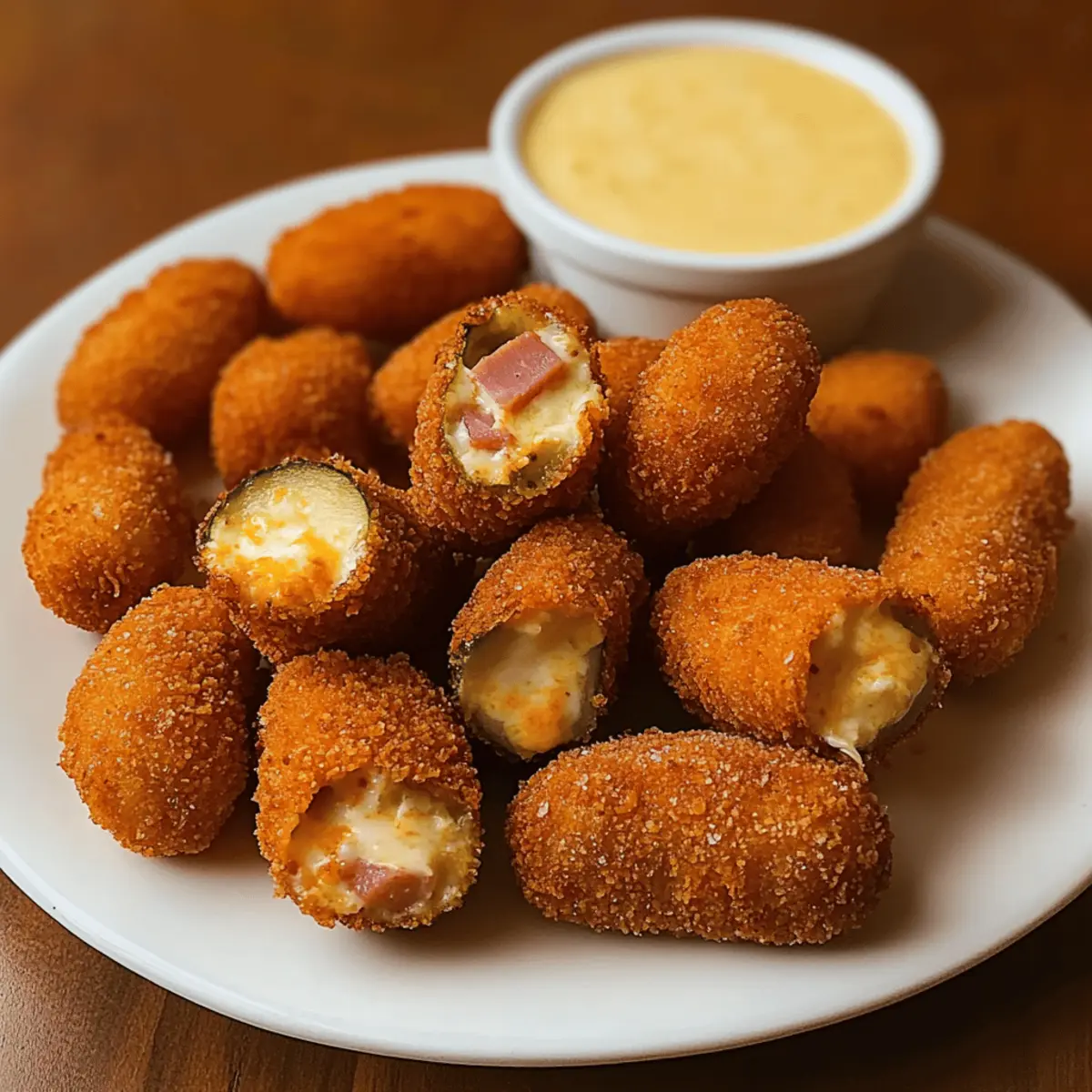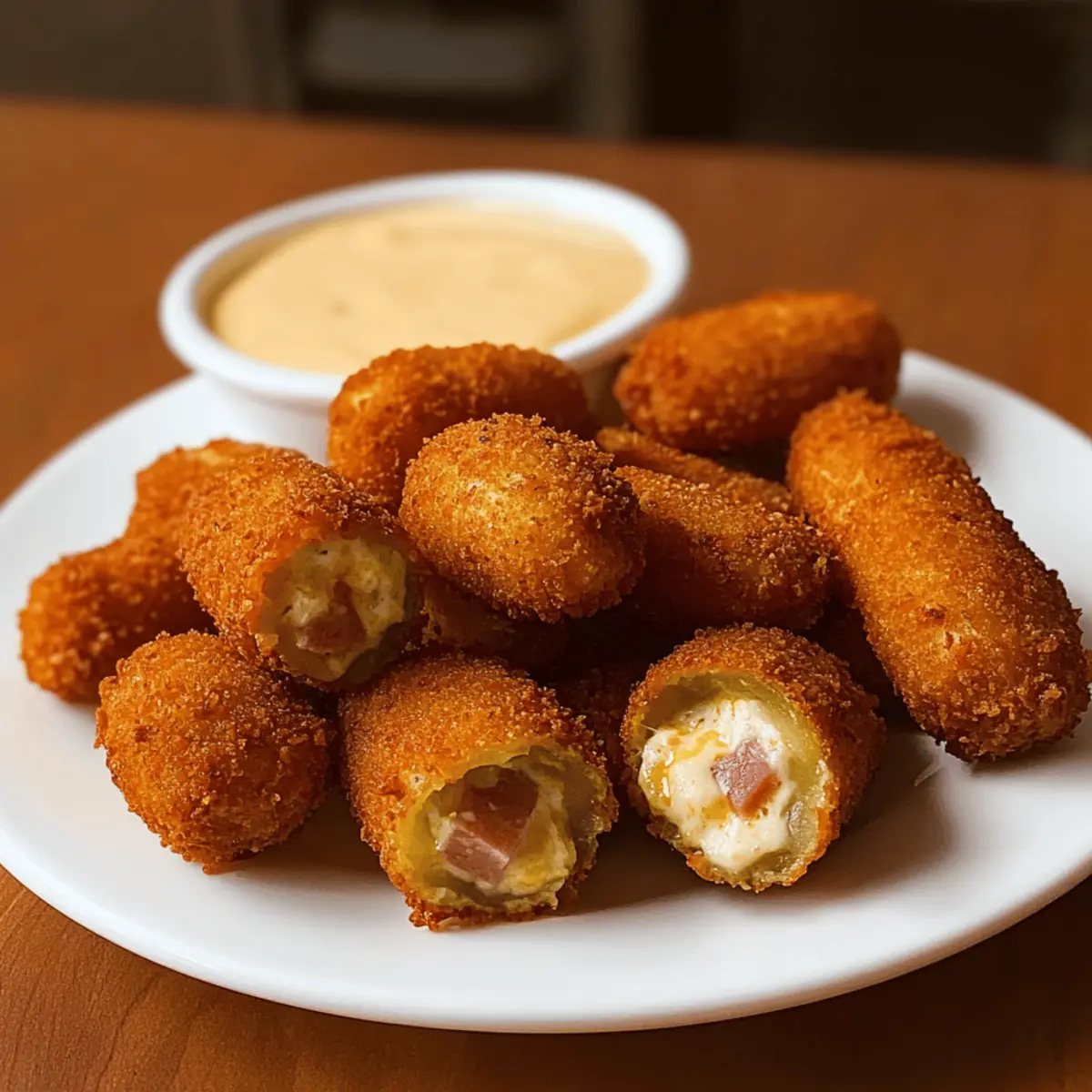 As I was rummaging through my fridge one afternoon, a jar of dill pickles caught my eye and inspired an unexpected culinary adventure. This led me to the mouthwatering world of Stuffed Fried Pickles, where each crispy bite is a delightful tangy surprise wrapped around cheesy goodness. This quick appetizer not only elevates any game day gathering but also offers a fun, satisfying twist on traditional pub food. Plus, they’re easy to adapt for your taste – spice them up with jalapeños or swap in your favorite cheese! Who knew that a simple pickle could become the star of your table? Intrigued? Let’s dive into the recipe together! Why Are Stuffed Fried Pickles a Must-Try? Crispy Delight: Each bite delivers a fantastic crunch, perfectly melding the juicy pickle with a gooey cheese filling. Crowd Favorite: These delightful morsels are always a hit at parties, making them an ideal appetizer for game day or casual get-togethers. Versatile Flavor: Customize them by swapping mozzarella with cheddar or adding spicy jalapeños for an extra kick — the possibilities are endless! Quick and Easy: With straightforward steps, even novice cooks can whip up these tasty treats in no time. Comfort Food Twist: Embrace that classic pub experience from the comfort of your kitchen, and if you love stuffed snacks, check out our Mushroom Spinach Stuffed recipe for another tasty option! Stuffed Fried Pickles Ingredients For the Pickles • Dill Pickles – The base ingredient that provides the irresistible tanginess; choose whole pickles for the best vessel. • Ham Slices – Adds a savory depth, creating a delicious flavor contrast; prosciutto makes for a gourmet upgrade. For the Cheese Filling • Mozzarella Cheese – Offers creaminess and a gooey texture; swap with cheddar for a sharper, more pronounced flavor. For the Breading and Coating • All-Purpose Flour – Essential for helping the coating stick; you can substitute with gluten-free flour if needed. • Eggs – Binds everything together beautifully; substitute with flaxseed meal and water for a vegan-friendly option. • Panko Breadcrumbs – Delivers that desired crispy texture; feel free to use regular breadcrumbs in a pinch, though they may be less crunchy. For Frying • Oil for Frying – Vital for achieving that golden crispiness; vegetable oil is a popular choice that works perfectly. Curious about whipping up these Stuffed Fried Pickles? Let’s get frying! Step‑by‑Step Instructions for Stuffed Fried Pickles Step 1: Prepare the Pickles Start by slicing the ends off each dill pickle, then use an apple corer to hollow them out. Take care to remove the seeds while gently twisting the corer inside the pickle. Save the centers for later—these crispy bites will become part of your Stuffed Fried Pickles delight! Step 2: Stuff the Pickles Next, take a slice of ham and roll it around a mozzarella stick, creating a savory bundle. Carefully insert this ham and cheese combo into each hollowed-out pickle. Make sure to pack it in snugly, ensuring each pickle is filled to the top for that gooey goodness when fried. Step 3: Cut the Stuffed Pickles Once all your pickles are stuffed, slice them into ¼-inch rounds. Use a sharp knife for clean cuts, which will help keep each piece intact. Lay them on a plate, ready for the next stage—this is where your Stuffed Fried Pickles begin to take shape! Step 4: Set Up Breading Station Prepare a breading station by placing flour in one bowl, beaten eggs in a second, and panko breadcrumbs in a third. This assembly line will help you coat the stuffed pickles easily. Have everything within reach, allowing for a quick dip to ensure even coating on each pickle slice. Step 5: Bread the Pickles Dip each stuffed pickle slice first into the flour, coating all sides to help adhere the egg mixture. Next, transfer it to the beaten eggs, allowing excess to drip off before rolling it in panko breadcrumbs, ensuring a thorough coating for maximum crispiness. Repeat this with the reserved pickle centers too! Step 6: Heat the Oil In a deep skillet or fryer, heat vegetable oil to 375°F (190°C). Use a thermometer to check the temperature; it’s critical for achieving that golden-brown color and crispy texture. Be patient—this step ensures the perfect fry for your Stuffed Fried Pickles! Step 7: Fry the Pickles Carefully add the breaded pickle slices to the hot oil, making sure not to overcrowd the pan. Fry them for about 1–2 minutes or until they turn golden brown and crispy. Keep an eye on them, as the frying time may vary slightly based on your stove or fryer. Step 8: Drain and Serve Once fried, promptly remove the Stuffed Fried Pickles from the oil and place them on a plate lined with paper towels to drain any excess oil. To serve, enjoy them hot alongside spicy mayonnaise or your favorite dipping sauce. These crispy delights are sure to impress! What to Serve with Stuffed Fried Pickles Every gathering deserves a spread that excites the senses, and these crispy delights are just the beginning of a mouthwatering experience. Spicy Aioli: A zesty dip that enhances crunchiness, offering a punch of flavor to complement the tanginess of pickles. Creamy Ranch Dressing: This cooling dressing balances the heat and adds a comforting creaminess that pairs perfectly with fried bites. Savory Chicken Wings: The bold flavors of wings create a satisfying contrast, making your appetizer platter feel complete and indulgent. Crispy Potato Wedges: Golden and fluffy inside, these wedges provide a hearty texture that harmonizes wonderfully with the crispiness of stuffed pickles. Beer-Battered Onion Rings: These crunchy sides echo the pub-style essence, rounding out your spread with satisfying bites everyone will love! Serving these Stuffed Fried Pickles with a mix of dips and sides not only tantalizes the palate but also inspires camaraderie and conversation at any table. Stuffed Fried Pickles Variations & Substitutions Ready to spice up 