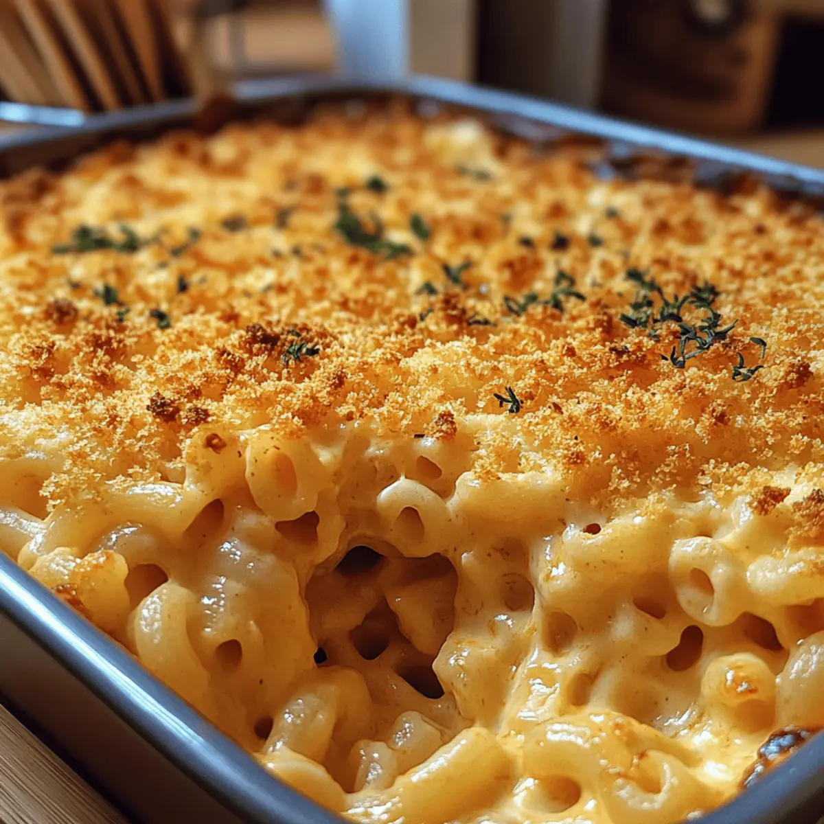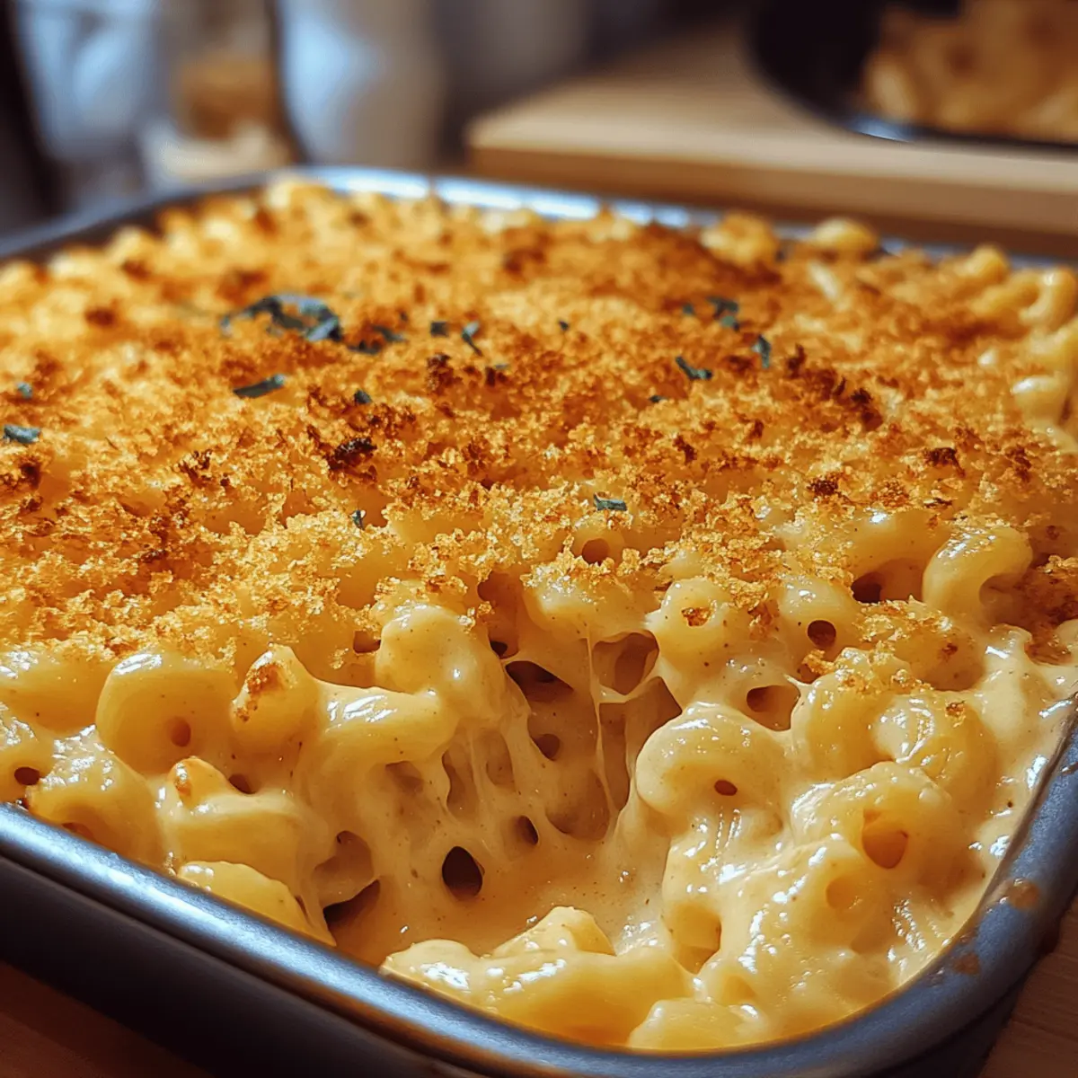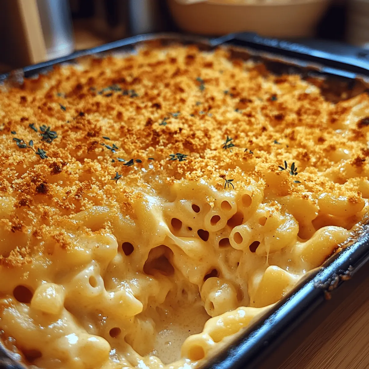 Picture the delightful aroma of warm, cheesy goodness wafting through your home as your loved ones gather around the table. This Ultimate Creamy Thanksgiving Mac and Cheese is not just a side dish; it’s a celebration of comfort food that elevates your holiday feast. With rich sharp cheddar and nutty Gruyère creating a velvety cheese sauce, this dish coats every elbow macaroni bite with irresistible creaminess. Perfectly paired with turkey and ham, it’s a true crowd-pleaser that transforms typical holiday fare into something extraordinary. Plus, with a quick 30-minute cook time, you can spend less time in the kitchen and more time enjoying the festivities. Are you ready to make your Thanksgiving meal unforgettable? Let’s dive into this heartwarming recipe! Why is this mac and cheese special? Creamy, Velvety Sauce: The rich blend of sharp cheddar and nutty Gruyère creates a mouthwatering sauce that envelops each macaroni piece for ultimate comfort. Quick Prep Time: Ready in just 30 minutes, this dish lets you focus on family gatherings instead of slaving over the stove! Crowd-Pleaser: Its irresistible flavor and cheesy goodness mean even the pickiest eaters will come back for seconds. Versatile Twist: Want to customize? Add crispy bacon or roasted veggies for a unique touch, much like my Pumpkin Cream Cheese options! Satisfying Comfort Food: This Thanksgiving Mac Cheese will become a cherished staple, elevating your holiday table and making it unforgettable. Thanksgiving Mac Cheese Ingredients For the Pasta • Elbow Macaroni – The base of the dish providing structure; you can substitute any pasta shape like shells or penne. For the Cheese Sauce • Sharp Cheddar Cheese – Adds classic flavor; consider using aged white cheddar for an even richer taste. • Gruyère Cheese – Offers nutty complexity with a smooth melting quality; fontina is a great substitute for a similar creamy texture. • Whole Milk – Provides creaminess in the sauce; whole milk enhances richness compared to lower-fat alternatives. • Unsalted Butter – Serves as the base for roux and adds rich flavor; margarine can be used, but it will alter the flavor slightly. • All-Purpose Flour – This thickens the cheese sauce, resulting in a velvety texture. For the Crunchy Topping • Panko Breadcrumbs – Adds that essential crunch on top after baking; mix with melted butter for a golden, crisp finish. Feel the warmth of a family gathering with this Thanksgiving Mac Cheese, a dish that embodies the spirit of comfort food and culinary joy! Step‑by‑Step Instructions for Thanksgiving Mac Cheese Step 1: Preheat and Prepare Preheat your oven to 350°F (175°C) while you grease a large baking dish with butter or cooking spray. This step ensures that the Thanksgiving Mac Cheese will have a beautifully crisp exterior after baking. Prepare your favorite macaroni, whether it’s traditional elbow or another pasta shape, so it’s ready for cooking. Step 2: Cook the Pasta Bring a large pot of salted water to a boil. Add the elbow macaroni and cook for 6–8 minutes, stirring occasionally, until al dente. Be sure to check for a slight firmness; you’ll want the pasta to hold its shape during baking. Once done, drain the macaroni in a colander and set it aside, letting any excess water evaporate. Step 3: Create the Roux In a medium saucepan over medium heat, melt 4 tablespoons of unsalted butter until bubbling. Whisk in ¼ cup of all-purpose flour and cook for 2 minutes until it turns a lovely golden color, forming a roux. This step is vital for giving the Thanksgiving Mac Cheese its creamy consistency, so stir continuously to avoid burning. Step 4: Make the Cheese Sauce Slowly add 3 cups of whole milk to the roux while whisking constantly. Continue cooking for about 5 minutes, allowing the mixture to thicken. You’ll know it’s ready when it lightly coats the back of a spoon. Remove from heat and stir in 2 cups of grated sharp cheddar and 1 cup of gruyère until completely melted and smooth. Step 5: Combine Pasta and Sauce Gently fold the cooked elbows into the creamy cheese sauce until each piece is thoroughly coated. This step is key for achieving a delightful flavor in every bite of your Thanksgiving Mac Cheese. Ensure there are no dry patches of pasta; every strand should shimmer with that velvety cheese goodness. Step 6: Transfer and Prepare for Baking Pour the mac and cheese mixture into the prepared baking dish, spreading it evenly. Take 1 cup of panko breadcrumbs and sprinkle them generously over the top, giving the dish a crunchy finish. For extra flavor, mix the panko with a bit of melted butter before adding for that golden, crisp topping you love. Step 7: Bake to Perfection Place your dish in the preheated oven and bake for 25–30 minutes until the top is golden brown and bubbly. Keep an eye on the mac cheese; if the breadcrumbs brown too quickly, cover the dish with aluminum foil to prevent burning while continuing to bake. Step 8: Serve and Savor Once baked, remove the Thanksgiving Mac Cheese from the oven and let it sit for about 5 minutes before serving. This allows the sauce to settle slightly, making it easier to scoop. Dish out piping hot portions and watch as everyone gathers around to enjoy this creamy, comforting holiday treat. Thanksgiving Mac Cheese Variations Feel free to personalize this comforting dish to make it uniquely yours and truly remarkable! Crispy Bacon: Add cooked, crumbled bacon for a delicious smoky flavor that complements the cheese beautifully. Imagine the salty crunch with each creamy bite! Caramelized Onions: Stir in sweet caramelized onions to enhance the richness of the dish. The subtle sweetness brings another layer of depth, mouthwatering enough to make you savor every spoonful. Seafood Twist: Incorporate lobster or crab meat for an indulgent version. The buttery seafood pairs perfectly with the rich cheese sauce, creating a luxurious holiday treat. Veggie Boost: Mix