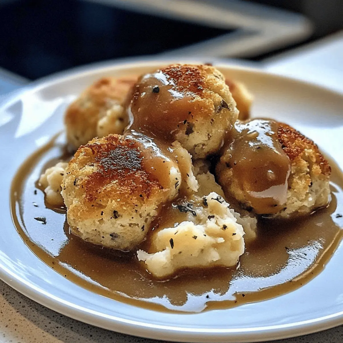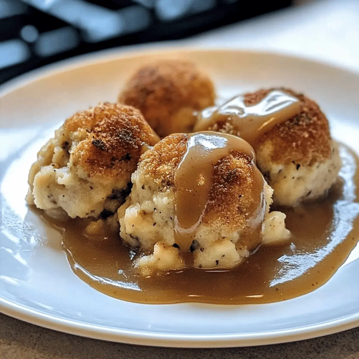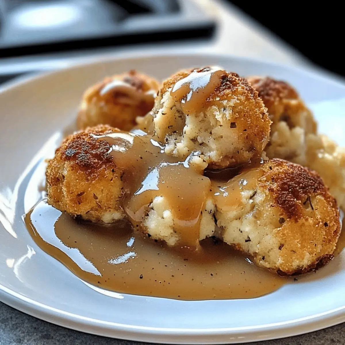 5. Transfer the cooked Turkey Stuffing Balls to a platter. Serve hot with warm gravy and a drizzle of cranberry sauce.