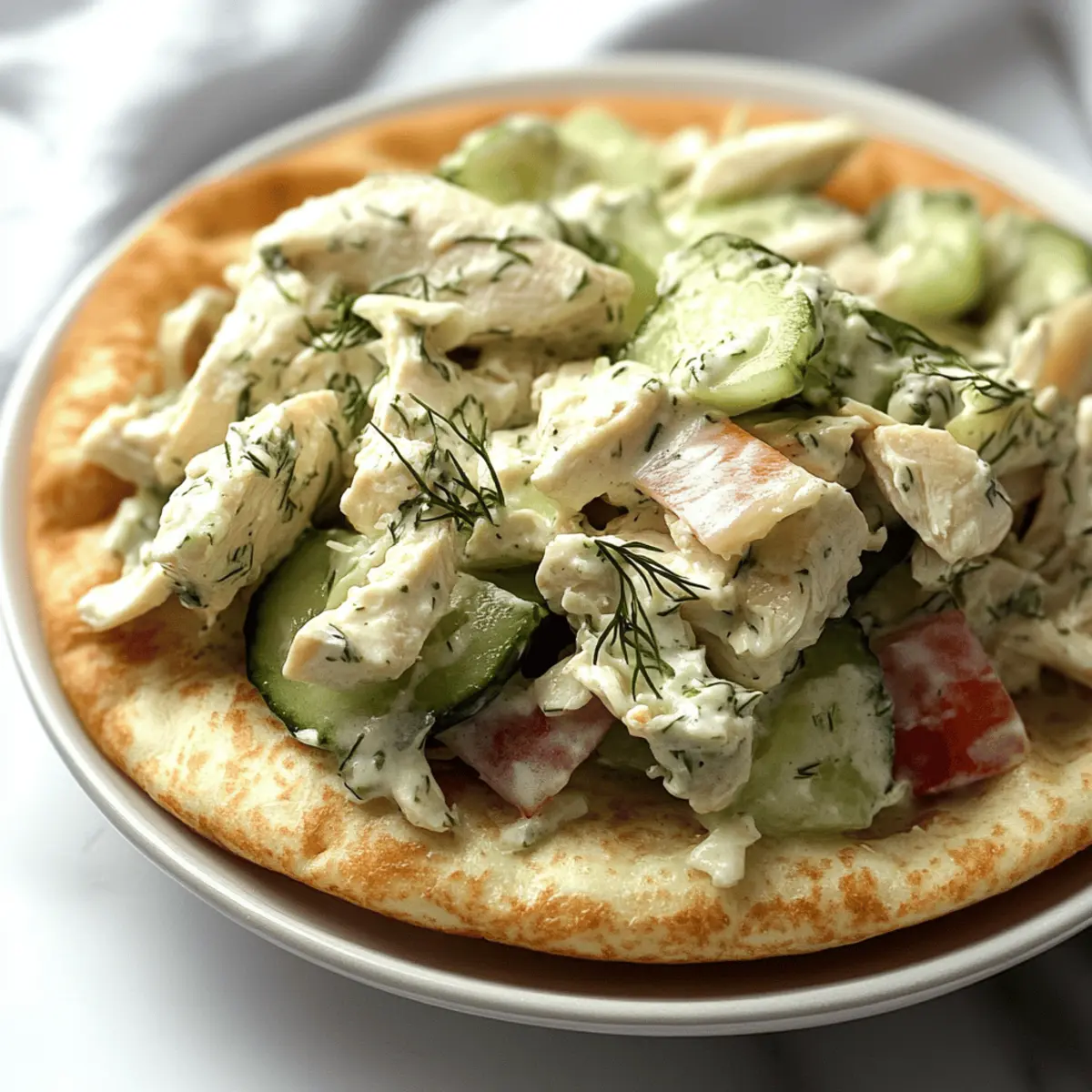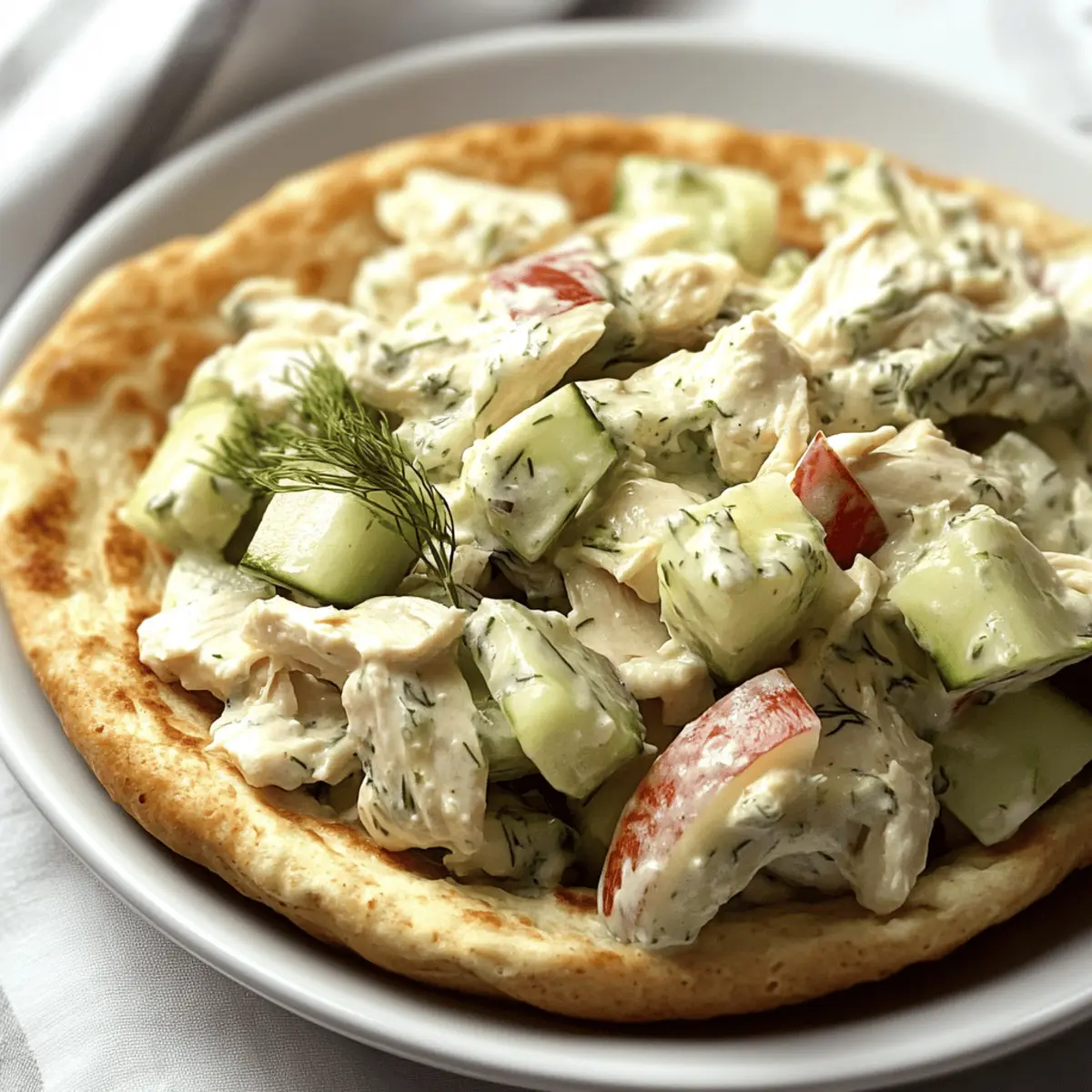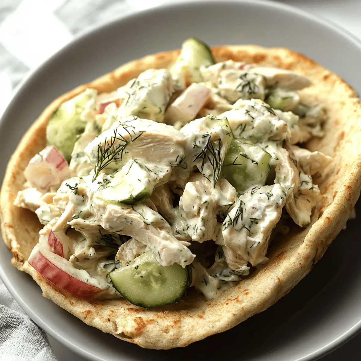 As I sat on my patio, savoring the gentle spring breeze, I craved something light yet satisfying. That’s when I remembered my go-to Tzatziki Chicken Salad—a dish that perfectly blends with the season’s refreshment. Using rotisserie chicken and a tangy tzatziki sauce, this recipe brings effortless meal prep to the table, making it ideal for busy weeknights or leisurely lunches. The combination of zippy Greek yogurt, crunchy cucumber, and aromatic dill embodies that fresh bite we all love. What’s even better? It’s a make-ahead marvel that delivers both flavor and nutrition. Whether enjoyed in a pita, on crackers, or over a bed of greens, you’re moments away from a meal that’s as versatile as it is delightful. Ready to discover how to whip up this easy and crowd-pleasing dish? Let’s dive in! Why is Tzatziki Chicken Salad a Must-Try? Freshness, this salad is all about embracing vibrant ingredients that come together for a delightful taste experience. Convenience reigns supreme here, as rotisserie chicken makes meal prep a breeze! Versatile Options abound, swap in grilled shrimp or turkey, or add your favorite veggies like bell peppers or avocado. Nutrition-packed and low in calories, each serving provides a satisfying balance of protein and healthy fats. Plus, it’s perfect for busy lifestyles, making it an ideal option whether you’re having a picnic or need a quick lunch. Ready to make your own? Let’s get started! Tzatziki Chicken Salad Ingredients For the Salad • Cucumber – Adds freshness and crunch; squeeze out excess moisture to prevent a watery salad. • Plain Greek Yogurt – Forms the creamy base of the tzatziki sauce; can be substituted with regular yogurt, but it may affect the texture. • Fresh Dill – Provides aromatic flavor; substitute with ⅔ teaspoon of dried dill if fresh is unavailable. • Lemon Juice – Brightens the dish with acidity. • Garlic – Deepens the flavor profile. • Salt & Pepper – Essential for seasoning; adjust to taste. • Cooked Rotisserie Chicken – The main protein source, making this Tzatziki Chicken Salad convenient and flavorful; can swap with any cooked chicken (about 16 ounces). • Red Onion – Adds pleasant crunch and a sharp note to balance the salad. For Serving • Pita Bread – A delicious way to enjoy the salad; try it with fresh sliced tomatoes. • Crackers – Perfect for pairing, making it a great appetizer option. • Lettuce – For a low-carb alternative, serve over a bed of greens. Step‑by‑Step Instructions for Tzatziki Chicken Salad Step 1: Prepare the Cucumber Start by grating 1 medium cucumber into a bowl. To prevent a watery Tzatziki Chicken Salad, wrap the grated cucumber in a paper towel and squeeze out any excess moisture until dry. Set it aside and marvel at the fresh, vibrant green that will add a crunchy texture to your salad. Step 2: Make the Tzatziki Sauce In a mixing bowl, combine the squeezed cucumber with 1 cup of plain Greek yogurt, 2 tablespoons of fresh dill, the juice of half a lemon, 1 minced garlic clove, and a pinch of salt and pepper. Stir the mixture well for about 1-2 minutes until all ingredients are incorporated, creating a creamy, luscious tzatziki sauce that’s fragrant and delicious. Step 3: Add the Chicken Shred 2 cups of cooked rotisserie chicken and add it to the tzatziki sauce mixture, along with ¼ cup of diced red onion. Use a spatula to gently fold the chicken and onions into the tzatziki until everything is evenly coated. Take a moment to enjoy the fusion of flavors already developing in your Tzatziki Chicken Salad. Step 4: Serve the Salad Now, it’s time to plate your Tzatziki Chicken Salad! You can serve it in pita bread with fresh sliced tomatoes, on a bed of lettuce, or with crunchy crackers on the side. For the best experience, enjoy the salad cold; if preparing in advance, store it in a sealed container in the refrigerator and savor it during your next meal! Make Ahead Options These Tzatziki Chicken Salad preparations are a lifesaver for busy home cooks! You can prep the tzatziki sauce and cucumbers up to 24 hours in advance. Simply grate the cucumber, squeeze out excess moisture to prevent a watery salad, and mix it with Greek yogurt, dill, lemon juice, garlic, salt, and pepper. Store the tzatziki and cucumber separately in sealed containers in the refrigerator. When you’re ready to enjoy your meal, simply shred the rotisserie chicken, mix it with diced red onion, and fold everything together. This ensures that your Tzatziki Chicken Salad stays fresh and delicious, ready to be savored even on your busiest days! Expert Tips for Tzatziki Chicken Salad Moisture Matters: Squeeze the cucumber well to prevent excess water, ensuring a flavorful Tzatziki Chicken Salad without becoming soggy. Fresh is Best: Use fresh ingredients, especially dill and lemon, to amplify flavor. Dried herbs may work but won’t deliver the same punch. Chill Out: For the best taste, chill your Tzatziki Chicken Salad for at least 30 minutes before serving, allowing the flavors to meld beautifully. Smart Storage: Store leftovers in an airtight container for up to 5 days in the fridge. Always check for freshness before enjoying! Versatile Presentation: Enjoy your salad not just in pitas, but also try lettuce wraps or on a bed of greens for a delightful twist! Storage Tips for Tzatziki Chicken Salad Fridge: Store leftover Tzatziki Chicken Salad in a tightly sealed container for up to 5 days. This keeps it fresh and ready for your next meal! Room Temperature: Avoid leaving the salad out at room temperature for more than 2 hours to prevent spoilage. Always refrigerate promptly after serving. Freezer: While it’s best enjoyed fresh, you can freeze the salad for up to 3 months. However, the cucumbers may lose their crunch upon thawing. Reheating: If you prefer a warm dish, gently heat your Tzatziki Chicken Salad on low heat, but be aware that the creamy tzatziki may change in textu