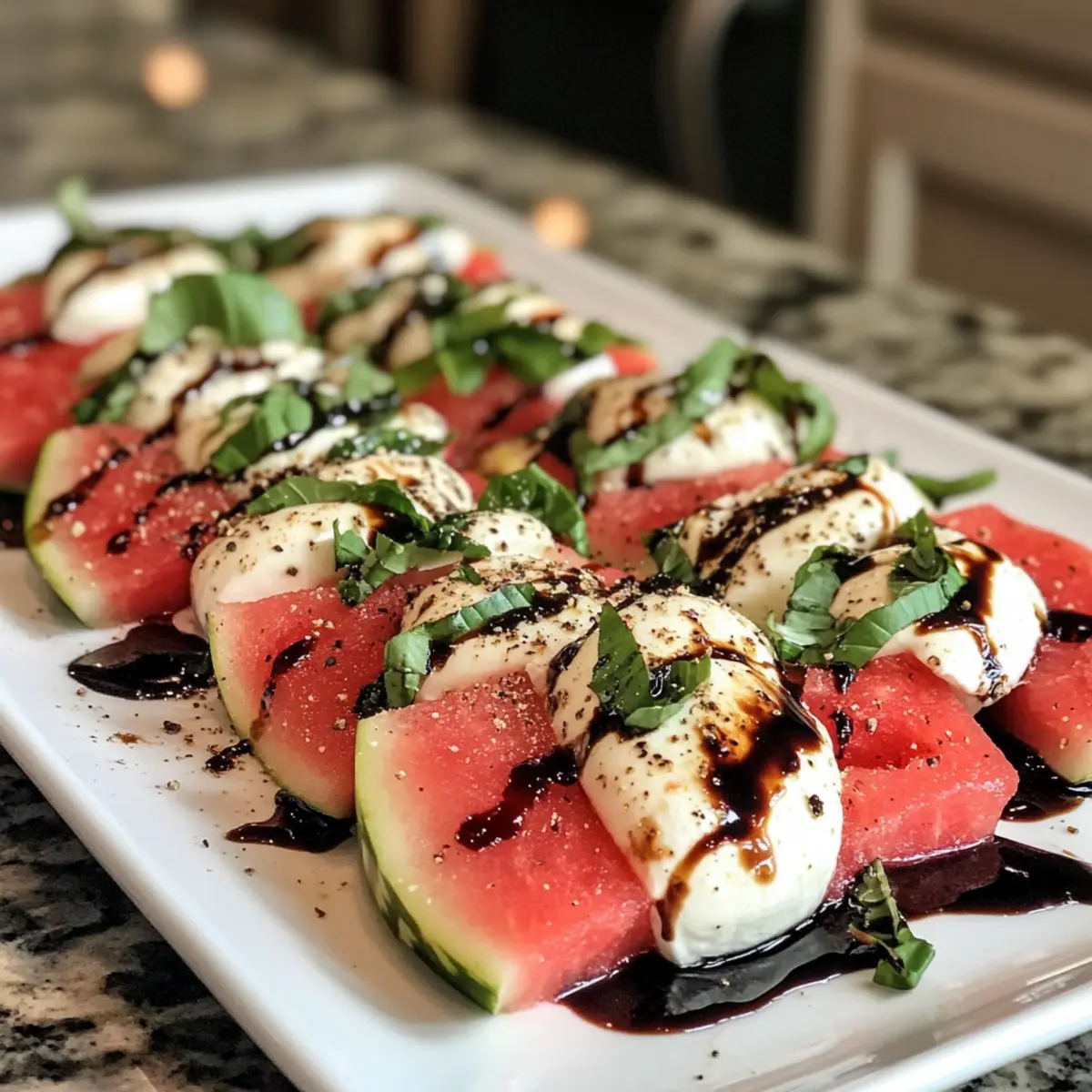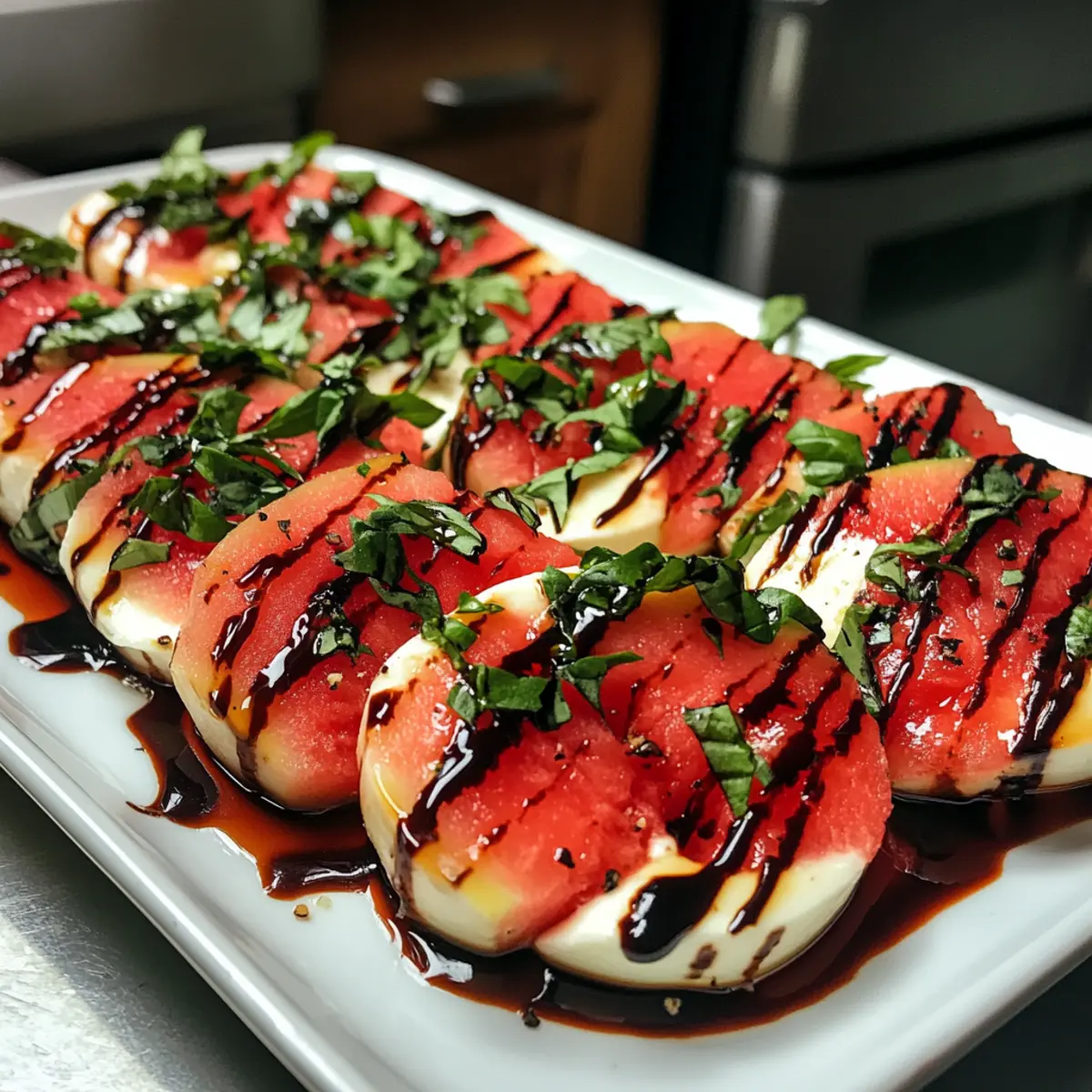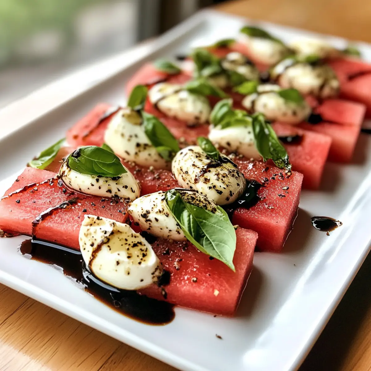 The moment I bit into a slice of juicy watermelon at a summer picnic, it felt like pure sunshine on my palate. That’s the inspiration behind my Watermelon Caprese Salad, a refreshing fusion that takes the classic Caprese to delightful new heights. This quick and easy dish seamlessly marries the sweetness of ripe watermelon with creamy mozzarella, all uplifted by aromatic basil and a luscious balsamic glaze. Perfect for those warm evenings when you crave a light yet satisfying meal, this salad not only dazzles the eyes but also brings a burst of summer flavor to your table. Whether you’re hosting a barbecue or looking for a simple side, you’ll love how effortlessly this salad elevates any occasion. Ready to try a new twist on a beloved classic? Let’s dive into this vibrant recipe! Why is Watermelon Caprese a Must-Try? Freshness at its finest: This Watermelon Caprese Salad combines vibrant flavors and textures that scream summer. Easy to prepare: With just a few simple ingredients and quick assembly, you can whip this up in under 15 minutes! Versatile: Serve it as a light lunch, a side dish for grilled meats, or as a refreshing appetizer at your next barbecue. Gluten-free and vegetarian: Perfect for accommodating various dietary needs, making it a crowd-pleaser. Deliciously unique: The sweet juiciness of watermelon paired with creamy mozzarella delivers a delightful twist on a traditional favorite, sweetened further with a balsamic glaze. Unleash the flavor and watch your guests’ faces light up! Watermelon Caprese Ingredients For the Salad Watermelon – Use small seedless watermelons for the sweetest, juiciest pieces. Fresh Mozzarella – Adds a creamy texture; opt for pre-sliced for convenience. Kosher Salt – Enhances flavors; sprinkle to taste for the perfect balance. Freshly Ground Black Pepper – Adds a hint of spice; adjust according to your preference. Fresh Basil – Offers aromatic freshness; thinly slice for even distribution. Extra-Virgin Olive Oil – Provides richness; choose high-quality oil for the best flavor. Balsamic Glaze – Complements the salad with sweet acidity; home-made or store-bought works well. This delightful Watermelon Caprese is sure to brighten up your summer meals! Step‑by‑Step Instructions for Watermelon Caprese Step 1: Prepare Watermelon Begin by slicing a small seedless watermelon into 4-inch squares, aiming for uniform pieces to ensure even presentation. Next, cut each square into smaller bite-sized pieces, yielding around six pieces for three servings. Place the watermelon in a colander to allow any excess juice to drain off, enhancing the salad’s texture and preventing sogginess. Step 2: Assemble Salad Take a large serving platter and lay out the watermelon pieces in a single row for an eye-catching display. Next, alternate each watermelon piece with slices of fresh mozzarella, creating a beautiful contrast of colors and textures that exemplify the Watermelon Caprese concept. Ensure each layer is tight and visually appealing for maximum impact. Step 3: Season Sprinkle the assembled salad with kosher salt and freshly ground black pepper to enhance the natural sweetness of the watermelon and the creaminess of the mozzarella. Make sure to distribute the seasoning evenly to ensure every bite is deliciously flavored. This important step elevates the Watermelon Caprese and creates a delightful explosion of flavors. Step 4: Add Herbs Stack and thinly slice fresh basil leaves, releasing their fragrant aroma as you work. Generously sprinkle the basil over the watermelon and mozzarella, allowing the herbaceous notes to mingle gracefully with the other ingredients. This addition not only boosts flavor but also contributes to the visual appeal of the Watermelon Caprese salad. Step 5: Finish Drizzle a high-quality extra-virgin olive oil over the salad, followed by a sweet balsamic glaze that complements the flavors perfectly. Use just enough to coat the ingredients without overwhelming them. As you watch the glaze cascade down, it will elevate the presentation and enhance the overall taste of the Watermelon Caprese. Step 6: Serve To serve, neatly plate two stacks of the watermelon and mozzarella for each serving, showcasing the vibrant colors of your beautiful salad. This Watermelon Caprese is best enjoyed fresh, making it an ideal choice for a light summer meal or a festive gathering. Watermelon Caprese Variations & Substitutions Feel free to get creative and tweak this Watermelon Caprese Salad to suit your palate or dietary needs! Peachy Fresh: Substitute ripe peaches for watermelon for a sweet, summer fruit twist. Their juicy flesh adds a different flavor that pairs beautifully with mozzarella. Perfect for those who want to explore new tastes! Berry Good: Use strawberries or mixed berries in place of watermelon for a delightful berry-infused salad. Their tartness brightens the dish, making it a bit more vibrant and refreshing. Goat Cheese Delight: Swap fresh mozzarella with crumbled goat cheese for a tangy kick that wonderfully contrasts the sweetness of the fruit. This addition gives the salad a rich texture and adds depth to the flavor profile. Herbaceous Boost: Add a sprinkle of mint or dill alongside basil for an exciting herb garden flavor. Each bite will surprise you with its refreshing taste, taking your salad to a new level. Heat It Up: If you like a little spice, add a sprinkle of red pepper flakes for a spicy kick. The heat balances out the sweetness of the watermelon, creating a unique dimension that tantalizes the taste buds. Honey Drizzle: Instead of balsamic glaze, try swirling honey over the salad for a naturally sweet finish. It creates a lovely glaze and brings out the natural sugars in the fruits, highlighting their freshness. Nuts About Crunch: Scatter some toasted pine nuts or walnuts on top for added crunch. This complement of texture enhances the eating experience and provides healthy fats. Flavorful Olive Oil: For an e